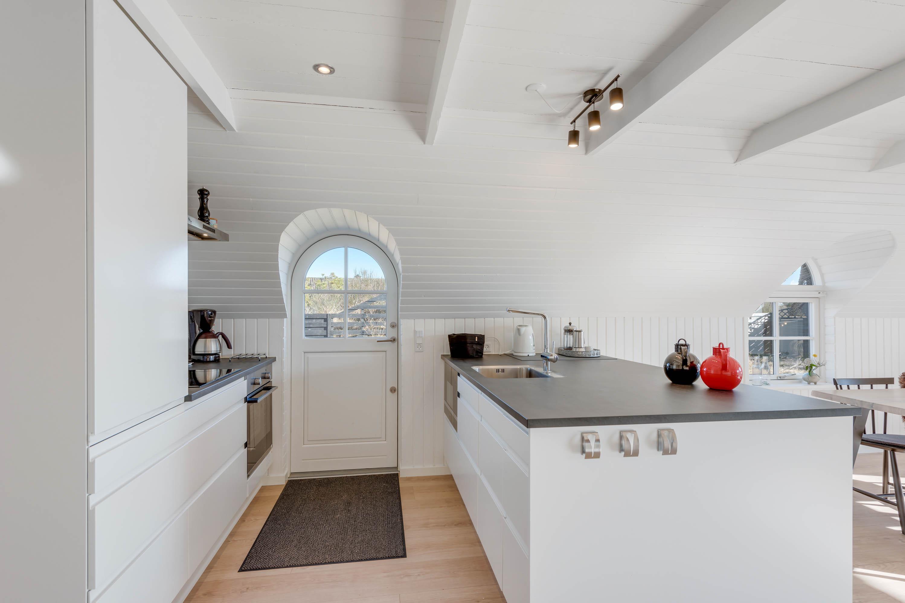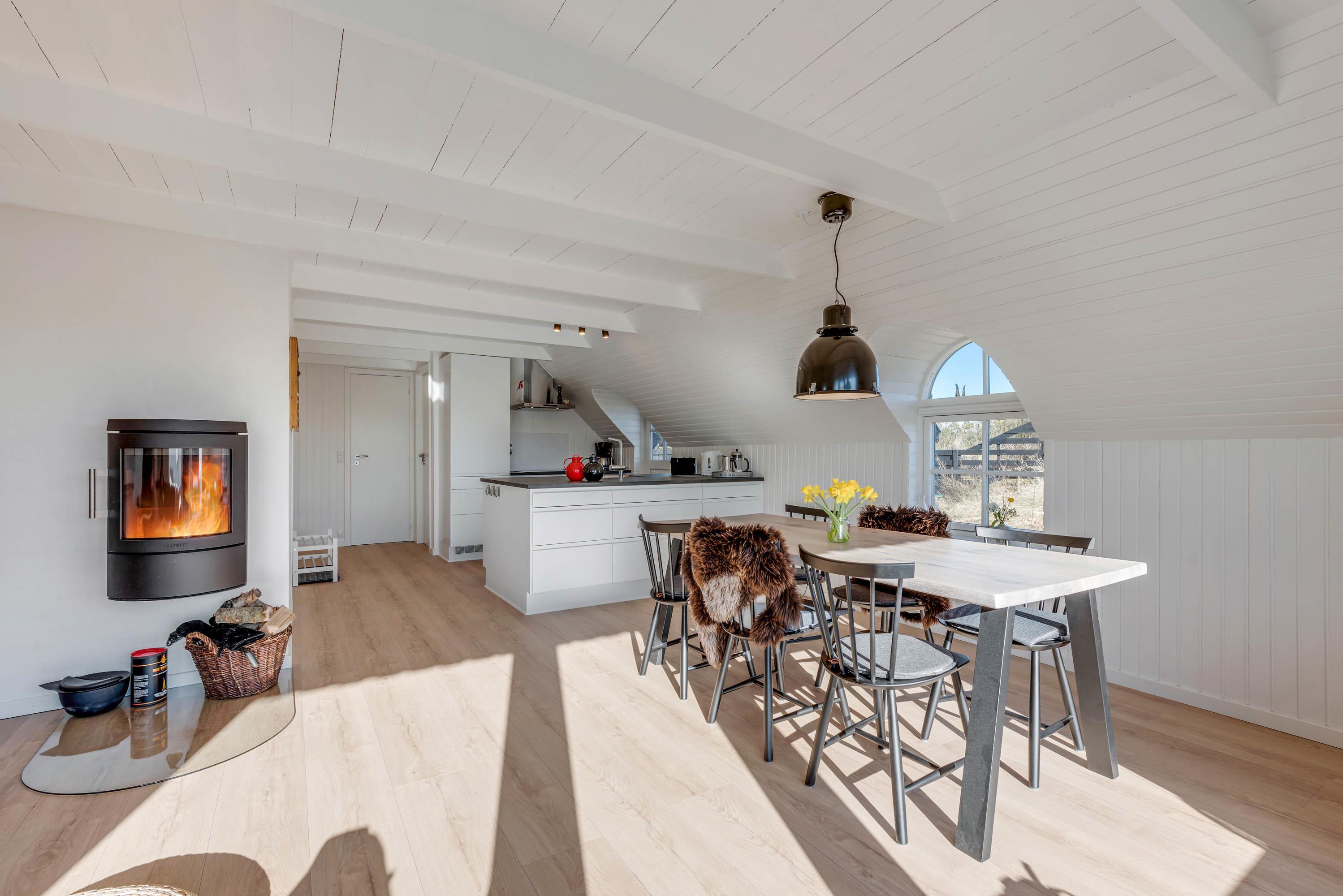 Opholdsstuen ligger i åben forbindelse med køkkenalrummet. Det dejlige køkken byder på moderne faciliteter som opvaskemaskine, mikroovn og induktionskomfur, der tilgodeser familiens kok. Mens der kokkereres i køkkenet, kan der hygges med resten af familien, der spiller spil ved det flotte spisebord.