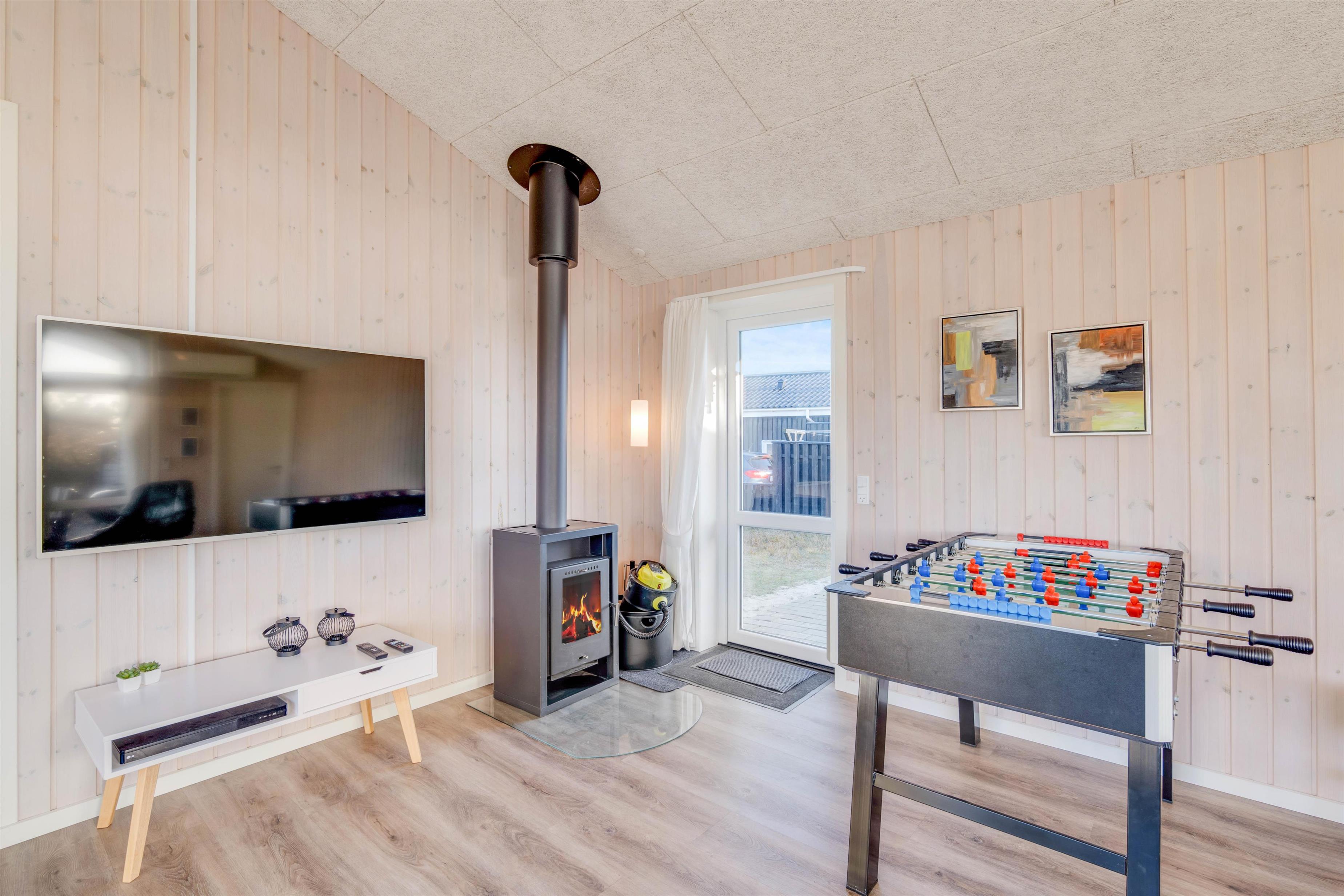 I både køkken og stue står sommerhusets gennemgående mørkere gulve i flot kontrast til de lyse vægge og hvide lofter. Ud ad de store vinduer i stuen, der giver et flot lysindfald, kan den smukke natur nydes i fulde drag, mens der slappes af i de lækre lædermøbler og børnene dyster i bordfodbold. Det hyggelige skær og den knitrende lyd fra brændeovnen fuldender scenariet for en hyggelig aften, og på de kølige dage og aftner sørger varmepumpen for en behagelig temperatur døgnet rundt.