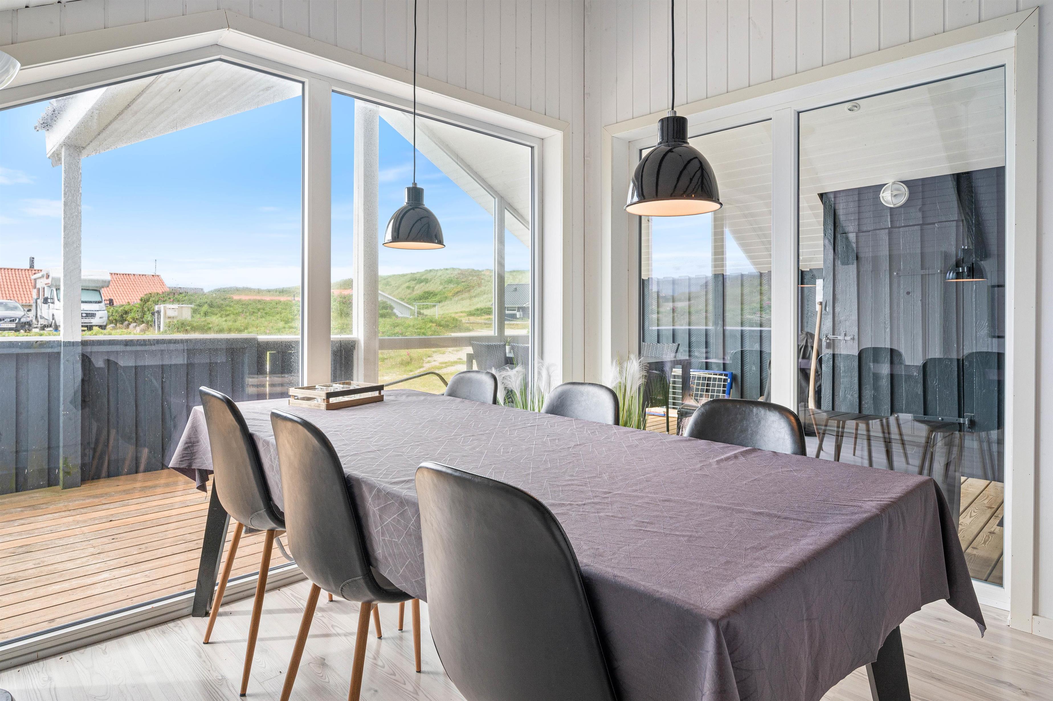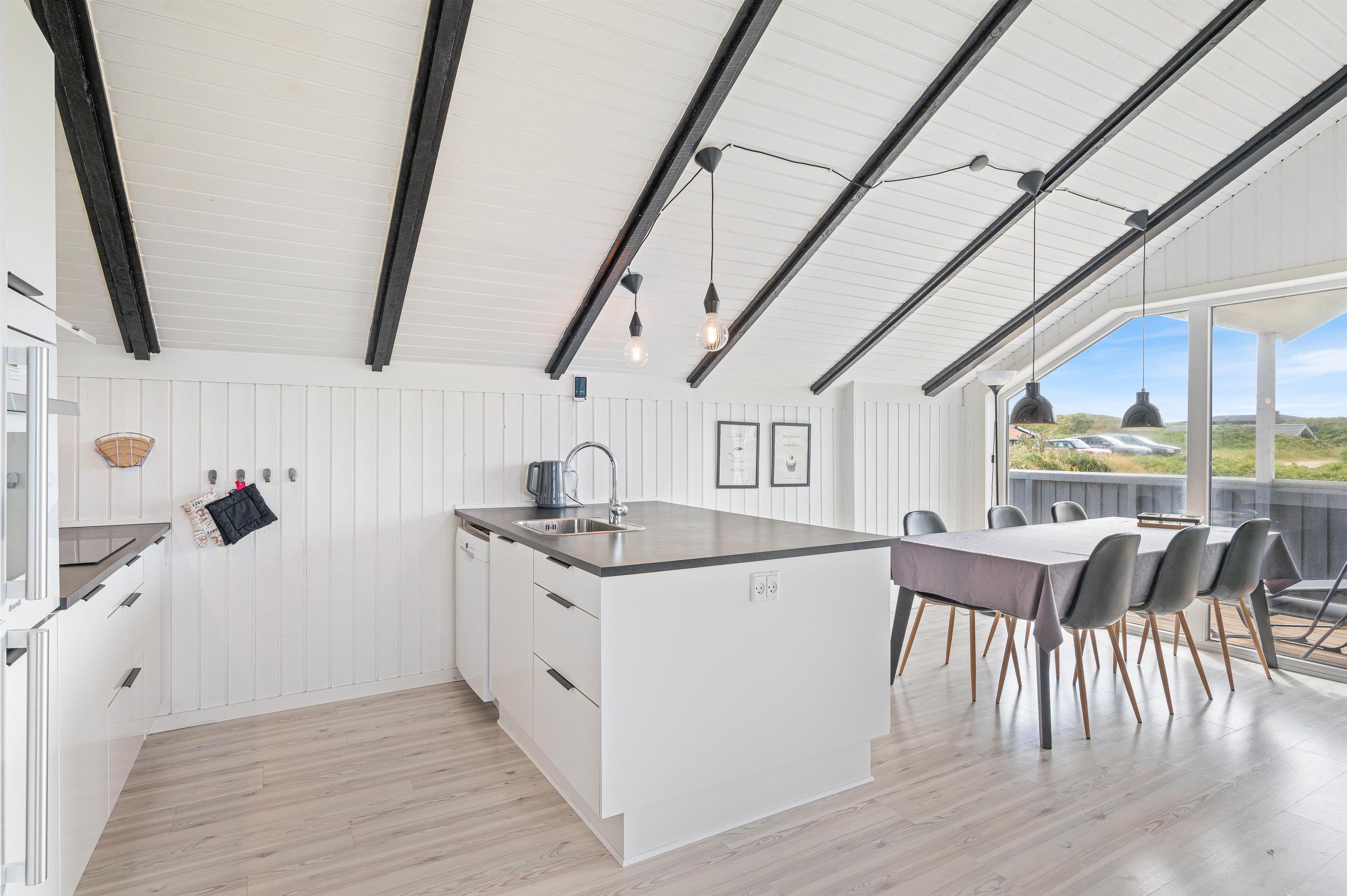 I får ikke kun et gennemført sommerhus, men også en helt fantastisk beliggenhed kun 100 meter fra Vesterhavet. Den nærmeste strandopgang ligger blot et stenkast fra feriematriklen, og en tur over klittoppen bringer jer hurtigt ned til vandet og den brede sandstrand. Stranden er altid en fascinerende oplevelse, og hele året rundt viser den mægtige natur nye sider af sig selv.