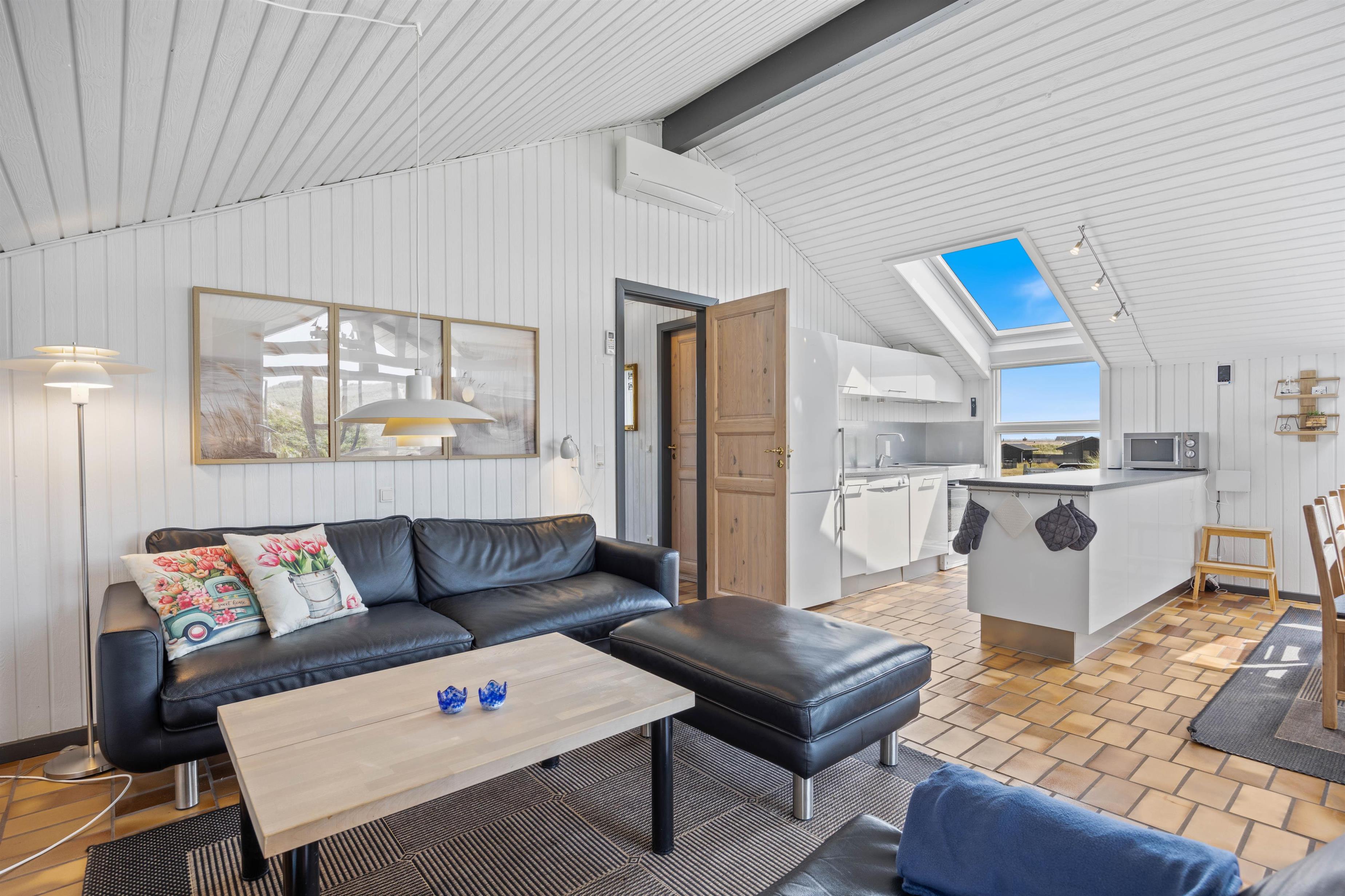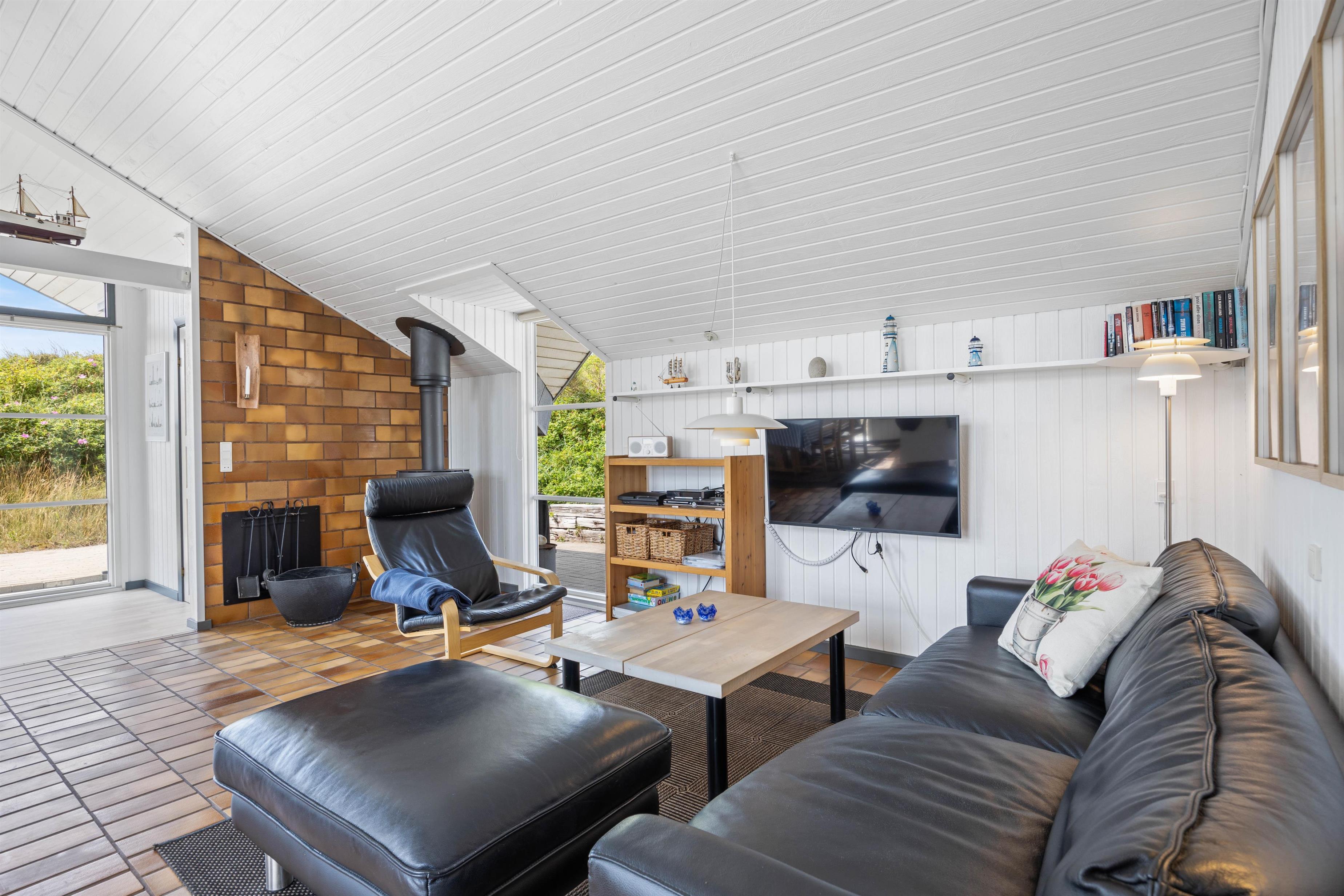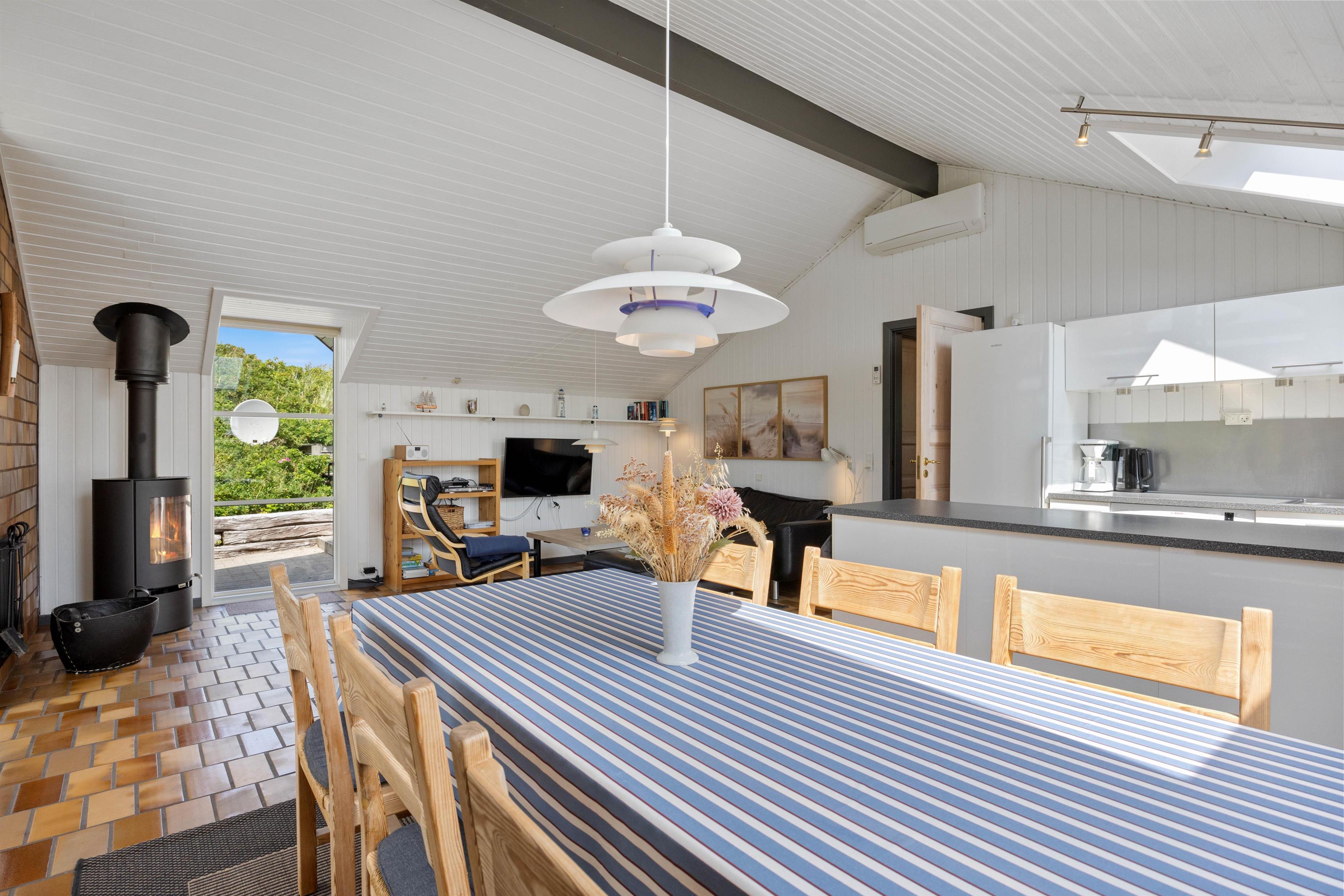 Køkkenet ligger i åben forbindelse med stuen; De høje lofter til kip og ovenlysvinduerne lukker naturen ind og gør rummet lyst og indbydende. Stuen er smagfuldt indrettet, har klinkegulv og brændeovn, som både spreder varme og ekstra hyggelig feriestemning. Der er gratis trådløs internetadgang.