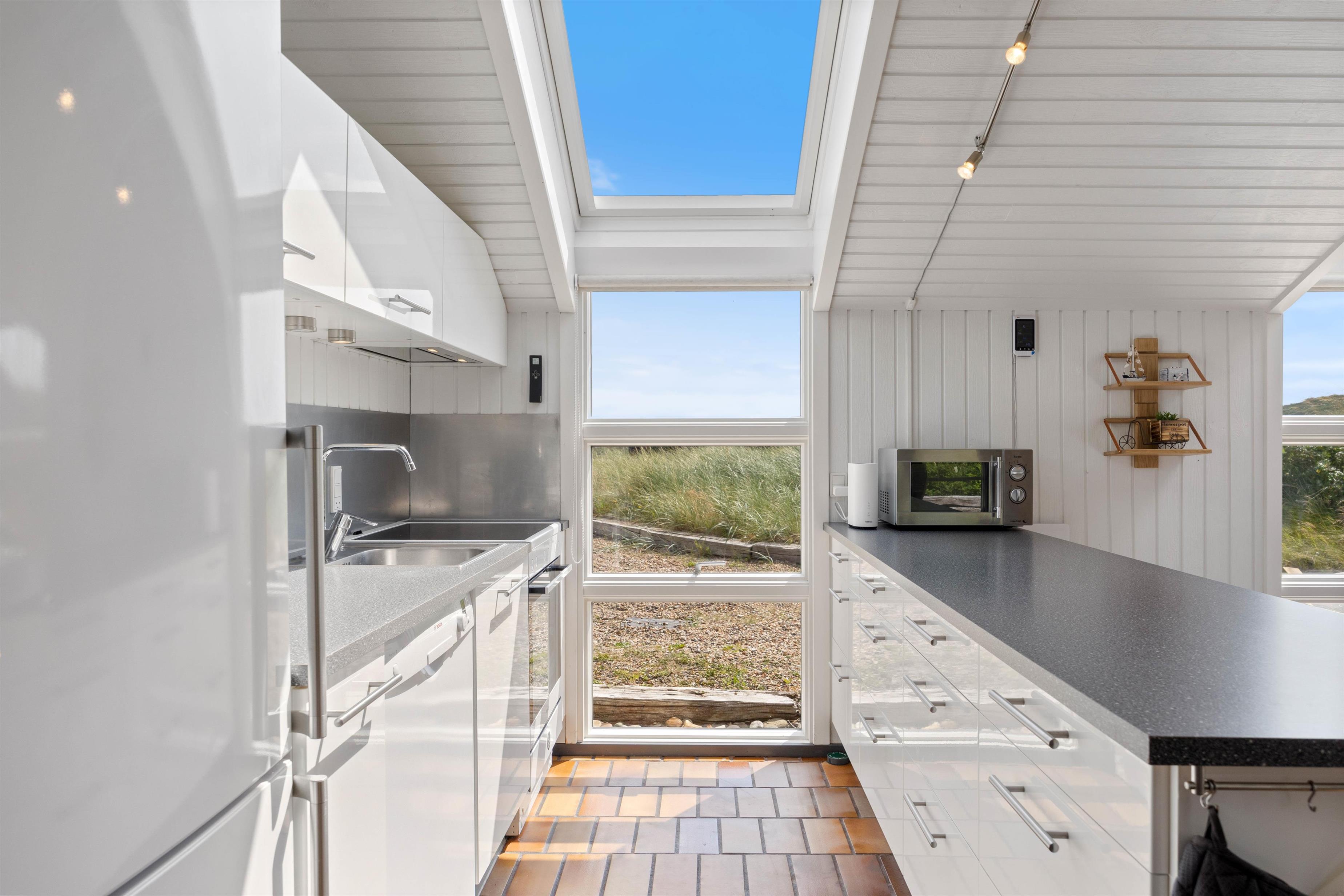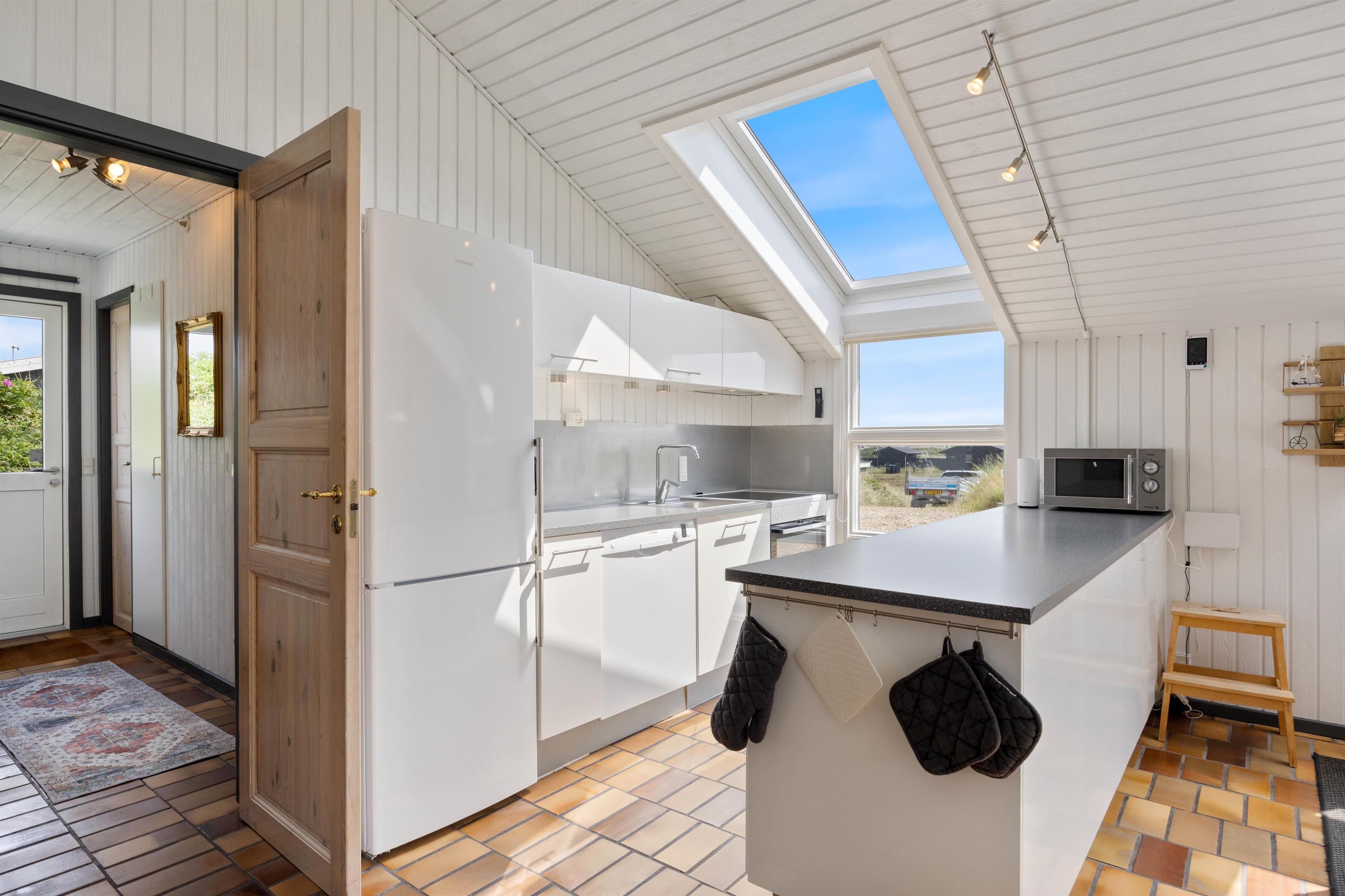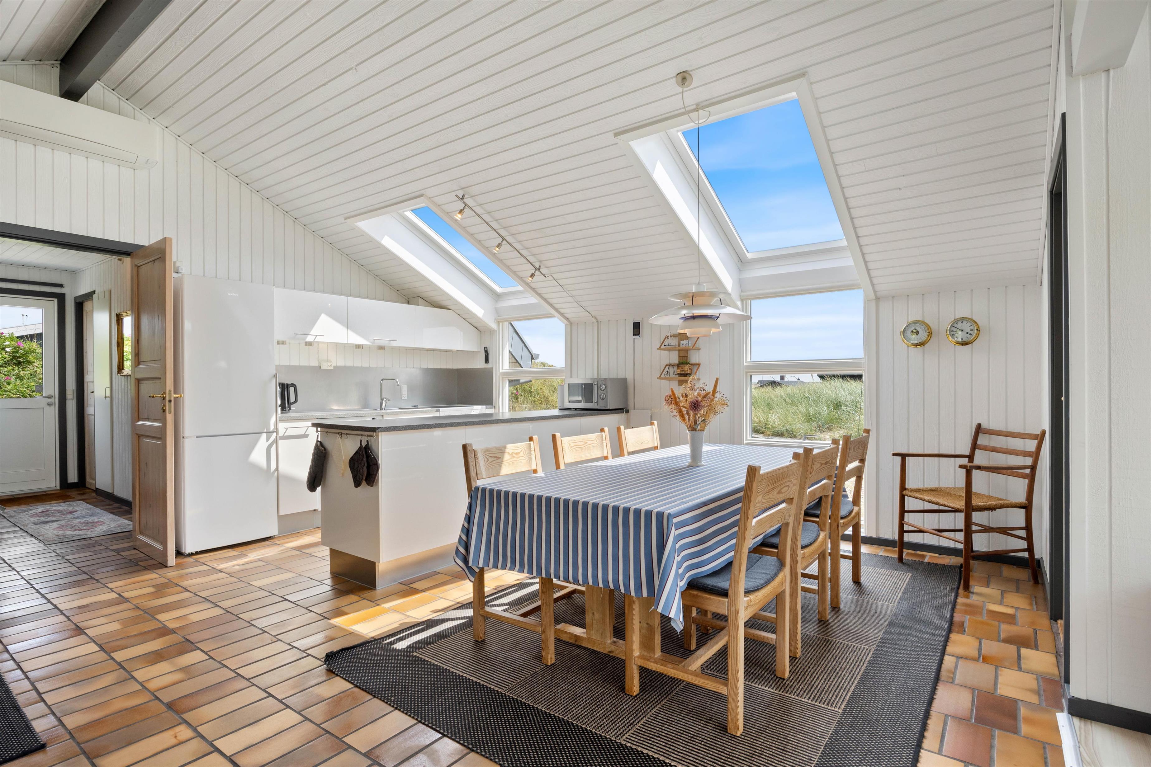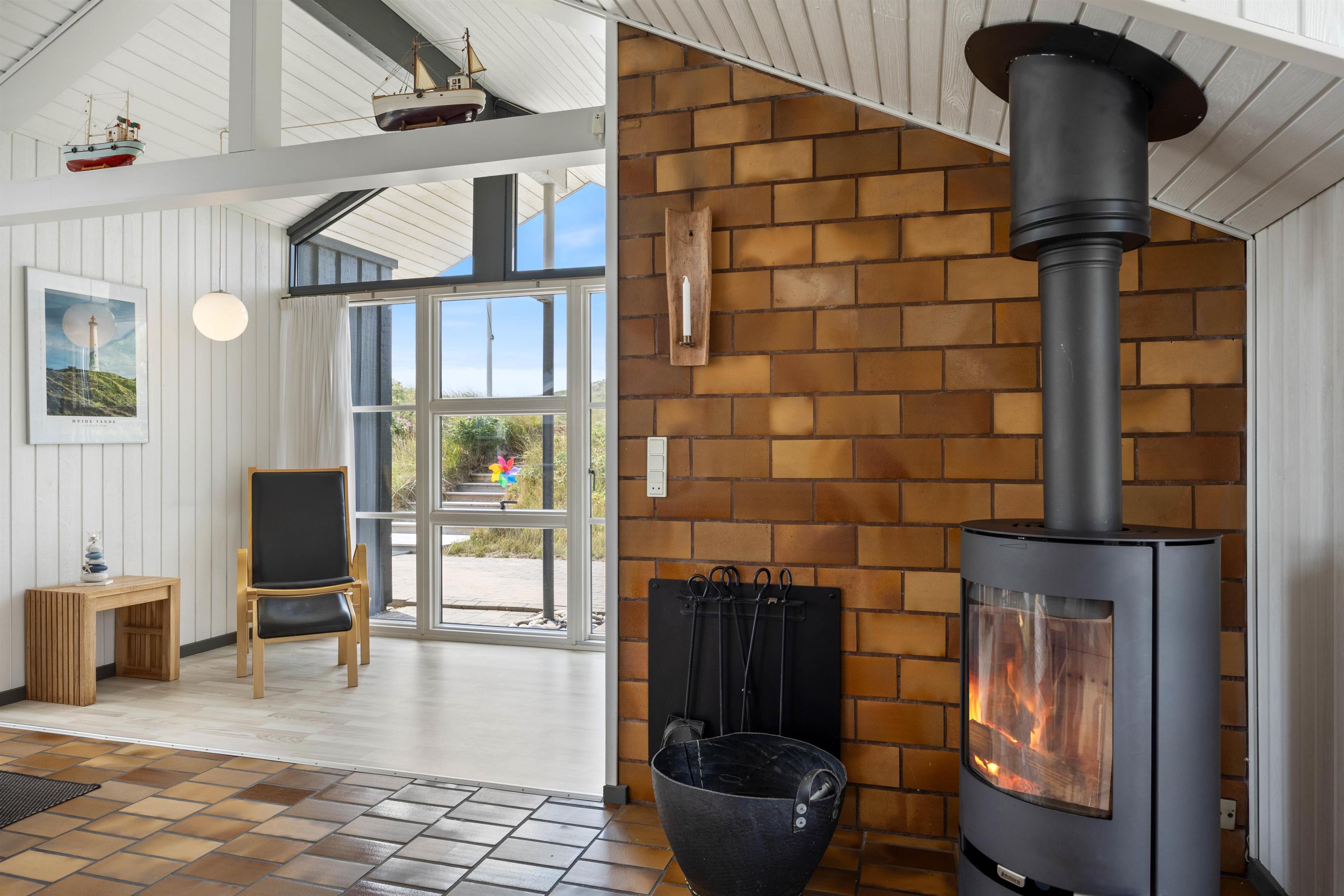 Køkkenet ligger i åben forbindelse med stuen; De høje lofter til kip og ovenlysvinduerne lukker naturen ind og gør rummet lyst og indbydende. Stuen er smagfuldt indrettet, har klinkegulv og brændeovn, som både spreder varme og ekstra hyggelig feriestemning. Der er gratis trådløs internetadgang.