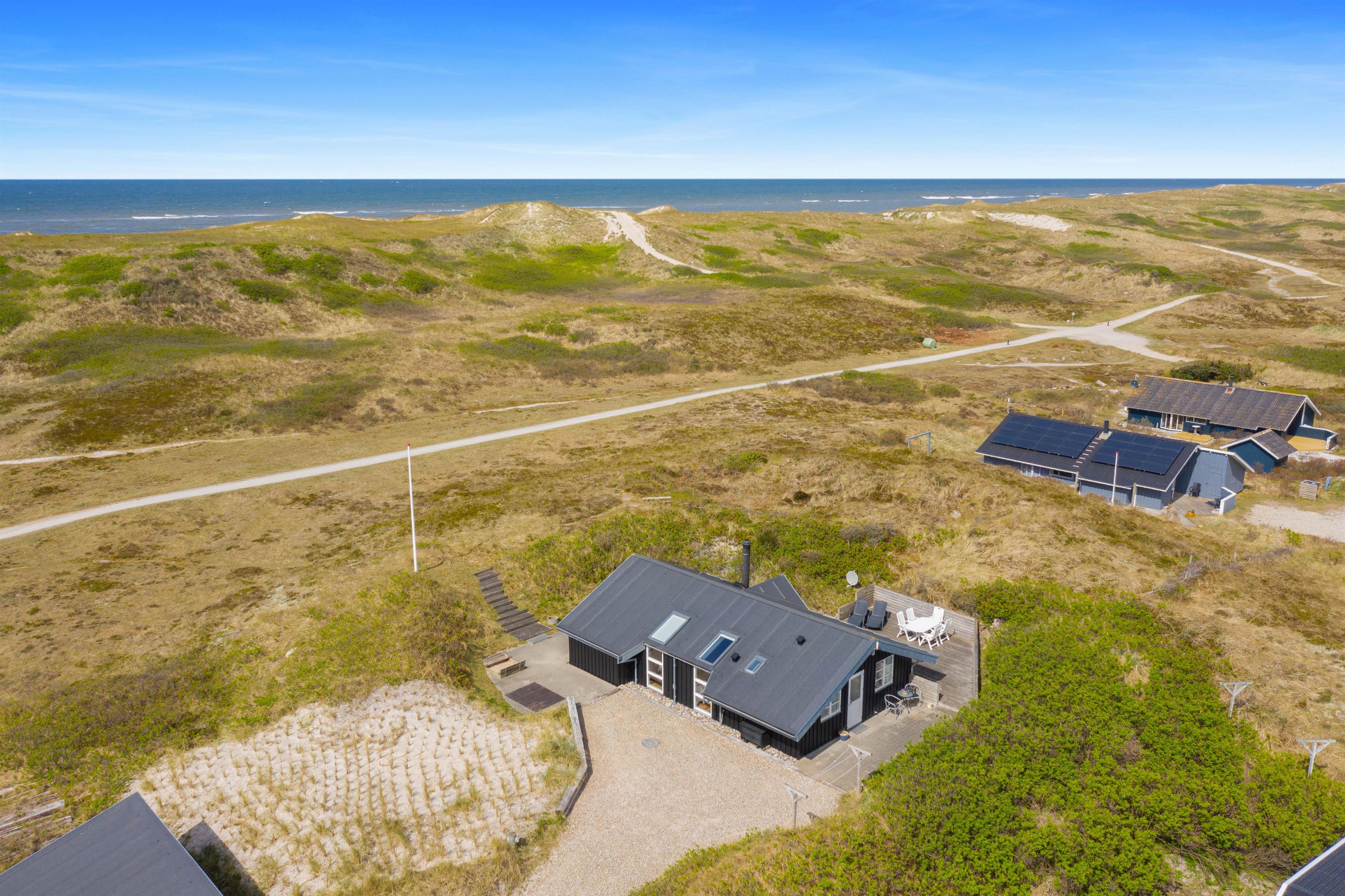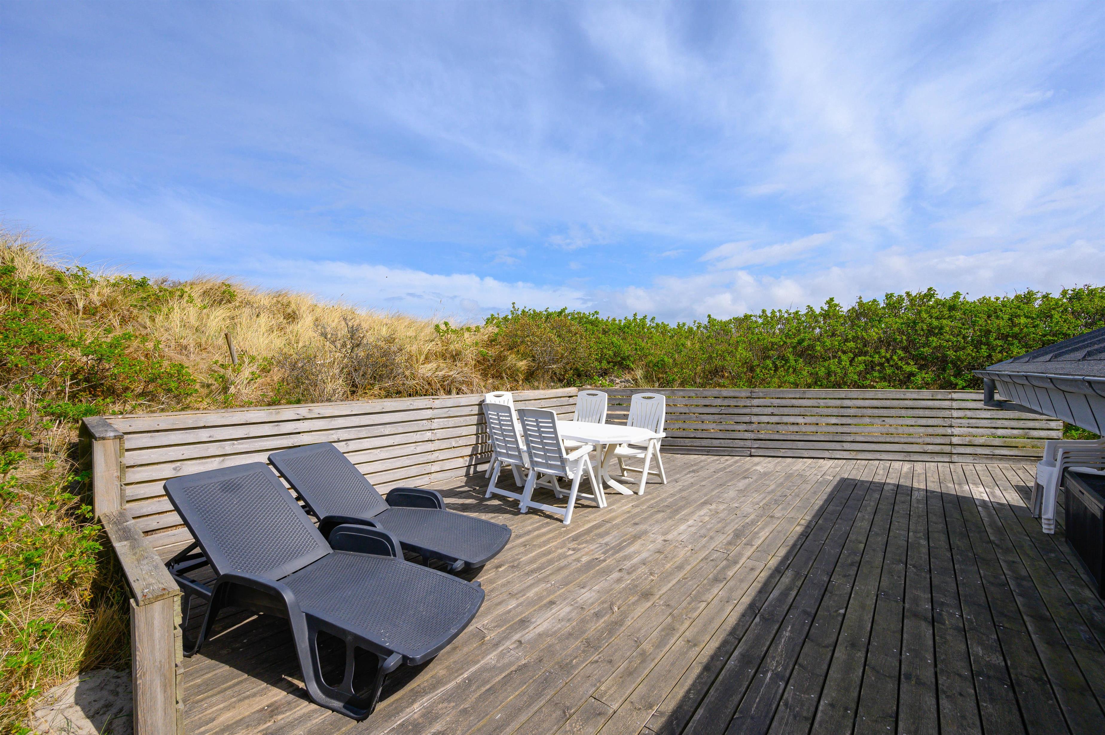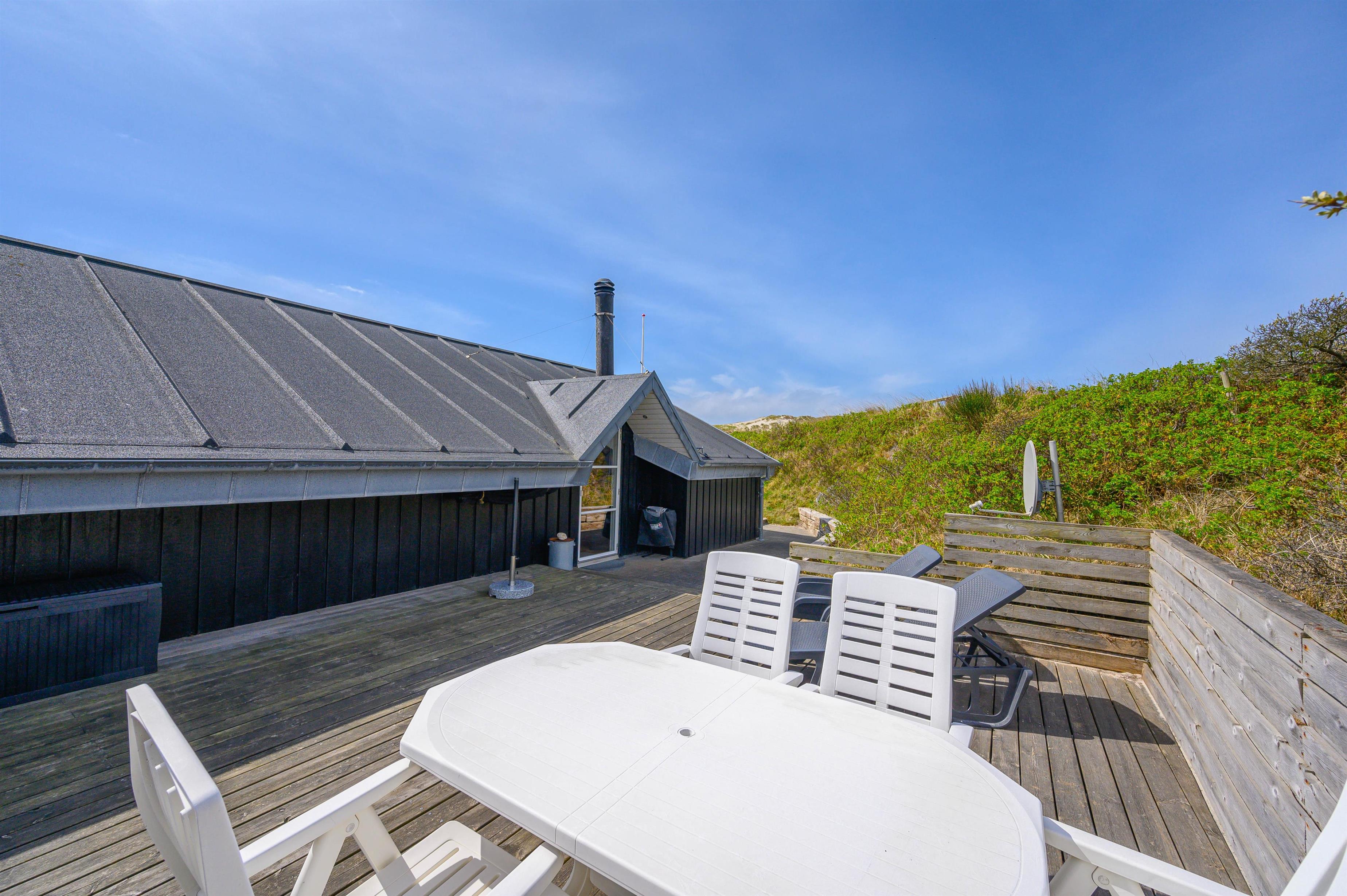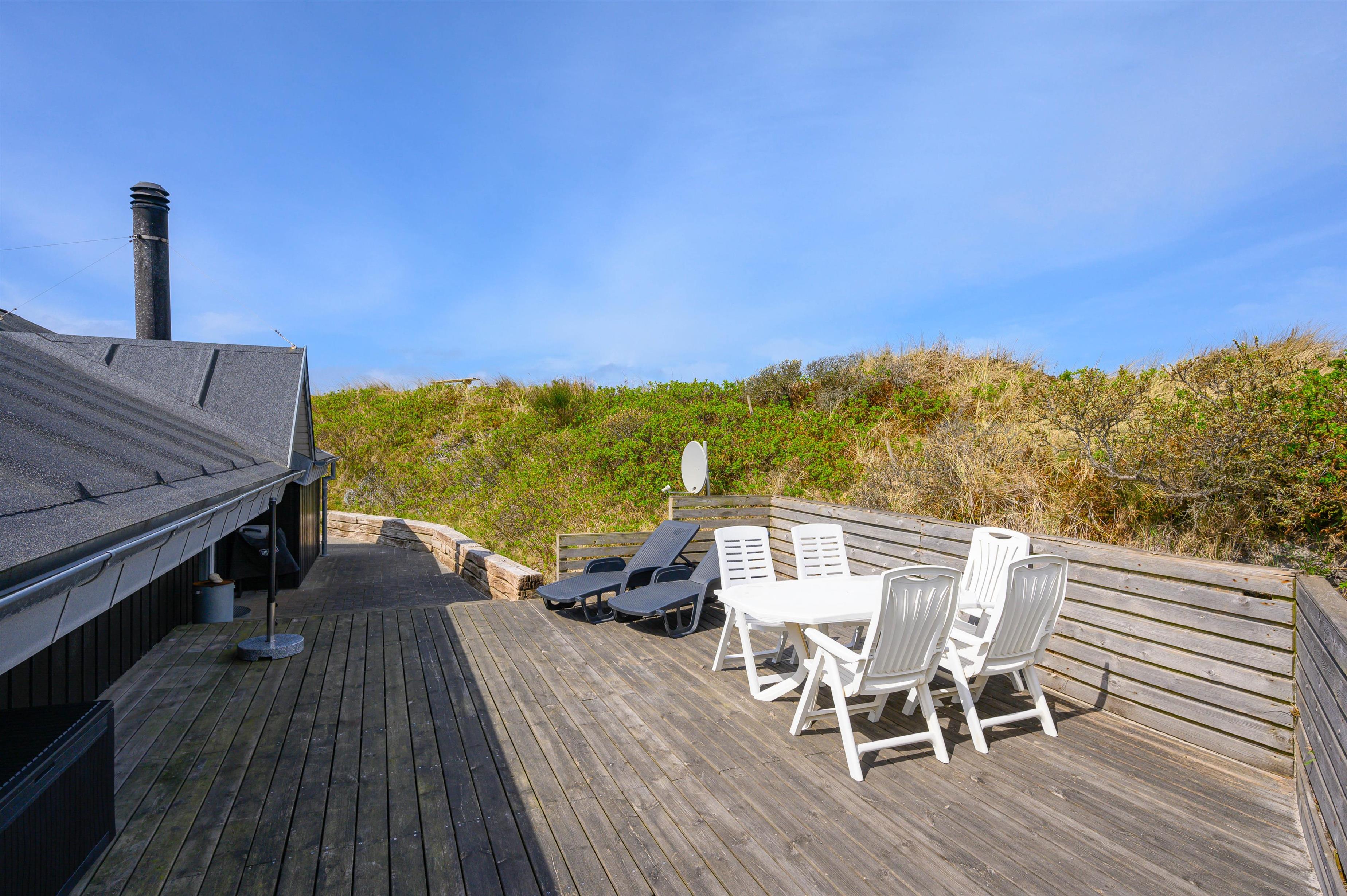 På ferien skal livet så vidt muligt leves udendørs, og det er der rige muligheder for i dette sommerhus. Det ligger kun 150 meter fra den skønne strand, på en klitgrund og er omgivet af fremragende terrasser, hvor I altid kan finde et sted i læ for vinden.