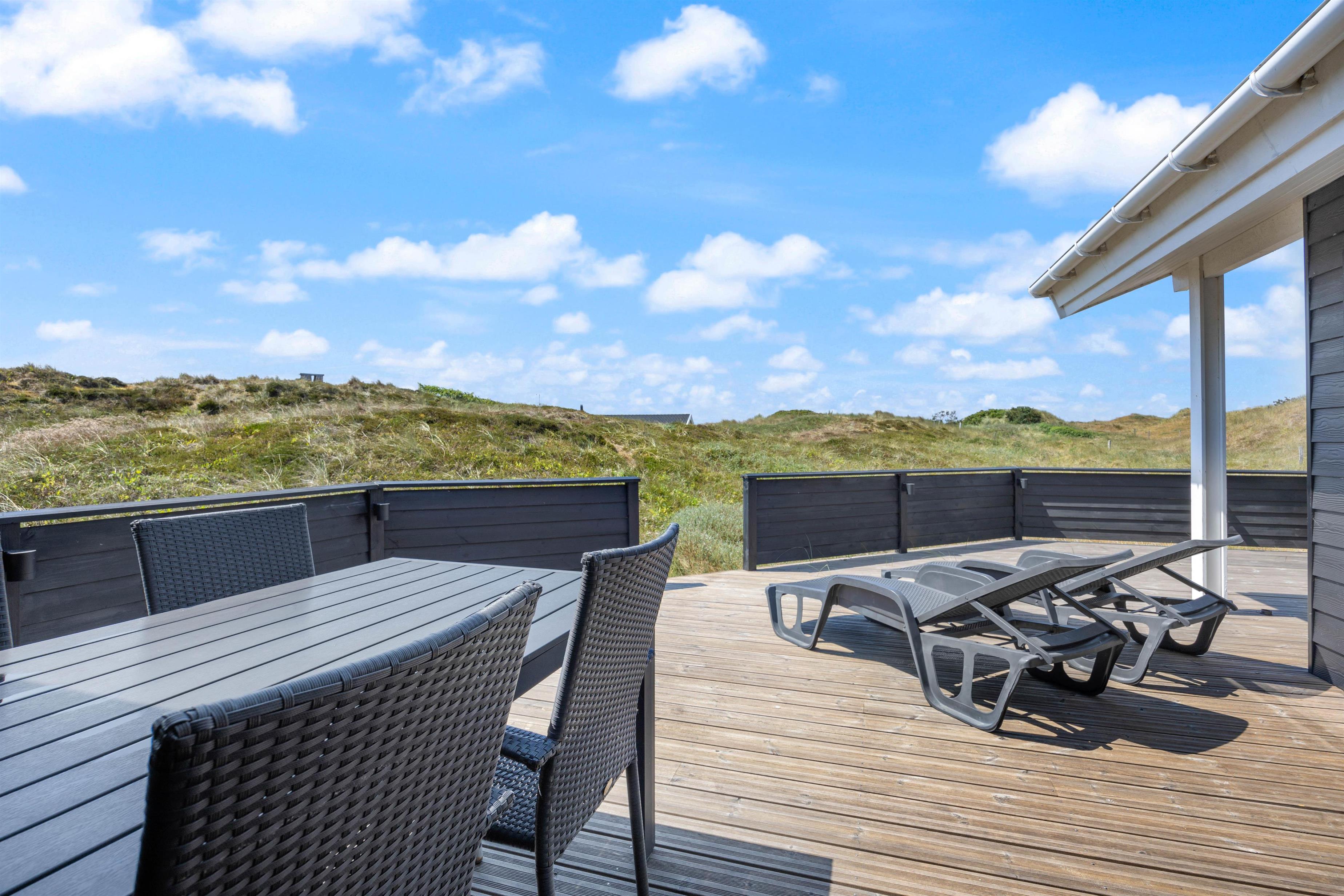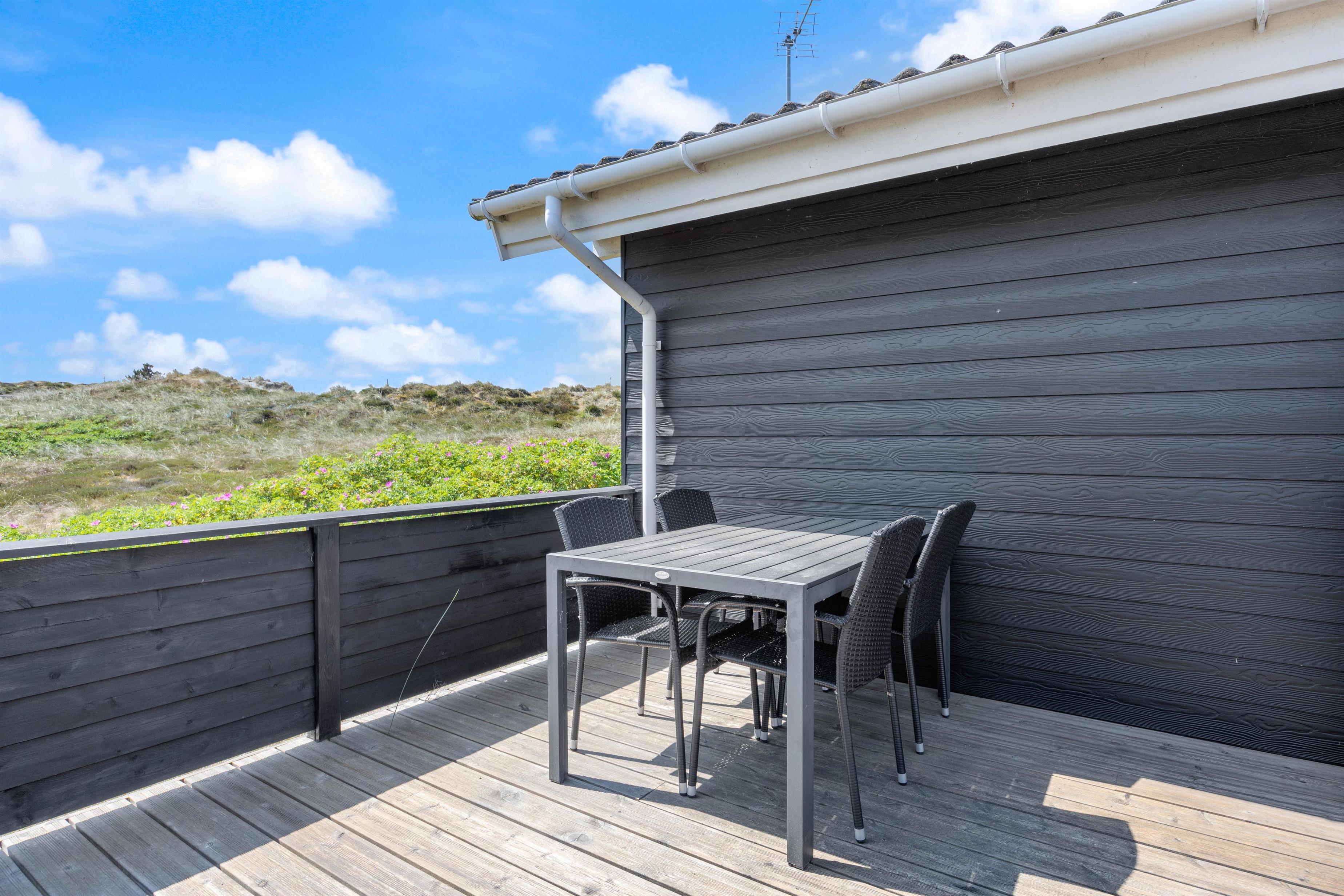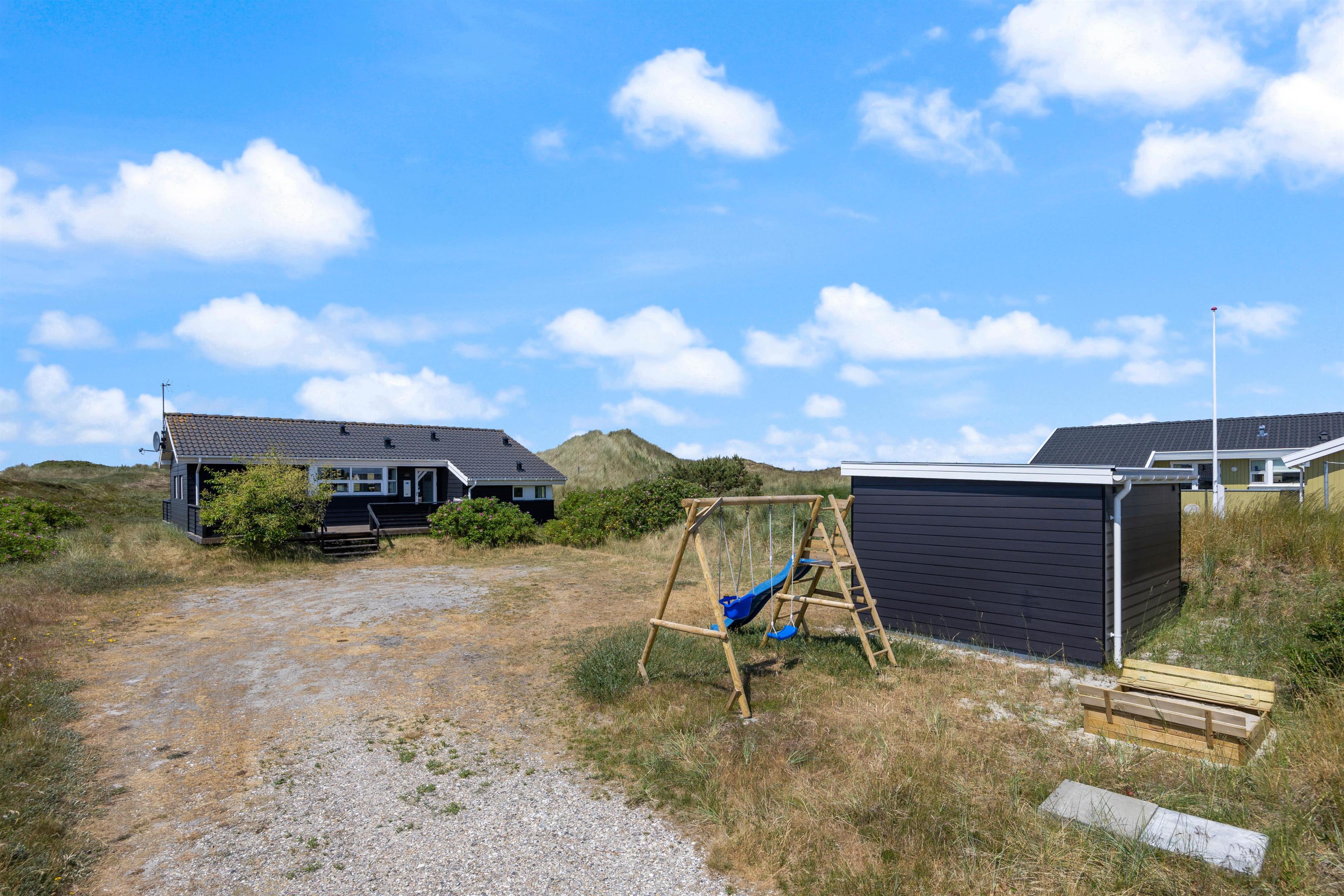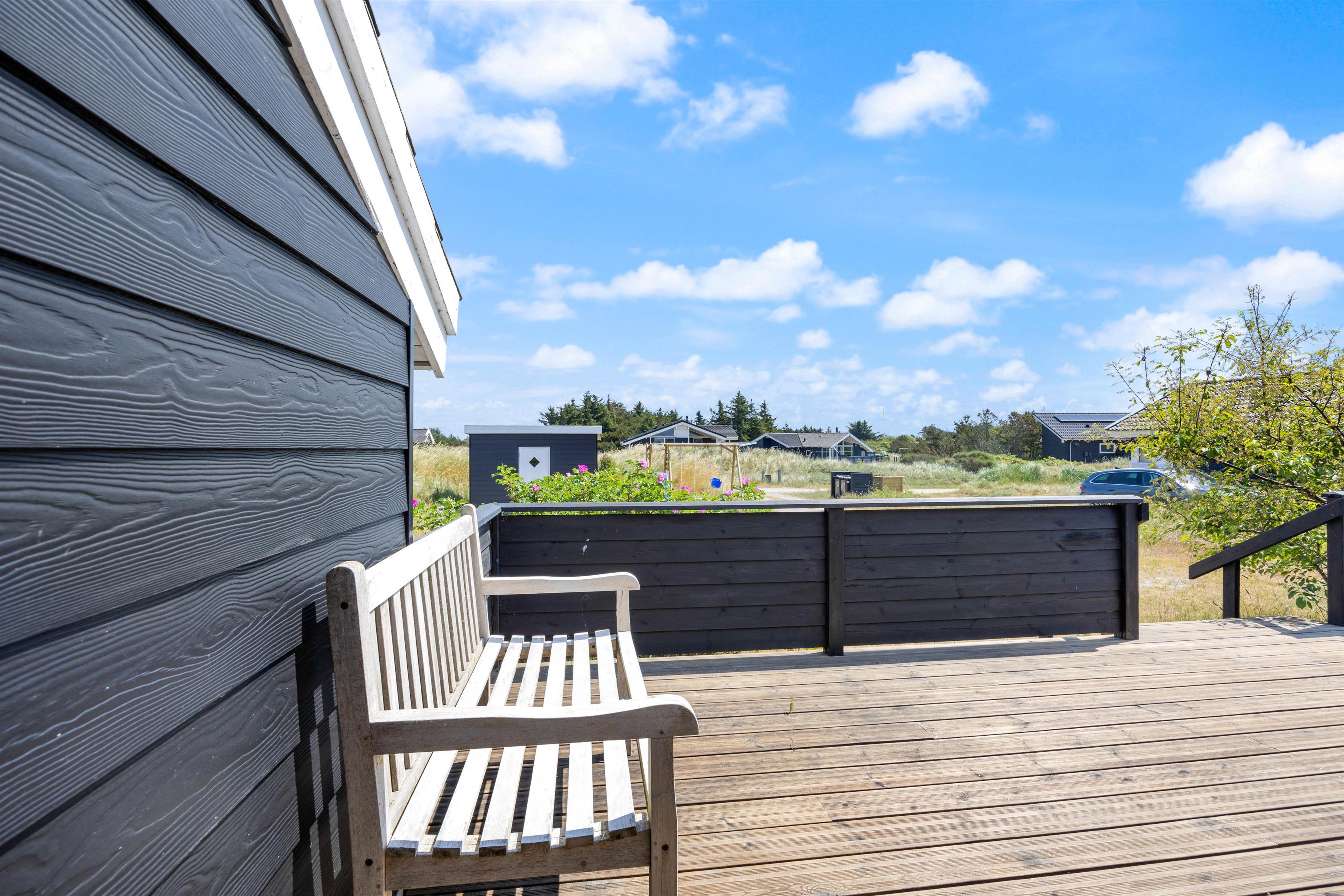 På sommerhusets gode og helt ugenerede terrasser er det altid muligt at finde gode lækroge, hvor solen og den friske havluft nydes inden aftenens grillhygge. Afstanden til den brede sandstrand er kun ca. 800 meter og for børnene er der gode legeredskaber til rådighed.