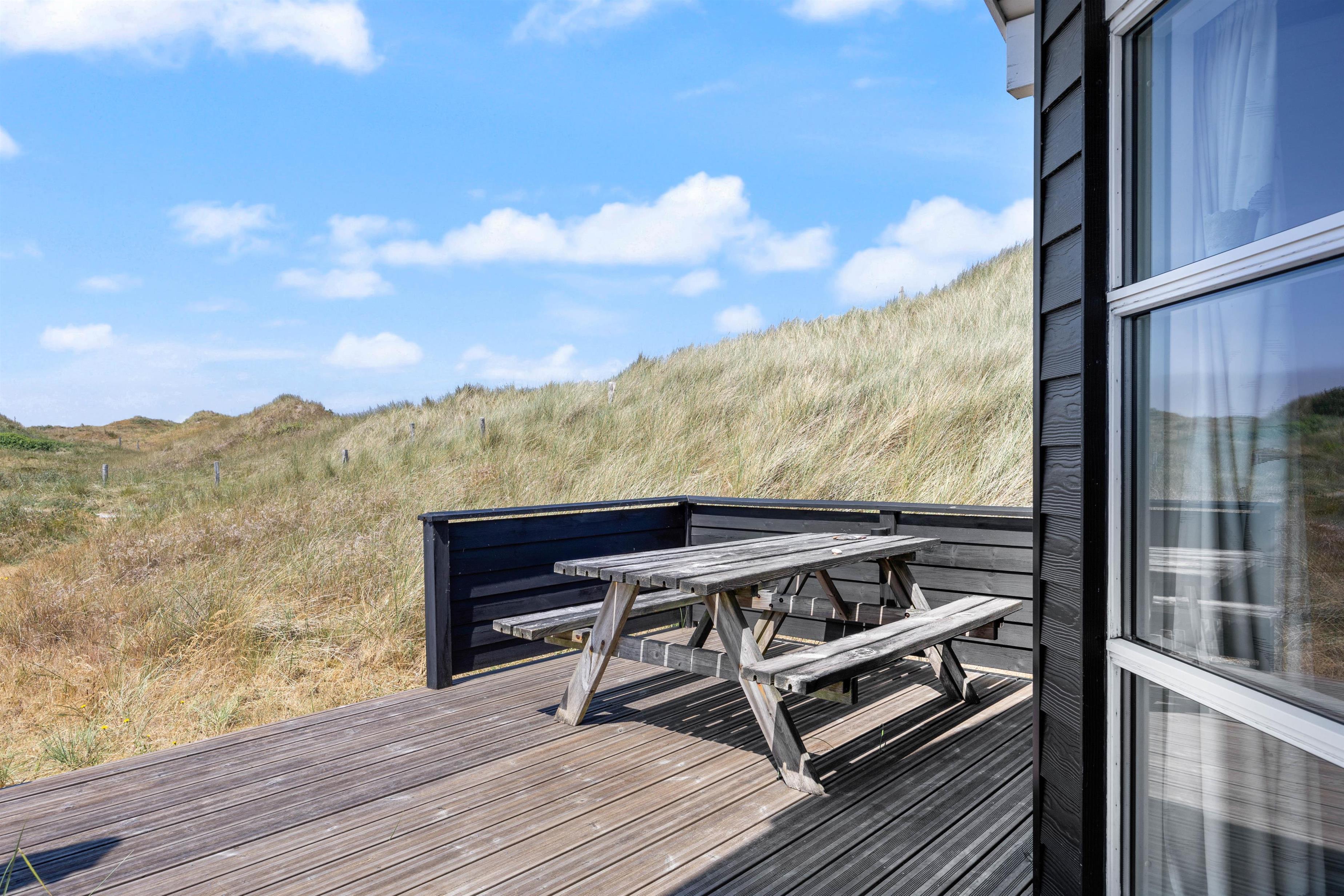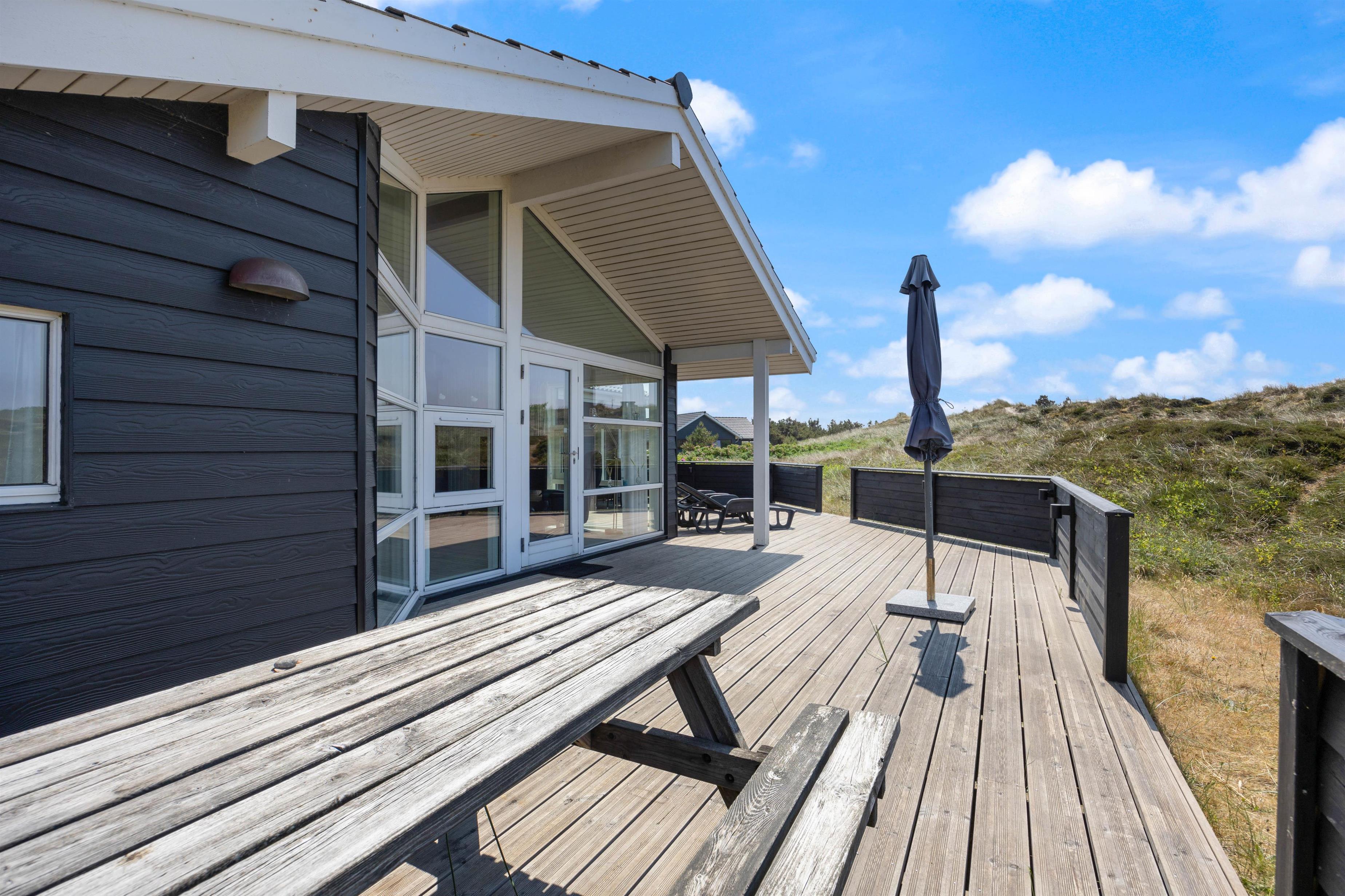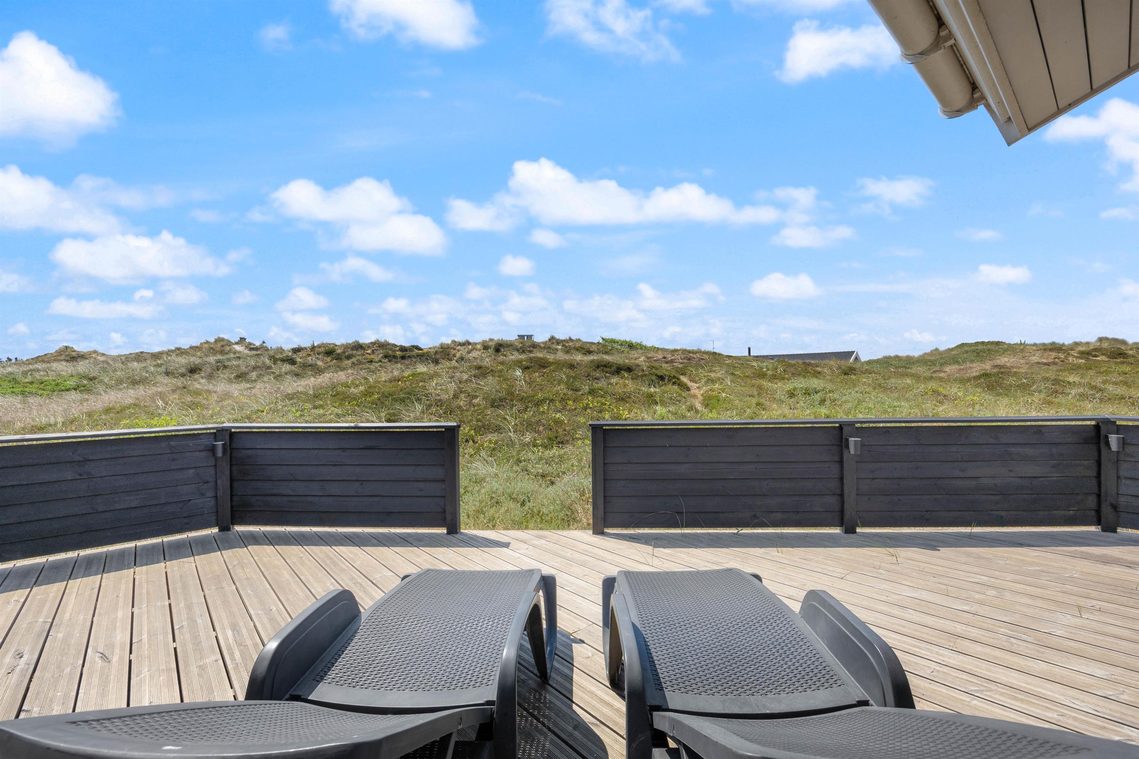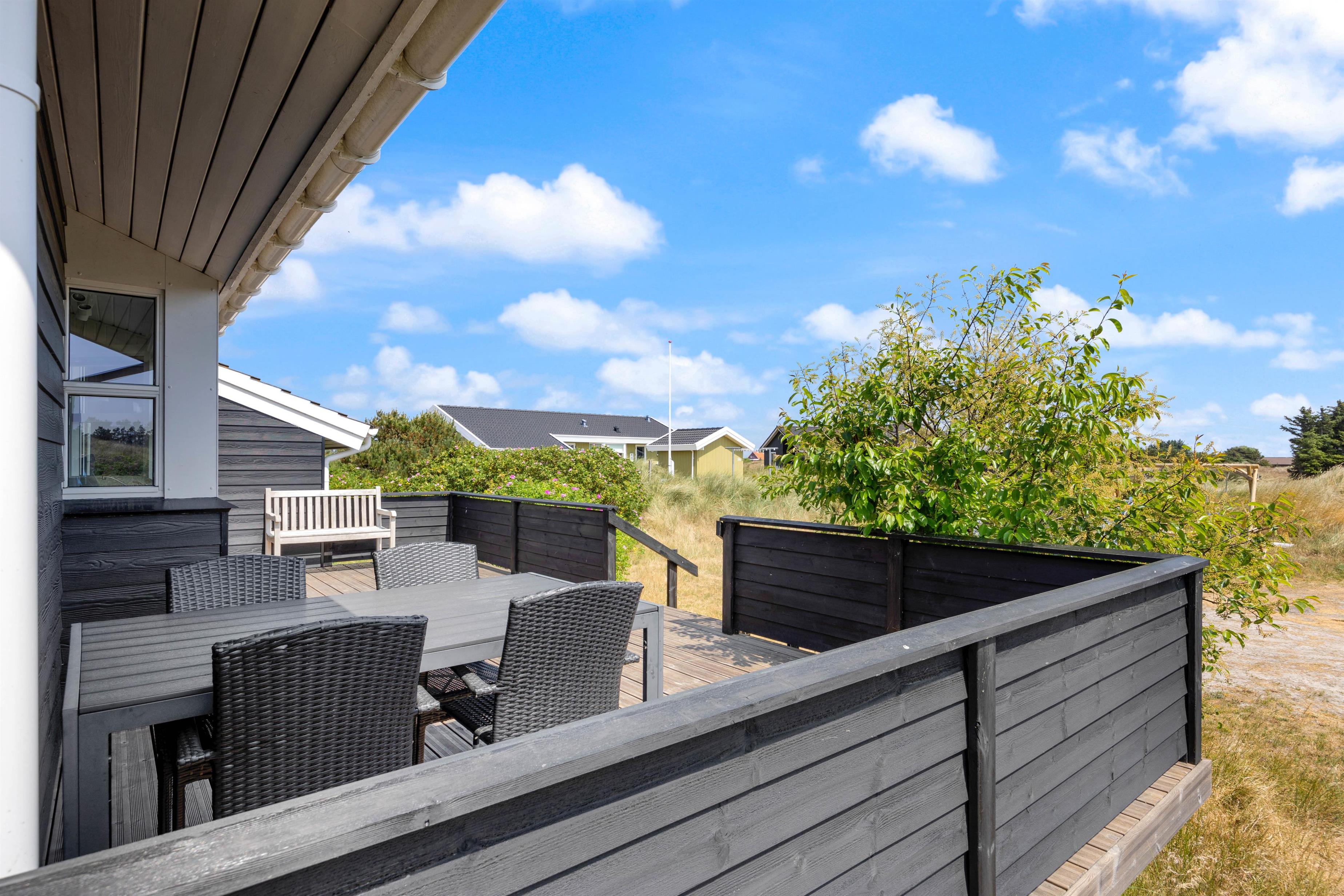 På sommerhusets gode og helt ugenerede terrasser er det altid muligt at finde gode lækroge, hvor solen og den friske havluft nydes inden aftenens grillhygge. Afstanden til den brede sandstrand er kun ca. 800 meter og for børnene er der gode legeredskaber til rådighed.