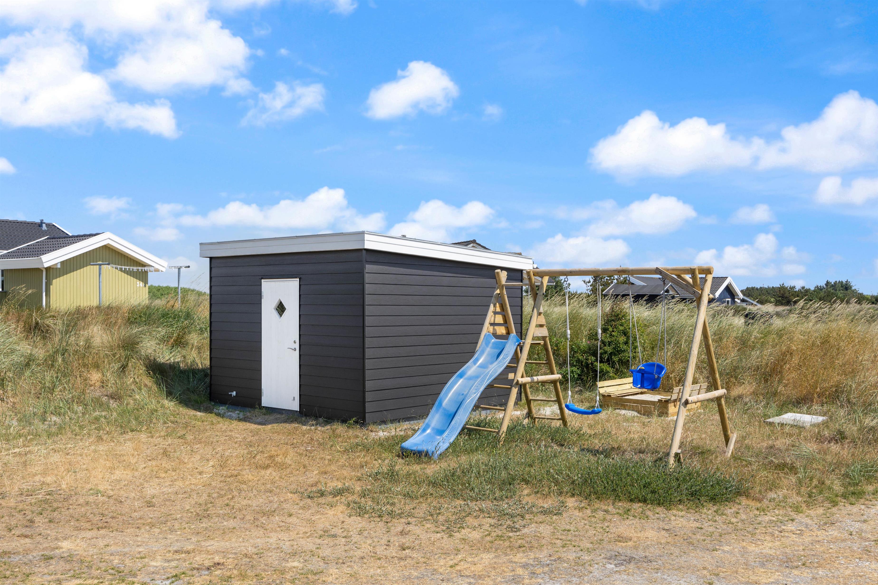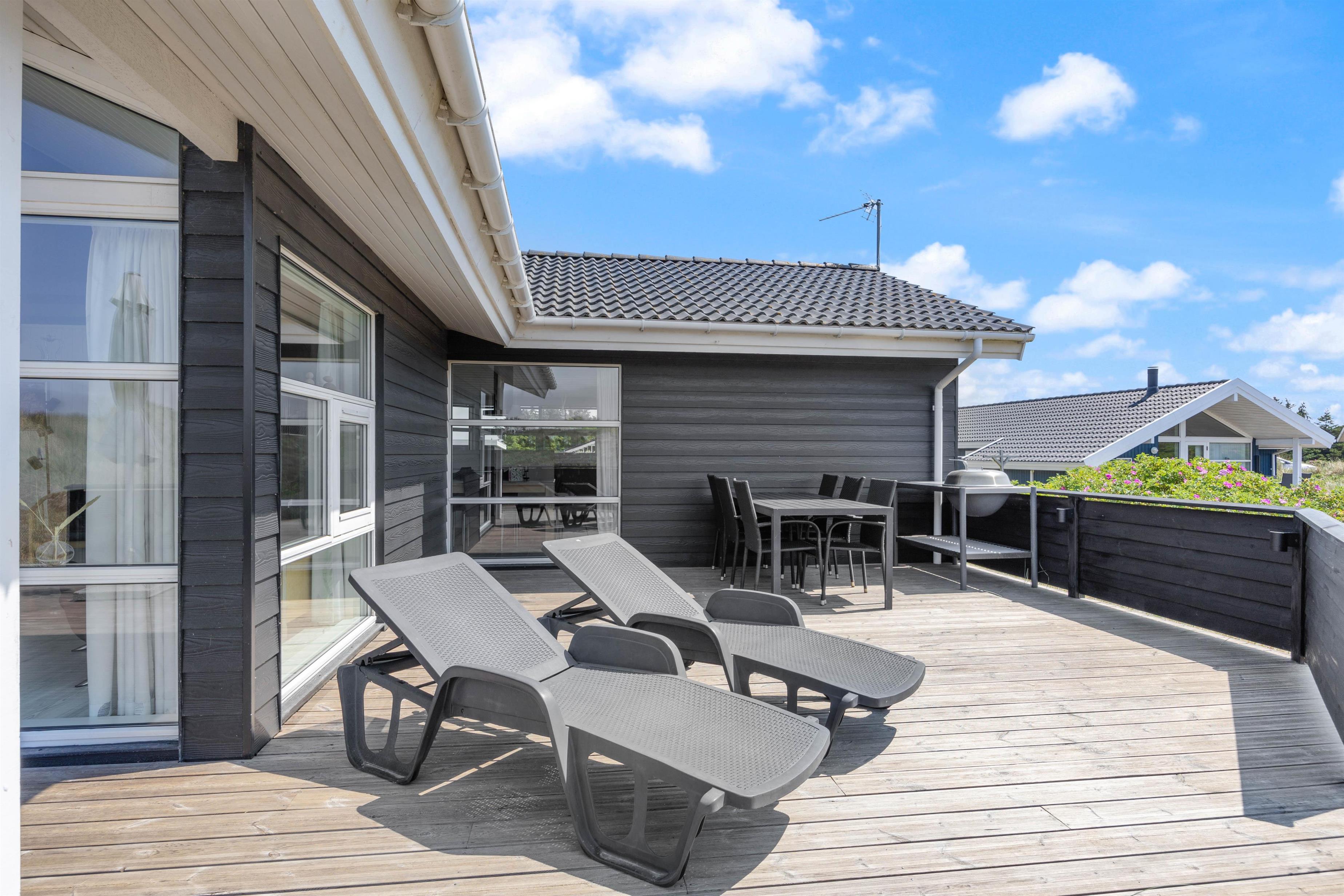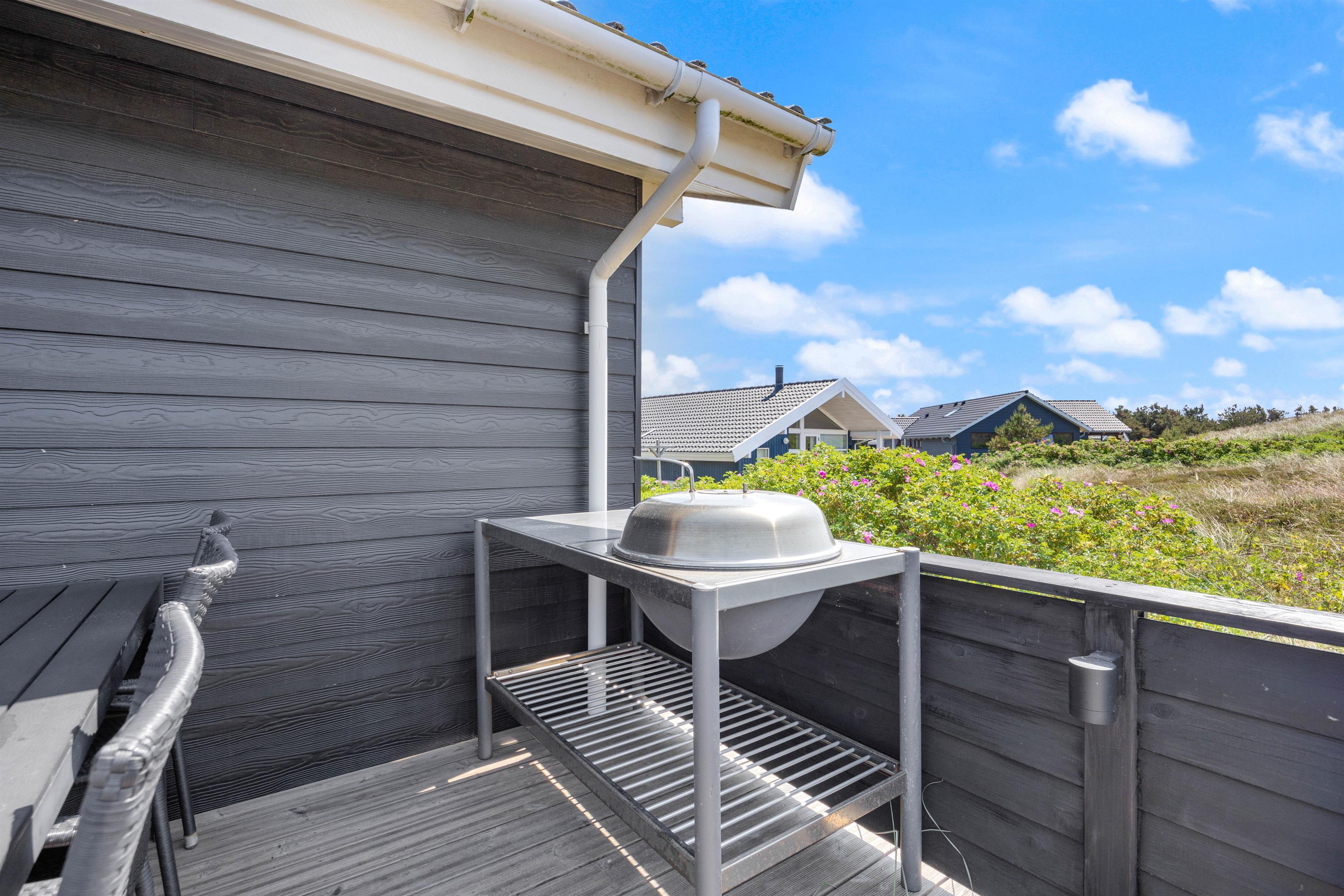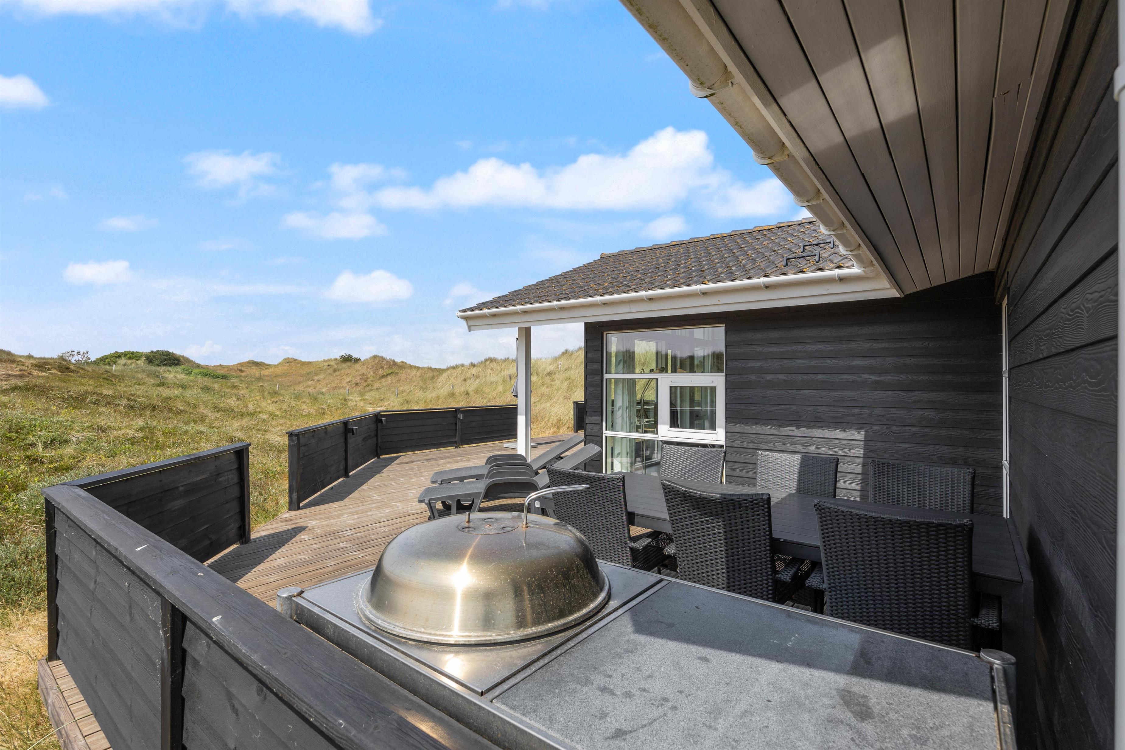 På sommerhusets gode og helt ugenerede terrasser er det altid muligt at finde gode lækroge, hvor solen og den friske havluft nydes inden aftenens grillhygge. Afstanden til den brede sandstrand er kun ca. 800 meter og for børnene er der gode legeredskaber til rådighed.