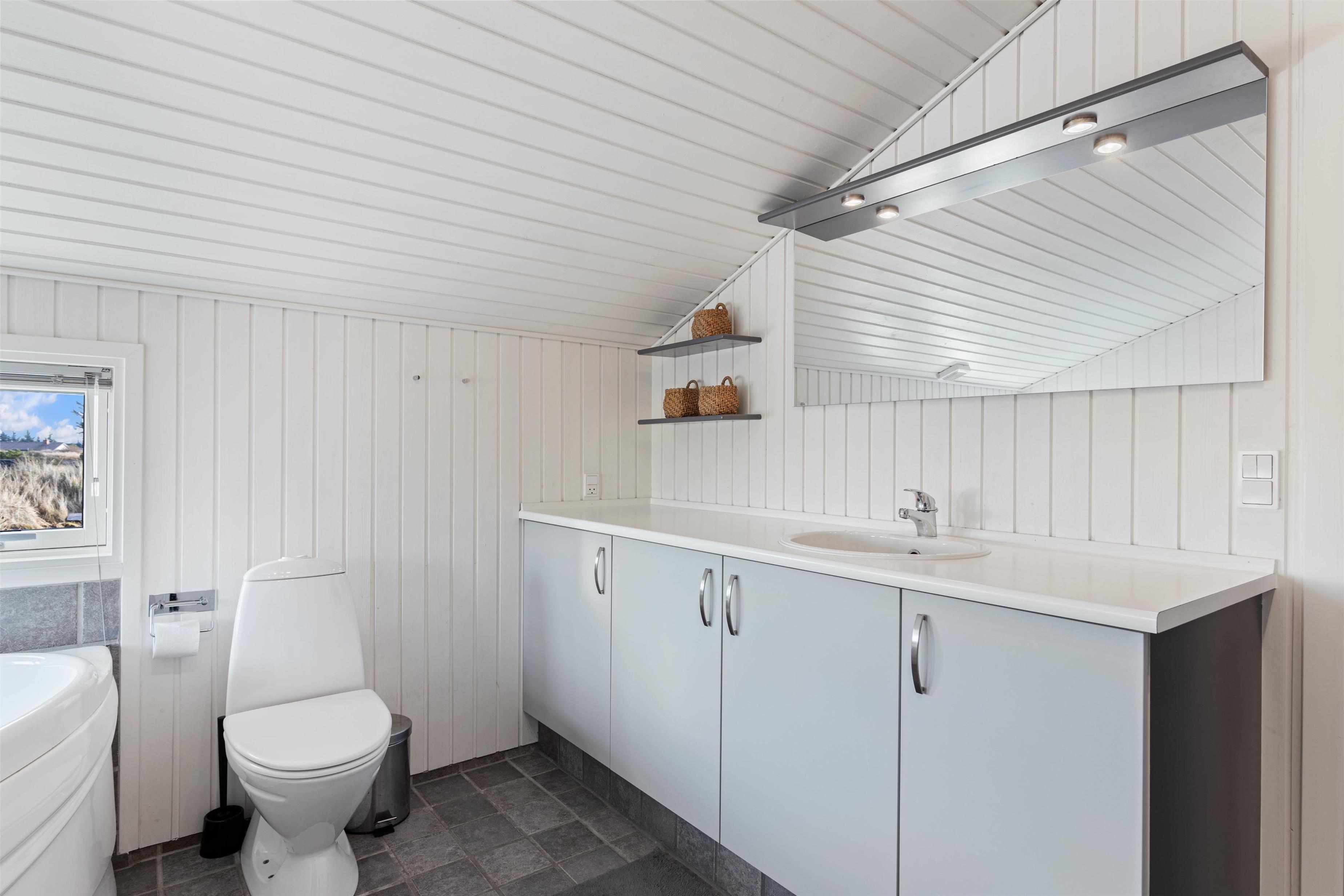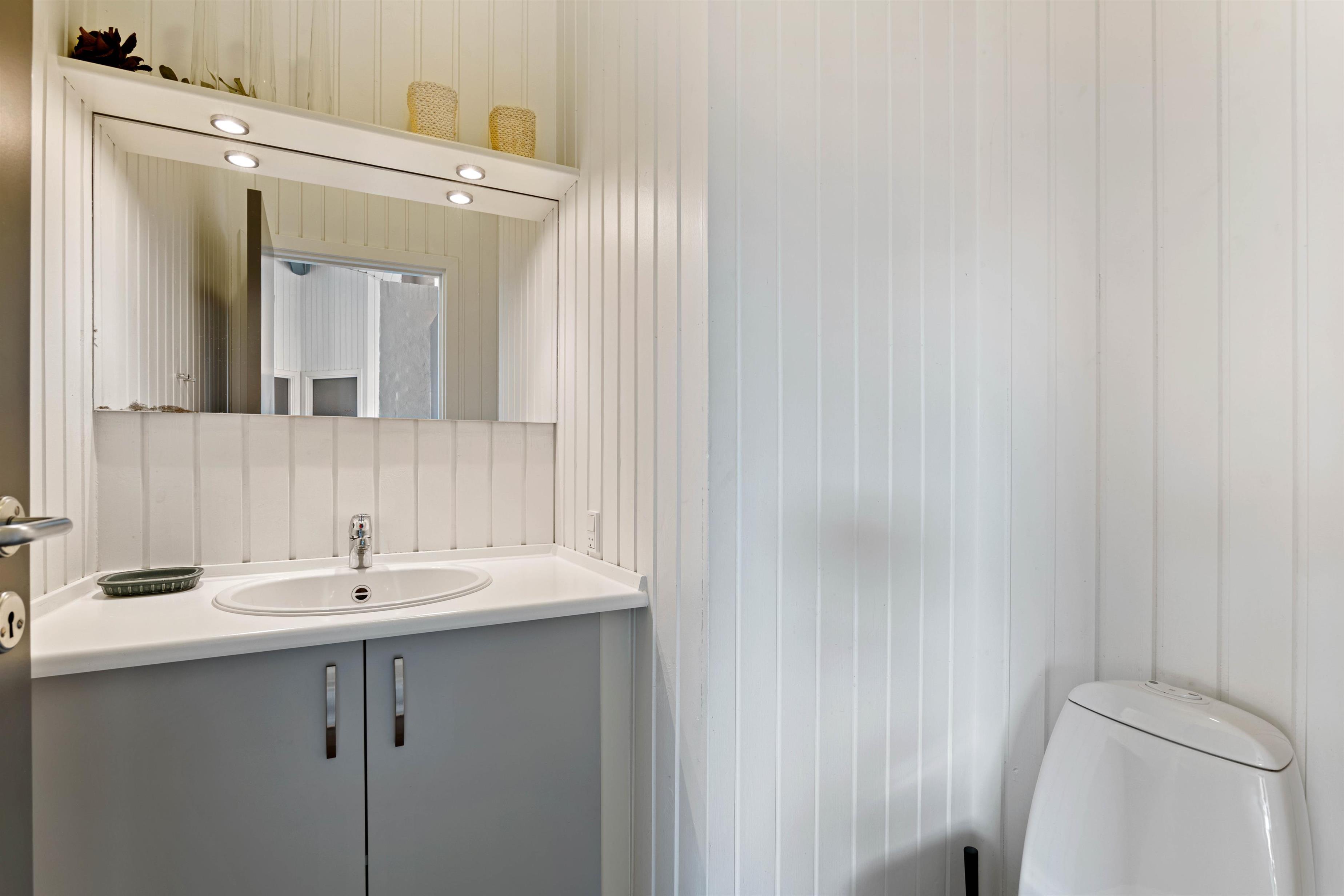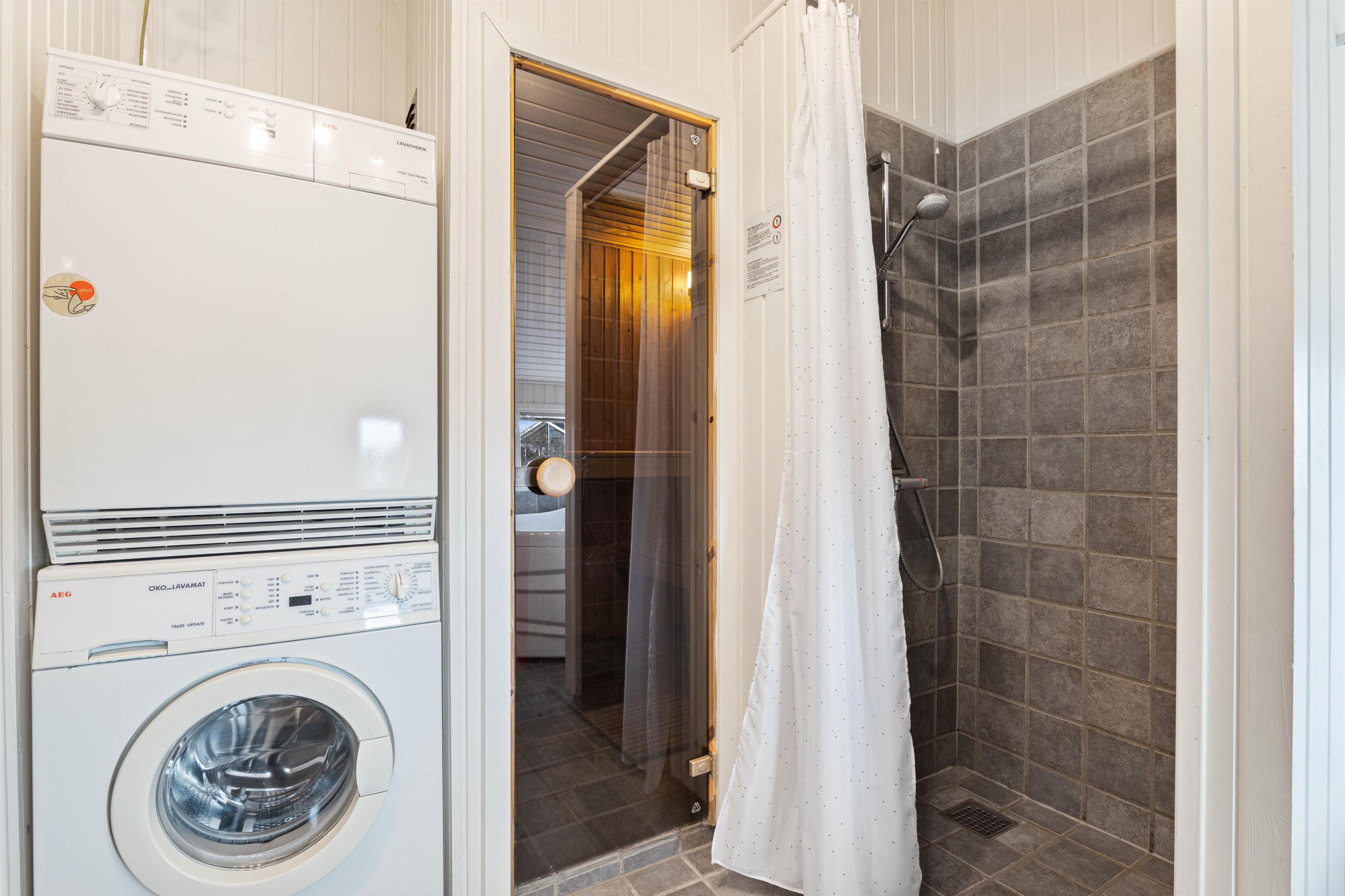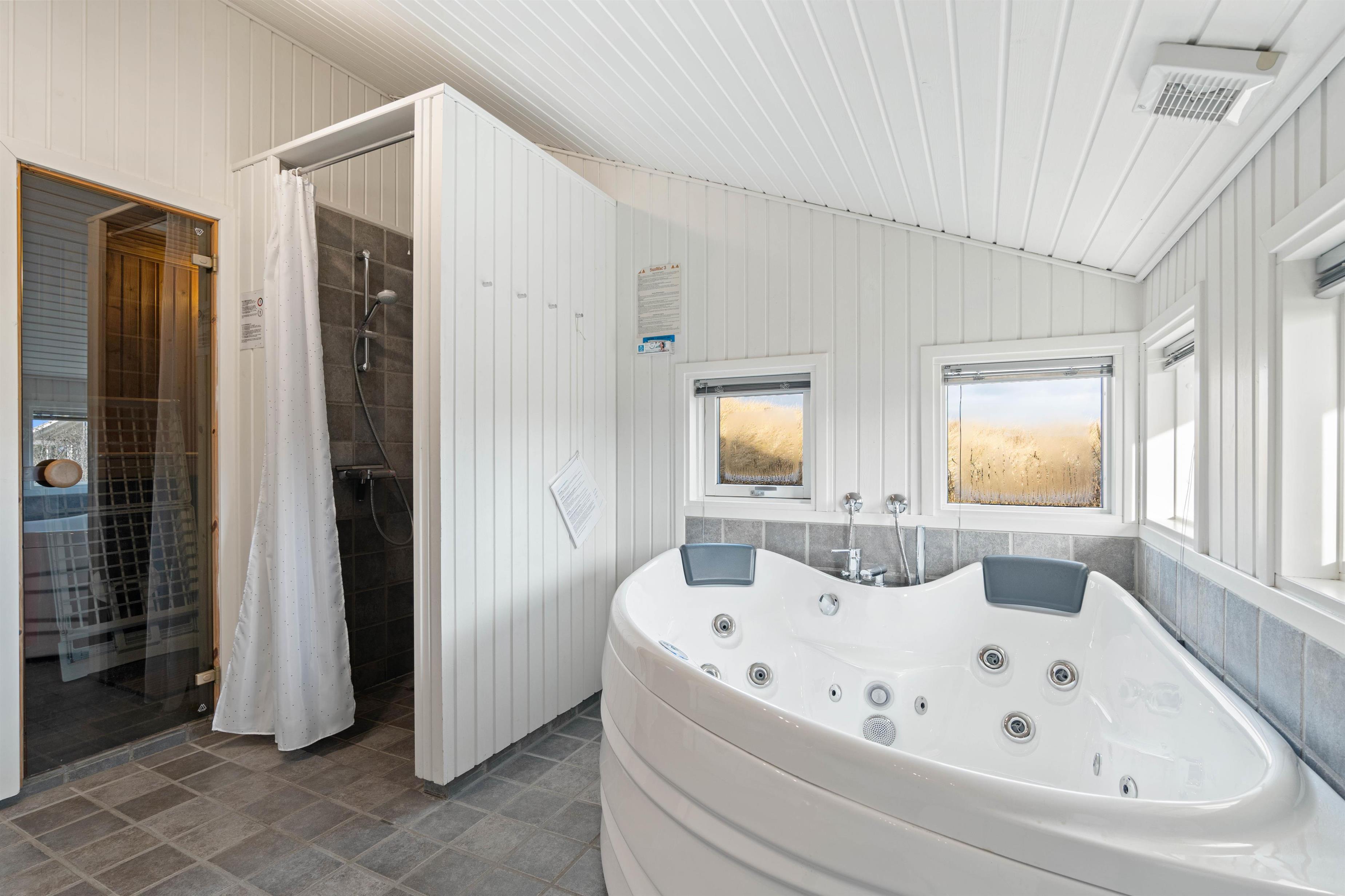 På badeværelset med gulvvarme byder sommerhuset på 2-personers spabad og en afstressende sauna – helt perfekt efter en tur ved stranden. Som et ekstra plus er der et fint gæstetoilet i sommerhuset. Desuden er der både vaskemaskine og tørretumbler i feriehuset, så I har muligheden for at vaske lidt tøj eller håndklæder.