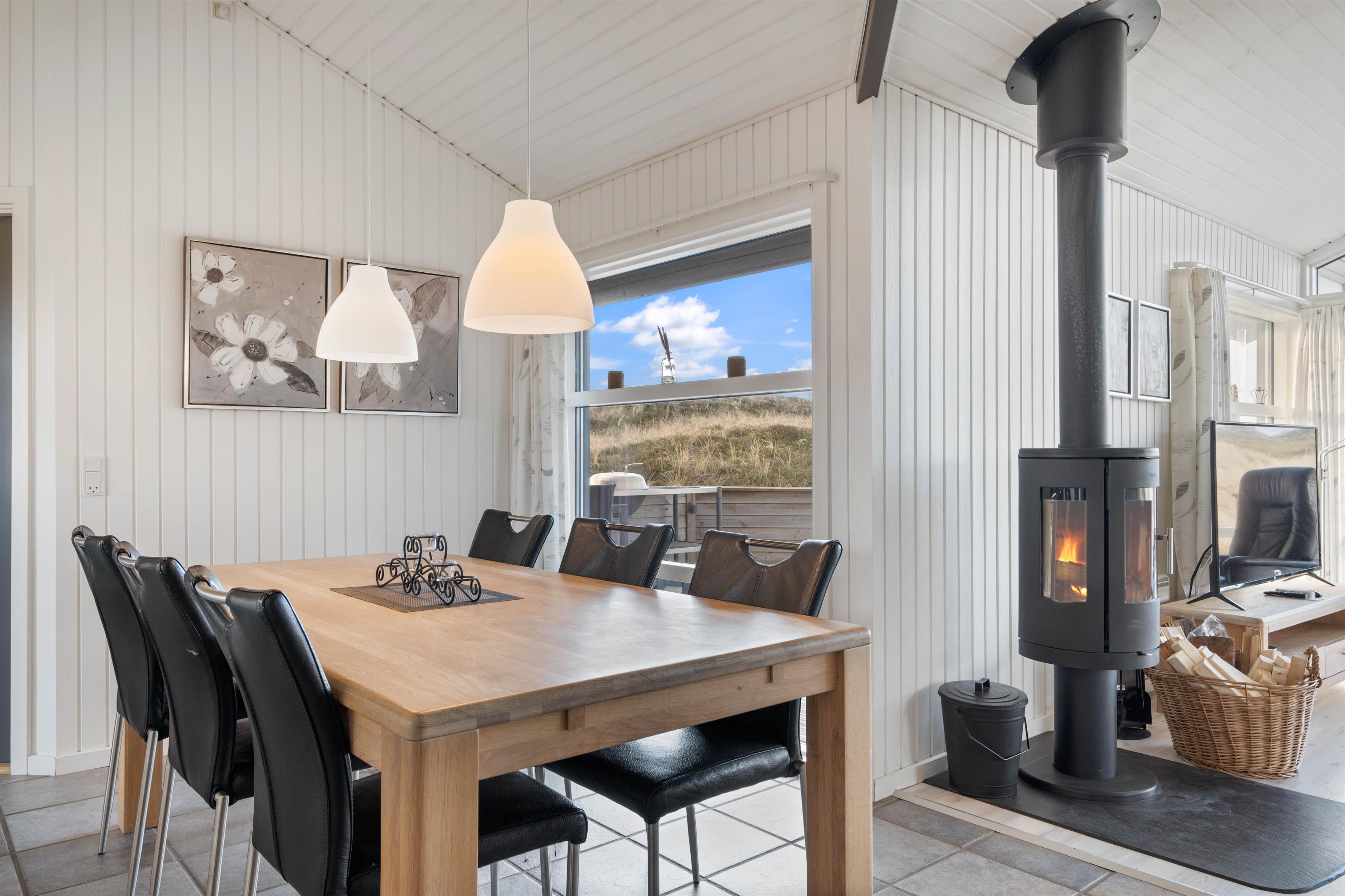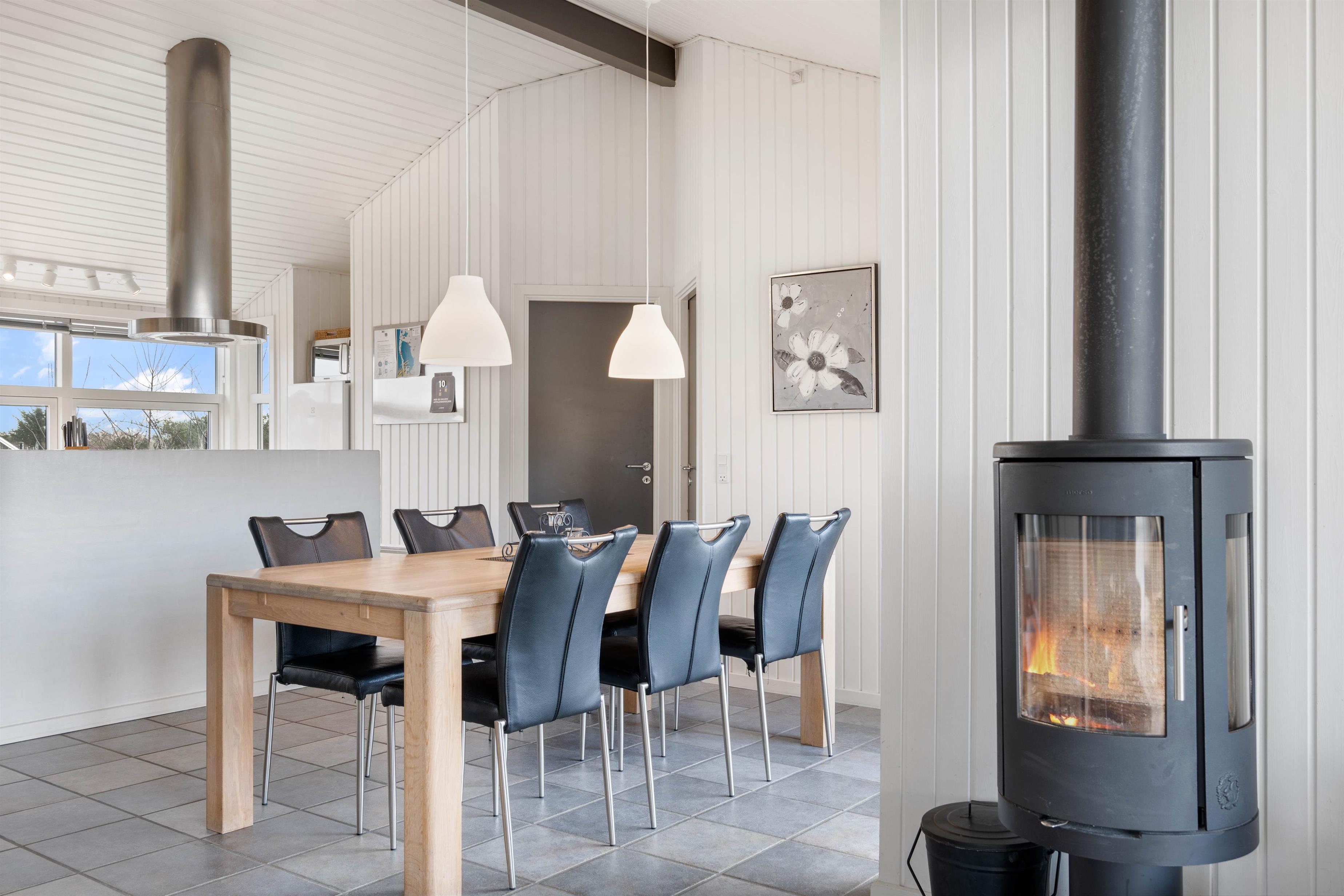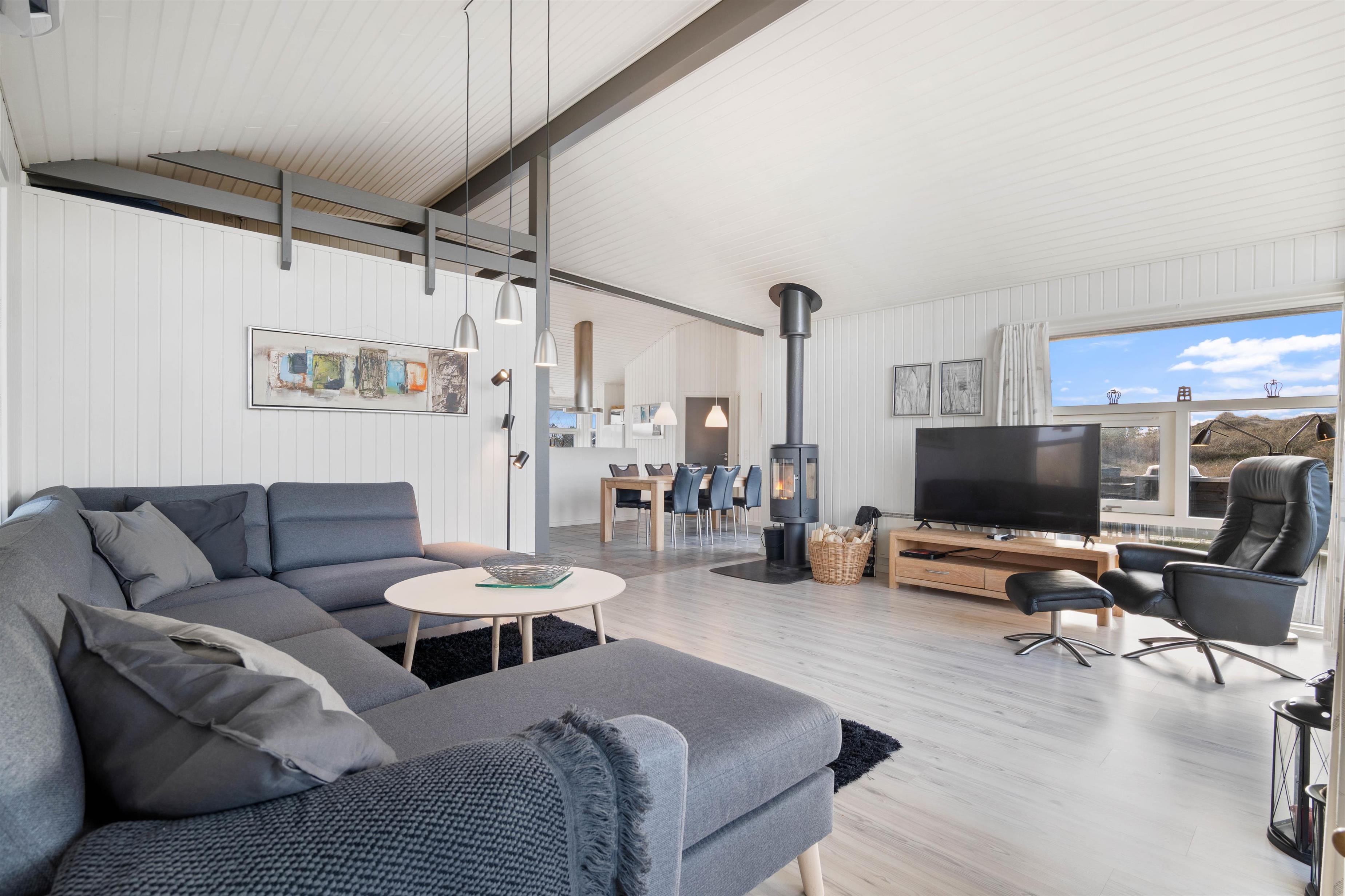 Det er et rigtig indbydende og rummeligt feriehus med elegant og moderne indretning – lige fra det veludstyrede køkken over den fine spiseafdeling til den særdeles gode hygge- og opholdsafdeling med en robust og lunende brændeovn.