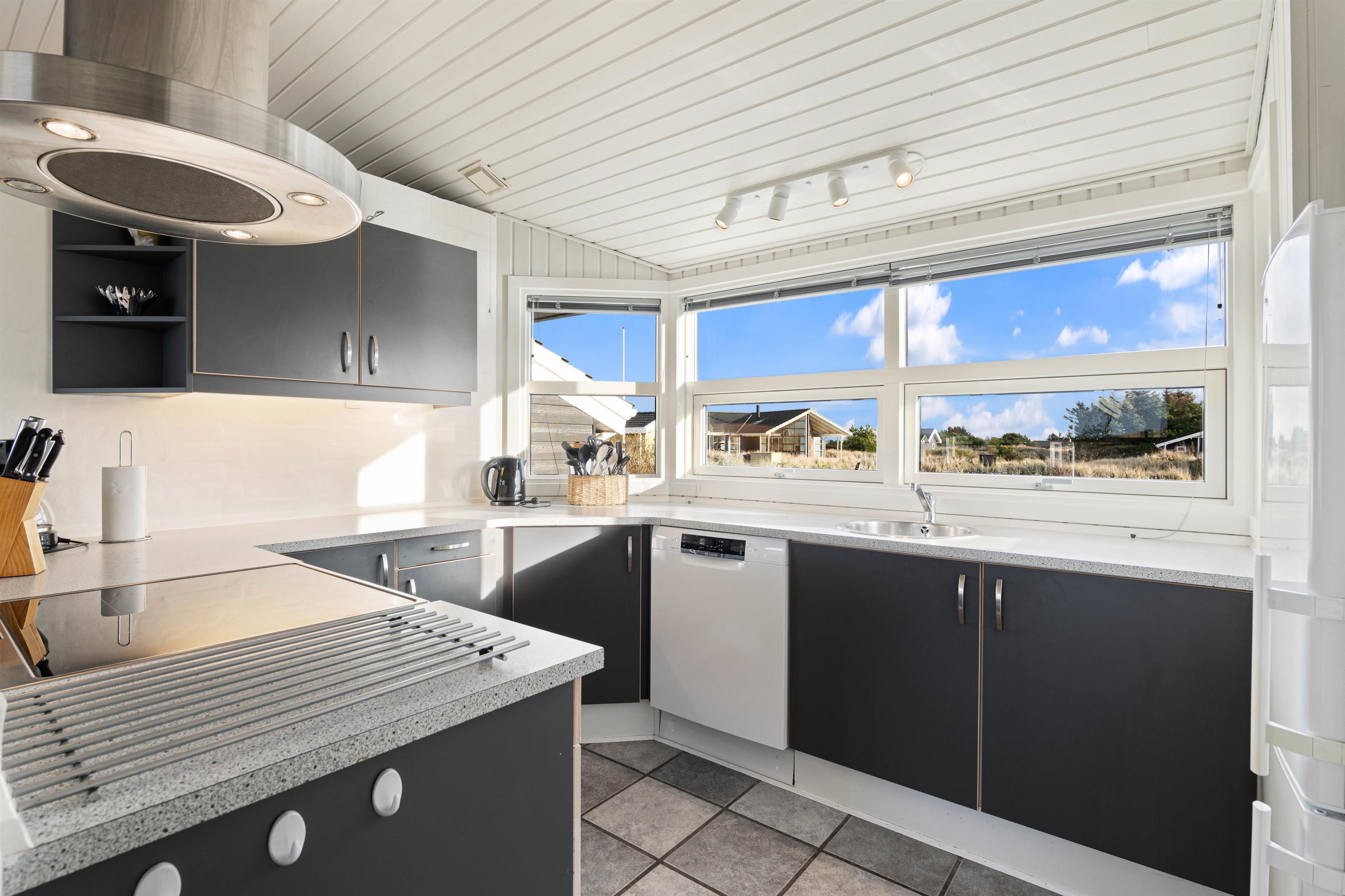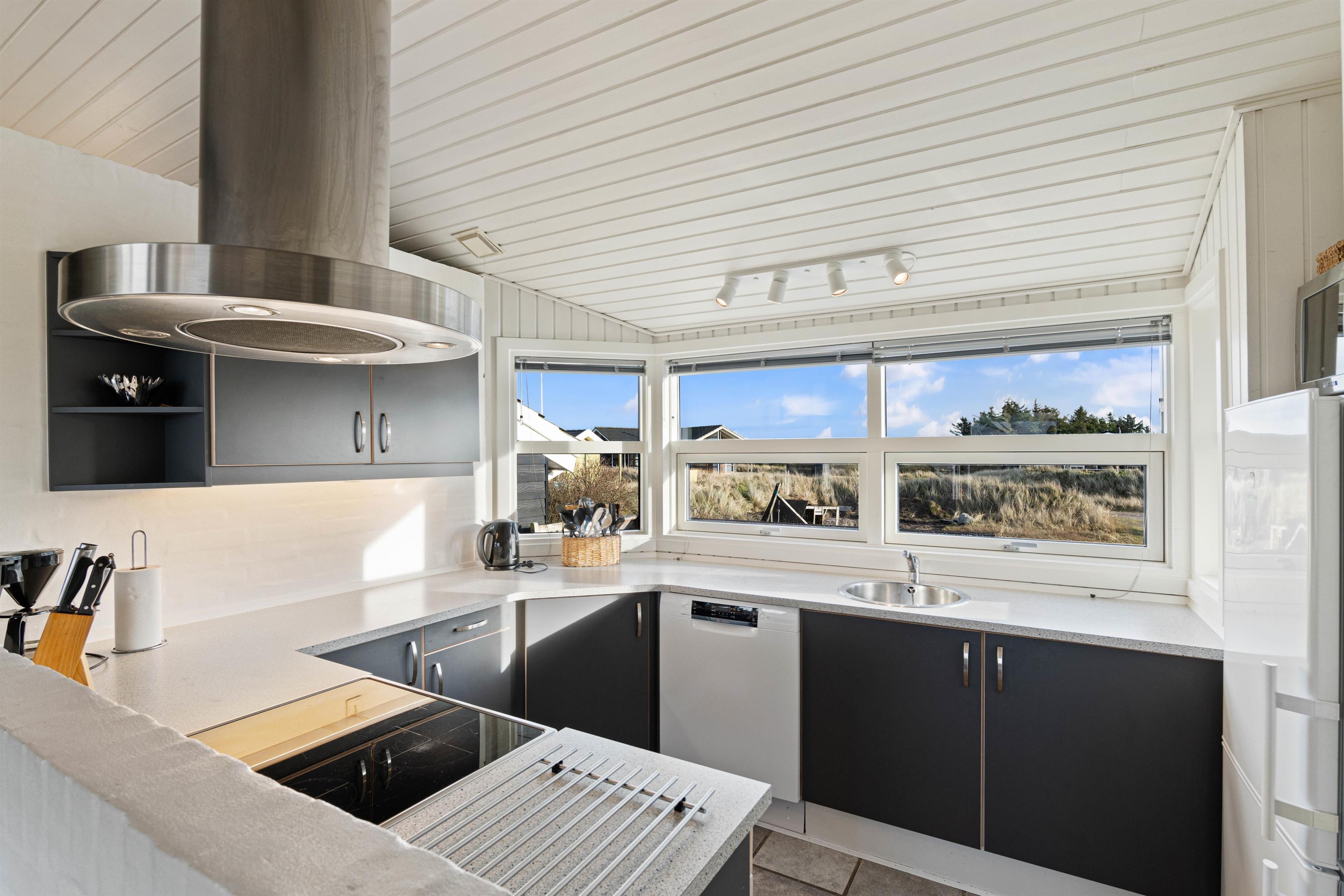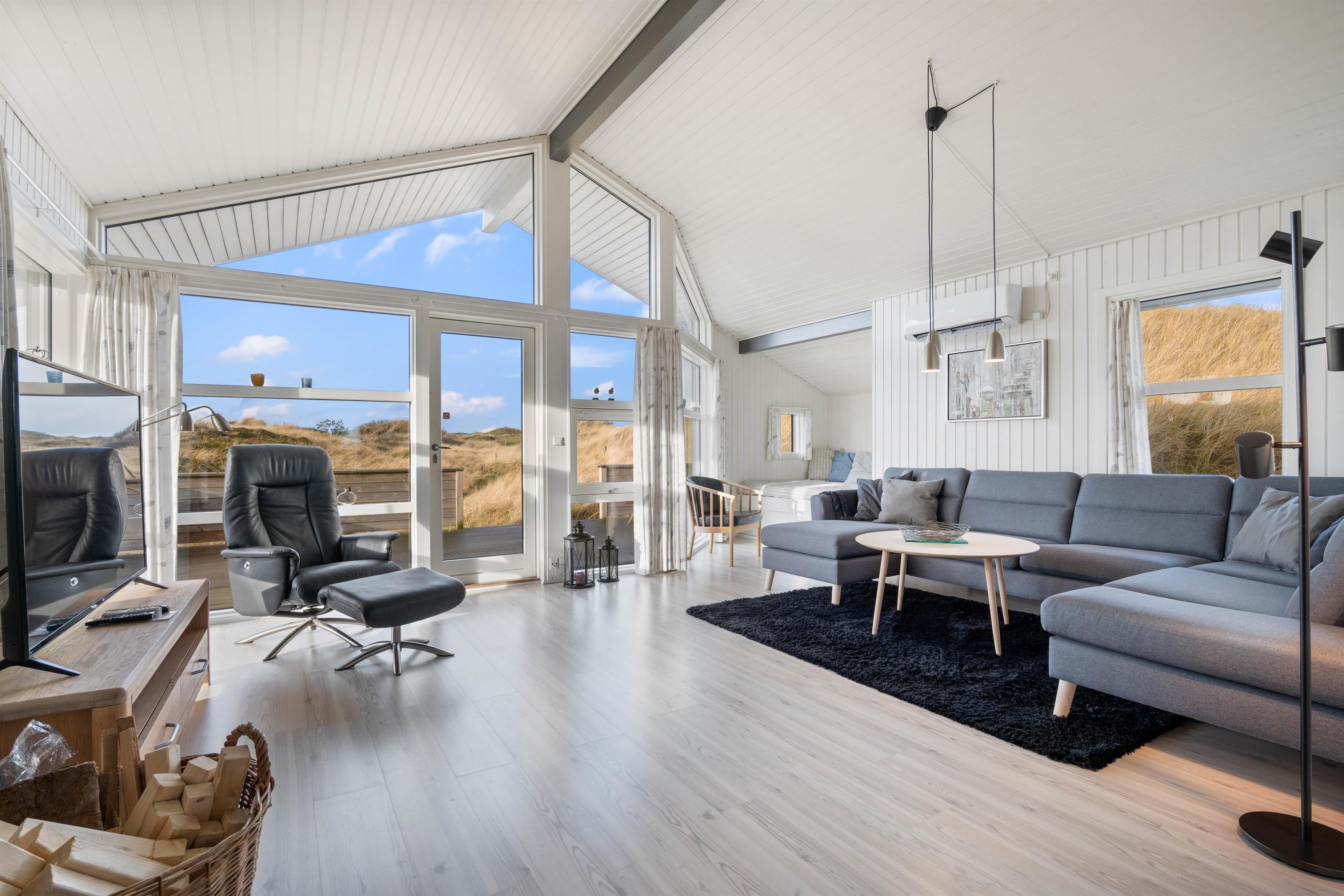 Det er et rigtig indbydende og rummeligt feriehus med elegant og moderne indretning – lige fra det veludstyrede køkken over den fine spiseafdeling til den særdeles gode hygge- og opholdsafdeling med en robust og lunende brændeovn.