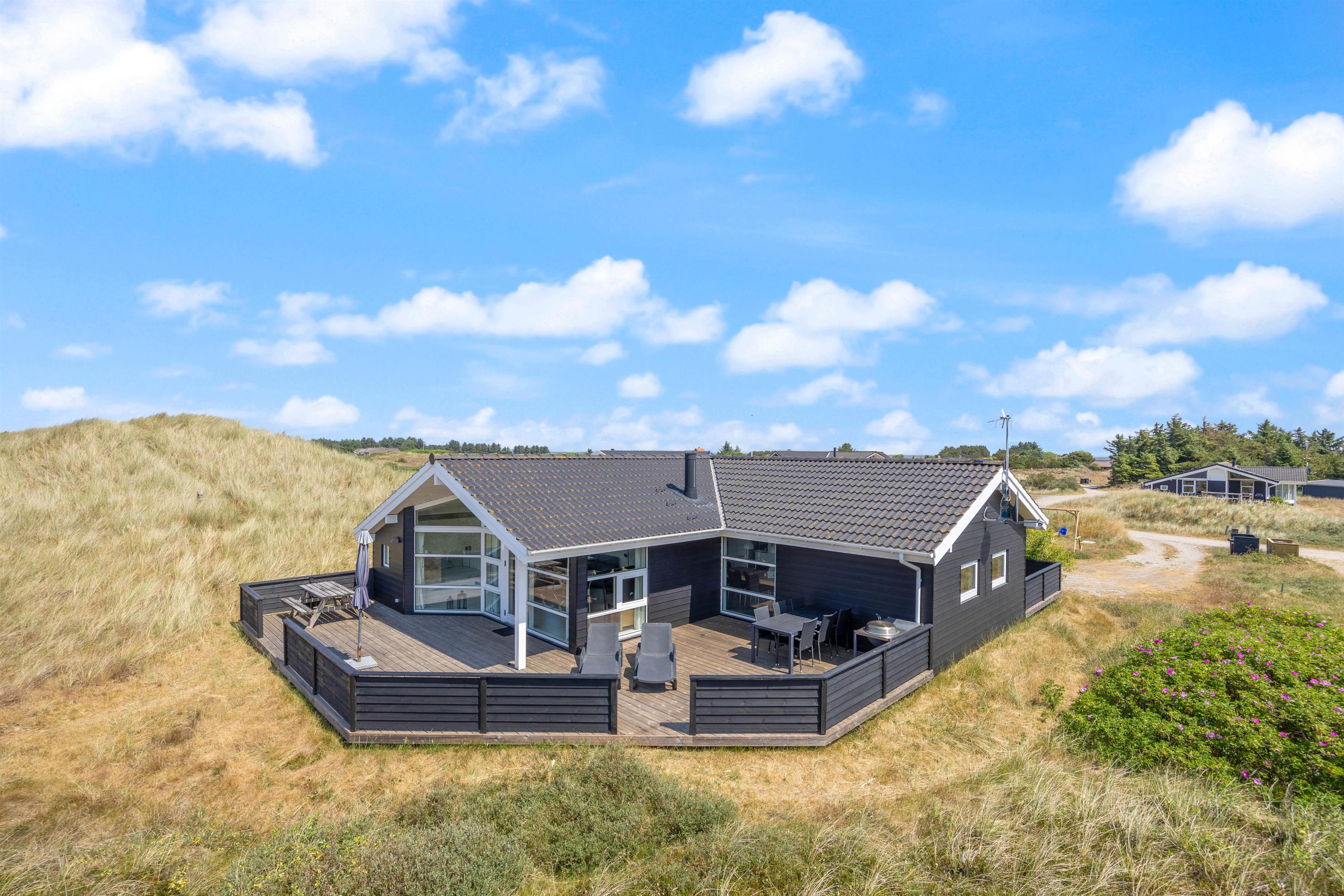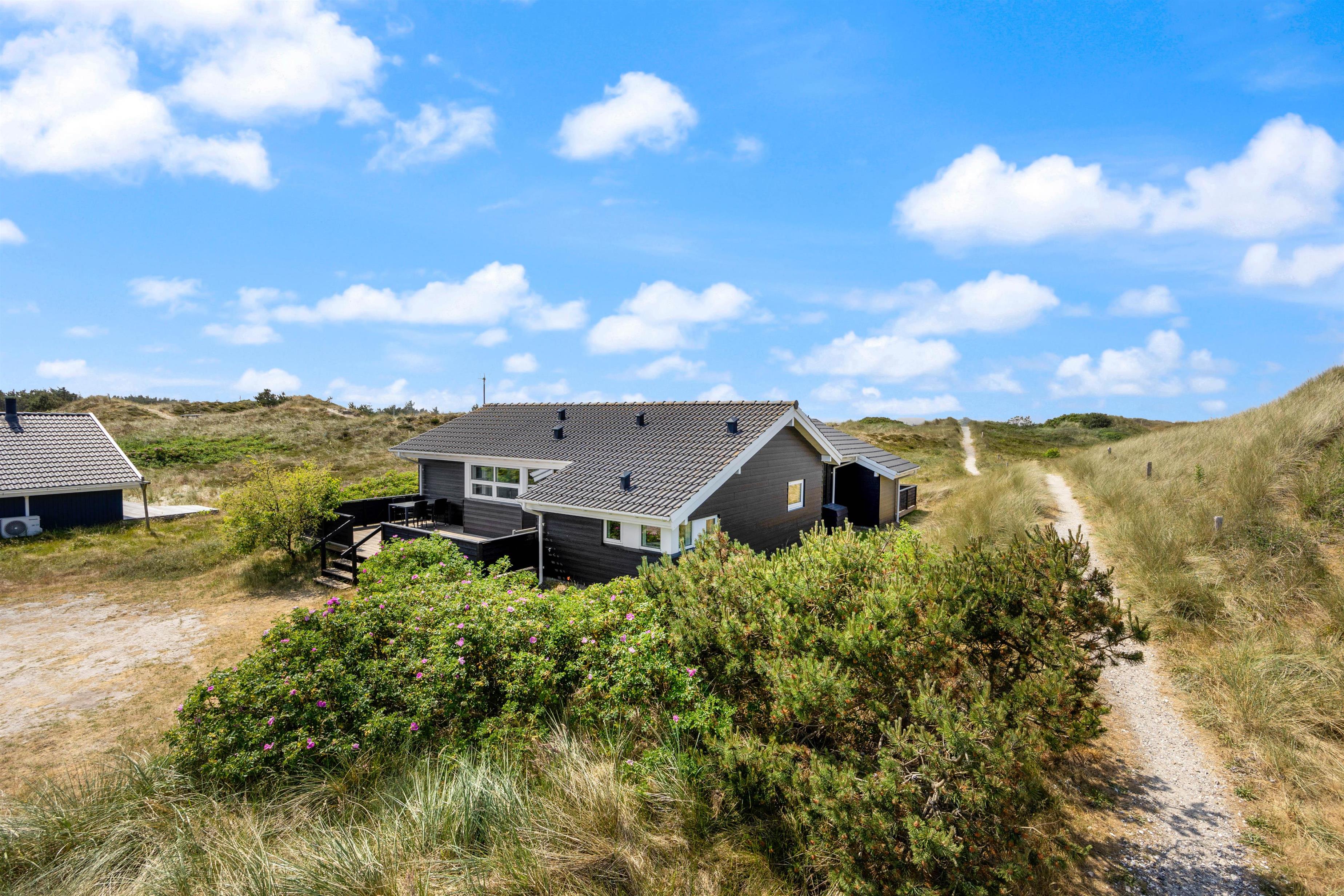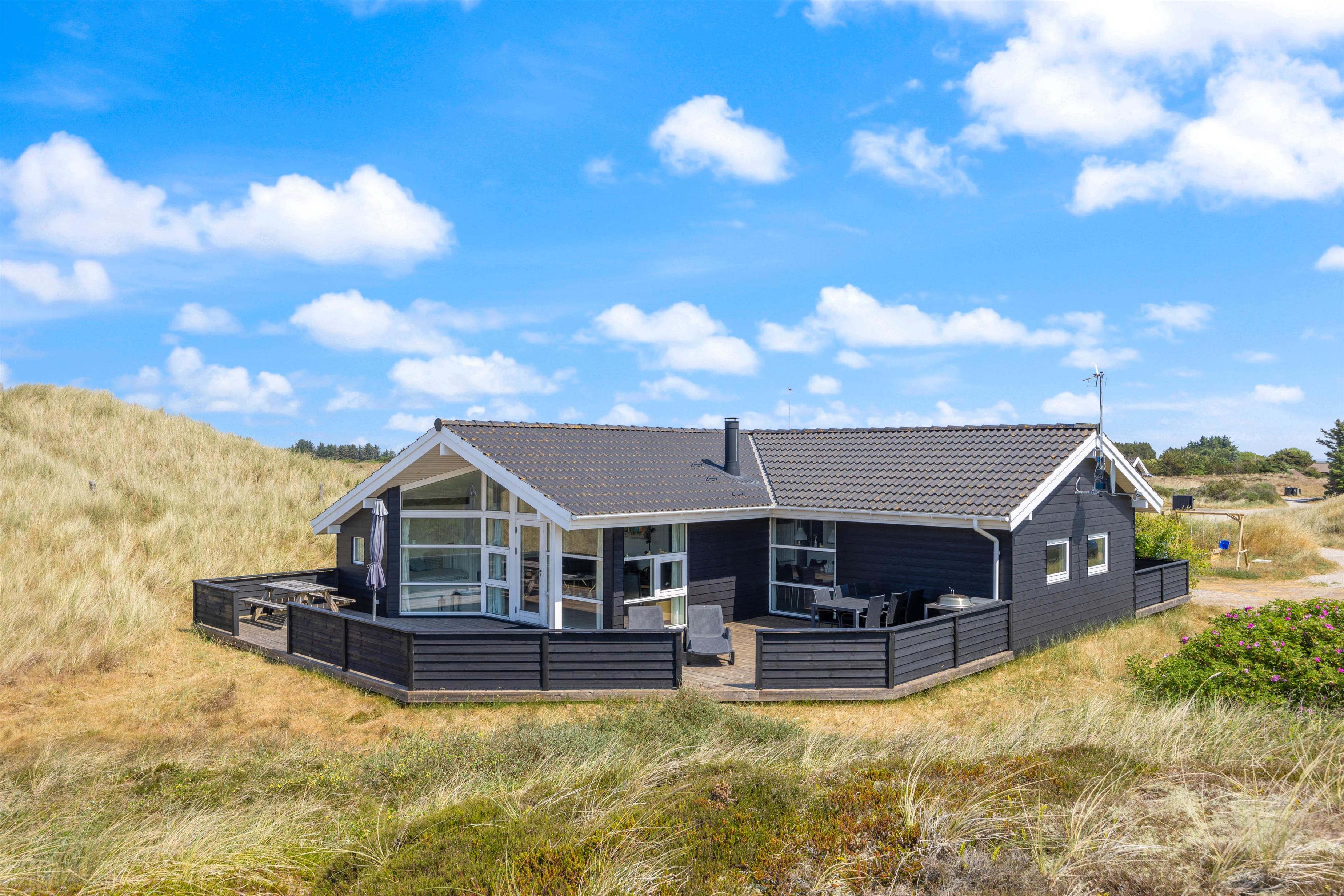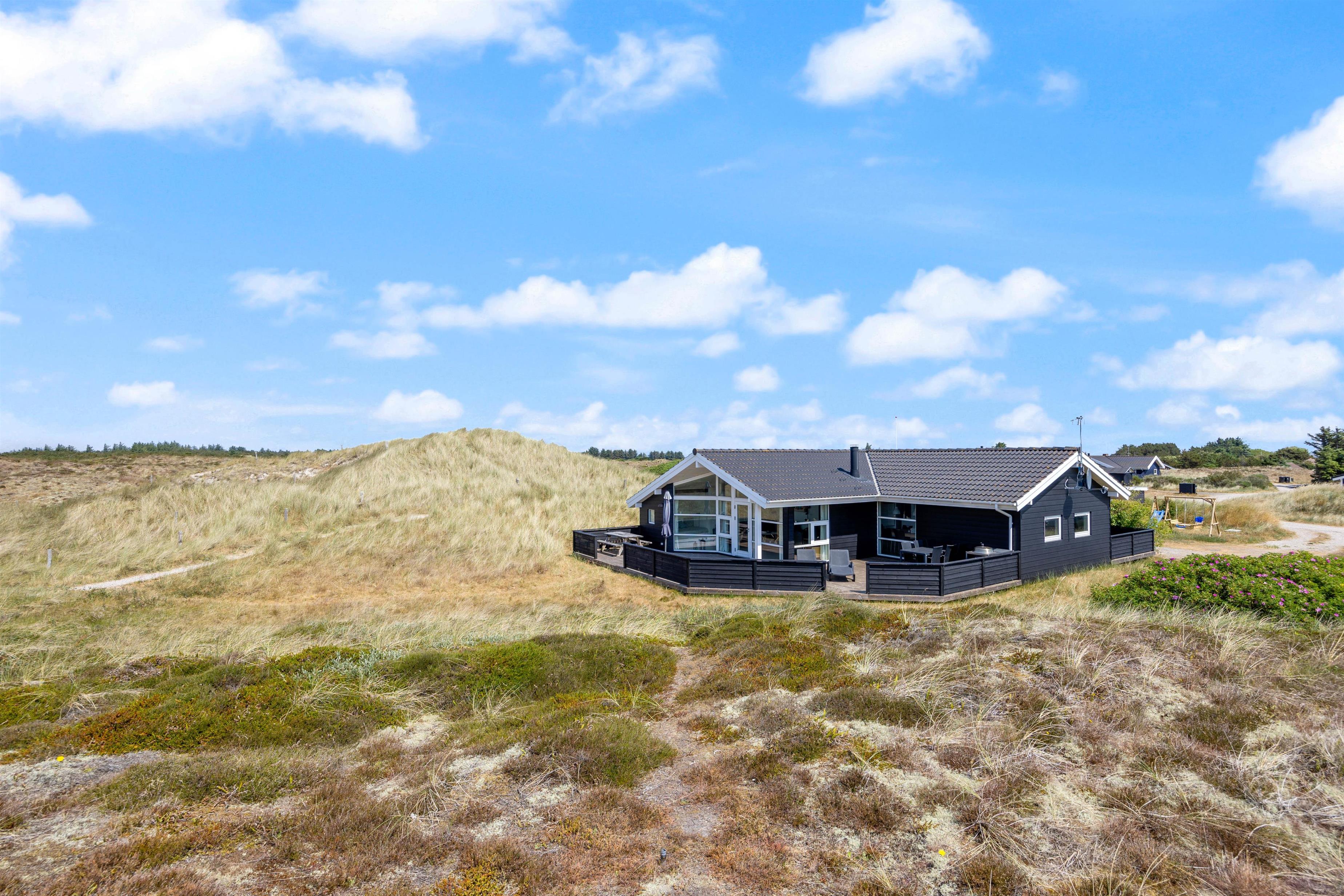 Her finder I et dejligt og hyggeligt feriehus i gåafstand for Vesterhavet. Derudover ligger det på en stor klitgrund ved et stort fredet hedeområde, så du på sommerhusets gode og delvis afskærmede terrasser ugeneret kan slappe af. I feriehuset har du også en fin wellnessafdeling med spabad og sauna.