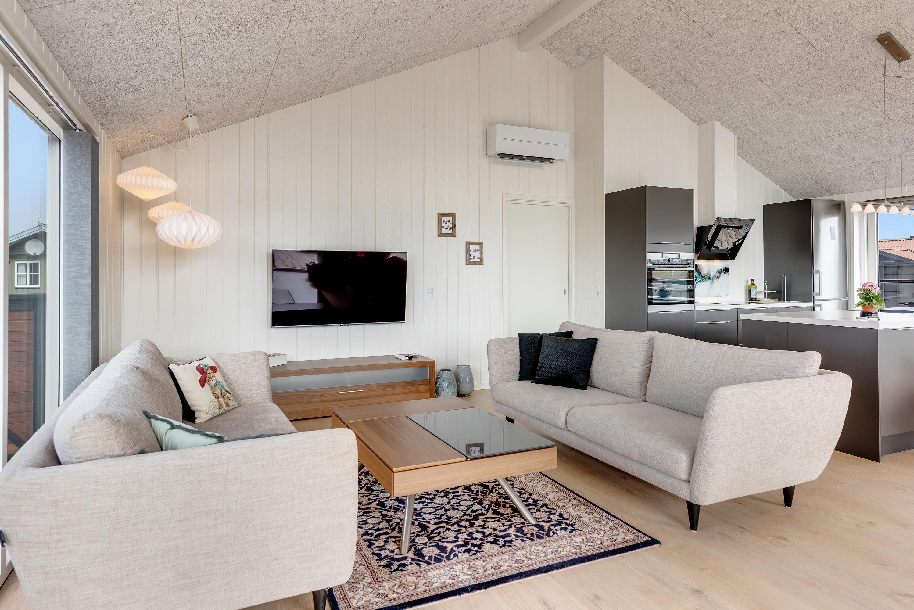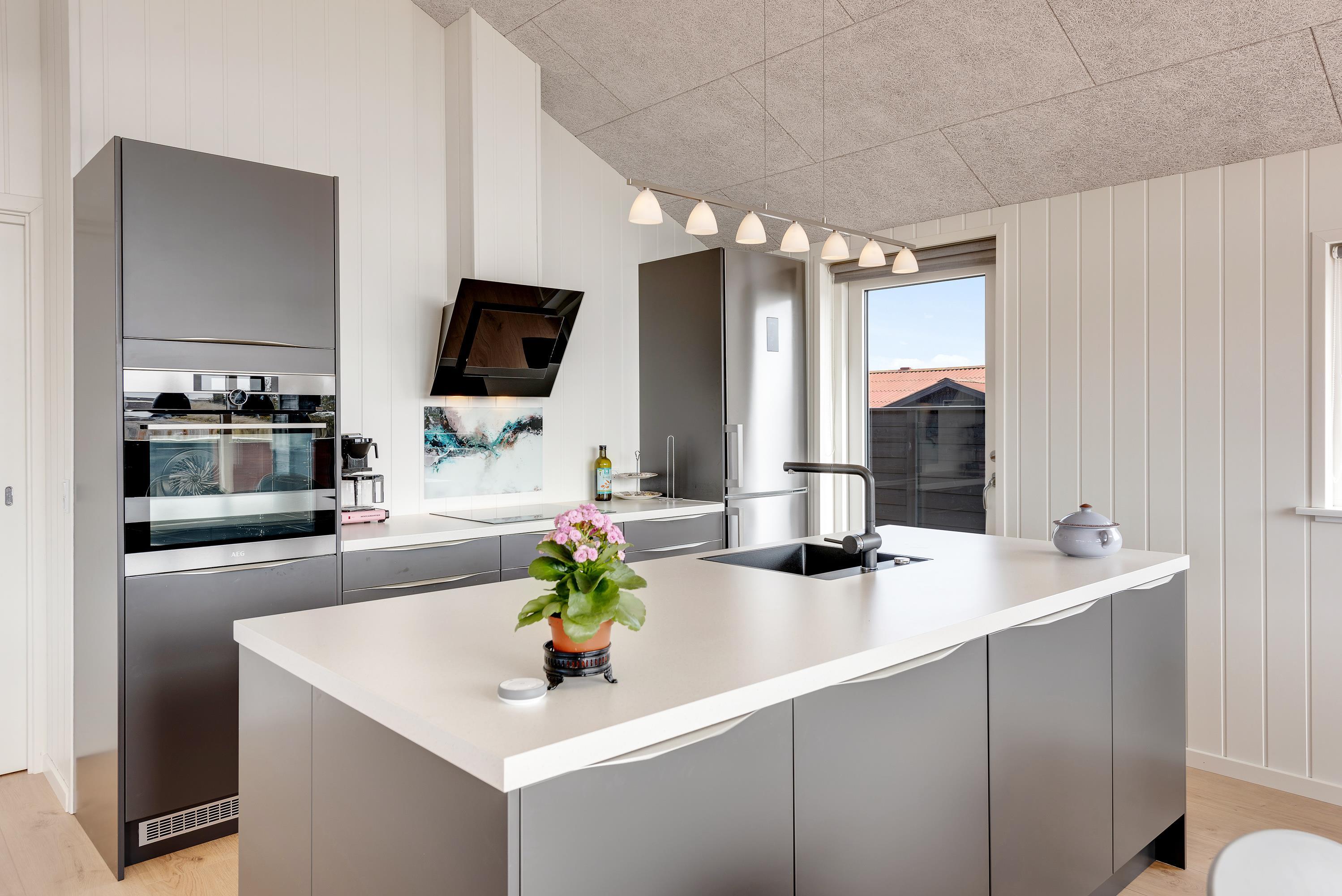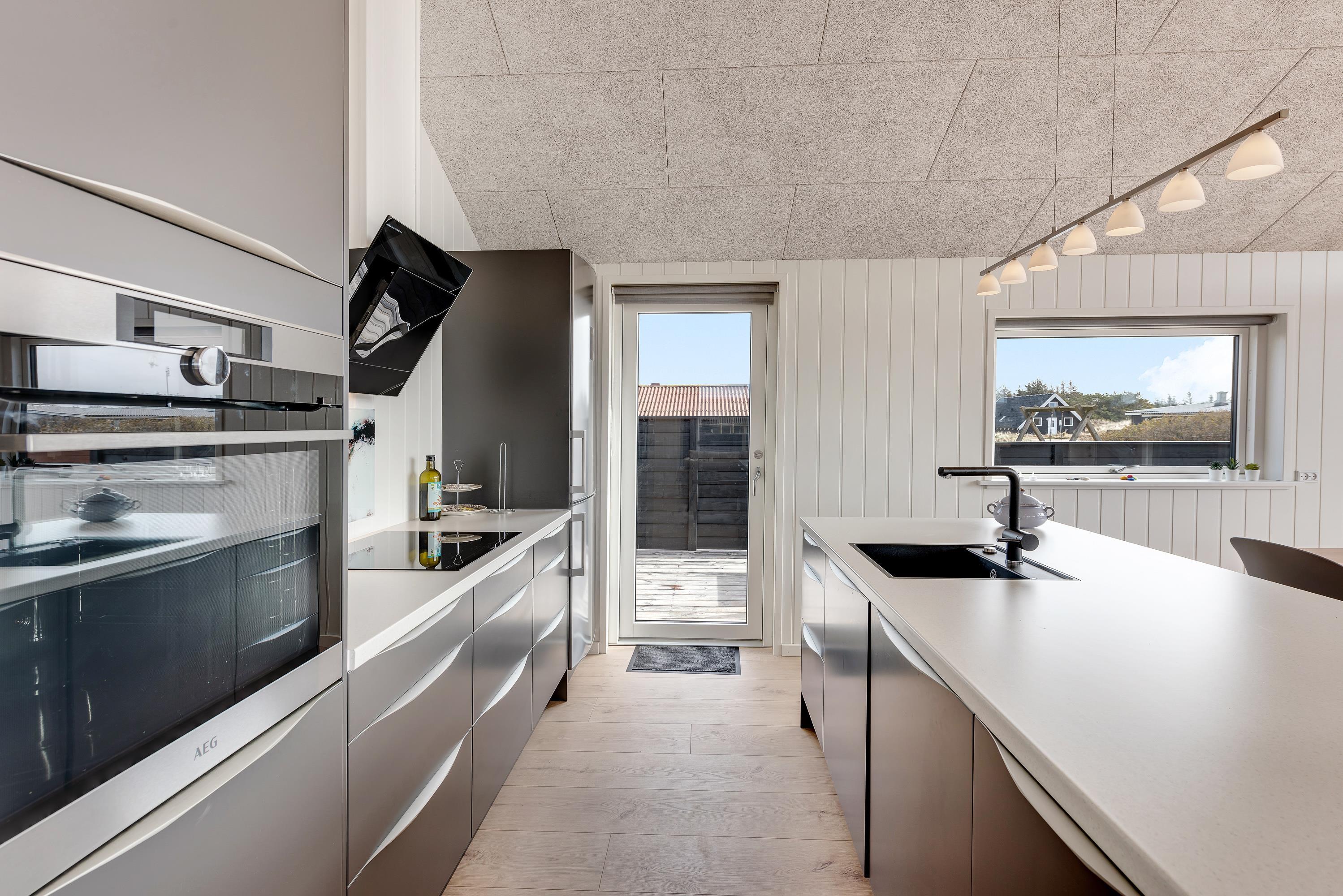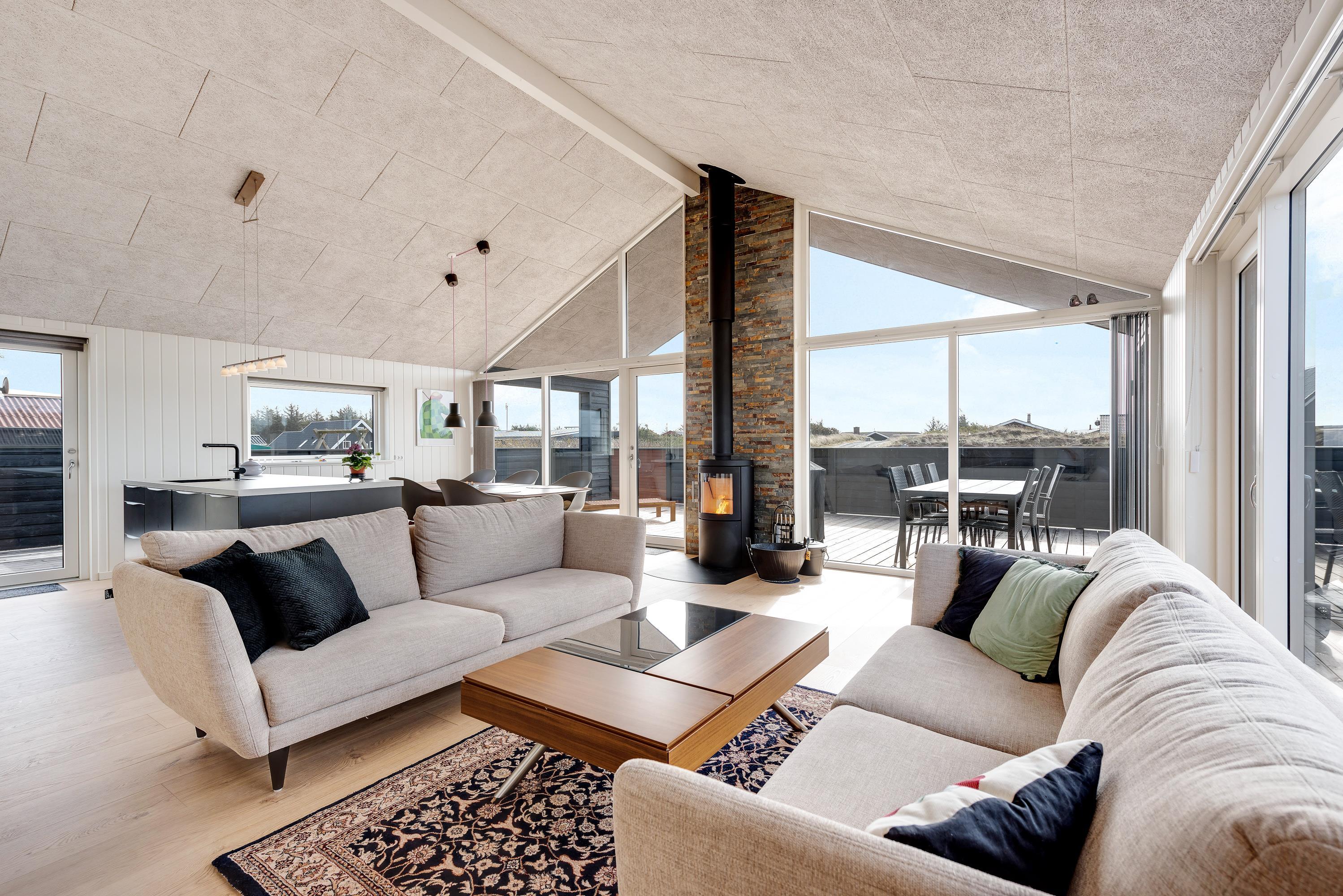 Feriehuset er lavet i kvalitetsmaterialer og er flot og praktisk indrettet. Det lyse og velindrettede opholdsrum med køkken- og spiseafdeling er det naturlige samlingspunkt. Fra den veludrustede køkkenafdeling med bl.a. 40 l. fryser, mikroovn og opvaskemaskine har I udsigt til hele rummet – og ud til sommerhusområdet og klitlandskabet igennem de store panoramavinduer mod syd.