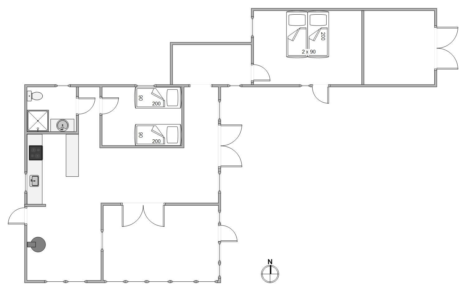 Til nattesøvnen har I 2 soveværelser: en med dobbeltseng og en med 2 enkeltsenge. Det lille, klassiske badeværelse skiller sig ud med sin markante røde bruseniche, som giver rummet et særligt præg.