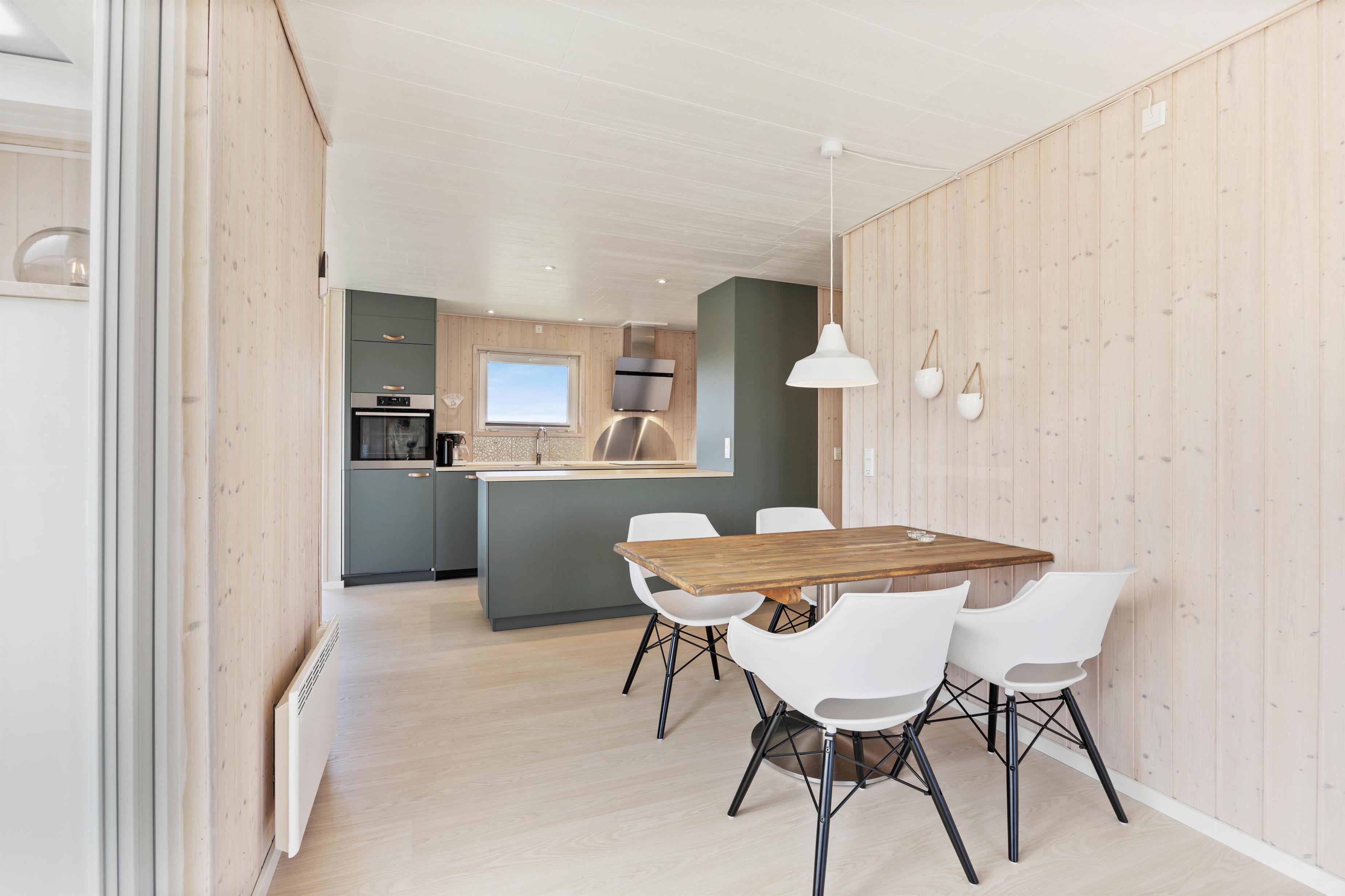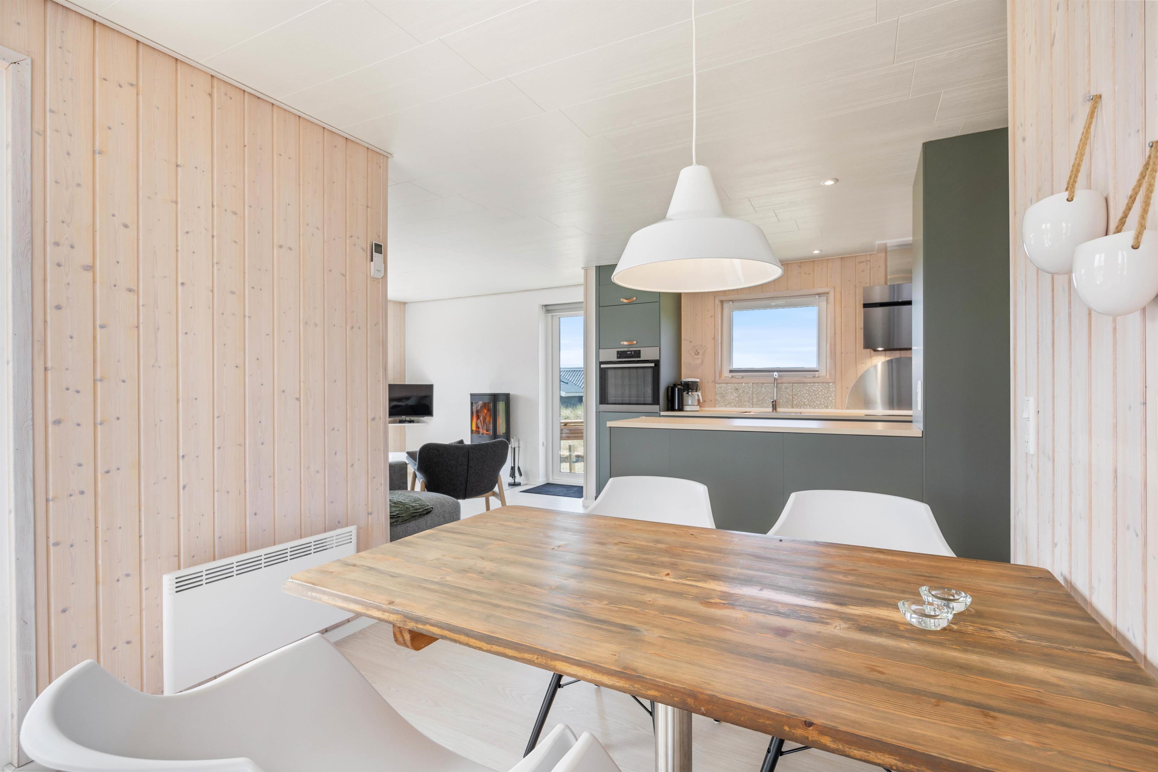 I den kombinerede stue og spisestue med flot trægulv finder I en hyggelig sofaafdeling. Lige ved siden af ligger det moderne køkken med spisebordet, som også er oplagt til brætspil og hyggelige aftener. Mens ilden knitrer i brændeovnen, kan I slappe af i sofaen eller samles om bordet og nyde tiden sammen. Ud over brændeovnen sørger en energieffektiv varmepumpe for en behagelig temperatur.