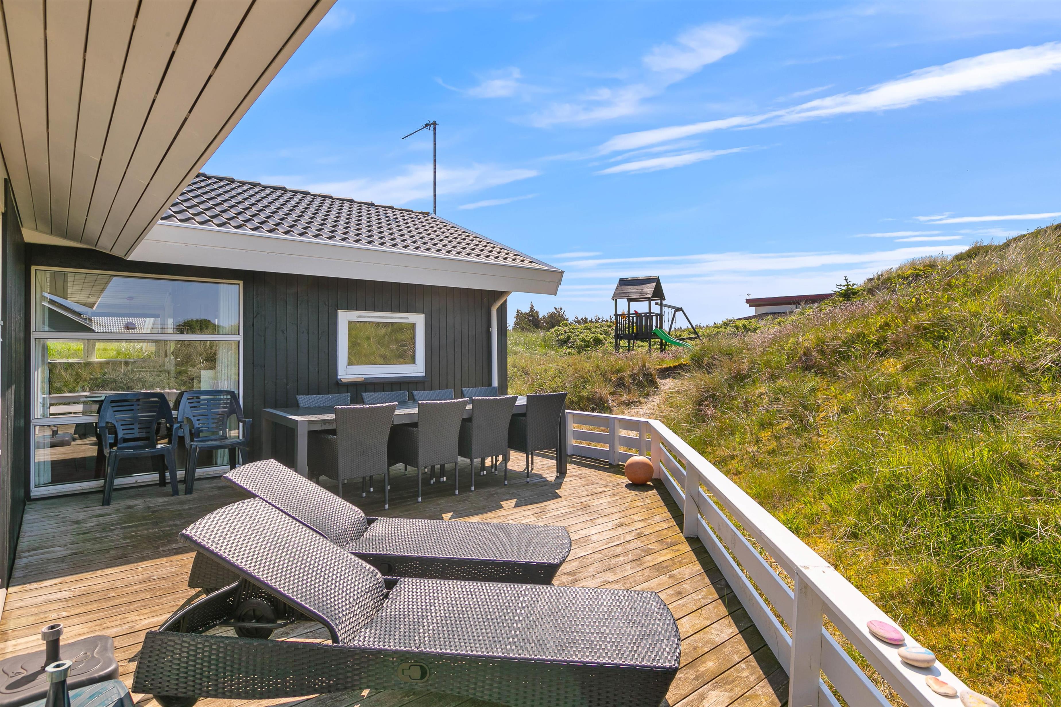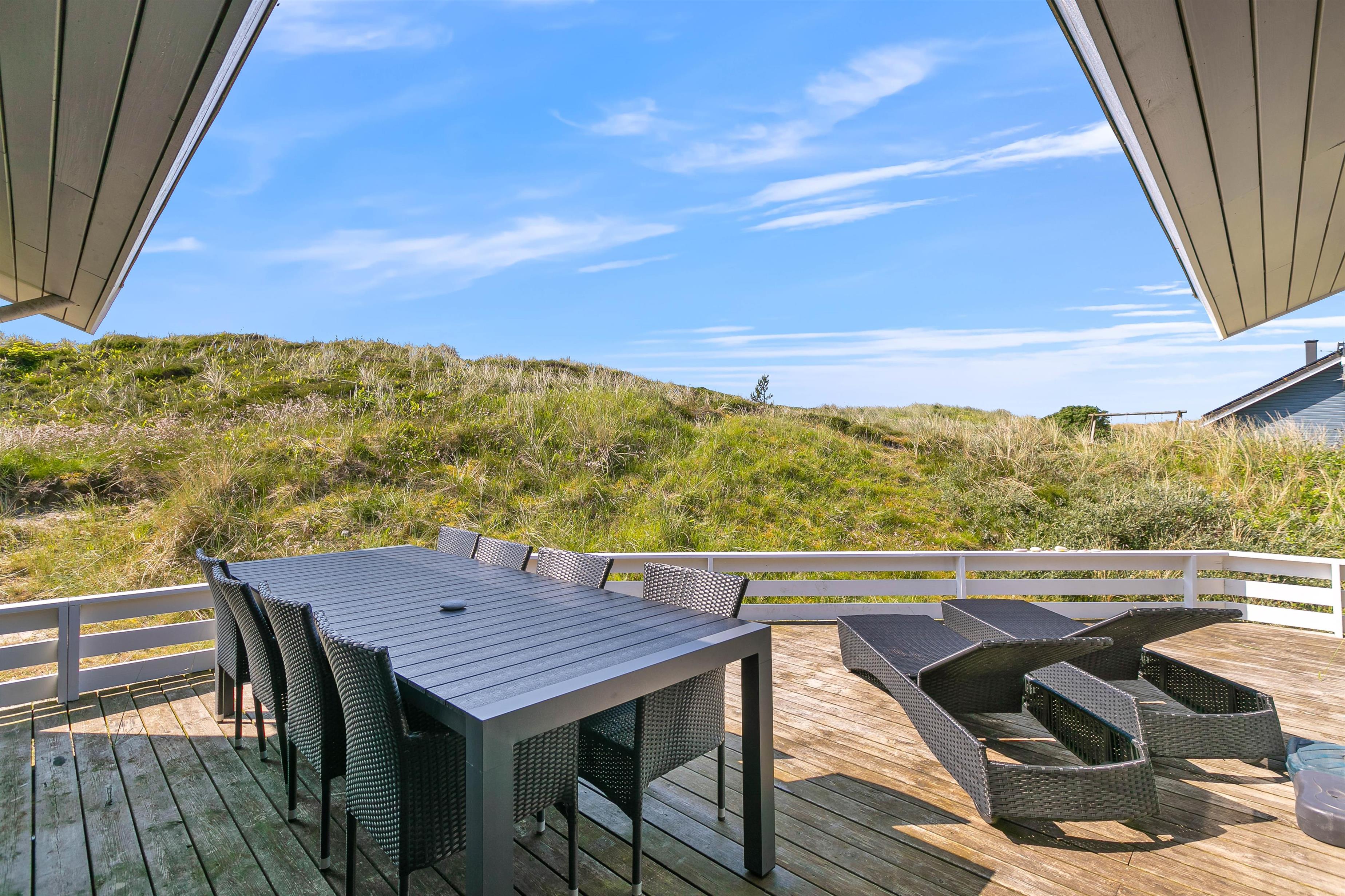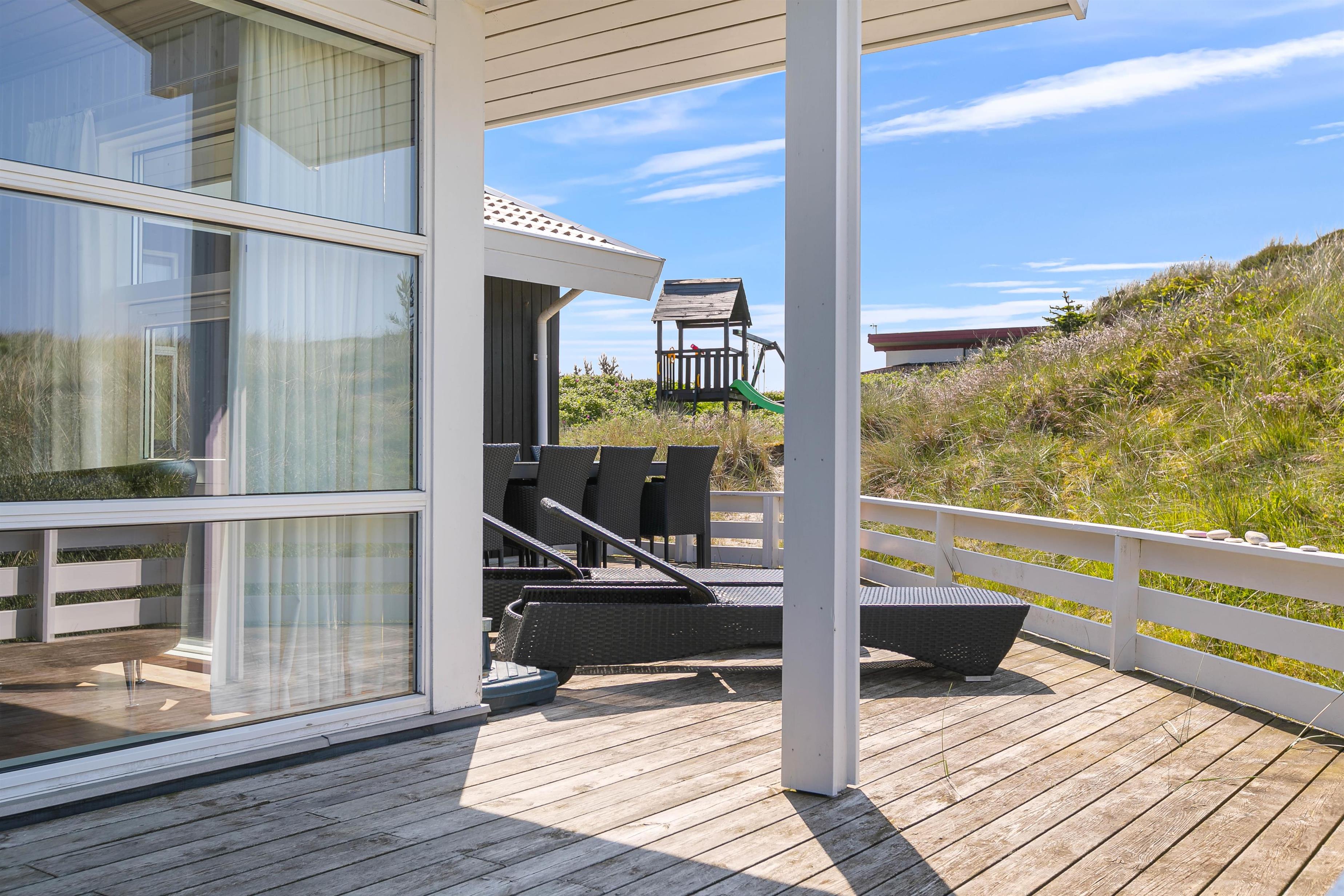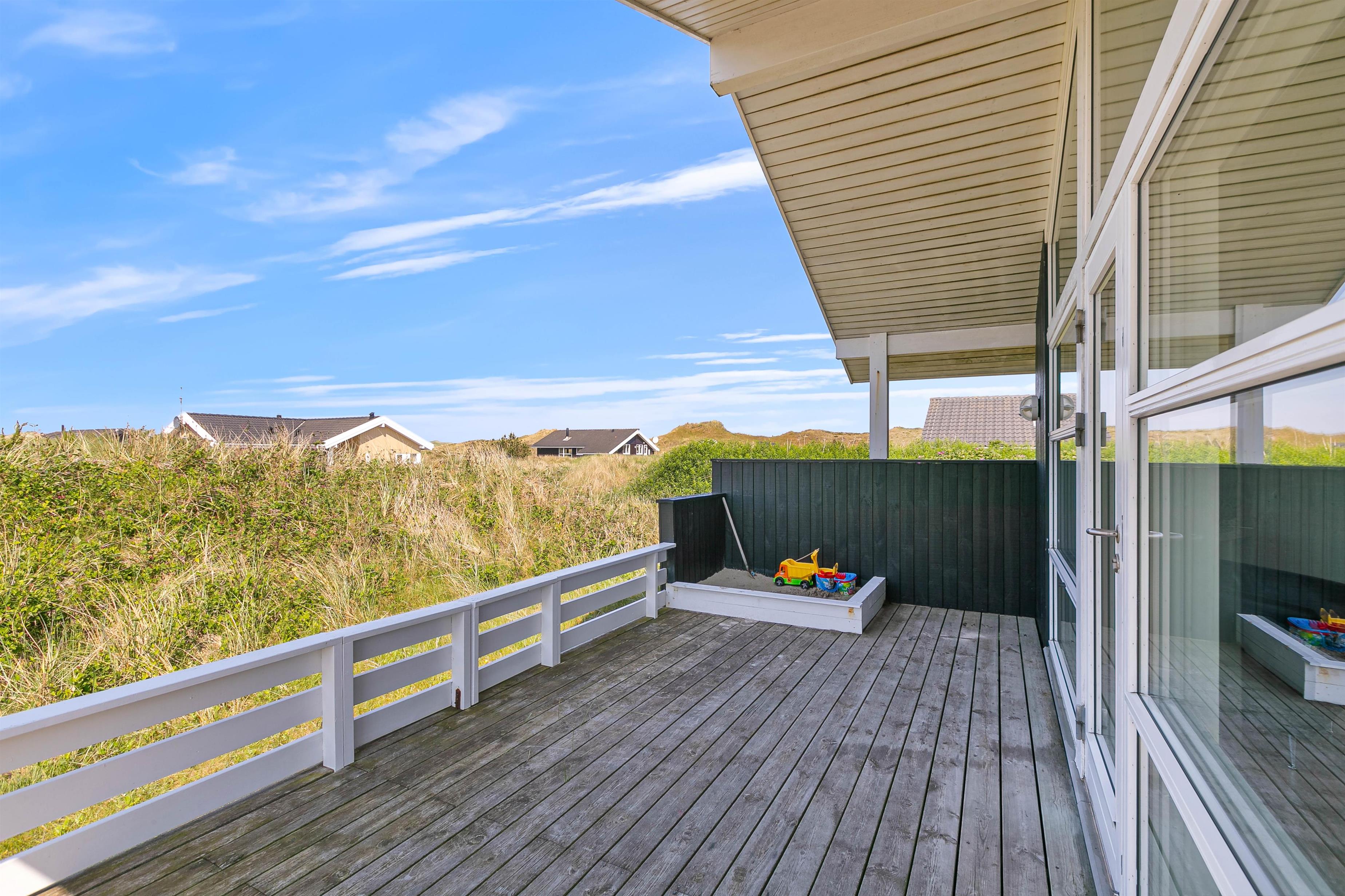 På den store sydvestvendte terrasse kan I nyde solen i komfortable havemøbler og liggestole. Bliver solen for stærk, kan I trække ind på det overdækkede område eller om på terrassen på den anden side af sommerhuset. Børnene kan lege i sandkassen, gynge eller gå på opdagelse på klitgrunden. Med kun 650 meter til Vesterhavet bliver en tur til stranden et must for unge og gamle. Få håret blæst igennem og tag eventuelt en dukkert, før turen går tilbage igennem klitlandskabet til jeres hyggelige sommerhus. Tænd op i grillen og nyd et lækkert grillmåltid sammen, mens skyggerne bliver lange.
