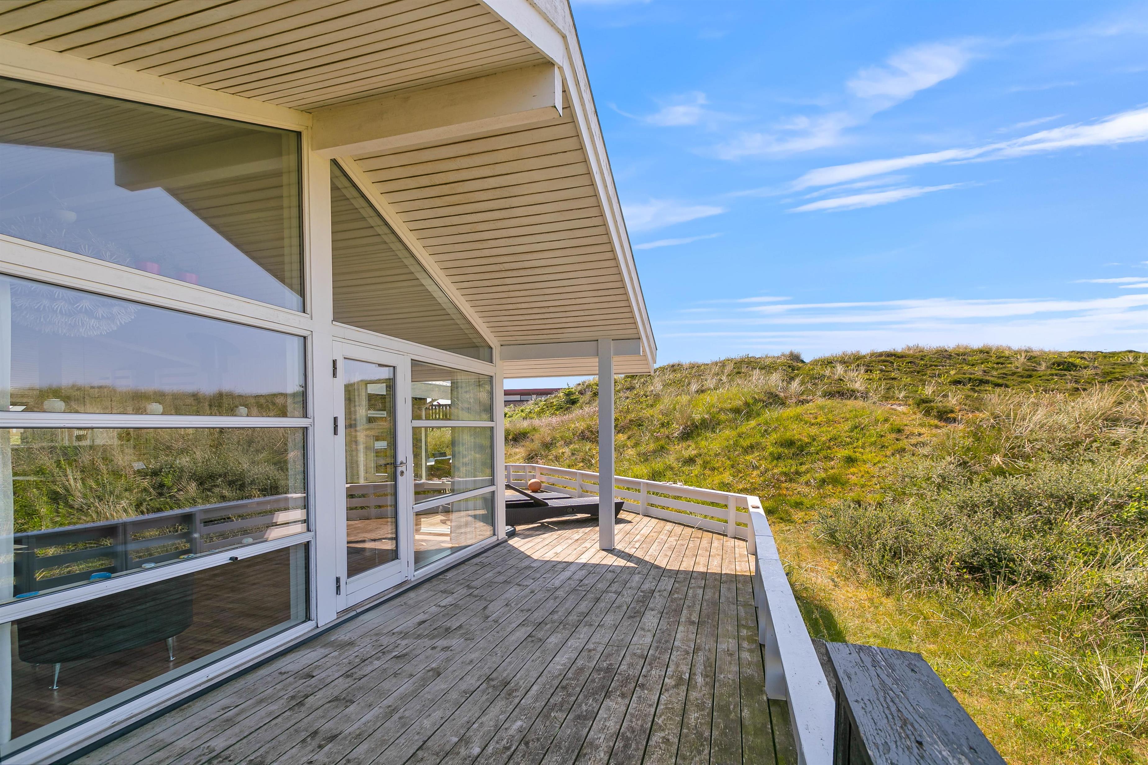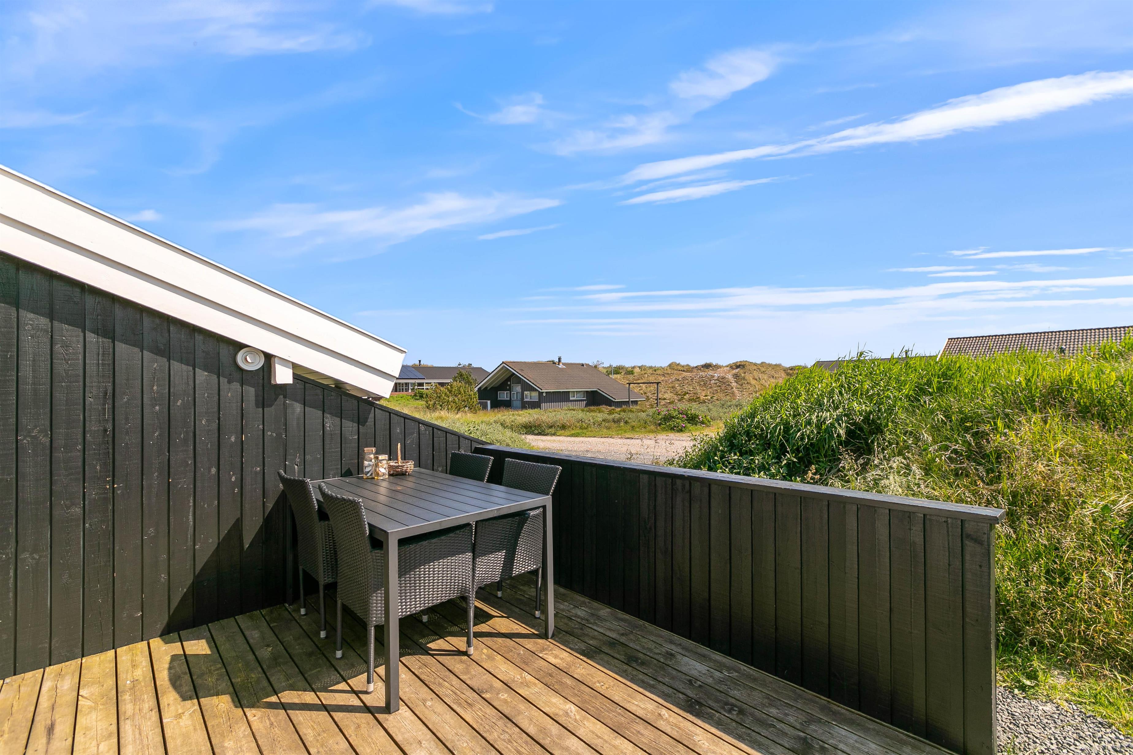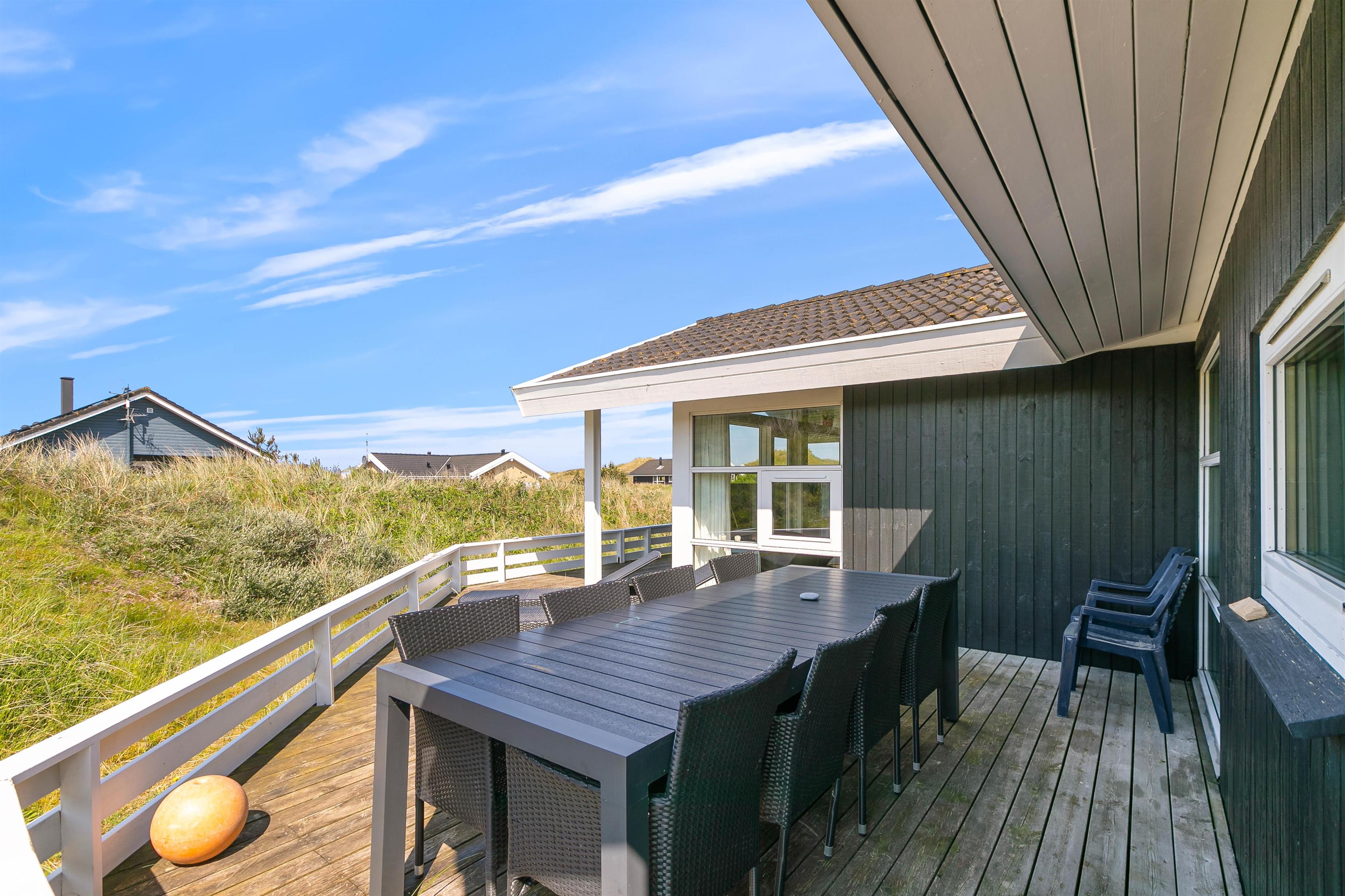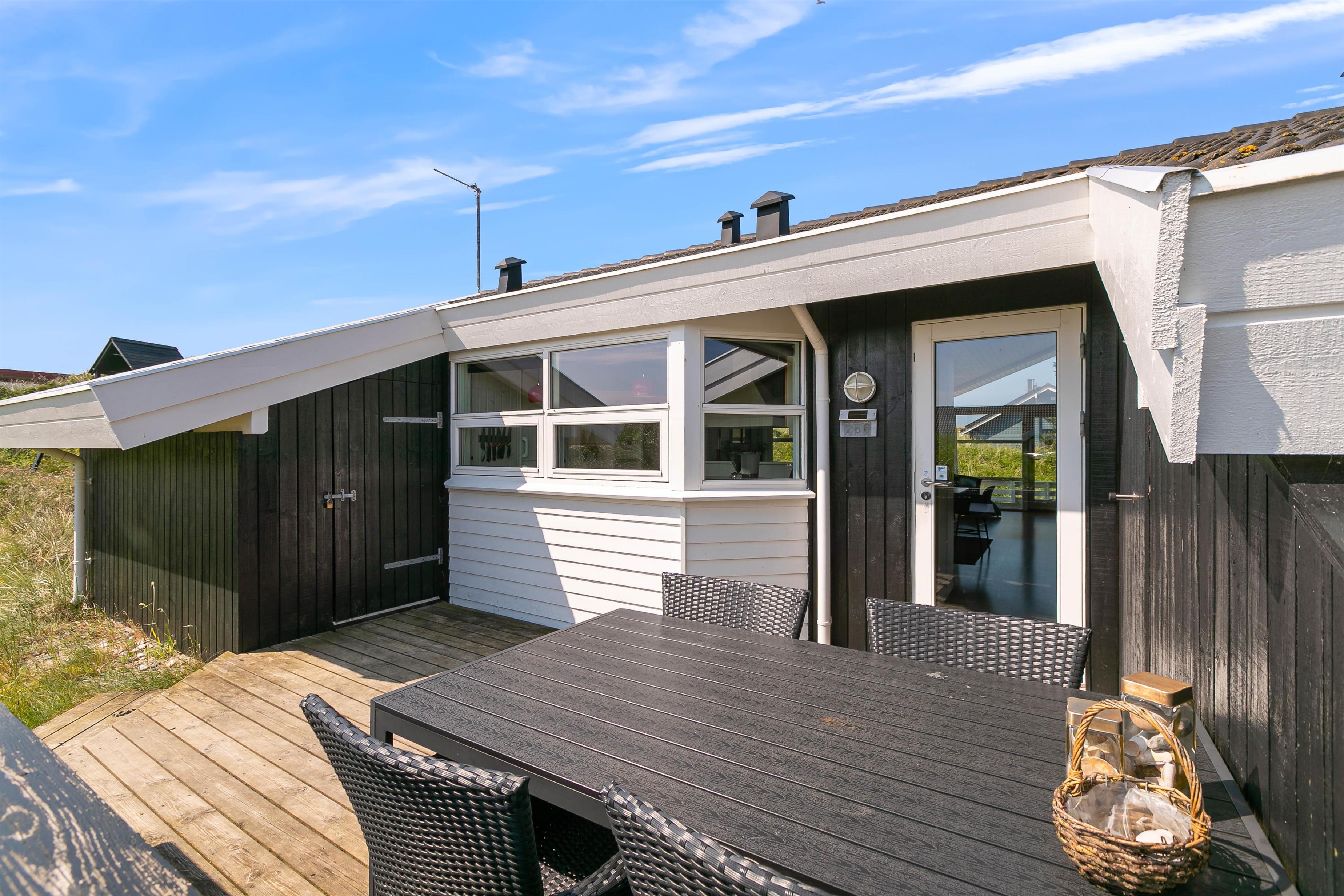 På den store sydvestvendte terrasse kan I nyde solen i komfortable havemøbler og liggestole. Bliver solen for stærk, kan I trække ind på det overdækkede område eller om på terrassen på den anden side af sommerhuset. Børnene kan lege i sandkassen, gynge eller gå på opdagelse på klitgrunden. Med kun 650 meter til Vesterhavet bliver en tur til stranden et must for unge og gamle. Få håret blæst igennem og tag eventuelt en dukkert, før turen går tilbage igennem klitlandskabet til jeres hyggelige sommerhus. Tænd op i grillen og nyd et lækkert grillmåltid sammen, mens skyggerne bliver lange.