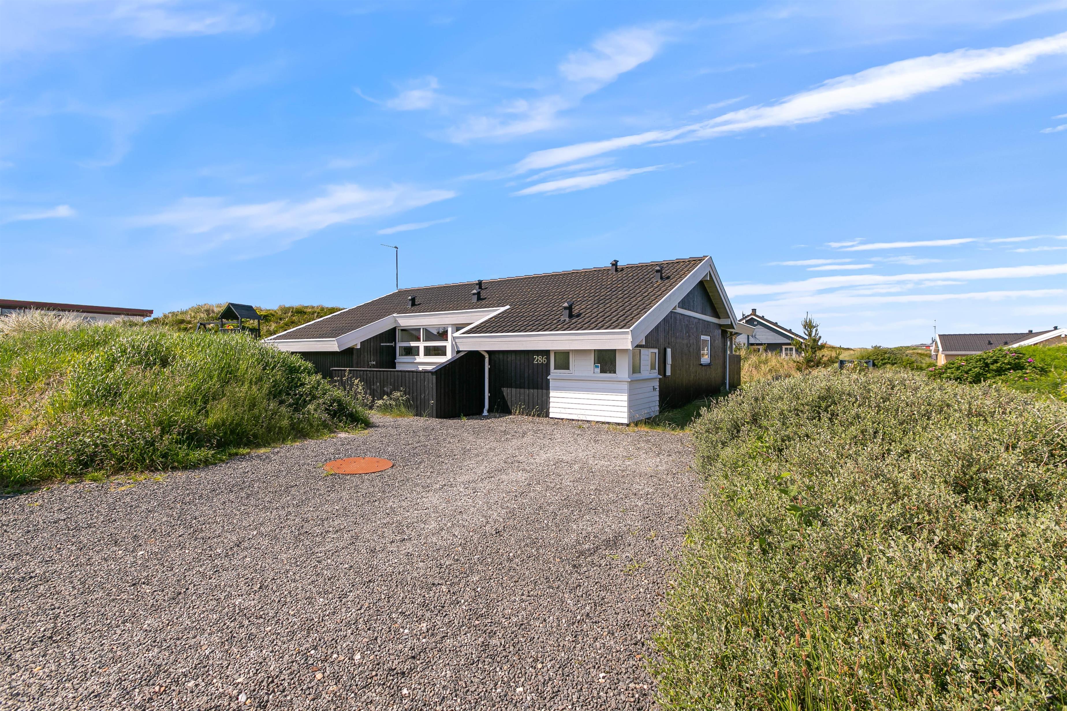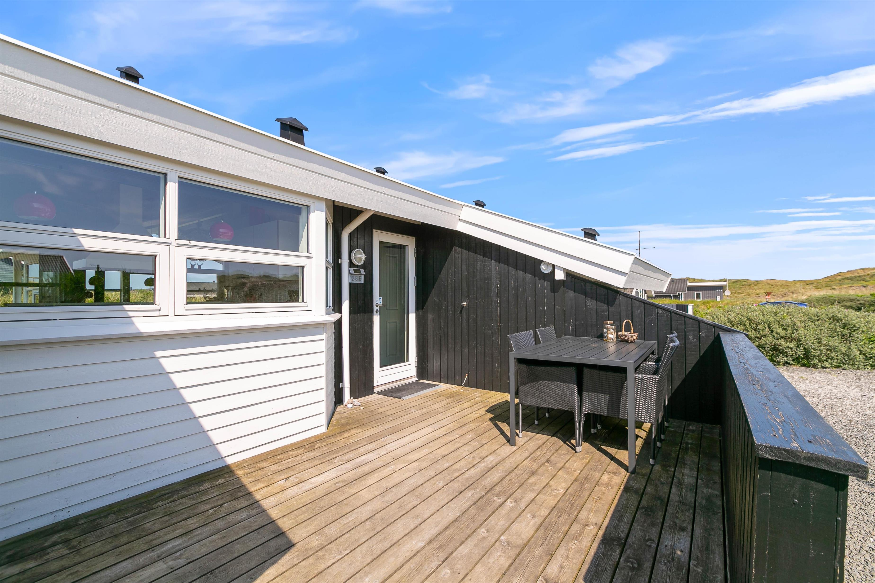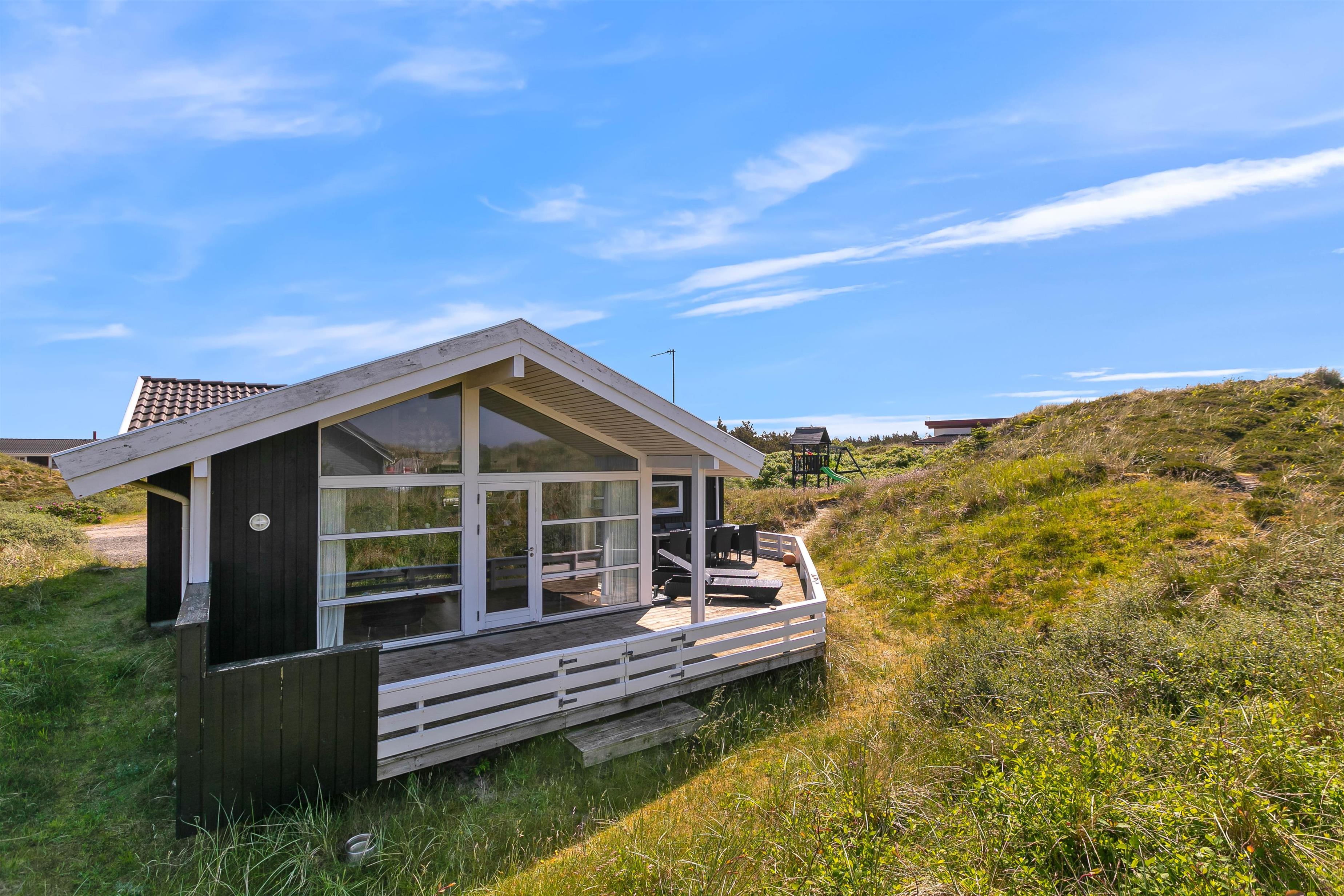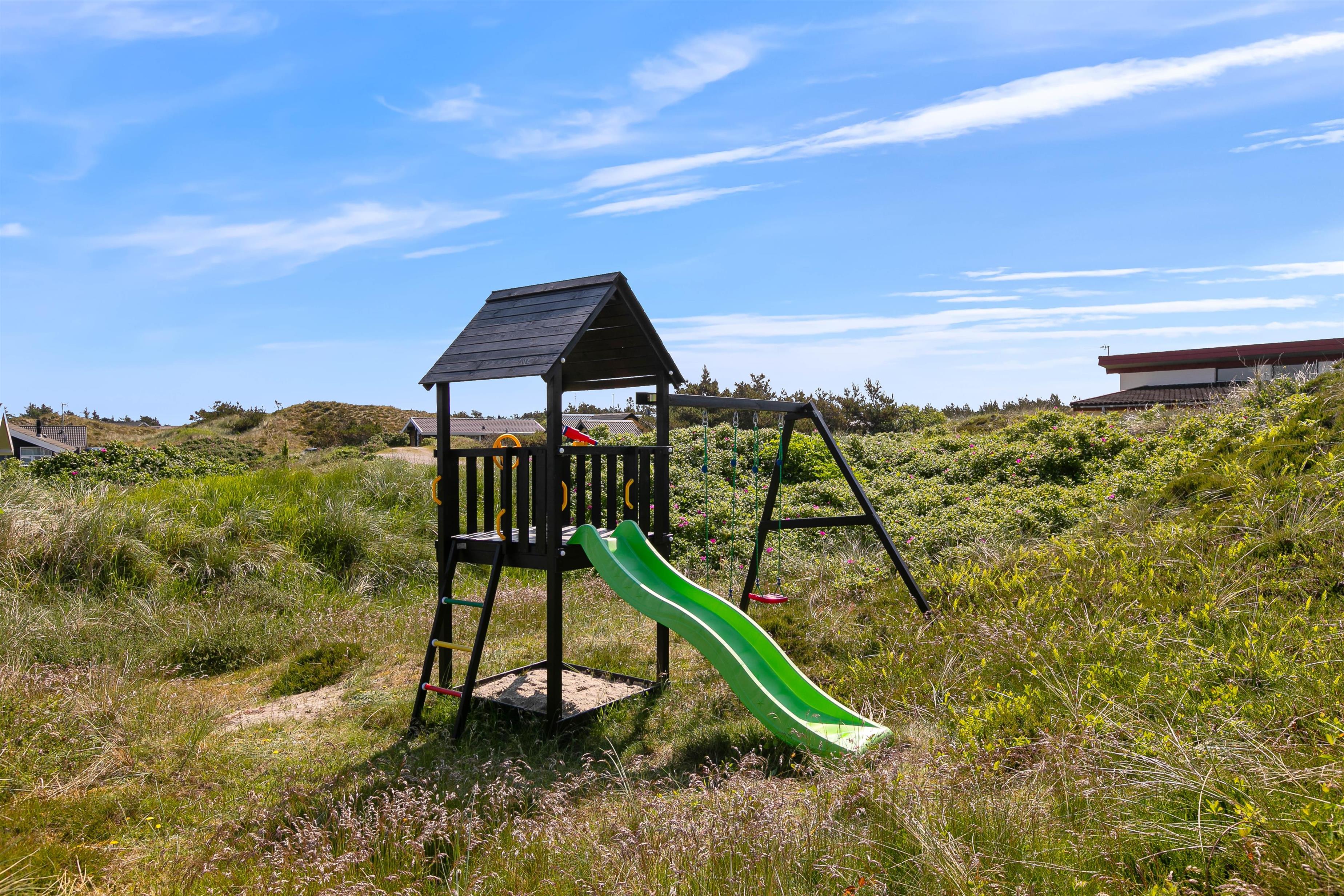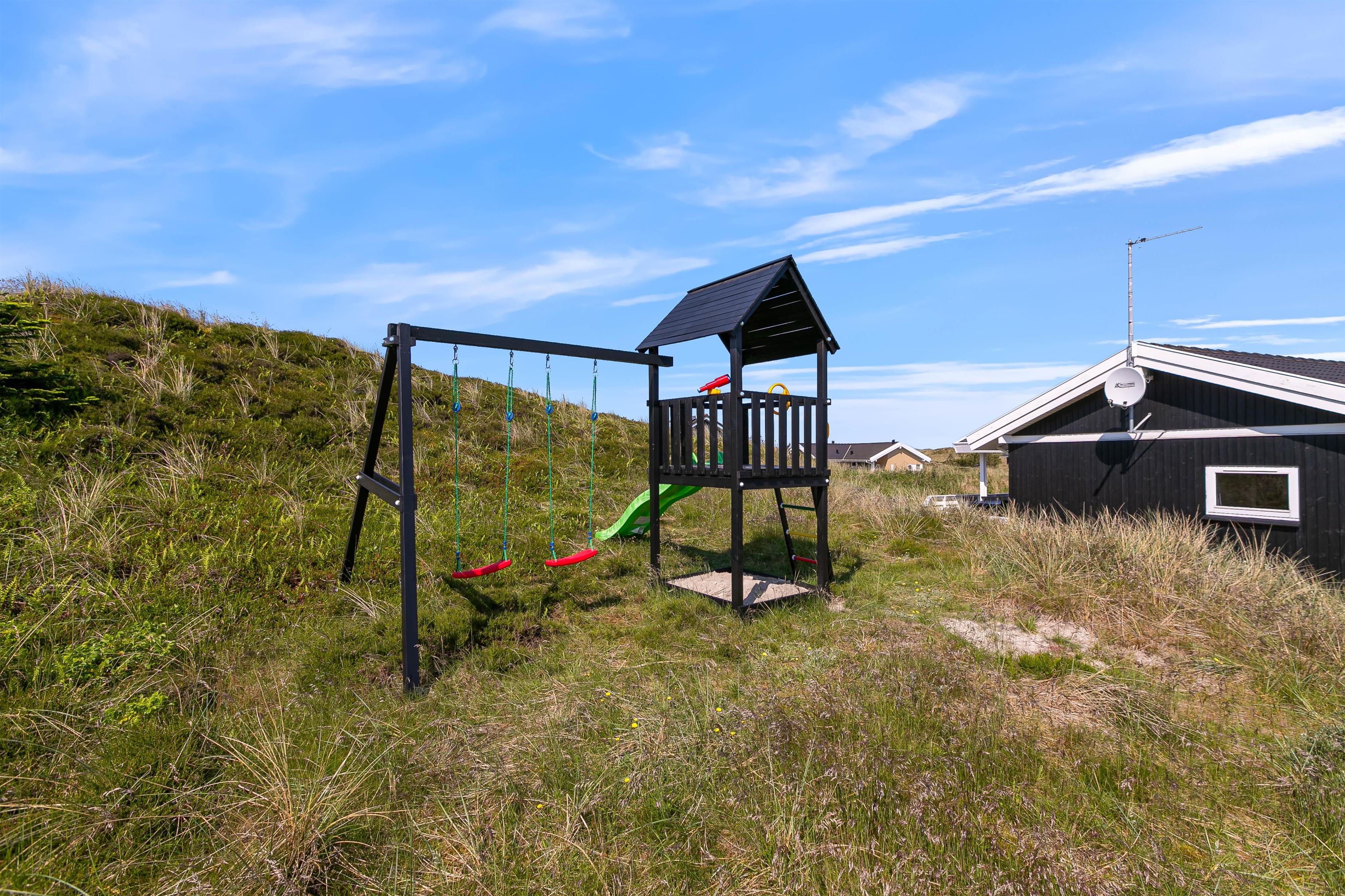 På den store sydvestvendte terrasse kan I nyde solen i komfortable havemøbler og liggestole. Bliver solen for stærk, kan I trække ind på det overdækkede område eller om på terrassen på den anden side af sommerhuset. Børnene kan lege i sandkassen, gynge eller gå på opdagelse på klitgrunden. Med kun 650 meter til Vesterhavet bliver en tur til stranden et must for unge og gamle. Få håret blæst igennem og tag eventuelt en dukkert, før turen går tilbage igennem klitlandskabet til jeres hyggelige sommerhus. Tænd op i grillen og nyd et lækkert grillmåltid sammen, mens skyggerne bliver lange.