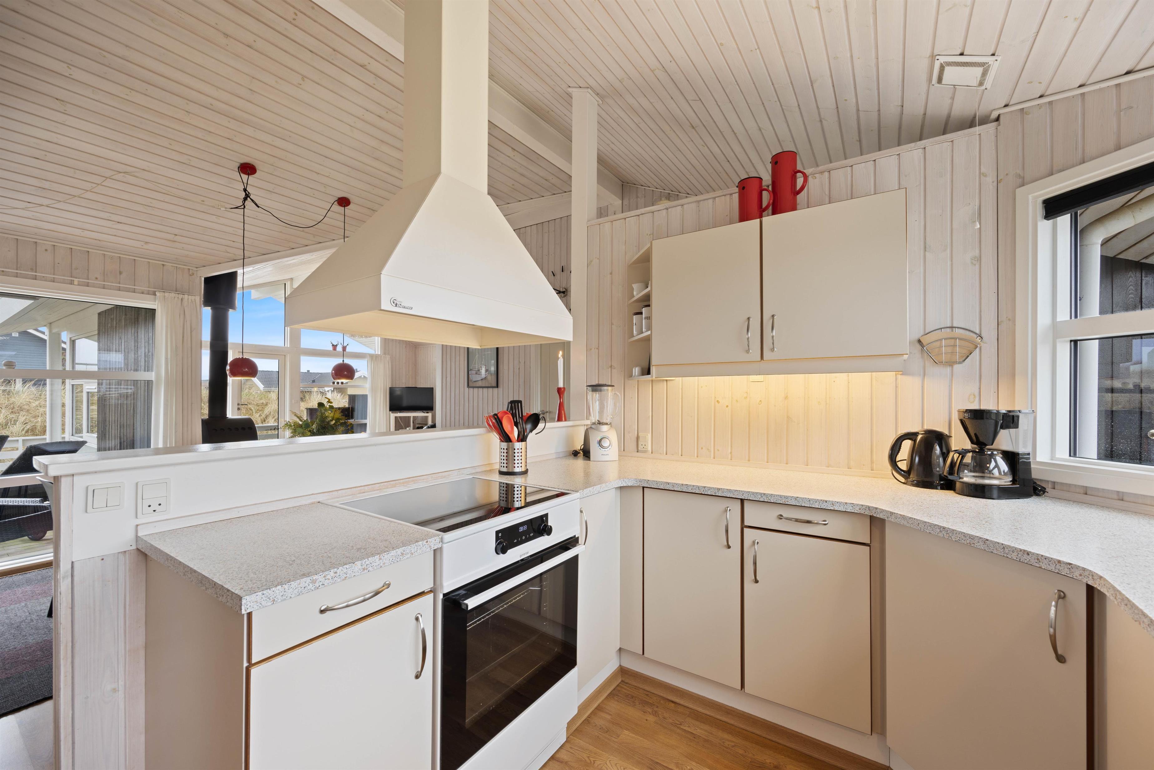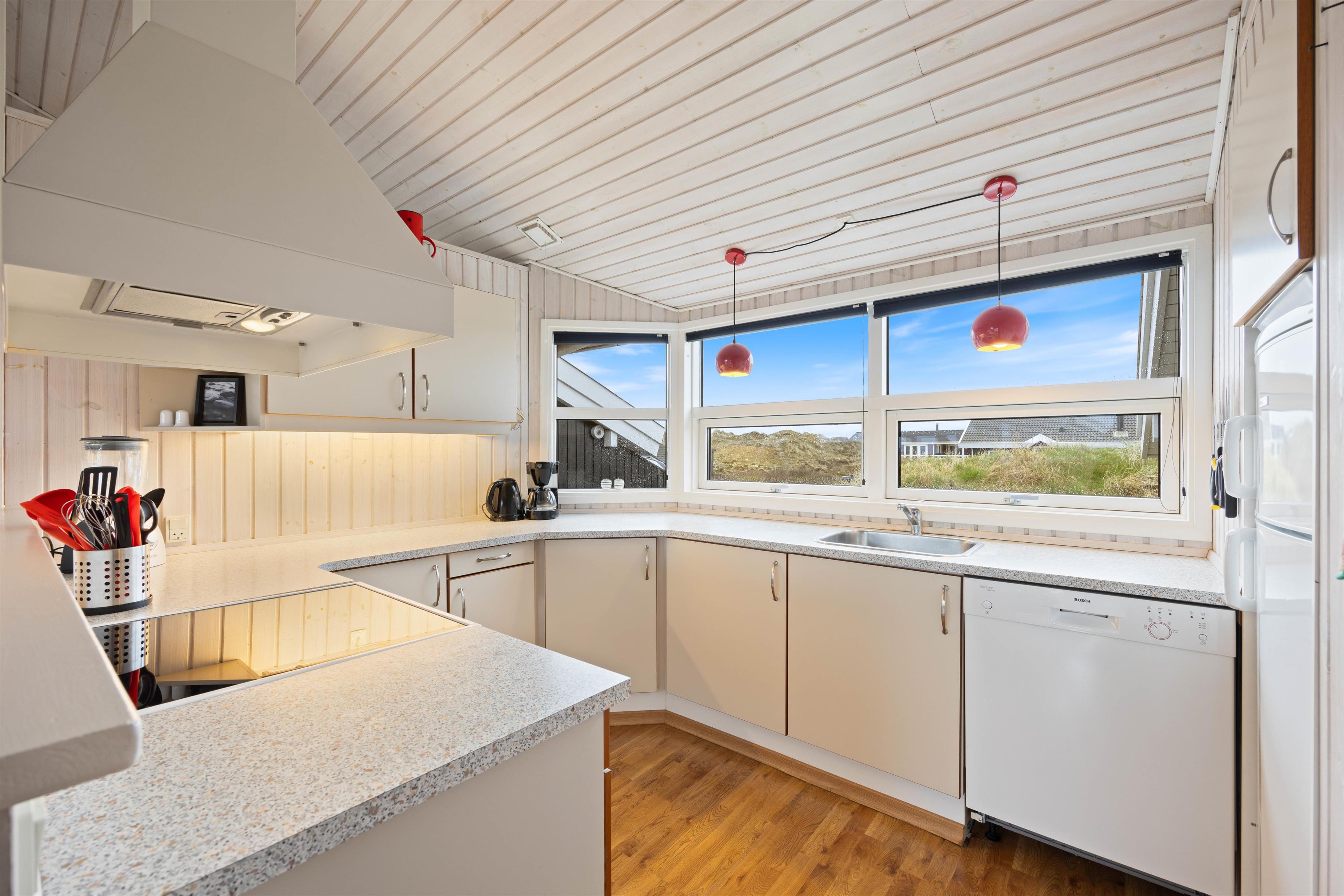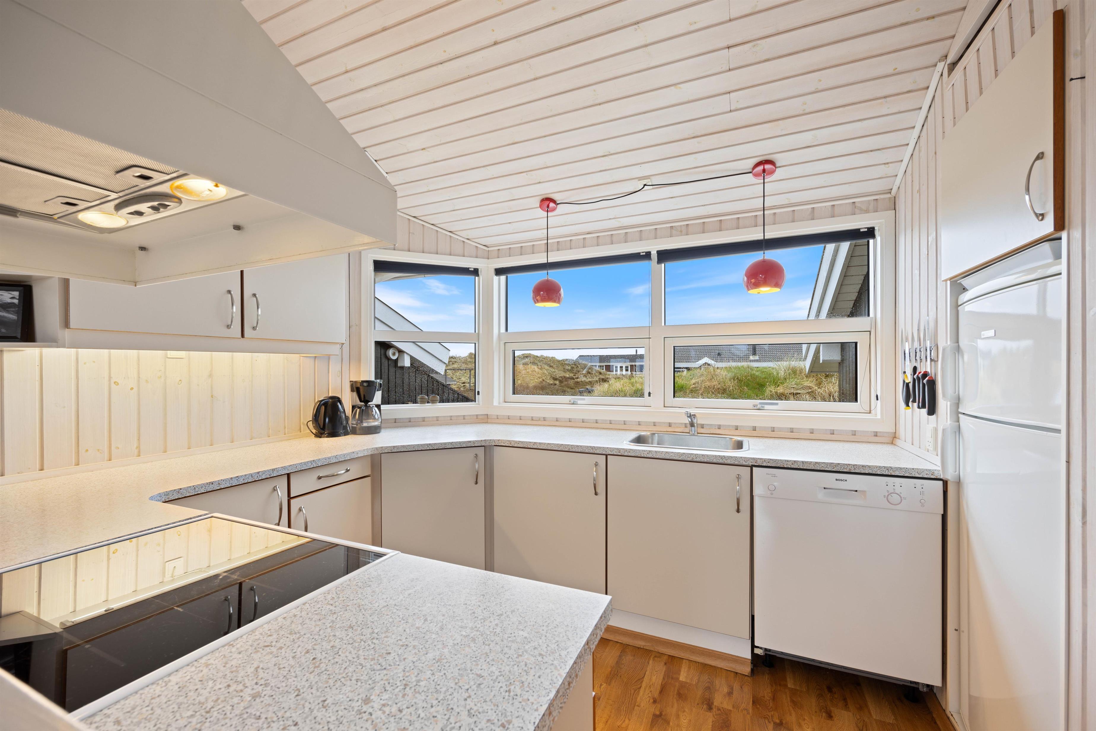 Man føler sig velkommen straks, man træder indenfor i det hyggelige sommerhus på Bjerregårdsvej 286. Her er lyst og venligt indrettet med lyse gulve og hvidmalede vægge og lofter op i kip. Det fine lysindfald igennem de brede vinduespartier gør sit til at løfte feriestemningen i top. Opholdsstuen i forbindelse med køkken/alrum har brændeovn, hvor I kan hygge jer sammen i sofa og lænestole til en afslappende kop eftermiddagste eller en filmaften. Det åbne køkken indeholder alt, hvad I har brug for til at forkæle hinanden med hjemmelavede måltider, som nydes ved spisebordet. Især lystfiskere vil sætte pris på den separate fryser på 120 liter. Der skal nok være plads til en fisk eller to.