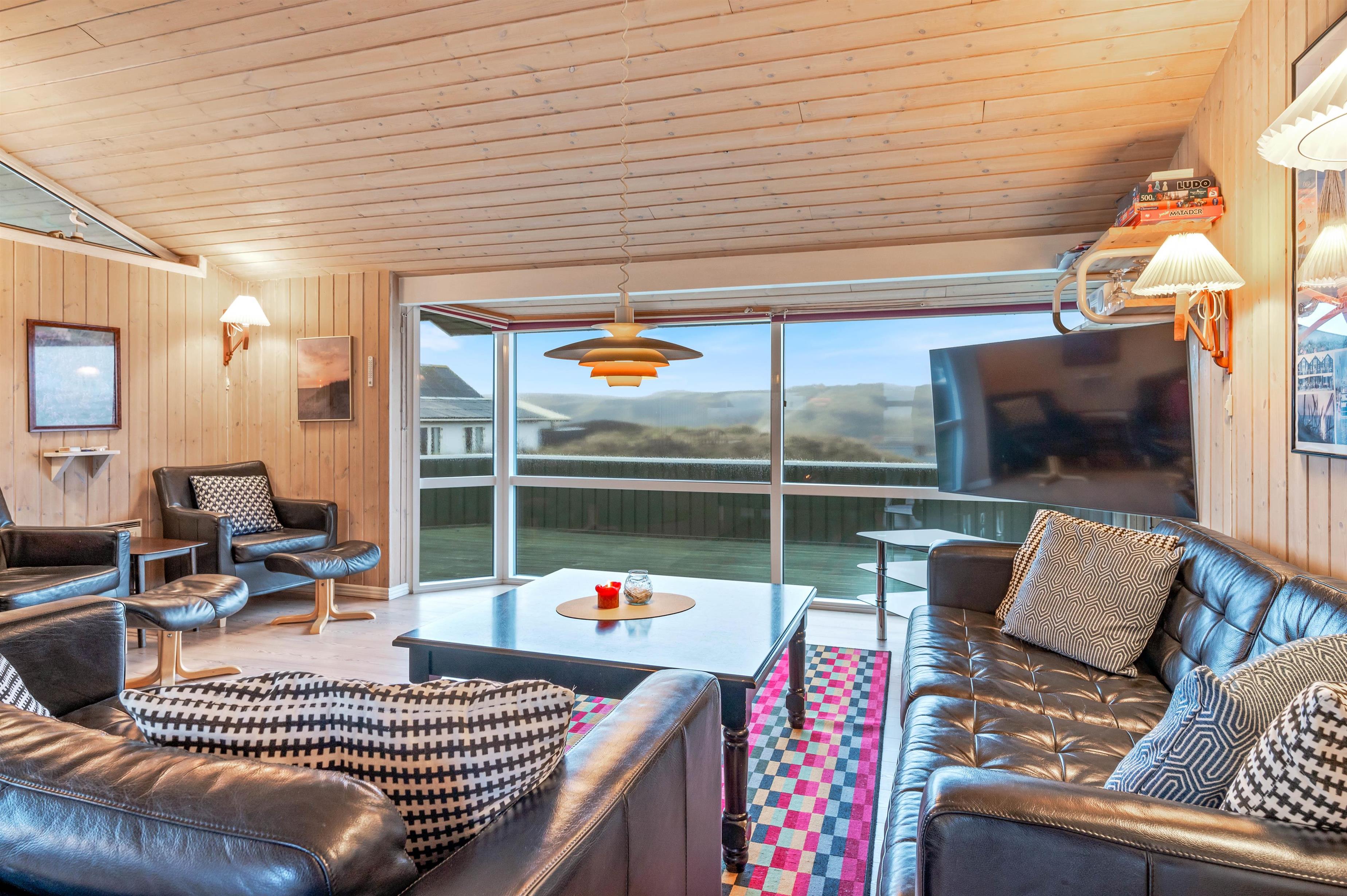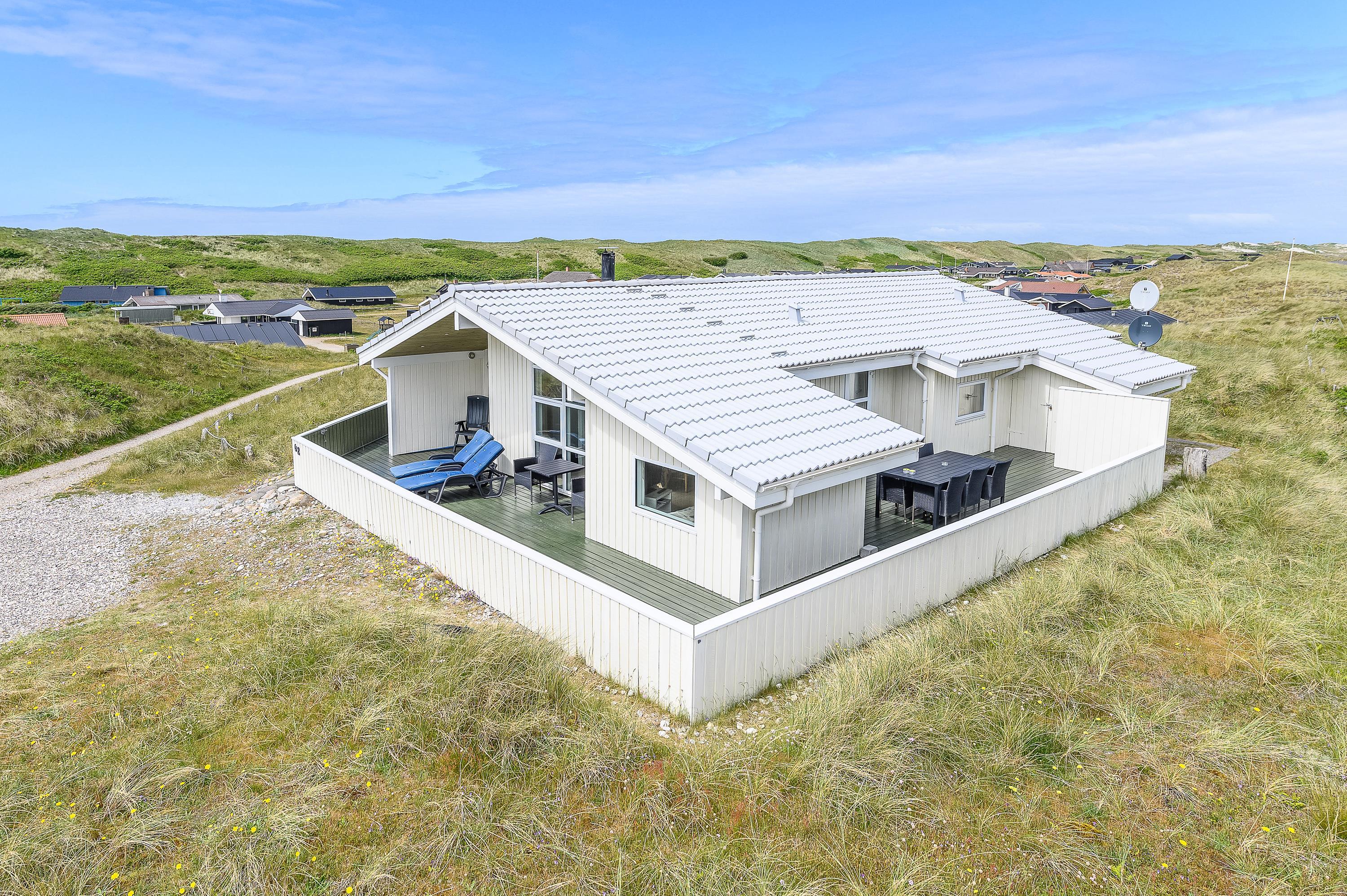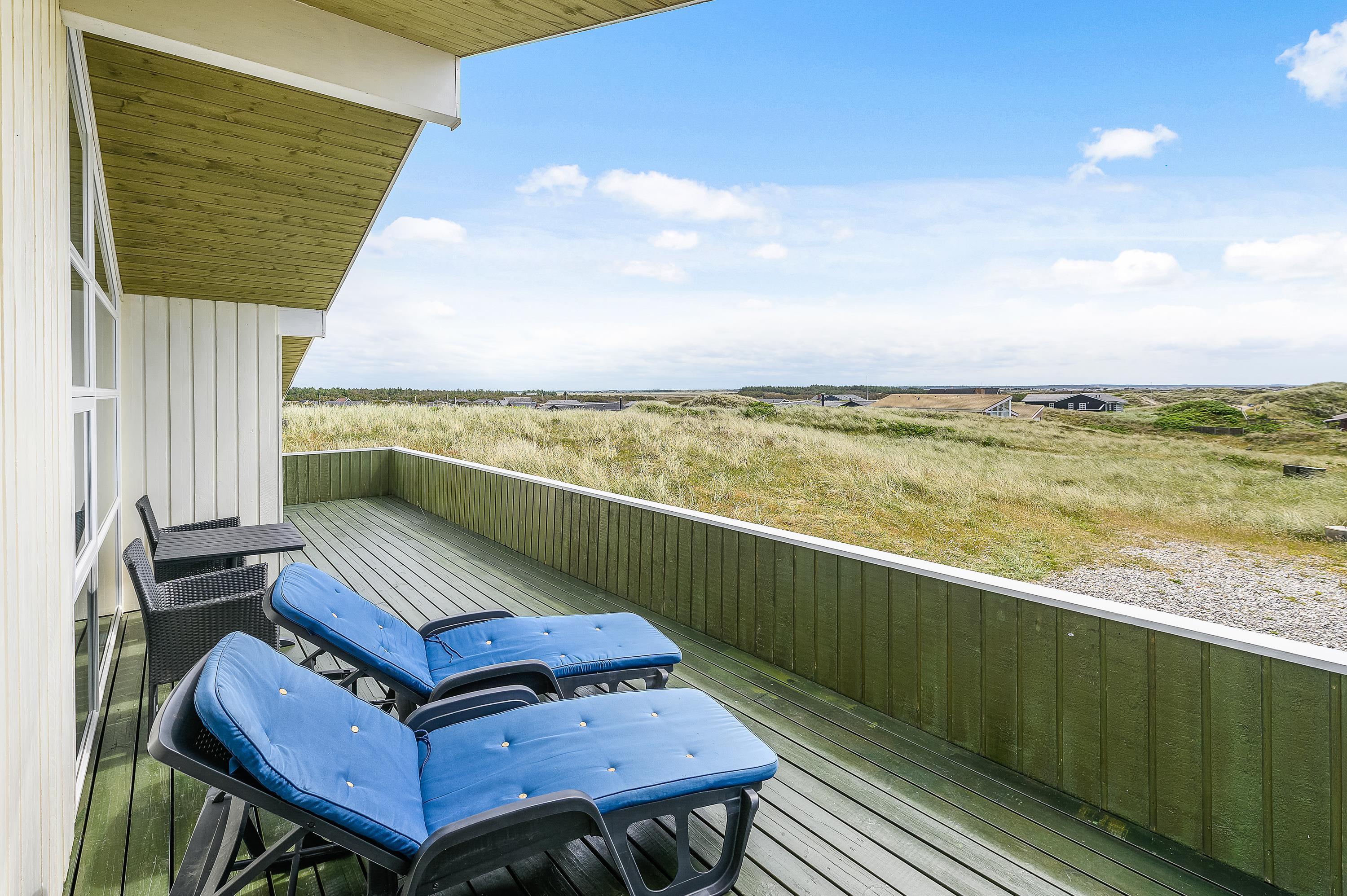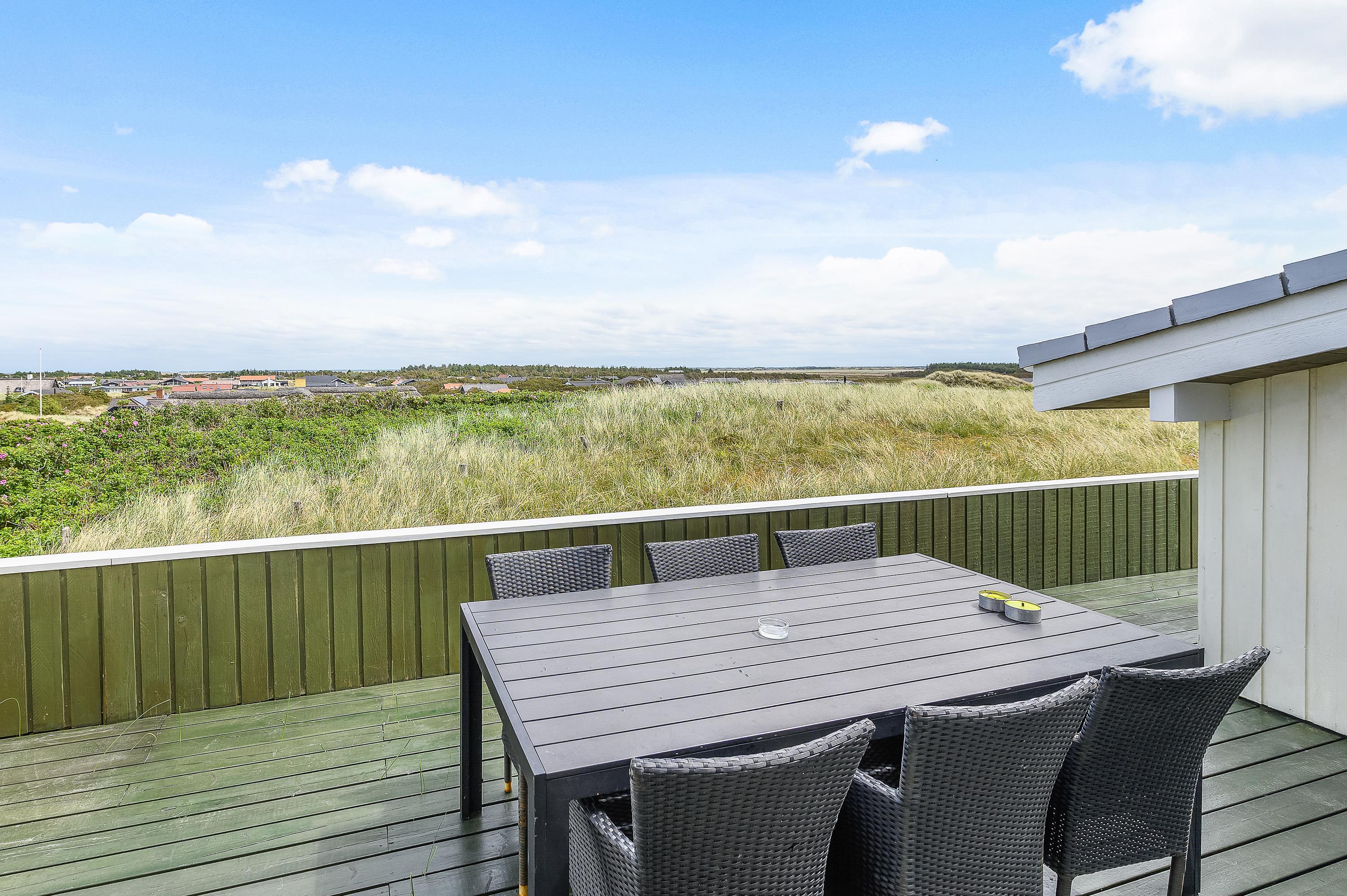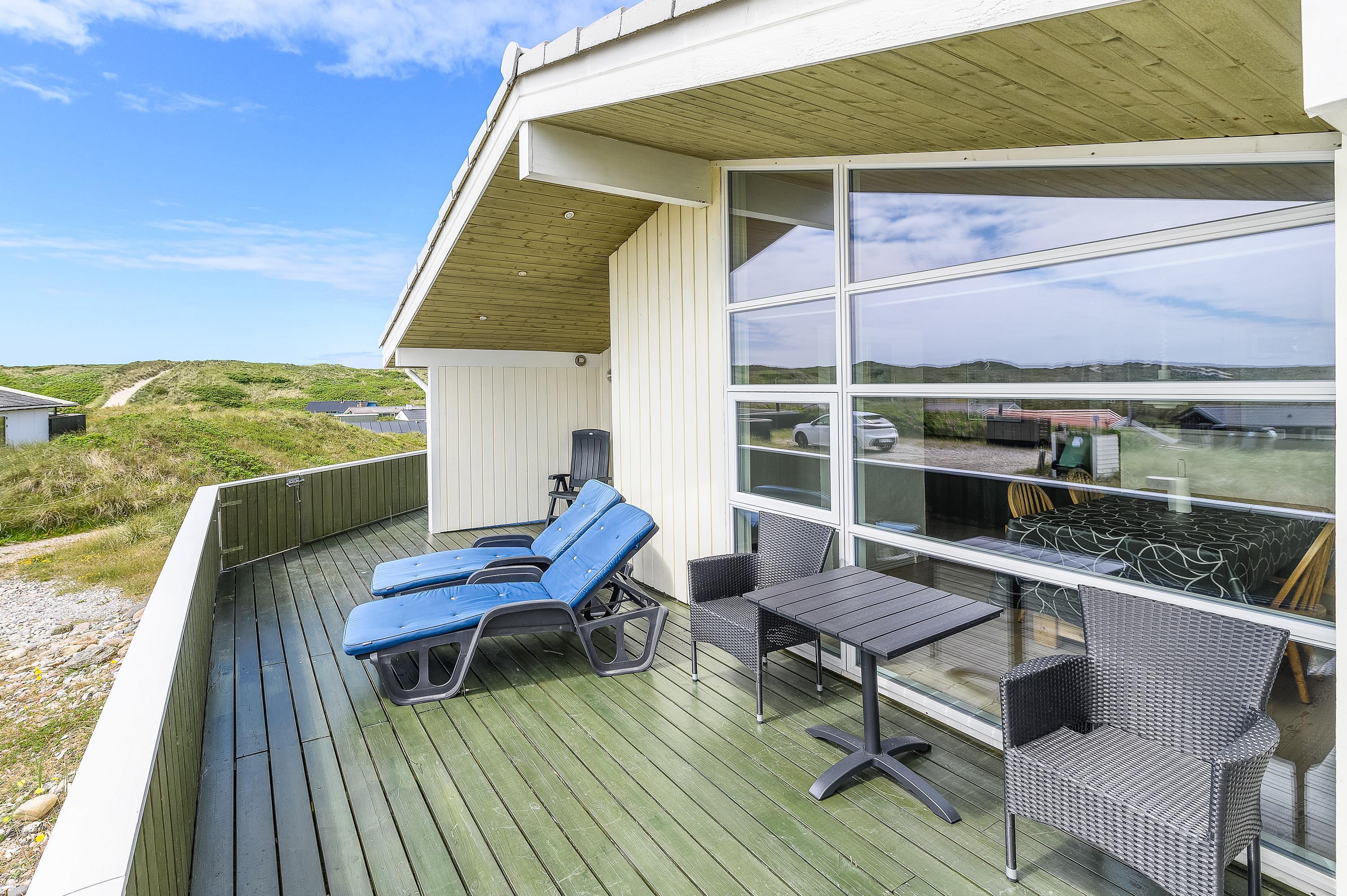 Fra den store afskærmede og velmøblerede terrasse er der en helt enestående udsigt over den storslåede natur med hedearealer og klitter. Her kan I altid finde en lækrog, hvor solen og den friske havluft kan nydes ganske ugeneret.