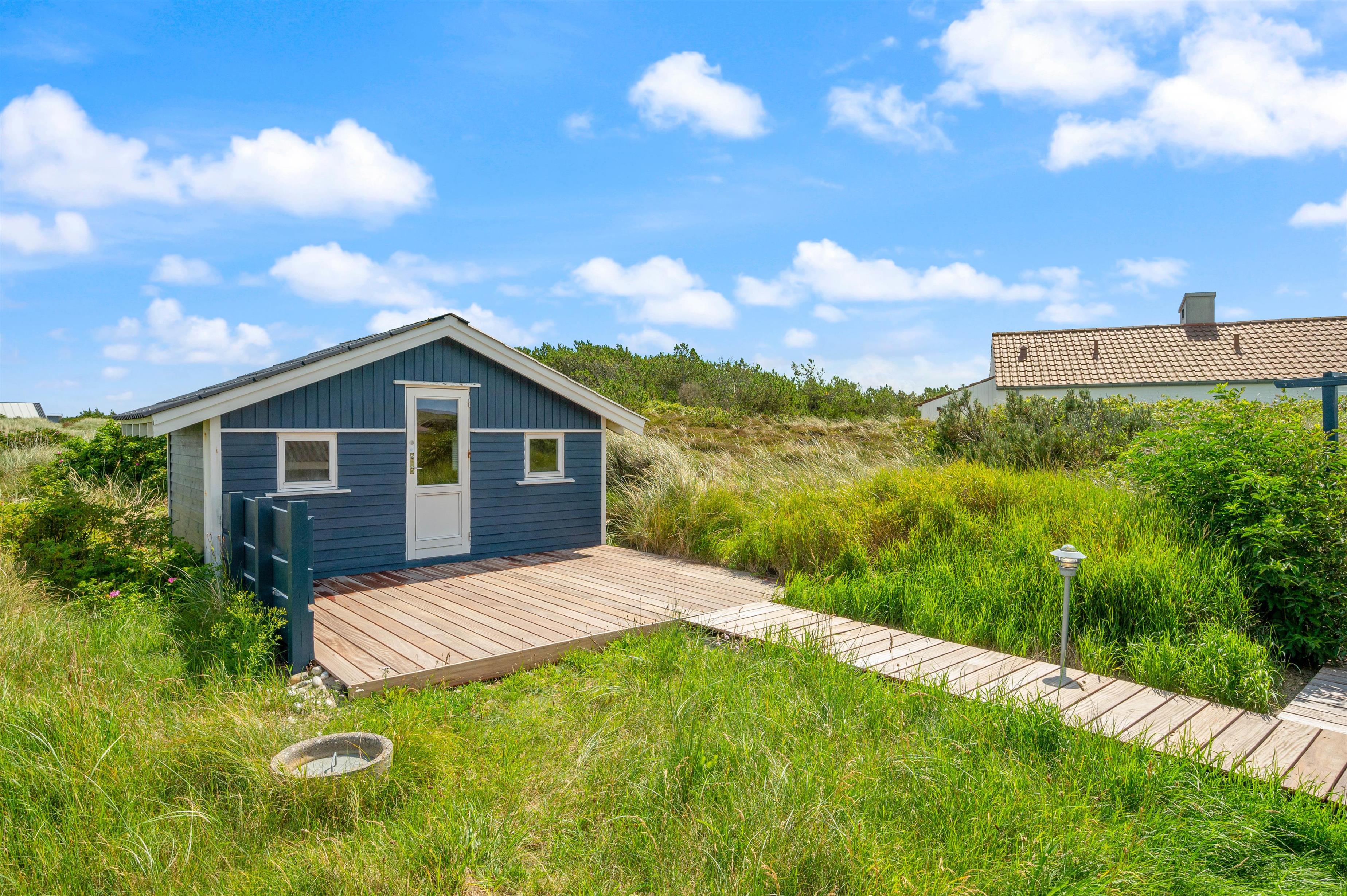 Nyd udelivet på den sydvendte terrasse. Her kan I solbade på de komfortable liggestole eller slappe af i havemøblerne. Ved annekset er endnu en terrasse, så I kan flytte rundt efter vejret. Har I hund med, er det en utrolig smuk egn at gå på opdagelse i – I kan hente frisk morgenbrød hos købmanden eller gå lange ture på den kilometerlange sandstrand. Tænd op i grillen, og nyd et lækkert grillmåltid sammen, imens skyggerne bliver lange. Bagefter kan I gå en afslappende tur til stranden og nyde solnedgangen over Vesterhavet, det er altid en oplevelse.