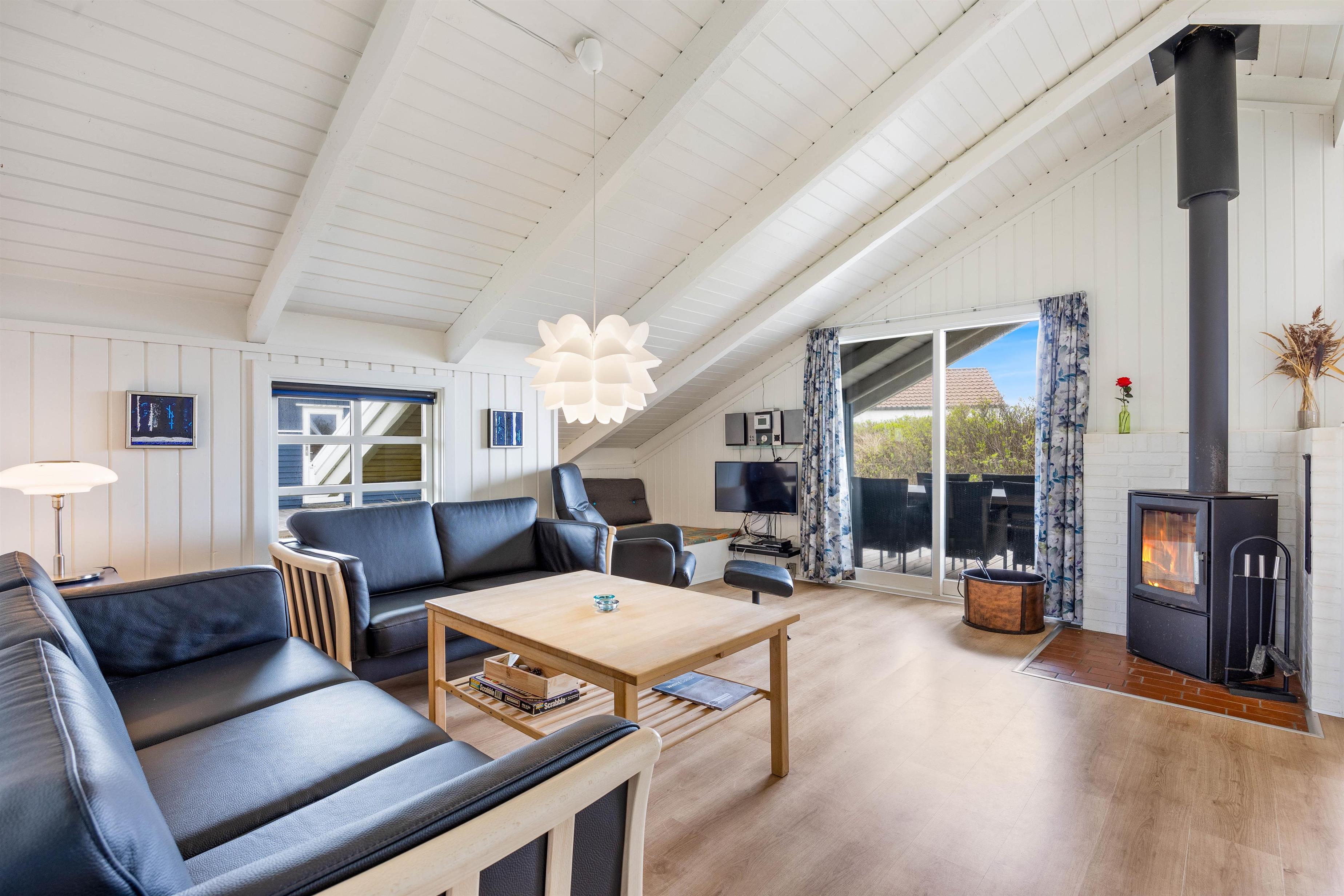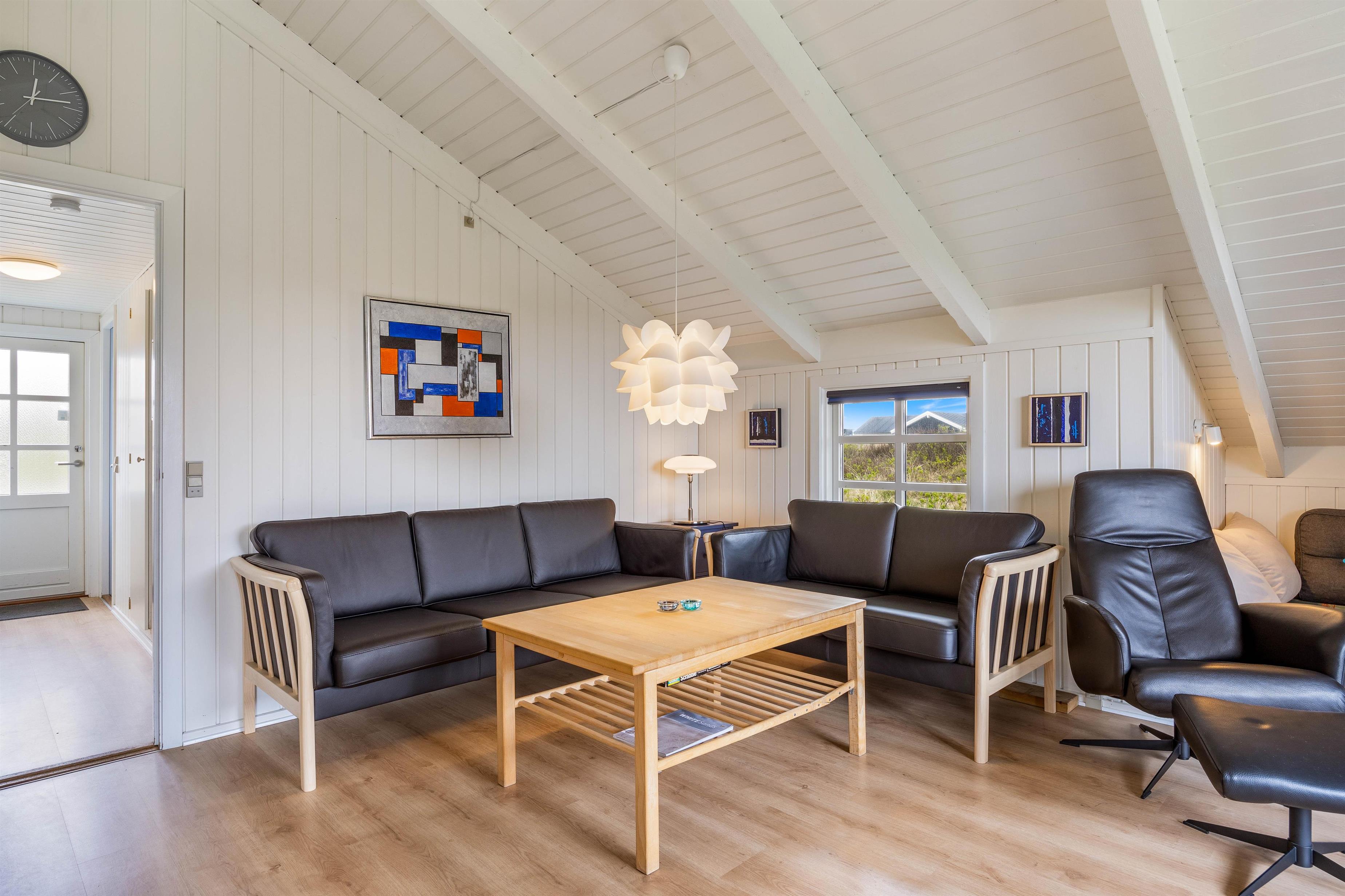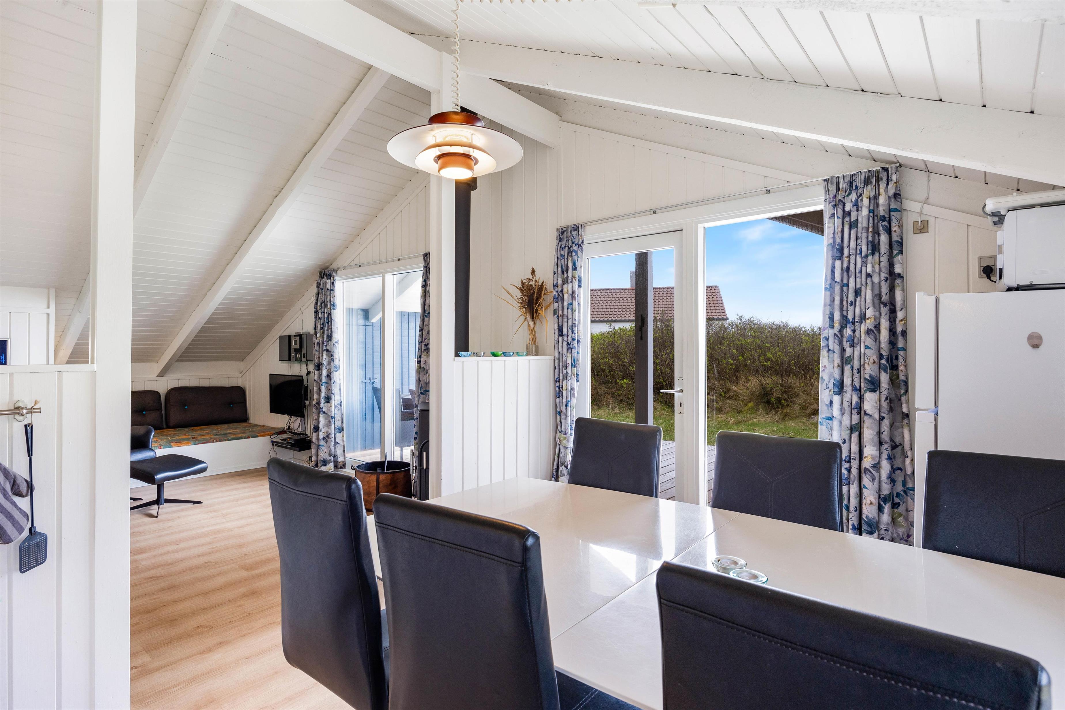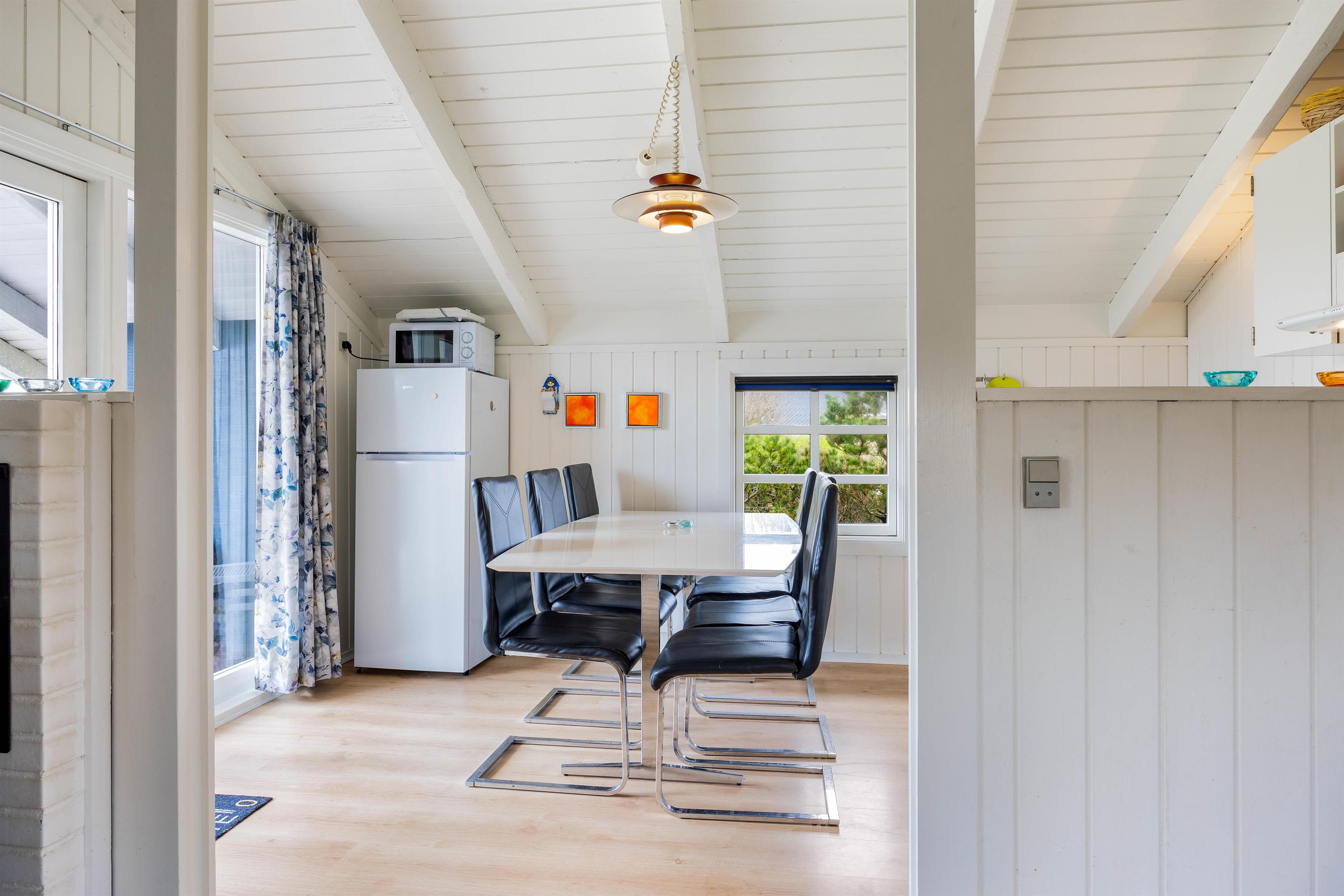 På Bjerregårdsvej 263 giver den lyse og venlige indretning i sommerhuset straks den klassiske feriestemning. Tænd op i brændeovnen og lad roen falde over jer til en frisk kop kaffe. I stuen er et fint lysindfald igennem det brede vinduesparti, og de hvidmalede vægge og lofter op i kip bidrager også til indtrykket. Har I brug for at trække jer tilbage for en stund, er der en hyggelig alkove i forbindelse med stuen. Spisekøkkenet indeholder alt, hvad I behøver til at forkæle hinanden med lækre hjemmelavede måltider.