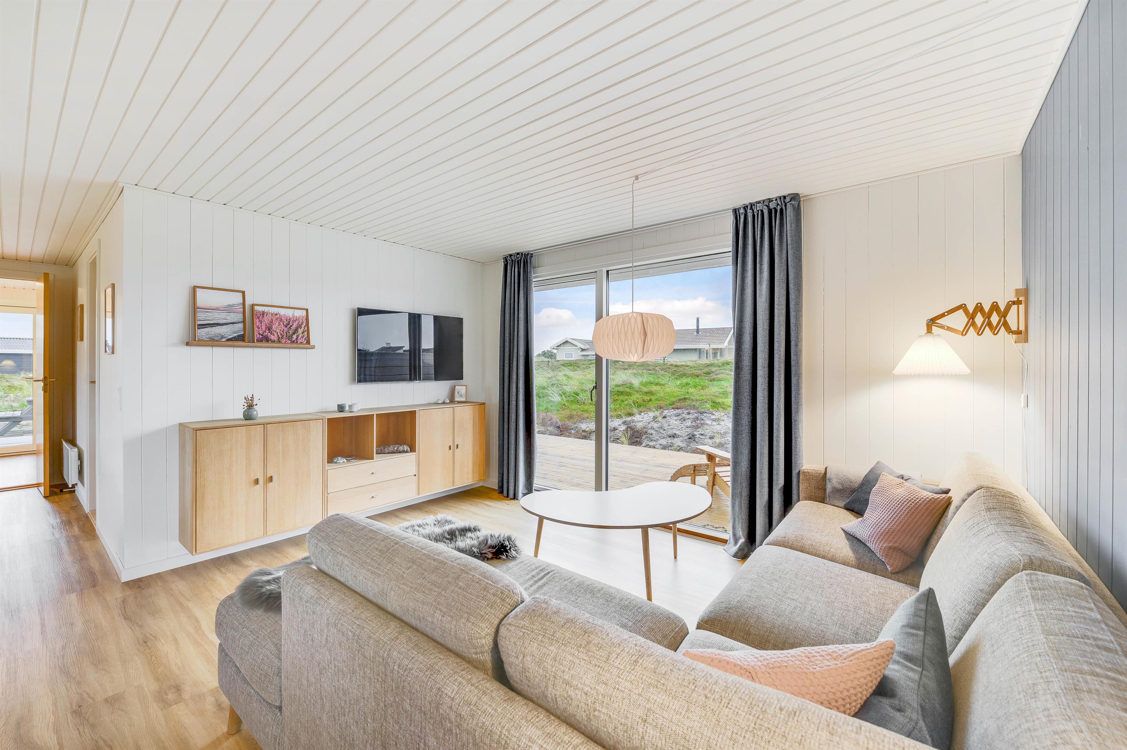 I sommerhuset venter jer en pænt møbleret, moderne stue med et hyggeligt sofahjørne. Her kan I tilbringe mange gode stunder med familien, mens I ser jeres yndlingsfilm, som kan streames via. chromecasten.