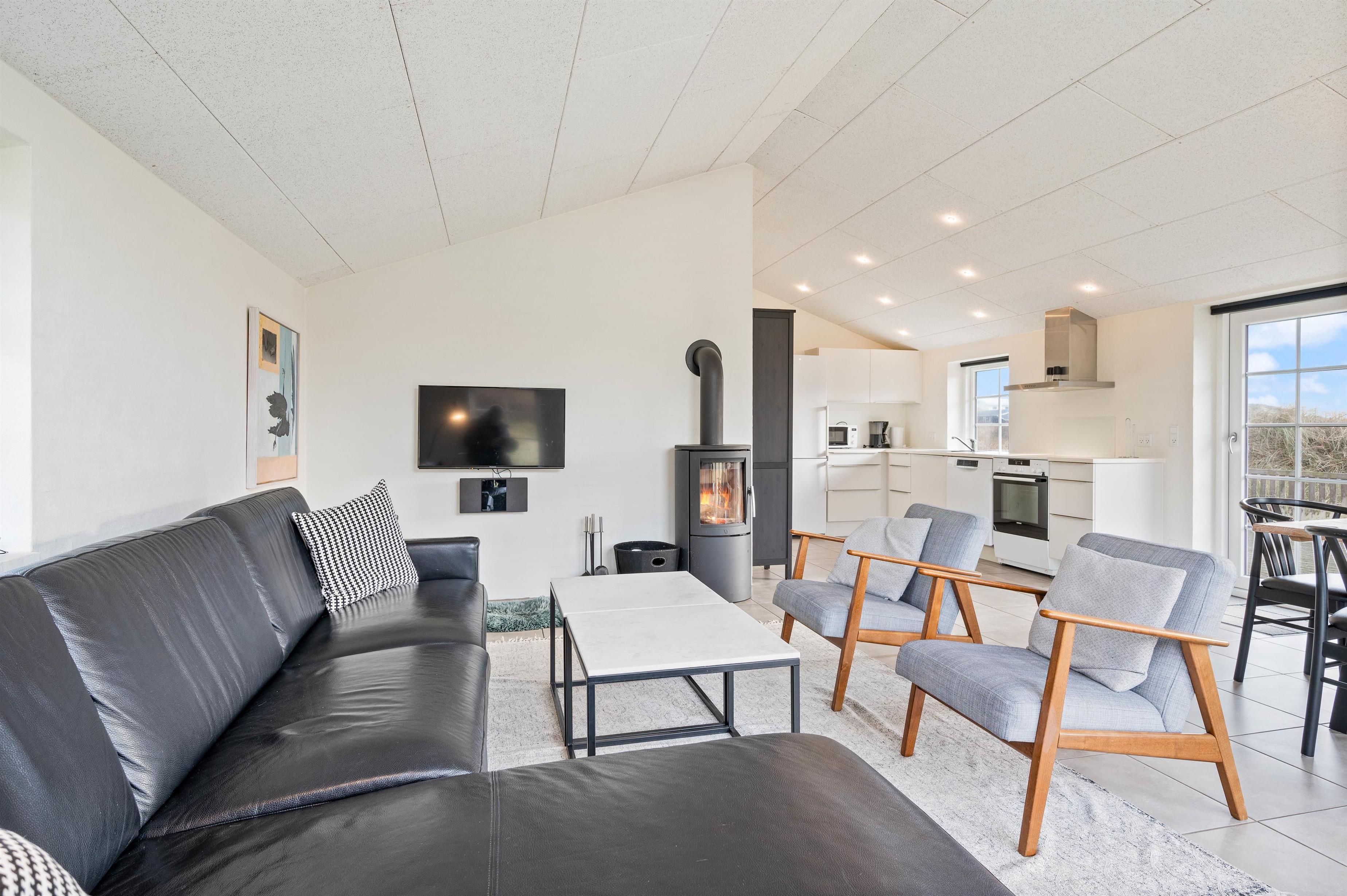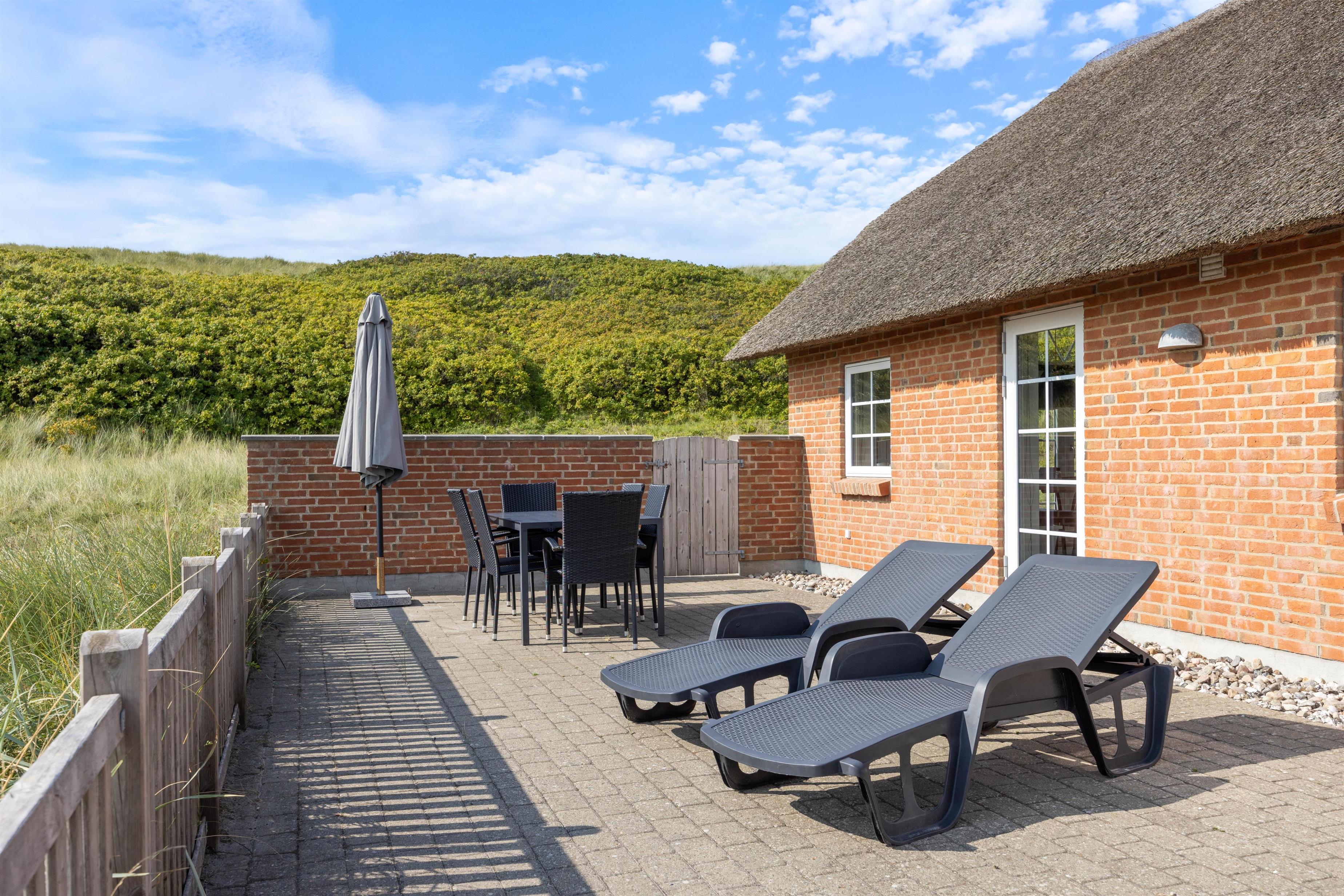 Feriehuset har en fantastisk beliggenhed direkte ved klitterne, og fra terrassen kan I næsten høre bølgernes brusen kalde på jer. På den brede sandstrand, som er et paradis for alle, kan børnene og hundene tumle i sandet, mens I slapper af i de skønne omgivelser, og på de gode sommerdage kan I hoppe en tur i bølgerne.