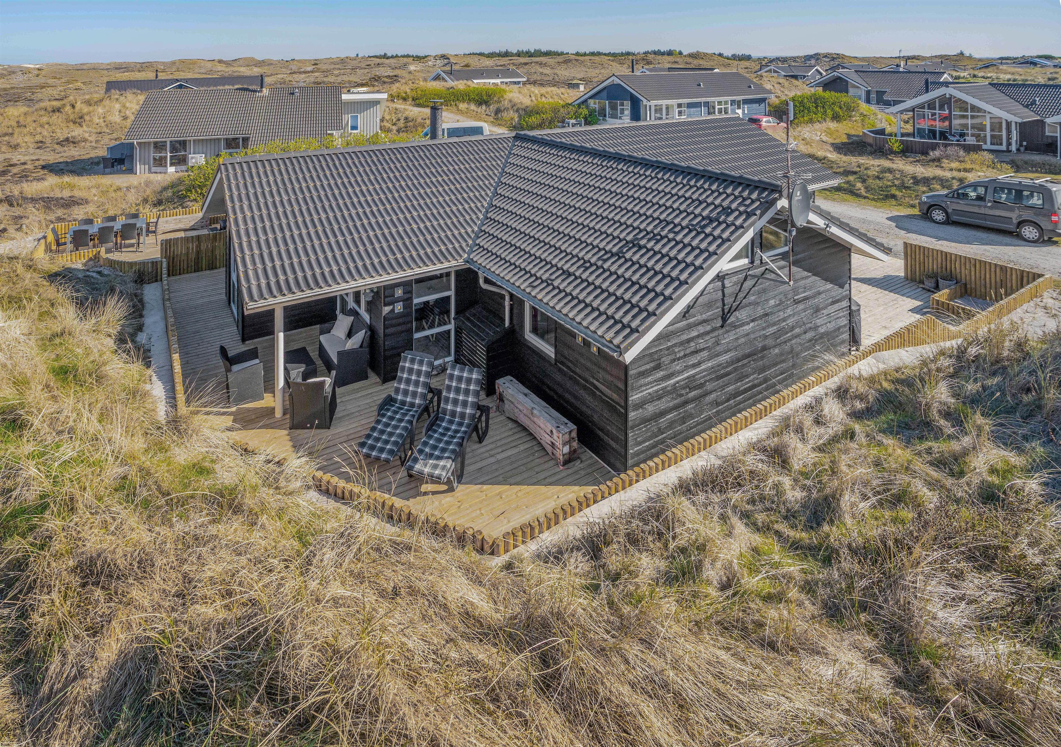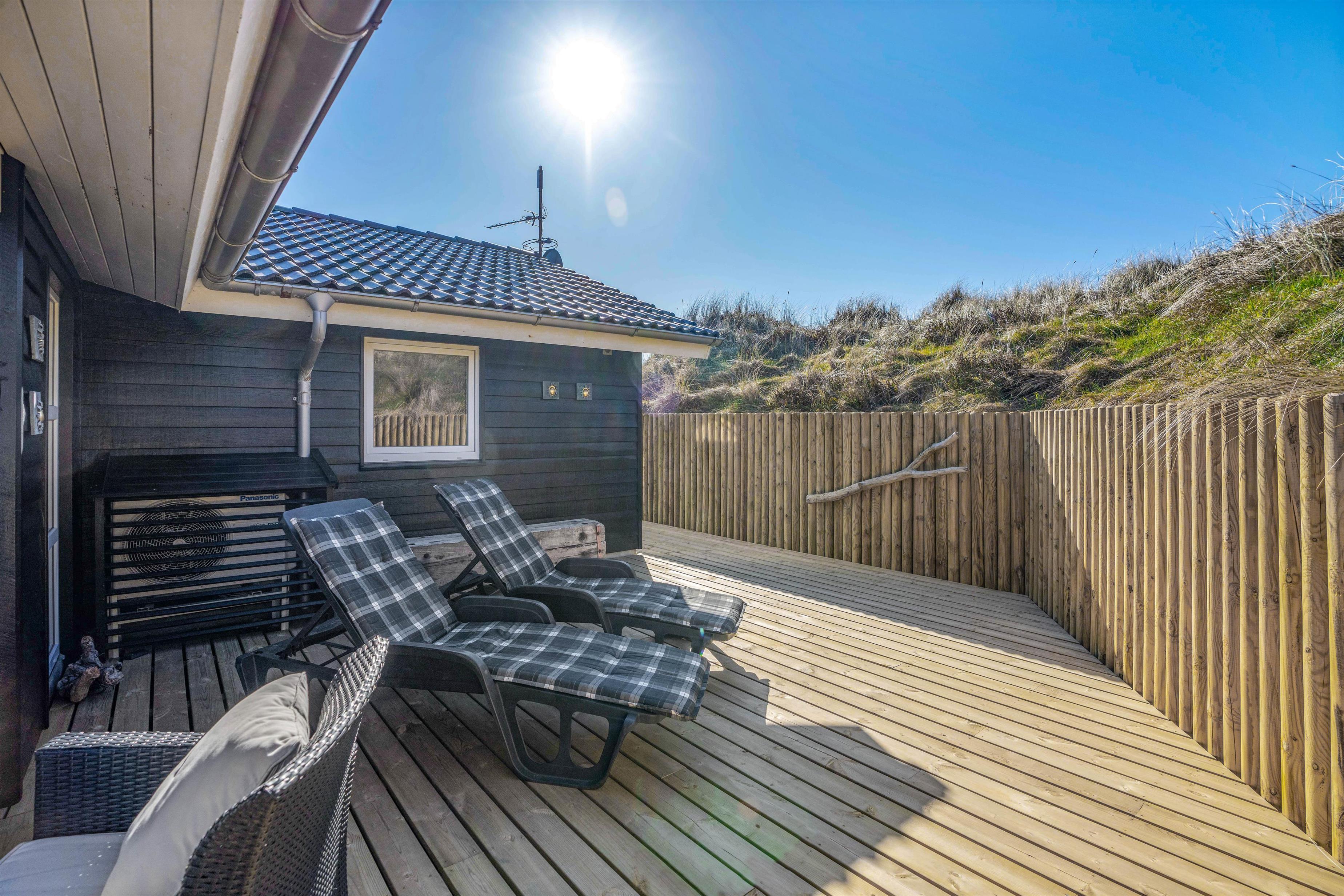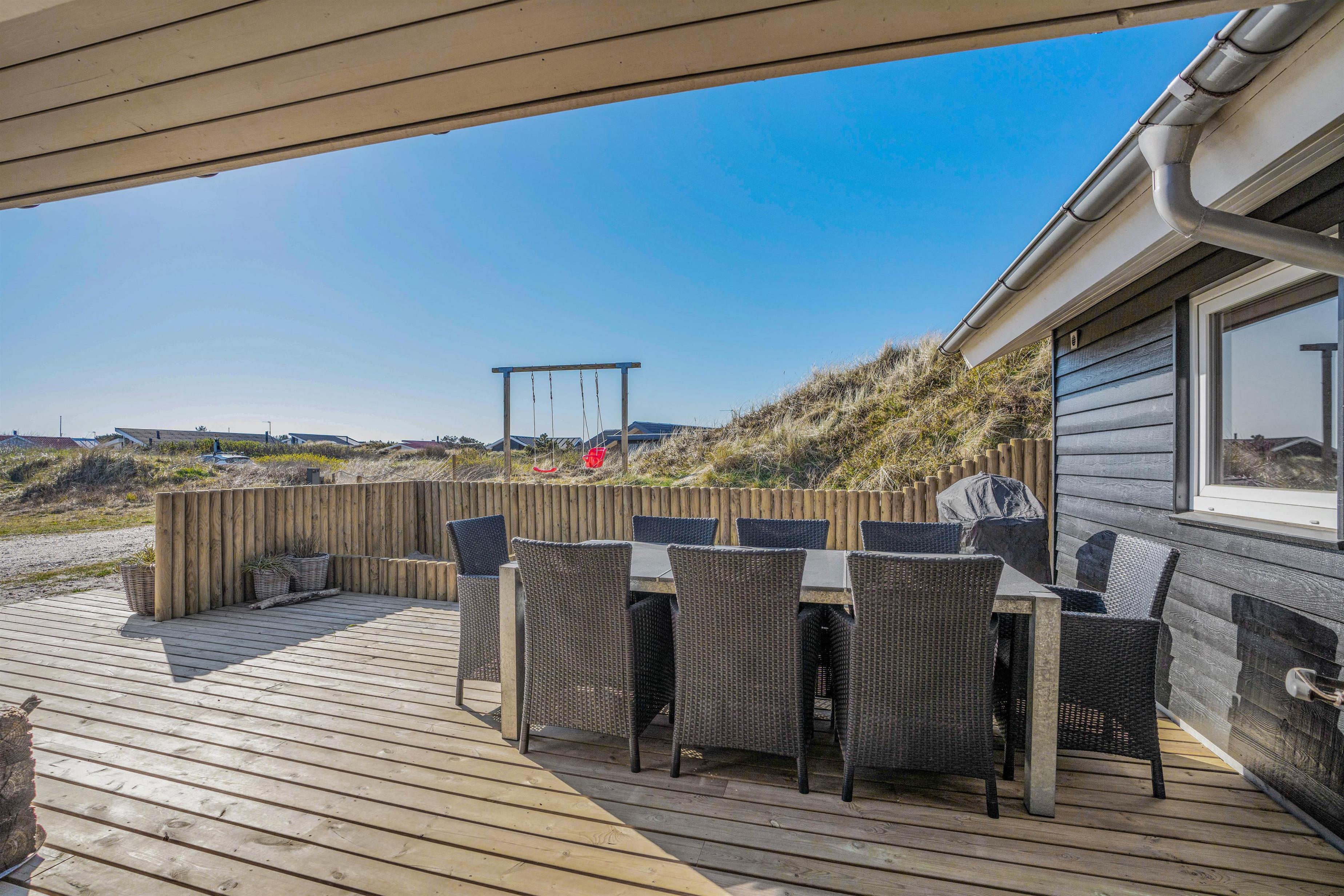 Fra opholdsrummet kommer du ud på sommerhusets skønne terrasse. Terrassen er godt afskærmet af de høje klitter, hvilket både resulterer i læ for vinden og ugenerede dage i solen for dit vedkommende. Under terrassens overdækkede del kan du slænge dig i loungemøblerne og nyde feriefreden i Bjerregårds naturskønne omgivelser.