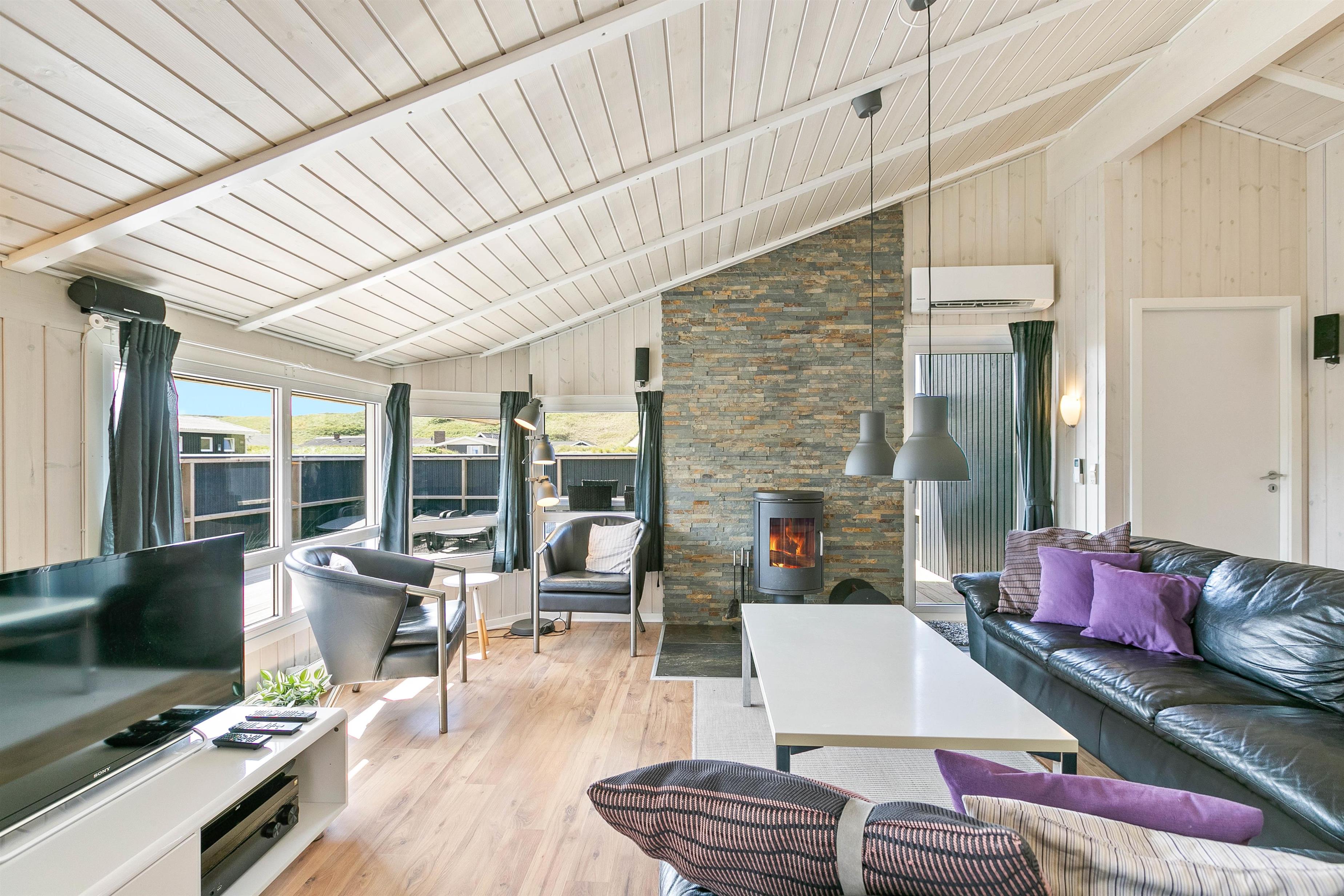 En ægte ferie med børn og hund på den jyske vestkyst, indeholder gode traveture langs det storslåede Vesterhav, som ligger 200 meter herfra. Og lige meget hvilken årstid det er, så er oplevelsen altid unik. Derefter kan du vende tilbage til feriehuset, tænde op i brændeovnen og nyde lidt varmt at drikke med god hyggemusik i baggrunden – bedre kur mod stress fra hverdagen findes ikke. Derudover er feriehuset også udstyret med en energibesparende varmepumpe.