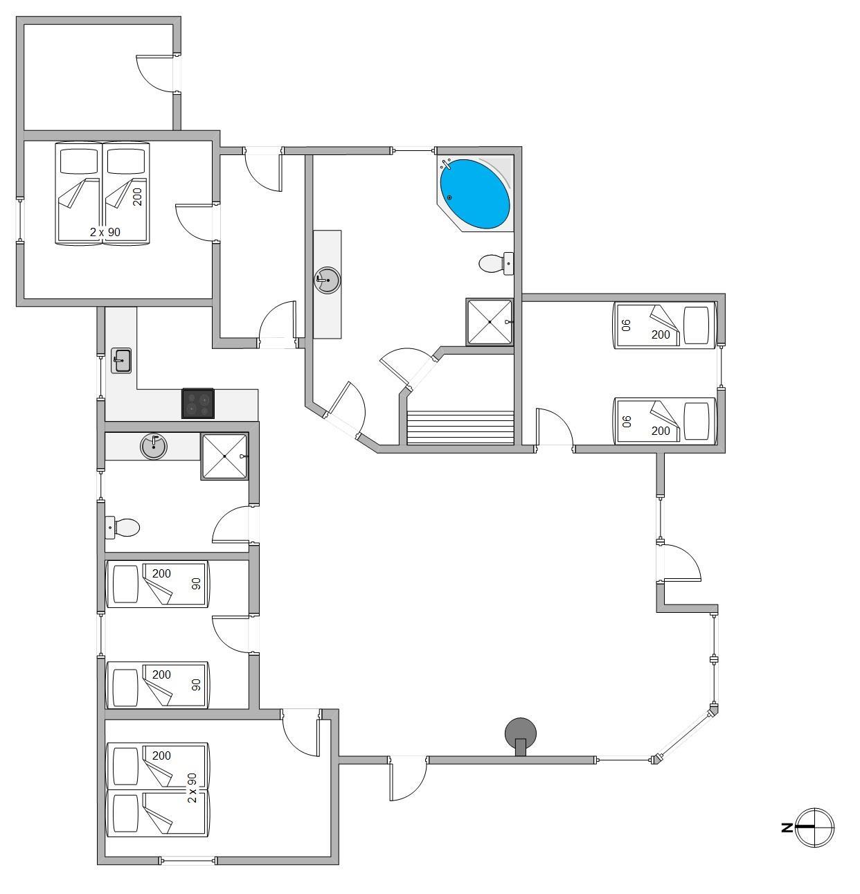 Der er plads til 8 personer, fordelt på 4 fine værelser, hvor alle sengene er elevationssenge. Der er 2 værelser med dobbeltsenge og 2 værelser med 2 enkeltsenge. Her er to badeværelser samt en hyggelig stue, hvor I kan nyde den gode udsigt mod klitlandskabet mod vest. På det ene badeværelse har I jeres egen lille wellnessafdeling med spabad og sauna.