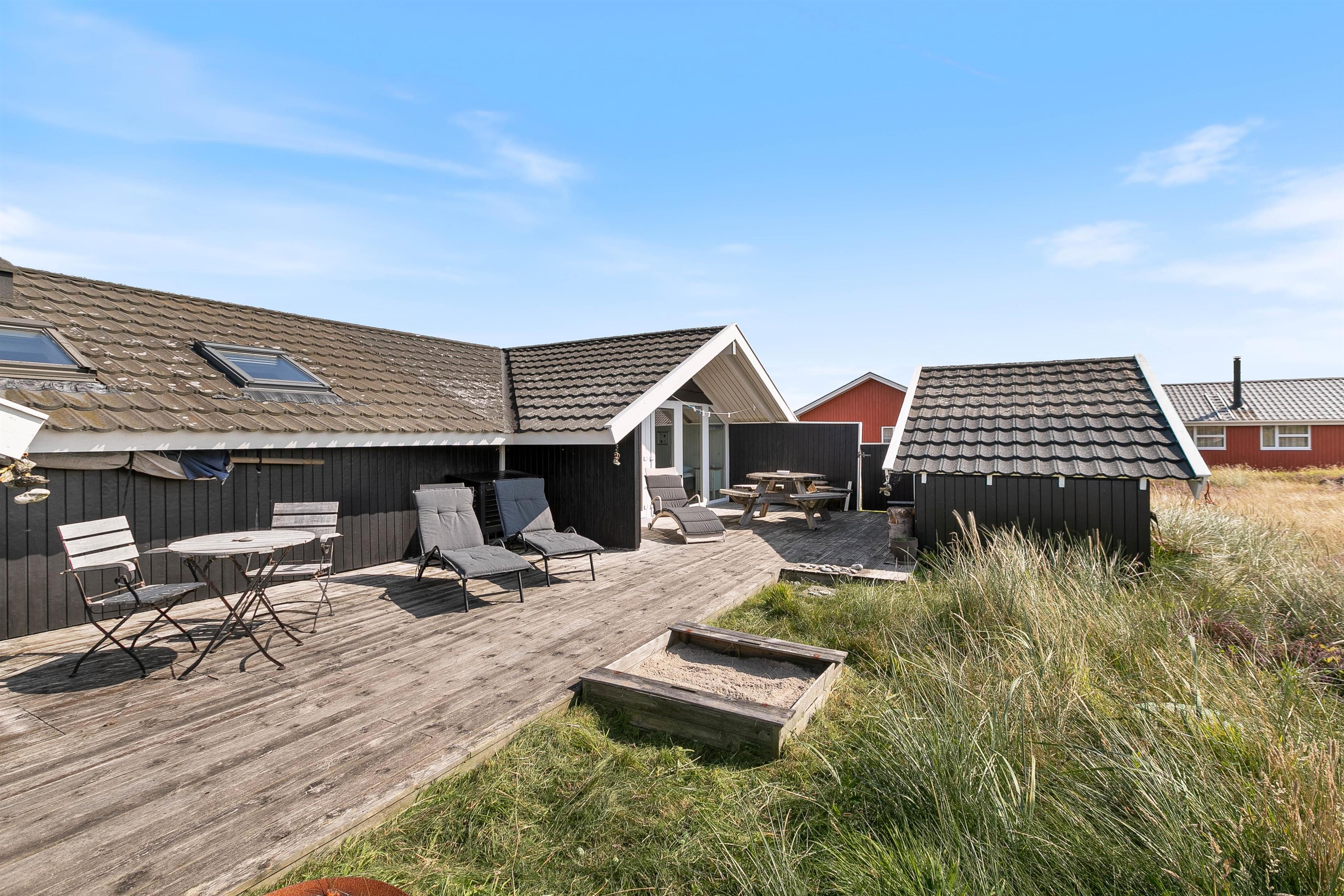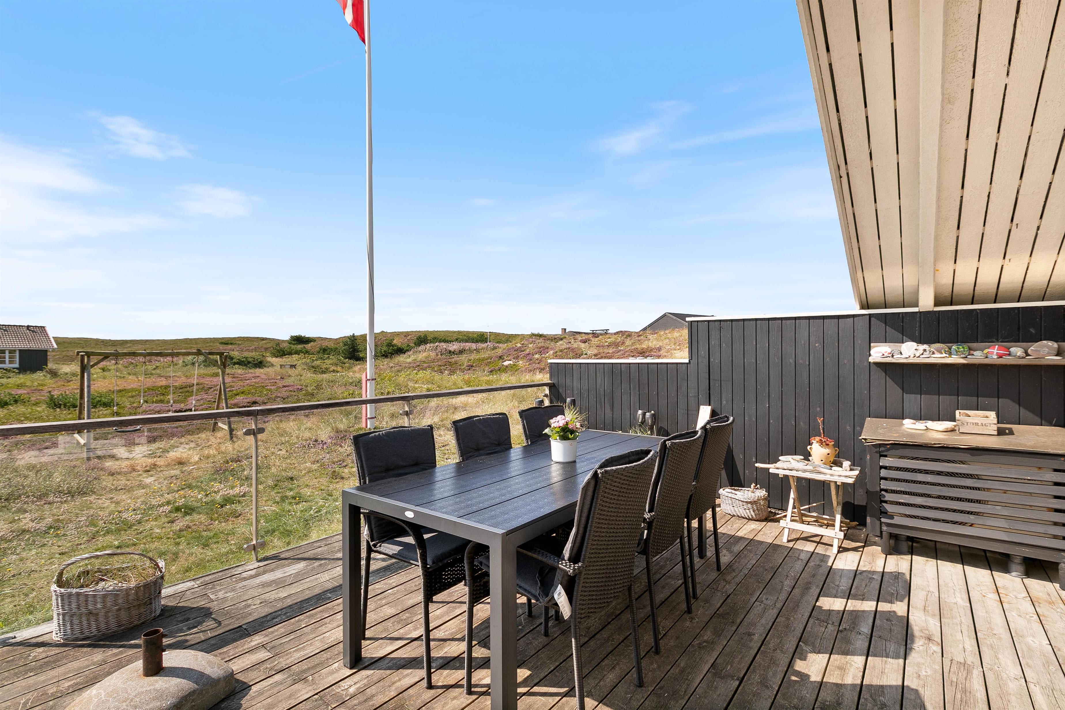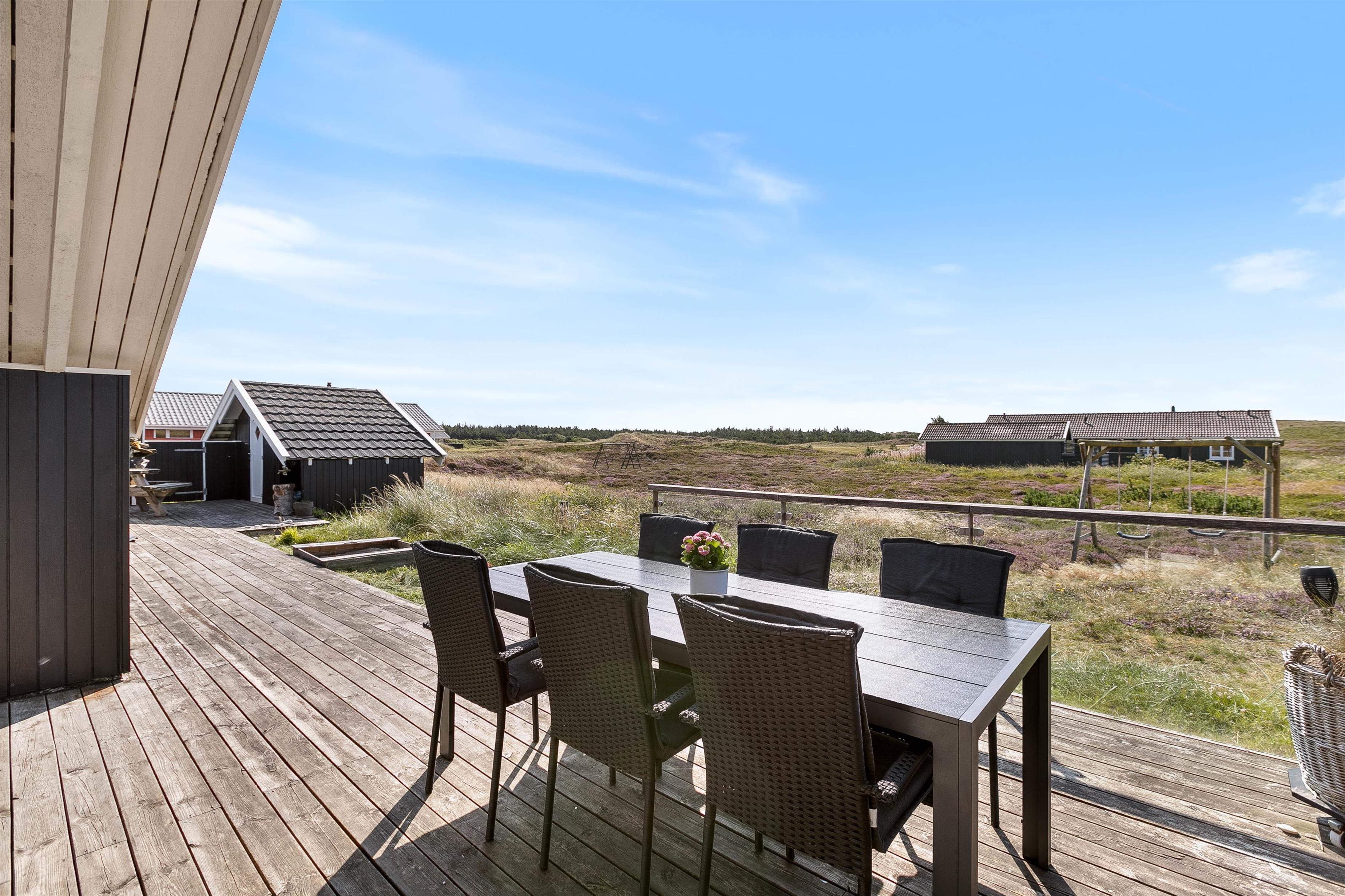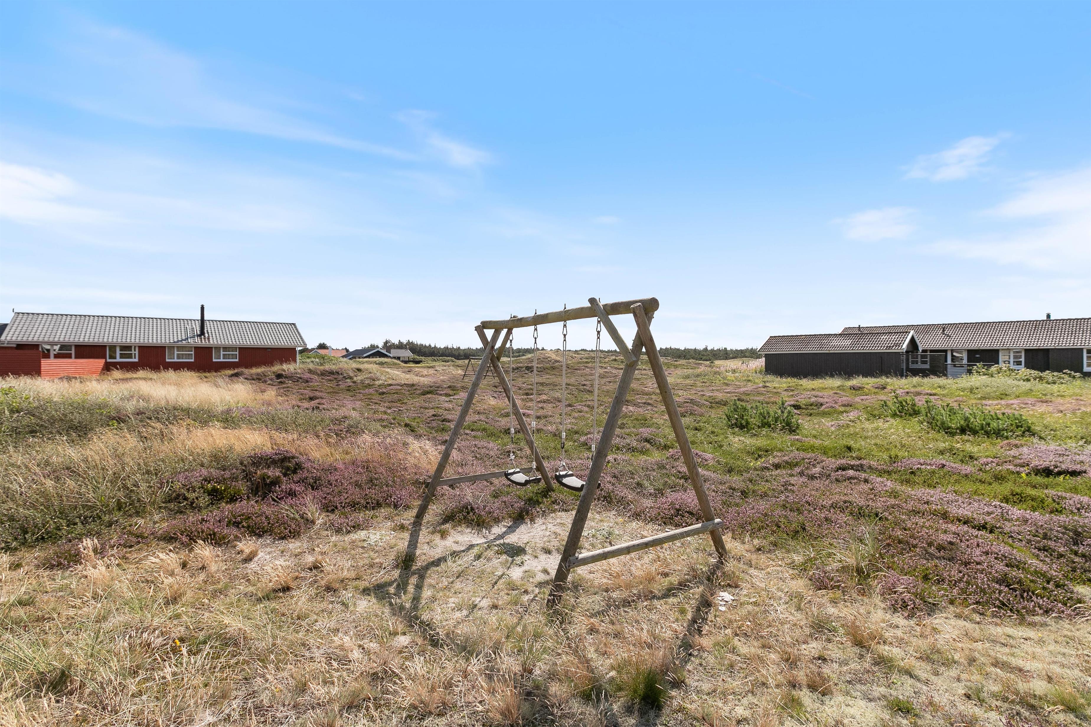 Udendørs lokker terrasserne – både på feriehusets sydlige samt nordlige side er en dejlig terrasse, så I kan nyde morgensolen såvel som aftensolen. Fuldt møbleret og med masser af hyggekroge, kan I nyde ferien på terrassen. Slap af på liggestolene om eftermiddagen, mens der til aften tændes op i grillen. Imens maden tilberedes, kan børnene gynge på gyngestativet. Nyd aftensolen med lækker mad med udsigt udover den smukke hede – fuldend aftenen med at se solnedgangen ved stranden.