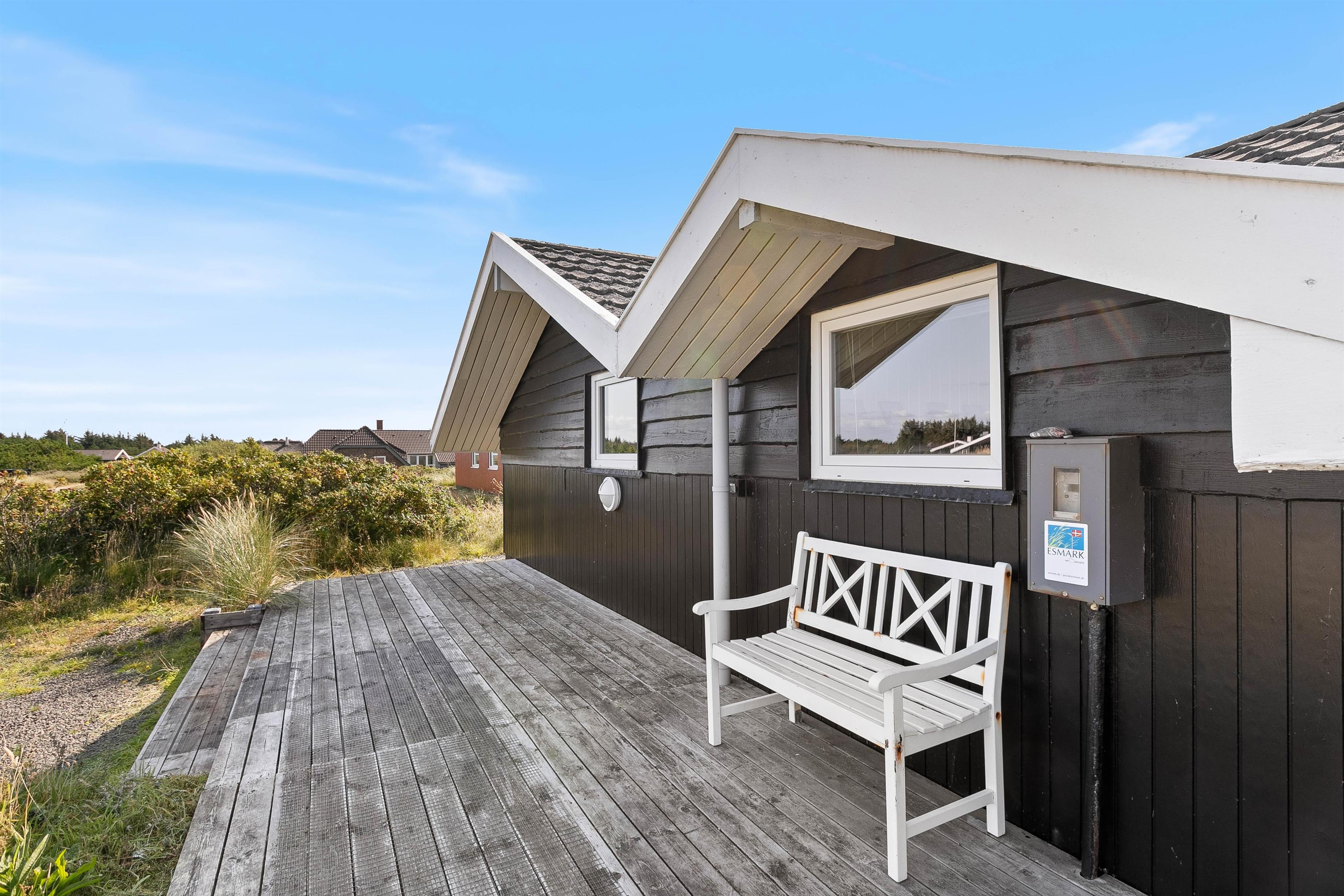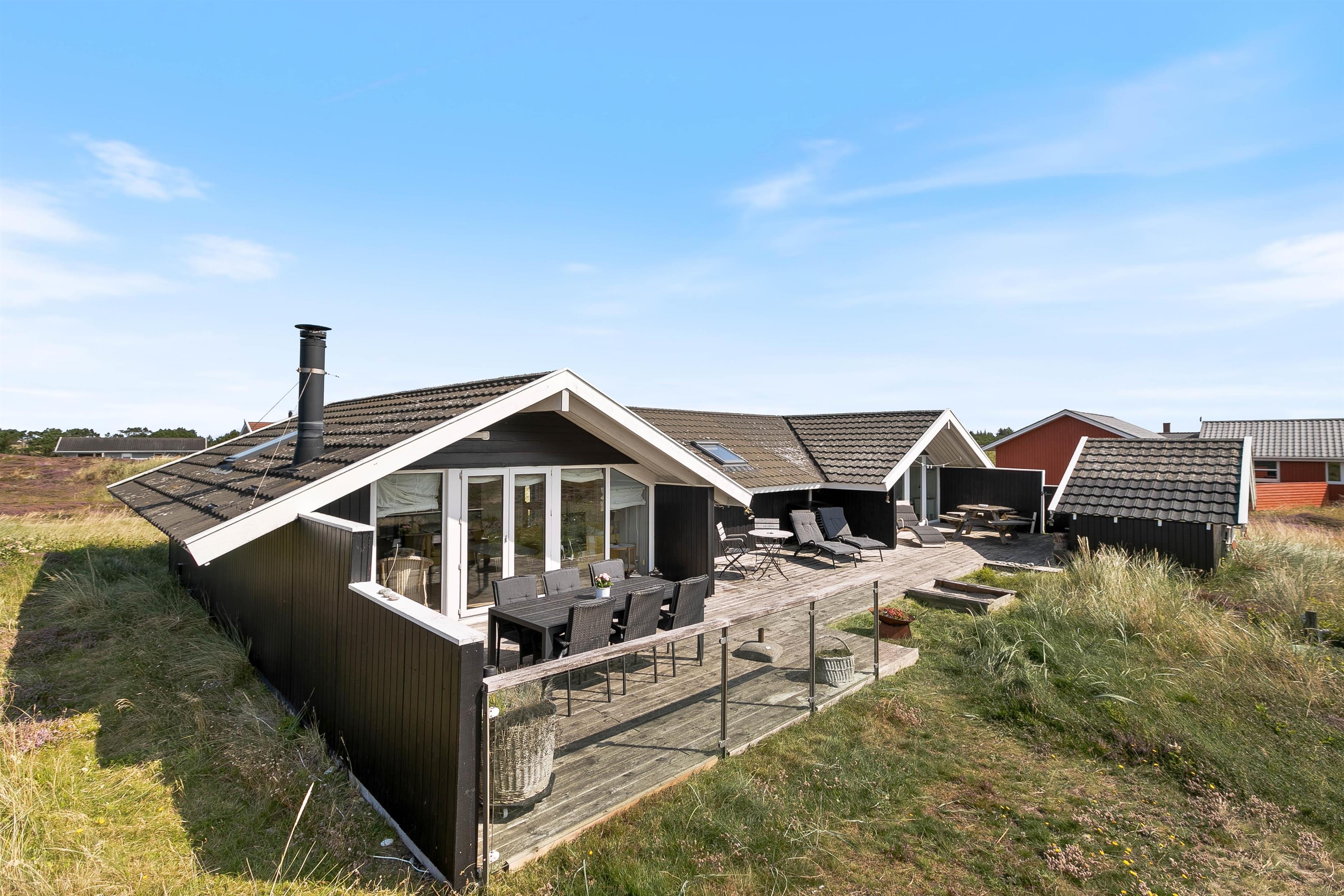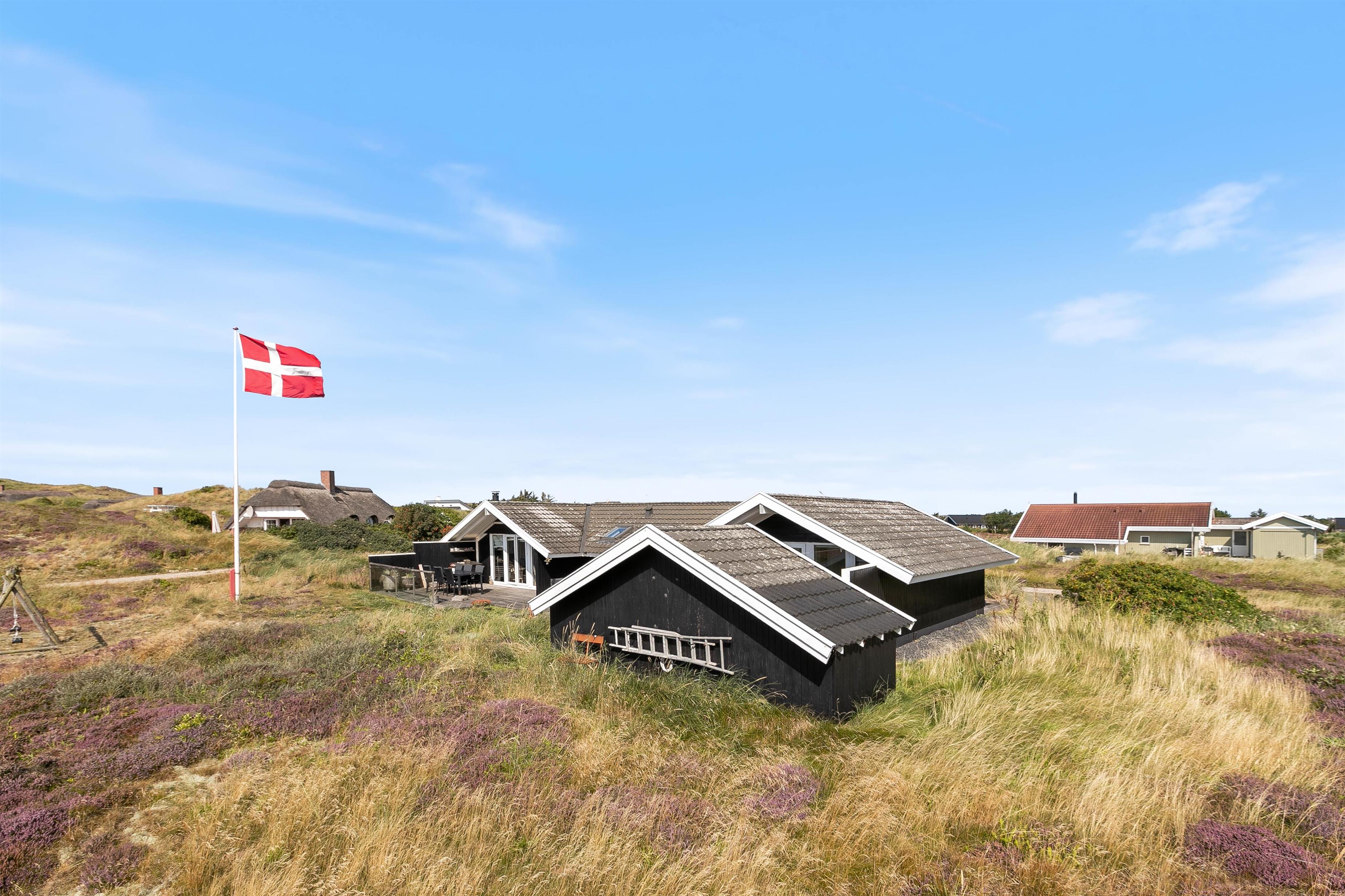 Udendørs lokker terrasserne – både på feriehusets sydlige samt nordlige side er en dejlig terrasse, så I kan nyde morgensolen såvel som aftensolen. Fuldt møbleret og med masser af hyggekroge, kan I nyde ferien på terrassen. Slap af på liggestolene om eftermiddagen, mens der til aften tændes op i grillen. Imens maden tilberedes, kan børnene gynge på gyngestativet. Nyd aftensolen med lækker mad med udsigt udover den smukke hede – fuldend aftenen med at se solnedgangen ved stranden.