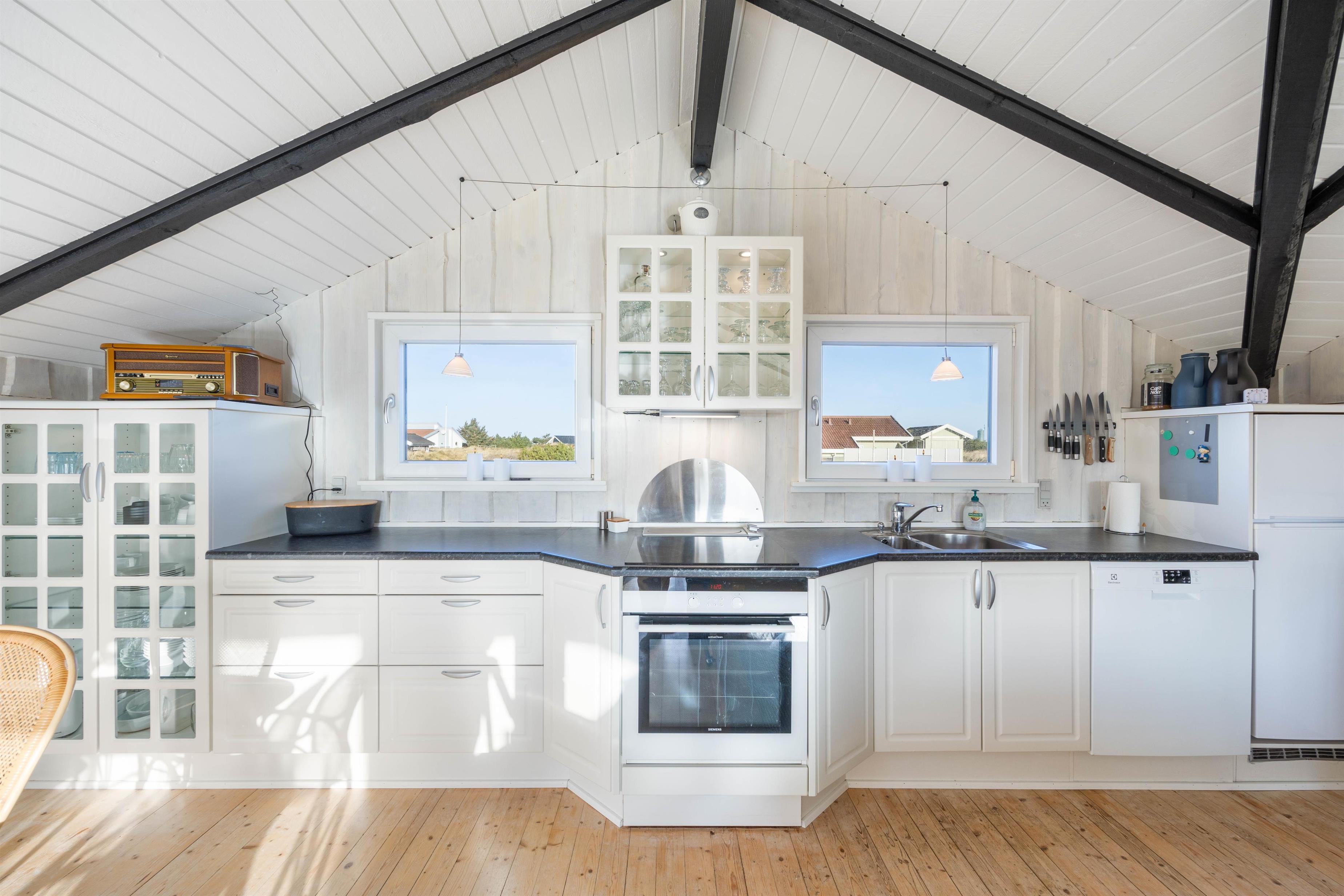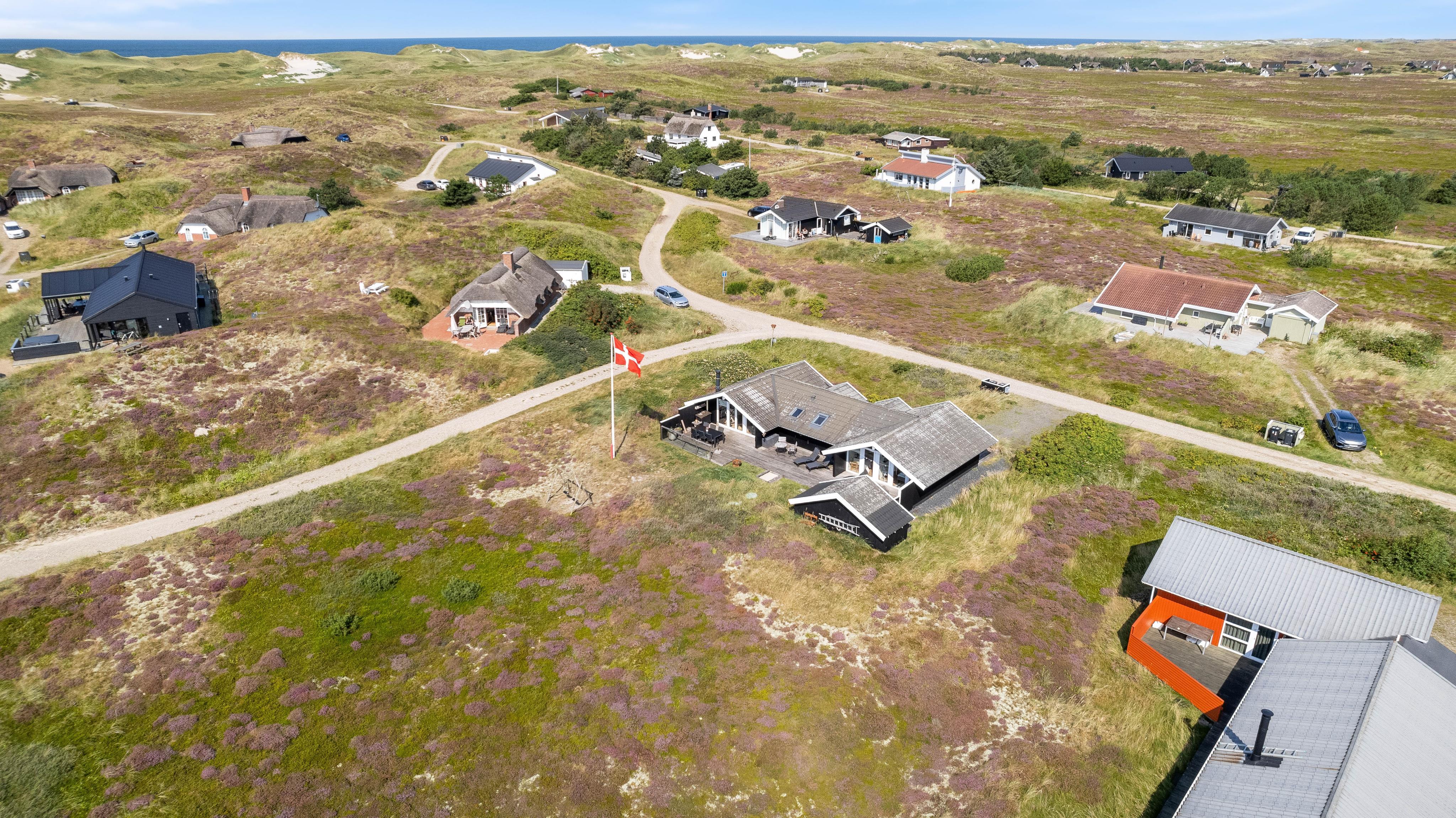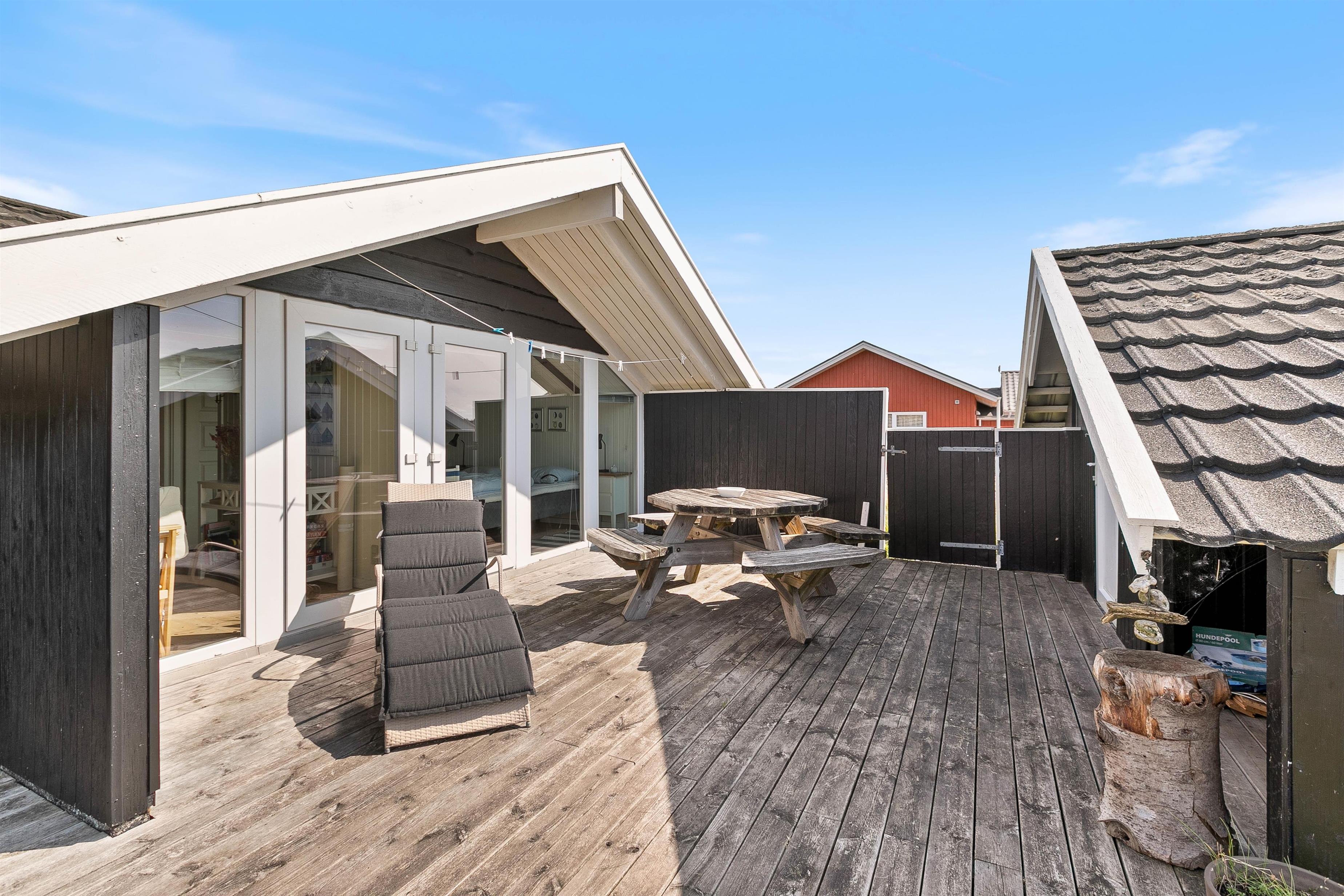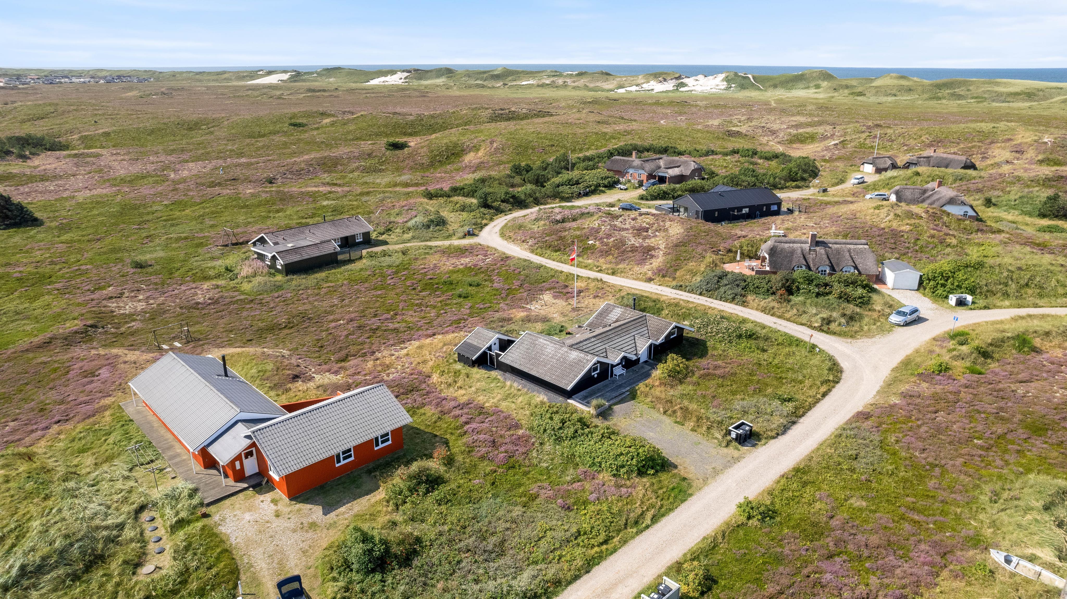 Udendørs lokker terrasserne – både på feriehusets sydlige samt nordlige side er en dejlig terrasse, så I kan nyde morgensolen såvel som aftensolen. Fuldt møbleret og med masser af hyggekroge, kan I nyde ferien på terrassen. Slap af på liggestolene om eftermiddagen, mens der til aften tændes op i grillen. Imens maden tilberedes, kan børnene gynge på gyngestativet. Nyd aftensolen med lækker mad med udsigt udover den smukke hede – fuldend aftenen med at se solnedgangen ved stranden.