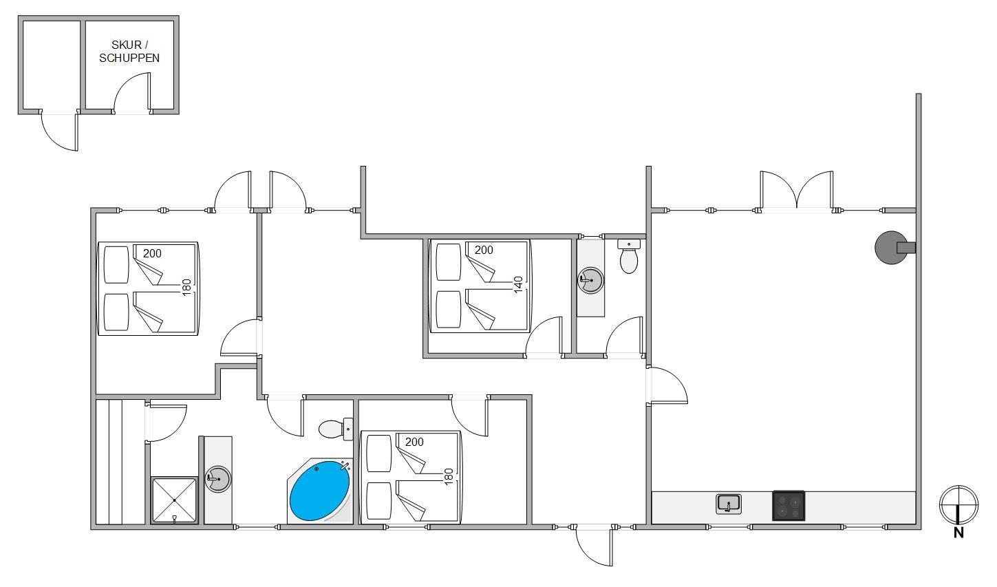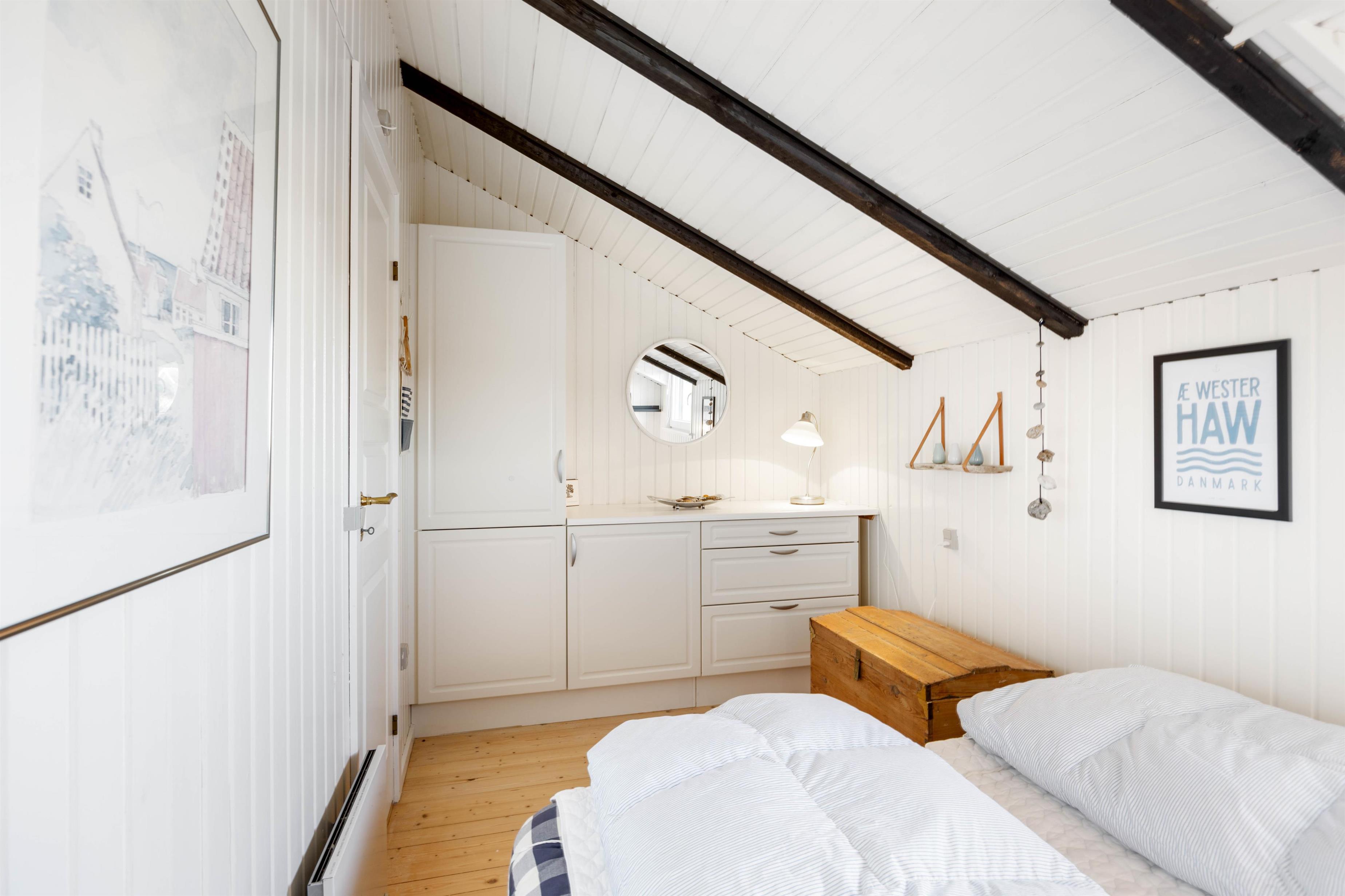 Fra indgangen mod venstre finder I soveafdelingen samt endnu et hyggeligt opholdsrum med varmepumpe. Sæt dig godt til rette med en god bog i lænestolen, mens børnene leger på gulvet. Alle soveværelser er alle indrettet med behagelige senge. De to store værelser er indrettet med en stor dobbeltseng, 180x200cm, og her er god mulighed for opbevaring, mens I på det sidste værelse finder en 140x200cm seng.