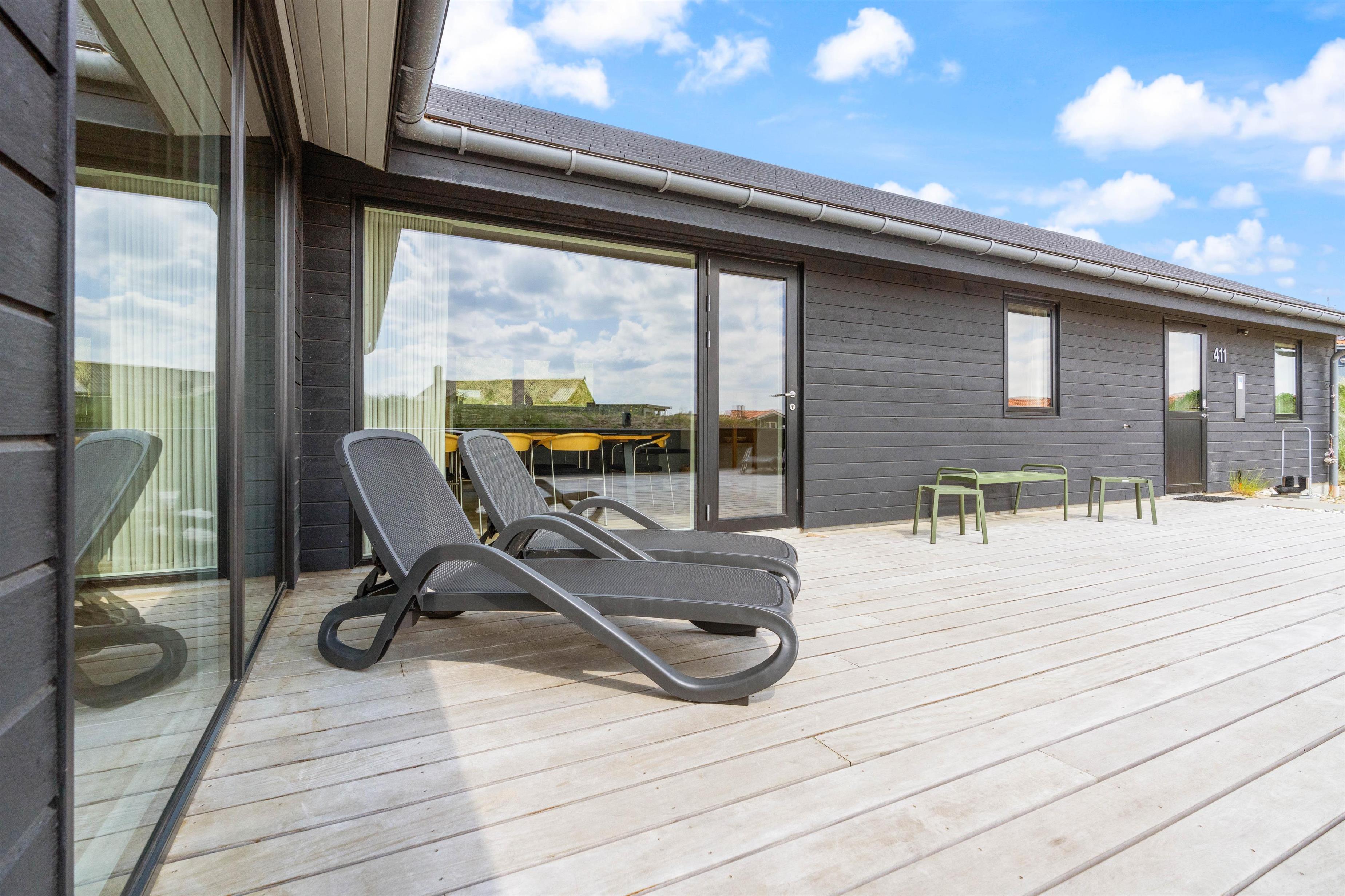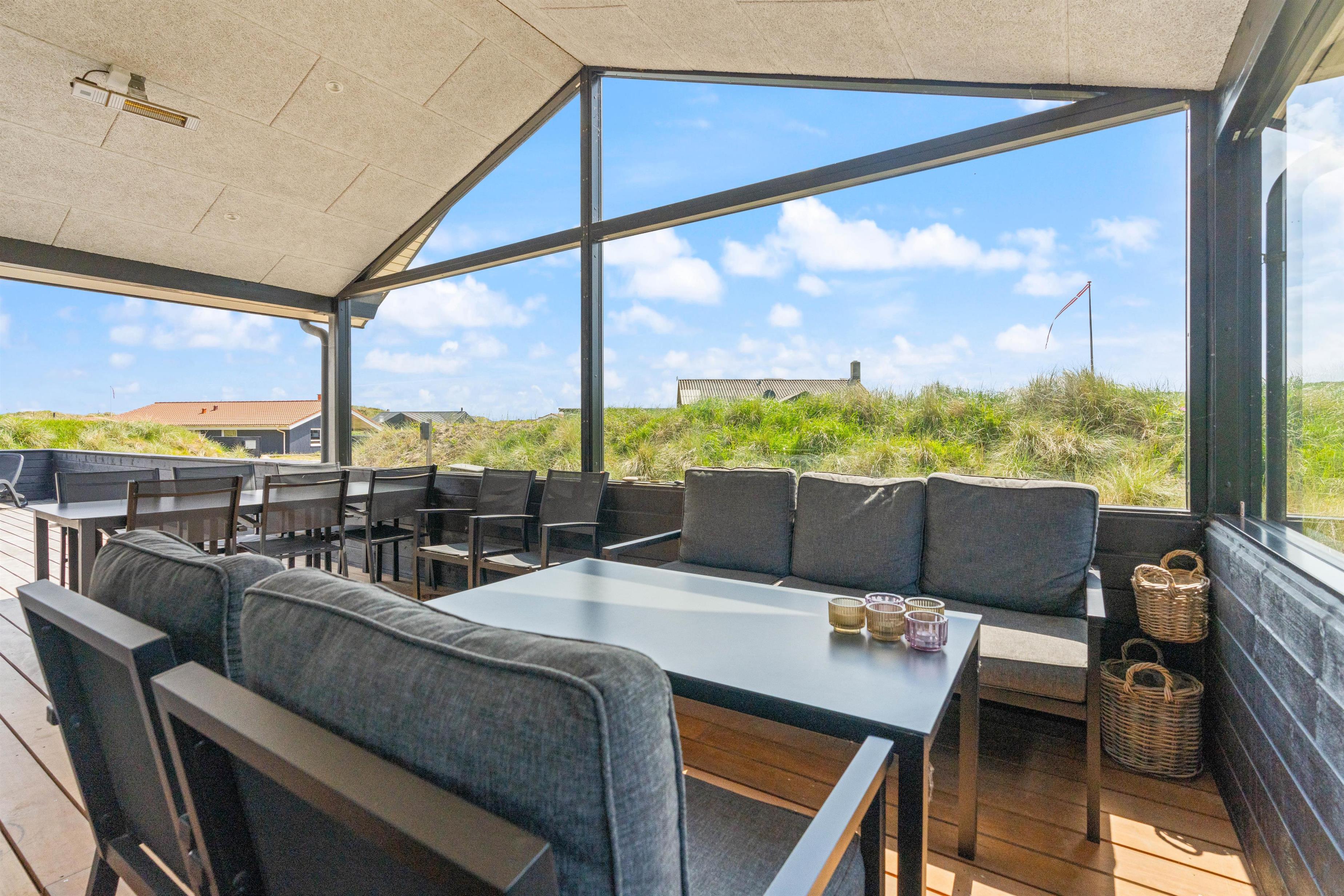 Feriehuset er beliggende på en dejlig stor, læfyldt og ugeneret grund. Nyd en sommerdag på den skønne, ca. 20 kvm. overdækkede terrasse med glasafskræmning på 3 sider. Sæt jer i de behagelige havemøbler eller læg jer i solvognen med en god bog og lyt til Vesterhavets brusen i læ for vinden.
