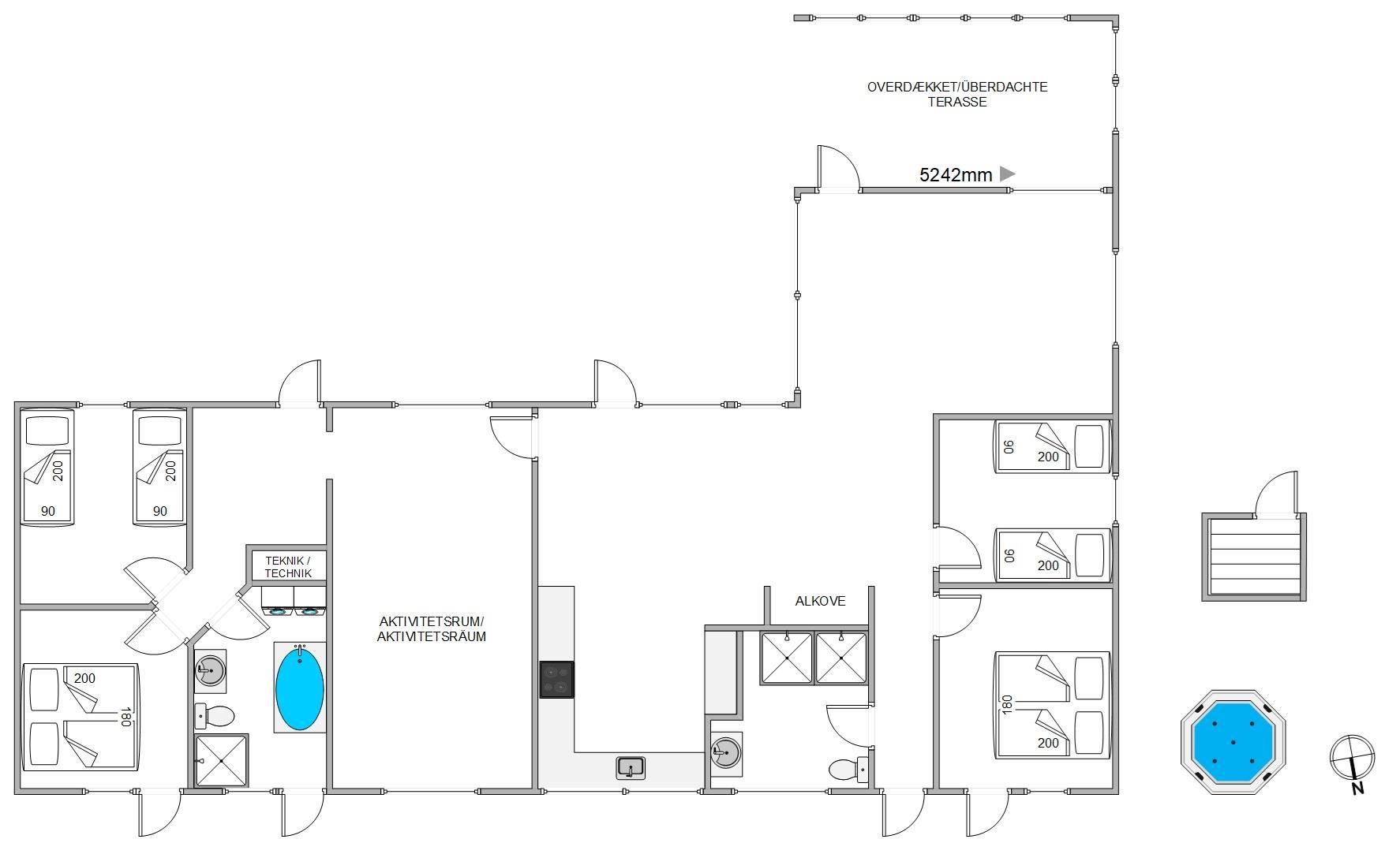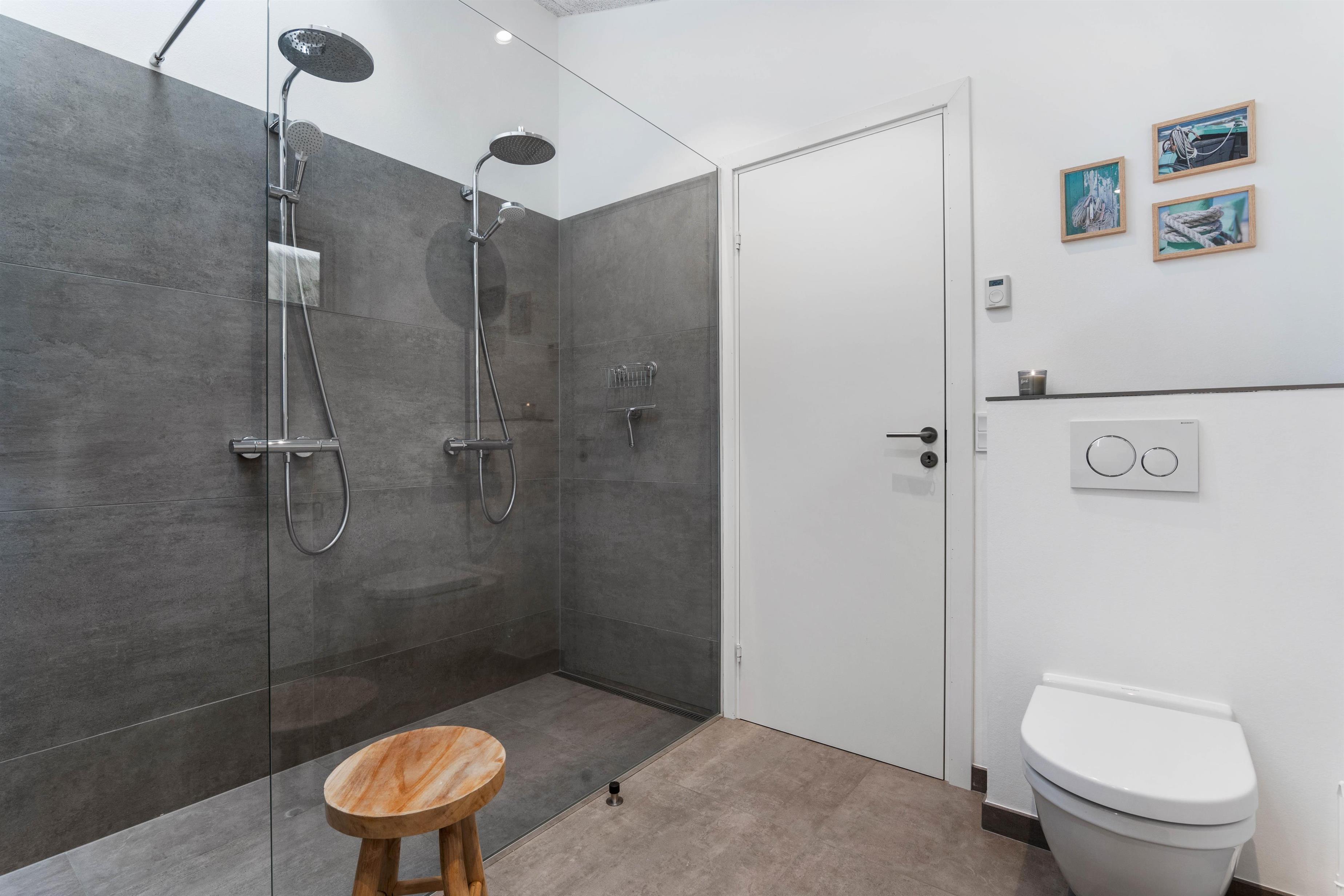 Feriehusets to badeværelser er begge med behagelig gulvvarme og ovenlysvinduer. På det ene badeværelse indbyder badekarret til varme afslappende stunder, hvor musklerne bliver løsnet og hverdagens stress glemmes. Her finder I også to brusere og en 195 L varmtvandsbeholder, god til de lange bade.