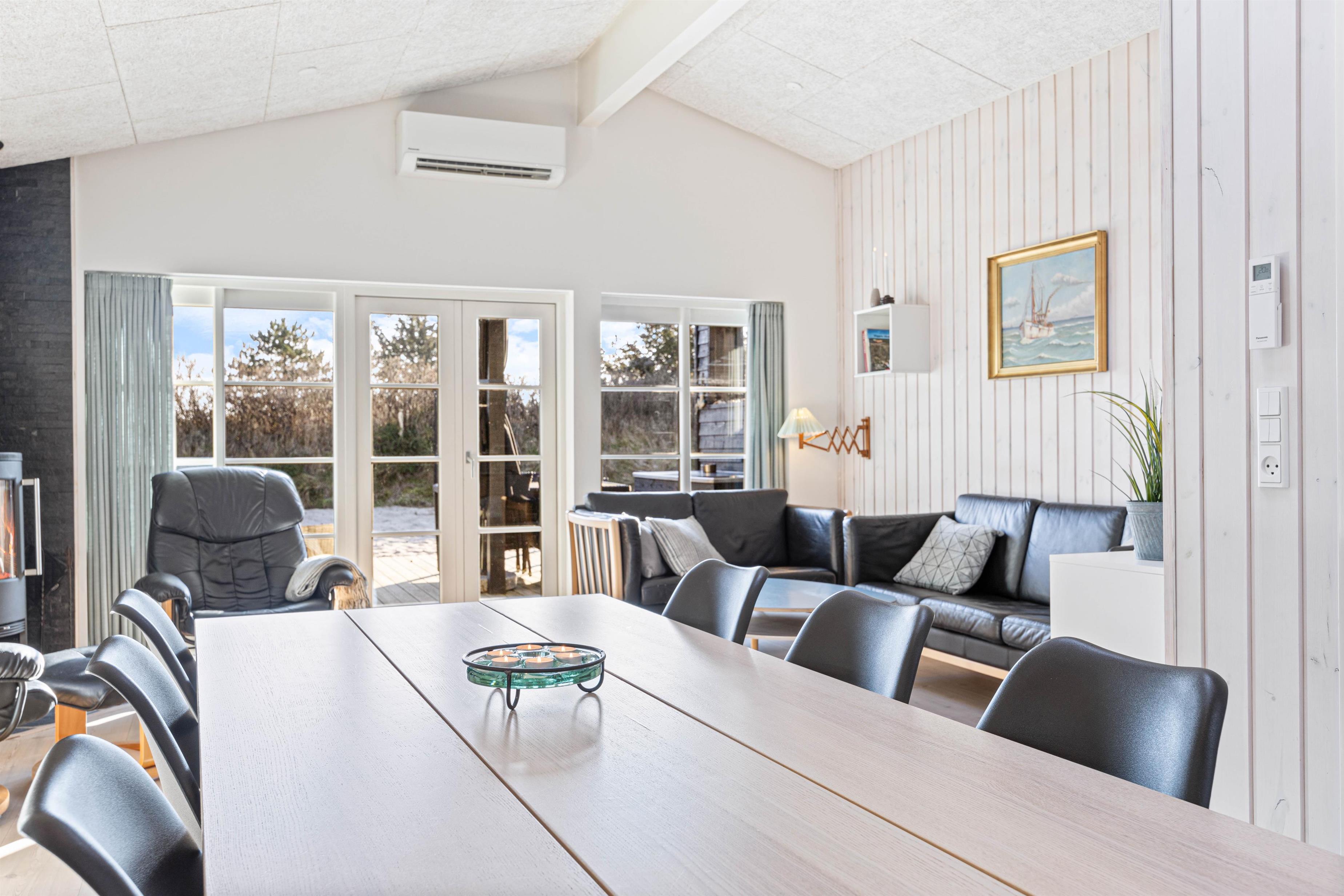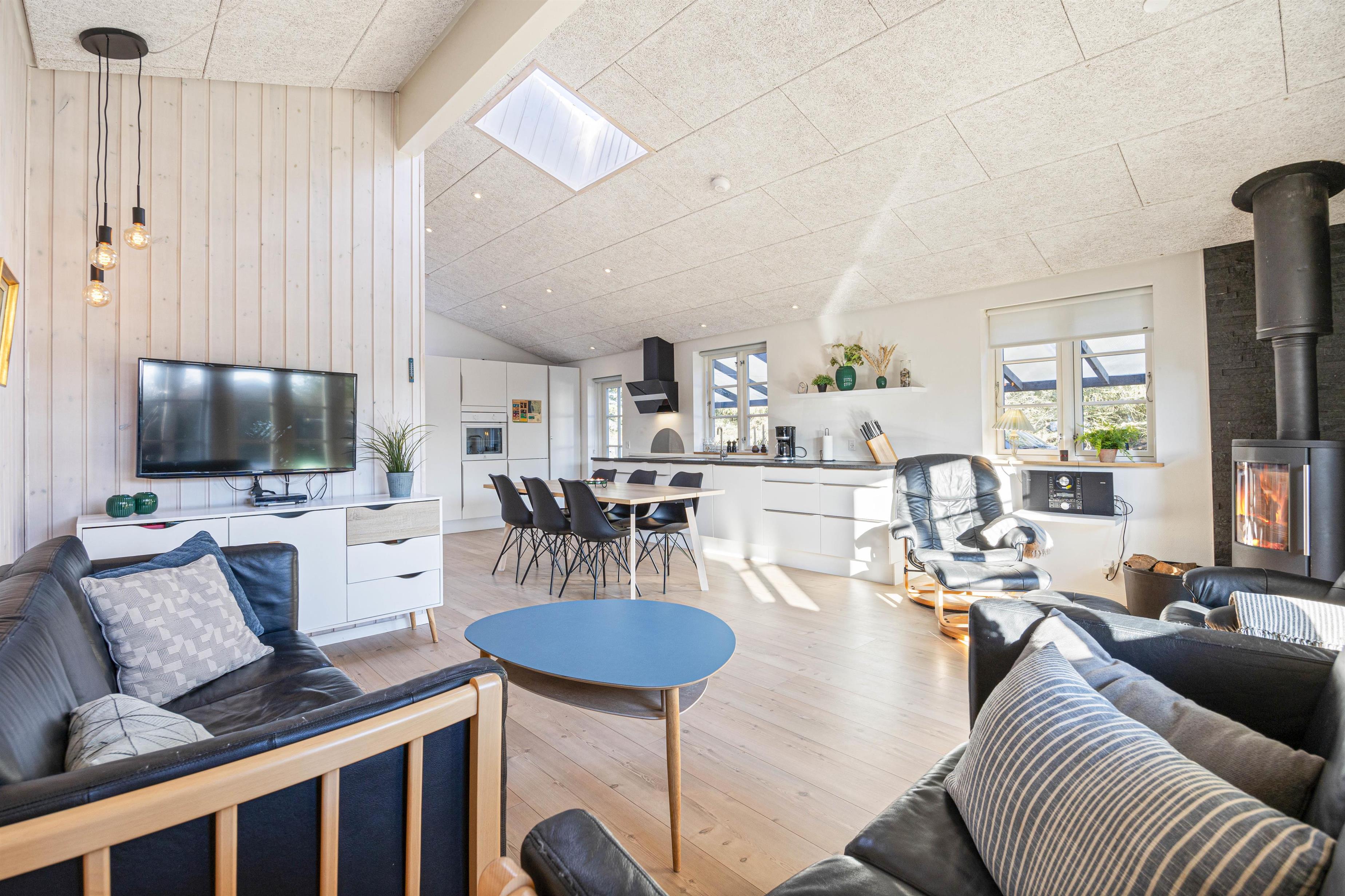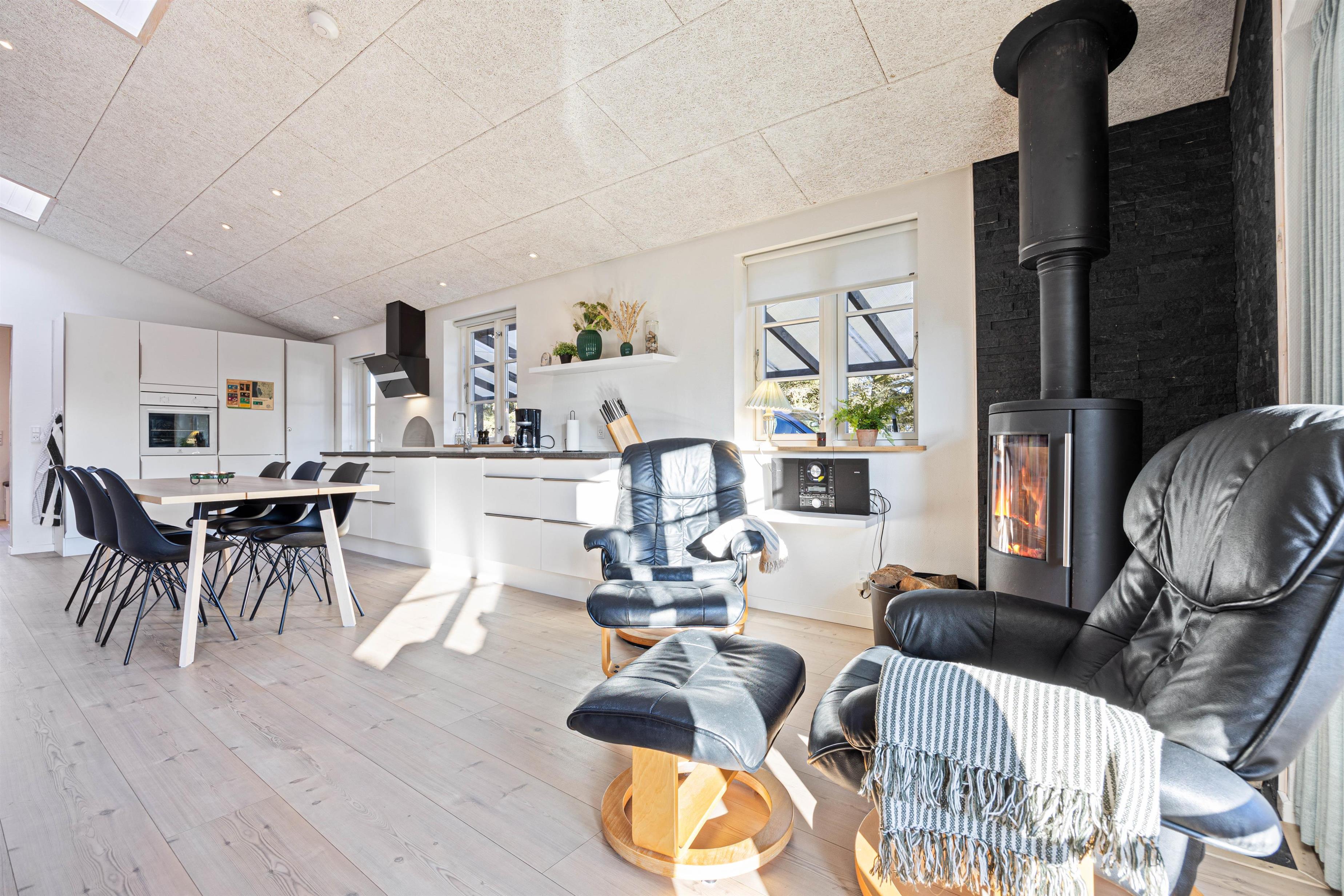Det lyse, åbne opholdsrum er sommerhusets hjerte byder med sine naturlige farver, højt til loftet og behagelige siddepladser til behagelig afslapning, f.eks. med et brætspil eller to ved det rummelige spisebord. Brændeovnen og den energibesparende varmepumpe giver et behageligt indeklima, og træets knitren skaber en helt særlig atmosfære og feriestemning.