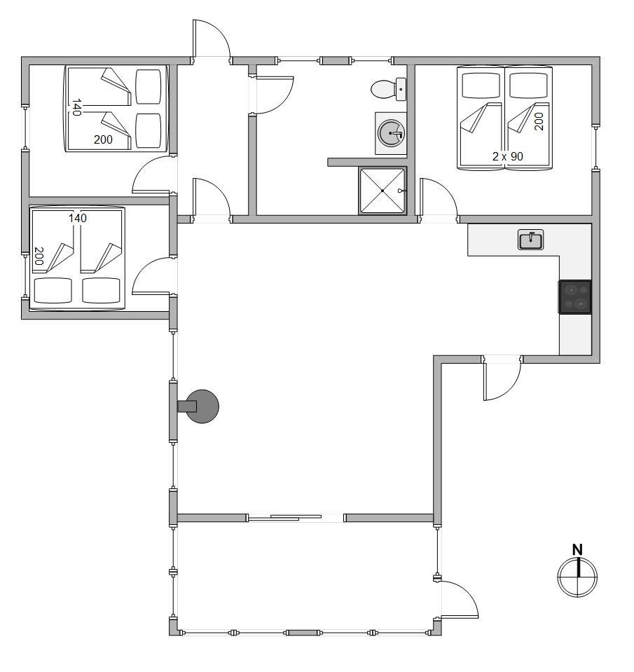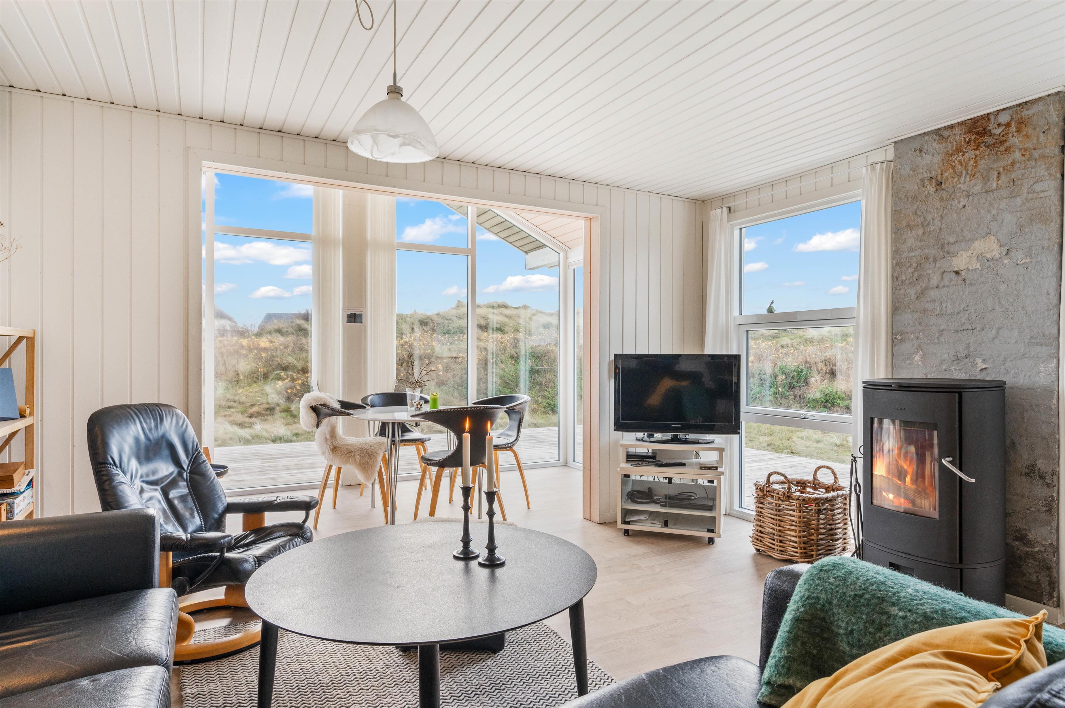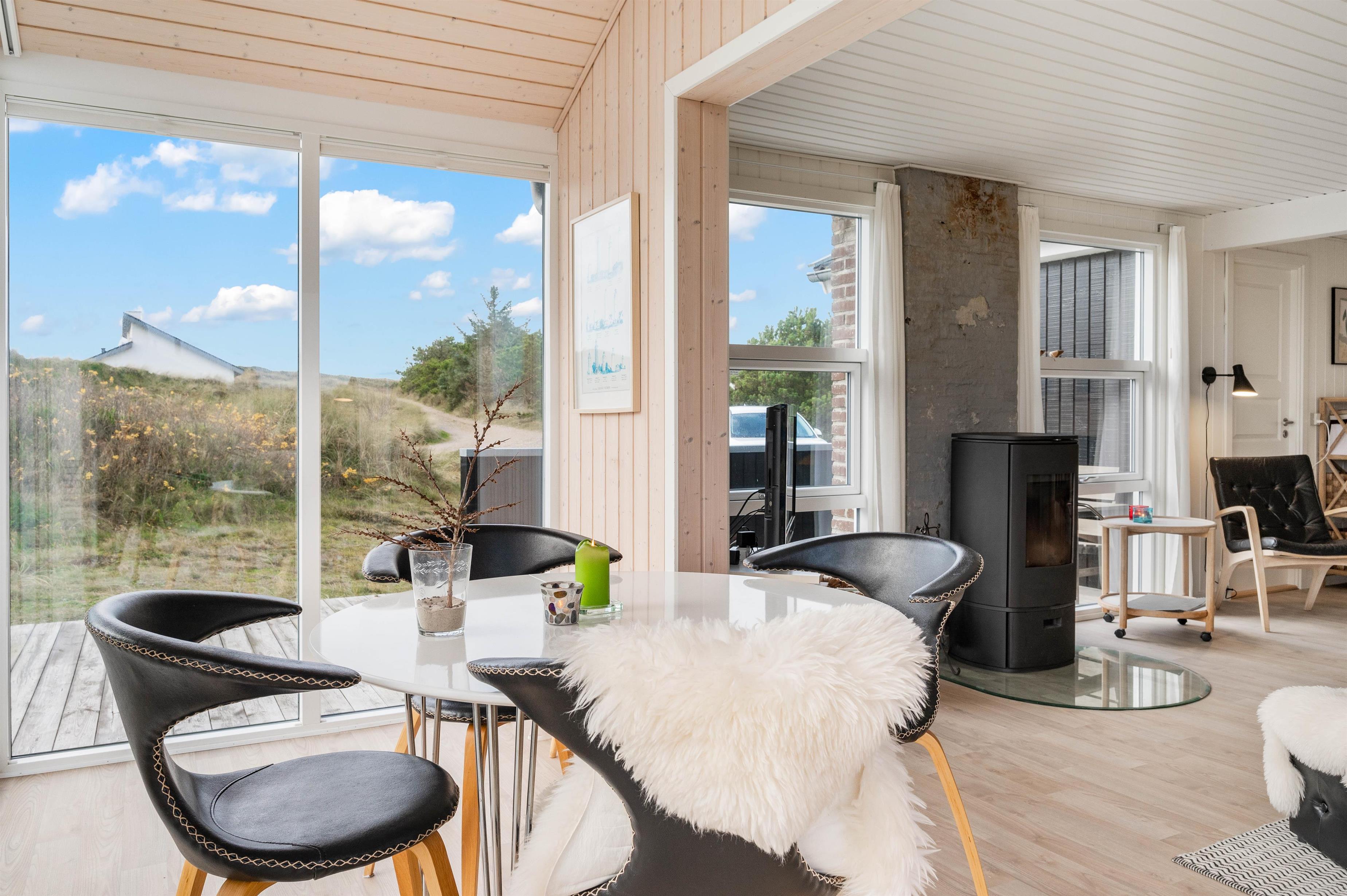 Feriehuset er også udstyret med en brændeovn, som til hver en tid vil gøre ferien endnu hyggeligere. Især i de kolde vintermåneder vil de knitrende flammer fylde rummet med varme og feriestemning, mens I drikker en friskbrygget kop kaffe rundt om sofabordet.