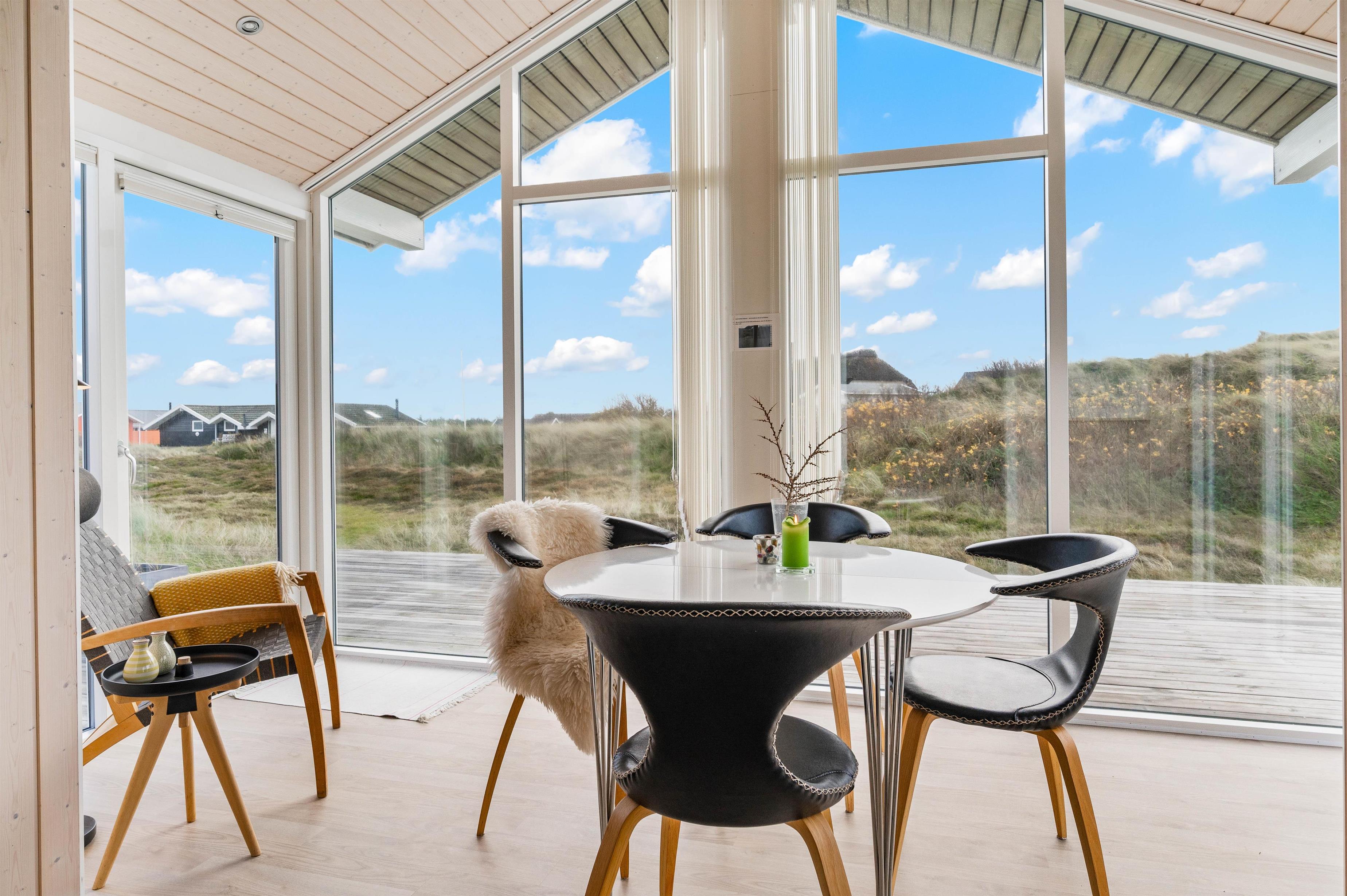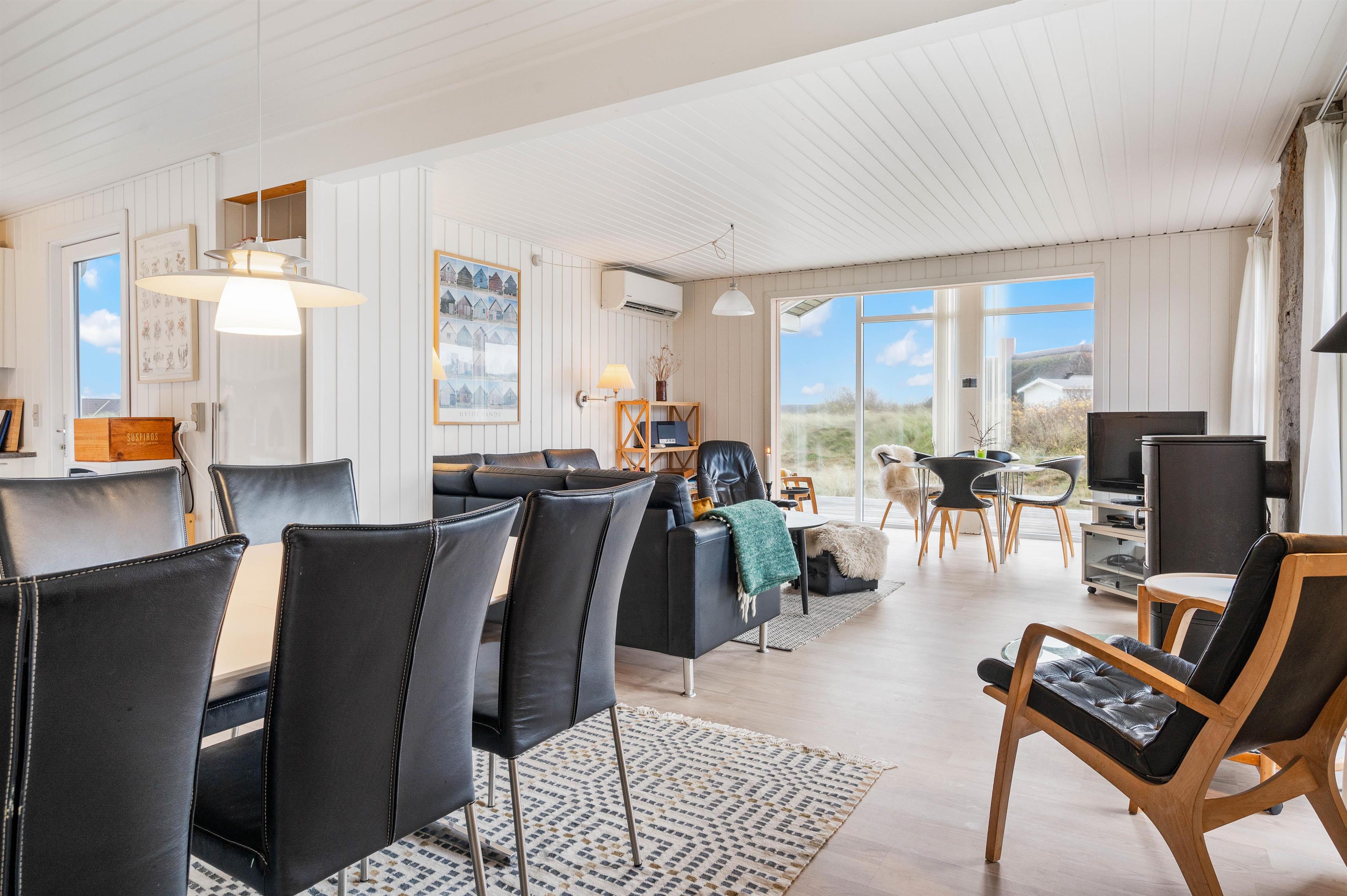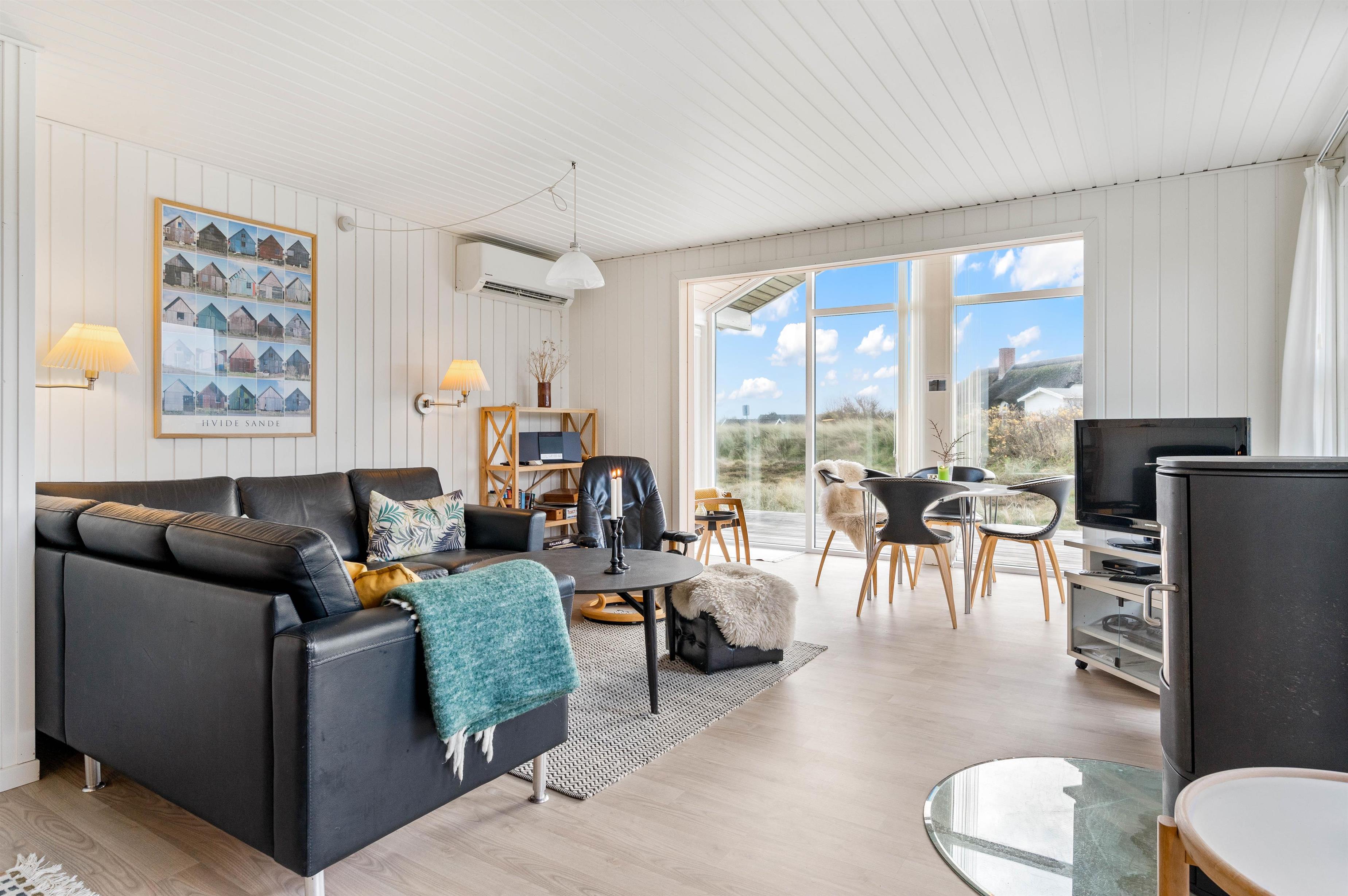 De store vinduespartier slipper masser af lys ind, og sammen med de hvidmalede vægge og lofter sørger de for en behagelig og afslappende ferieatmosfære. Stue, spiseafdeling og køkken er kombineret i ét hyggeligt opholdsrum, hvor hele familien kan samles om madlavningen og slappe af på sofaen med en god film.