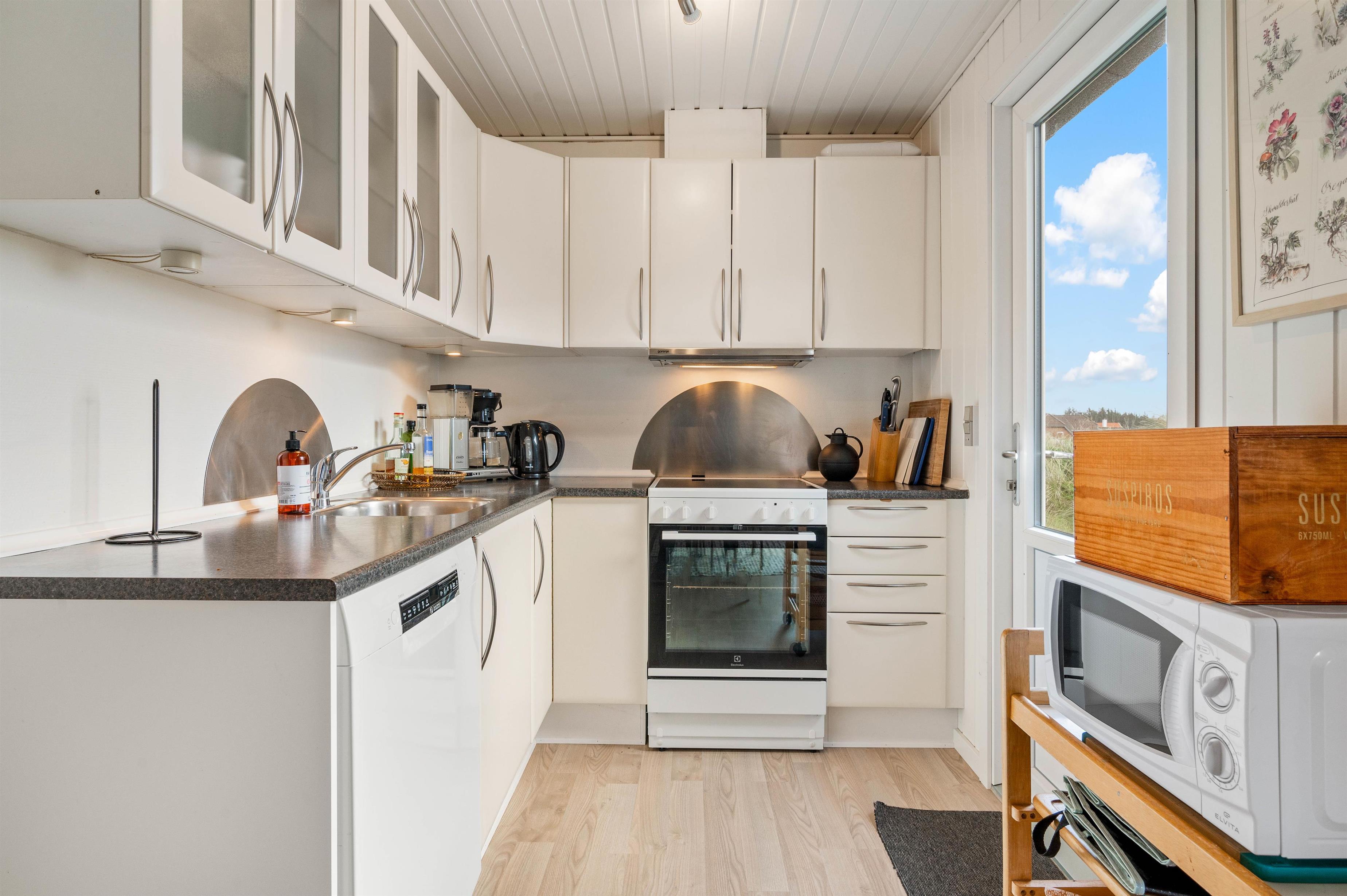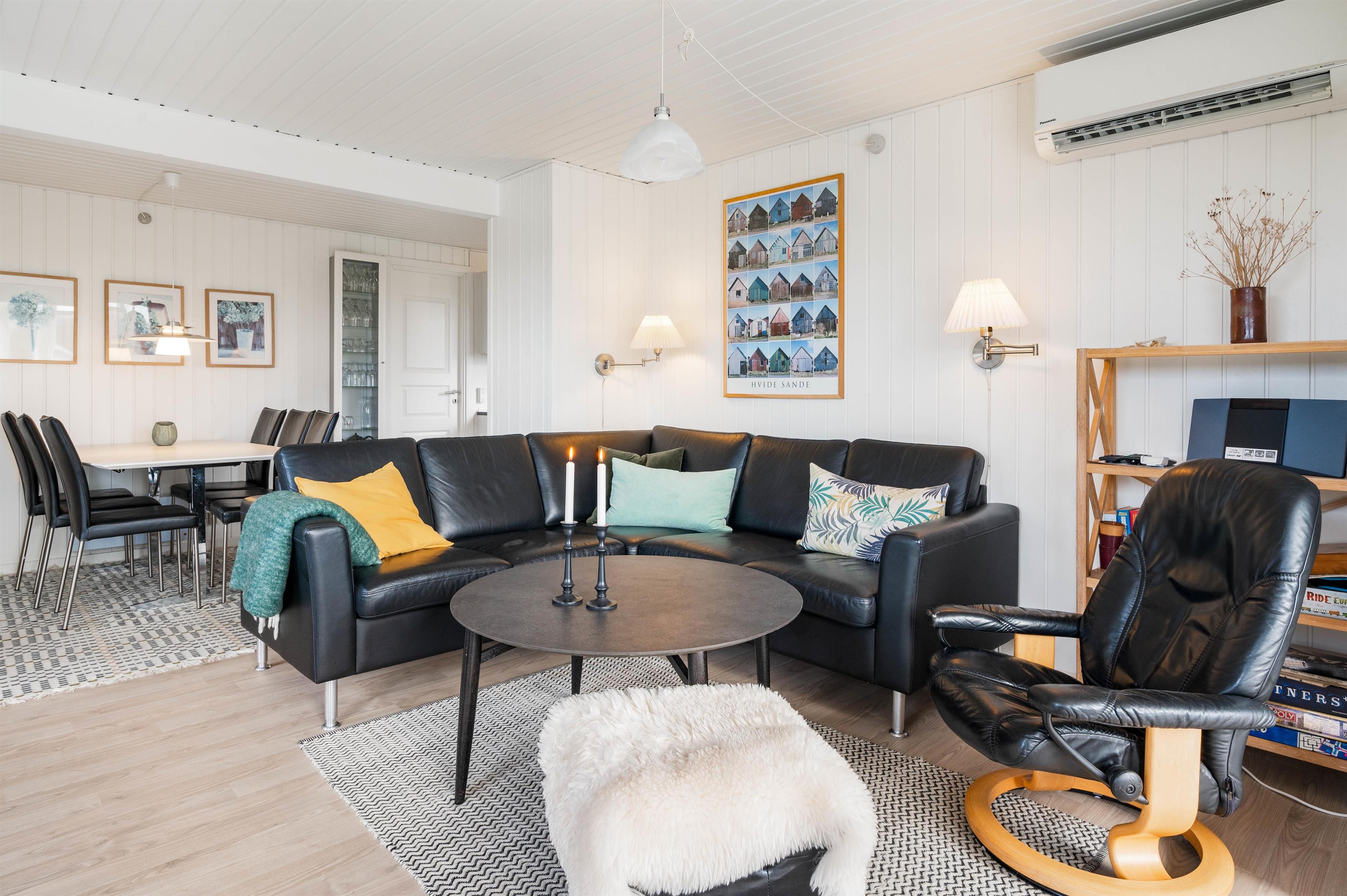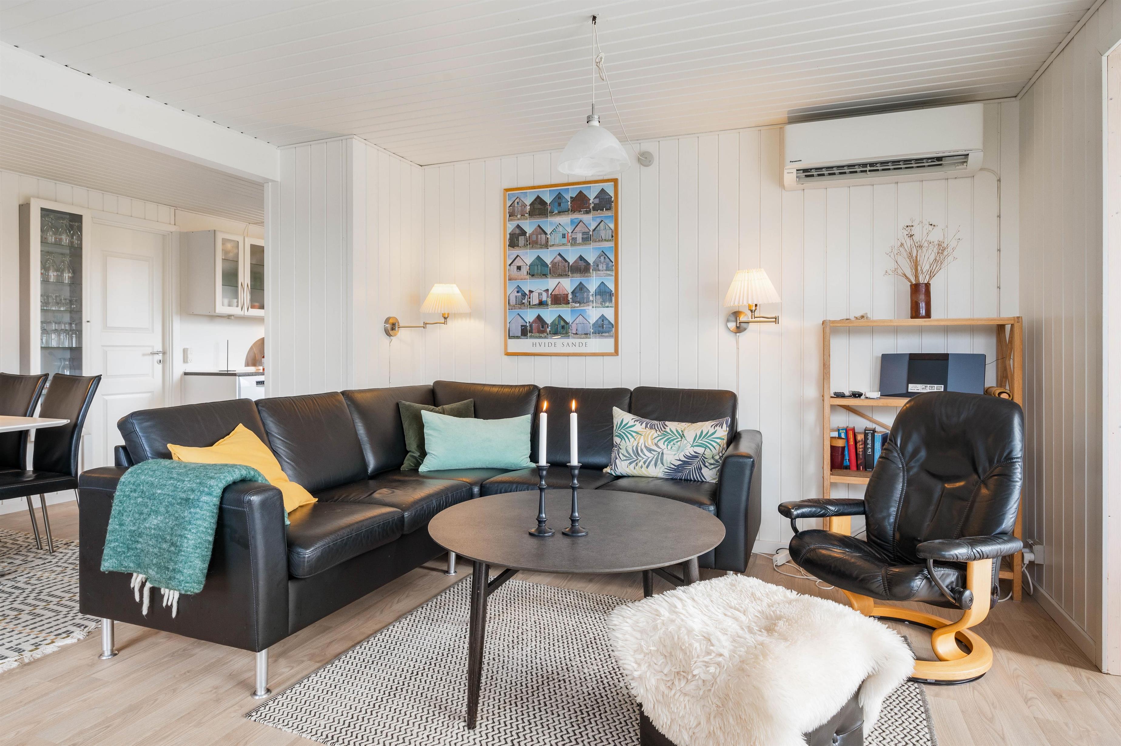 De store vinduespartier slipper masser af lys ind, og sammen med de hvidmalede vægge og lofter sørger de for en behagelig og afslappende ferieatmosfære. Stue, spiseafdeling og køkken er kombineret i ét hyggeligt opholdsrum, hvor hele familien kan samles om madlavningen og slappe af på sofaen med en god film.