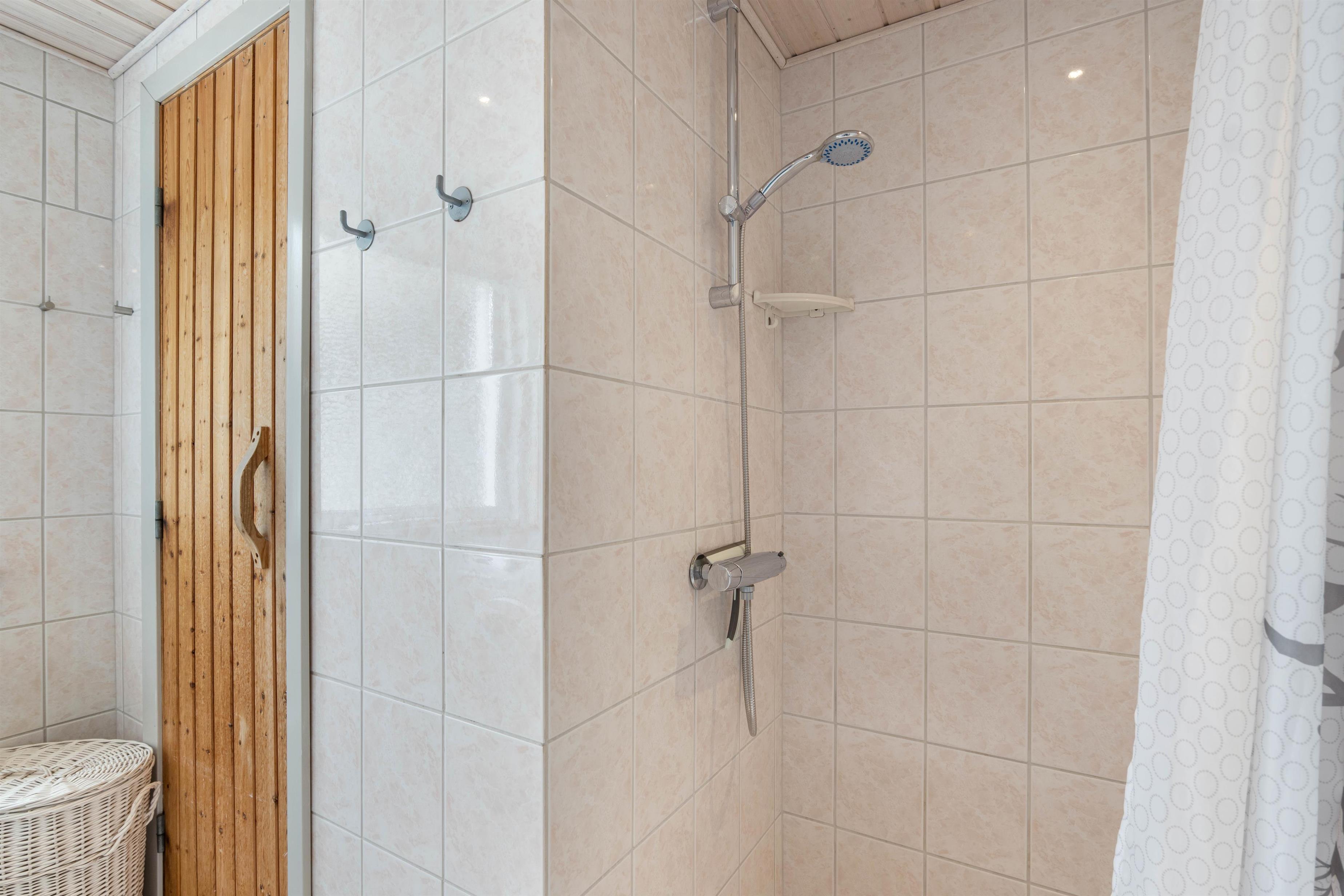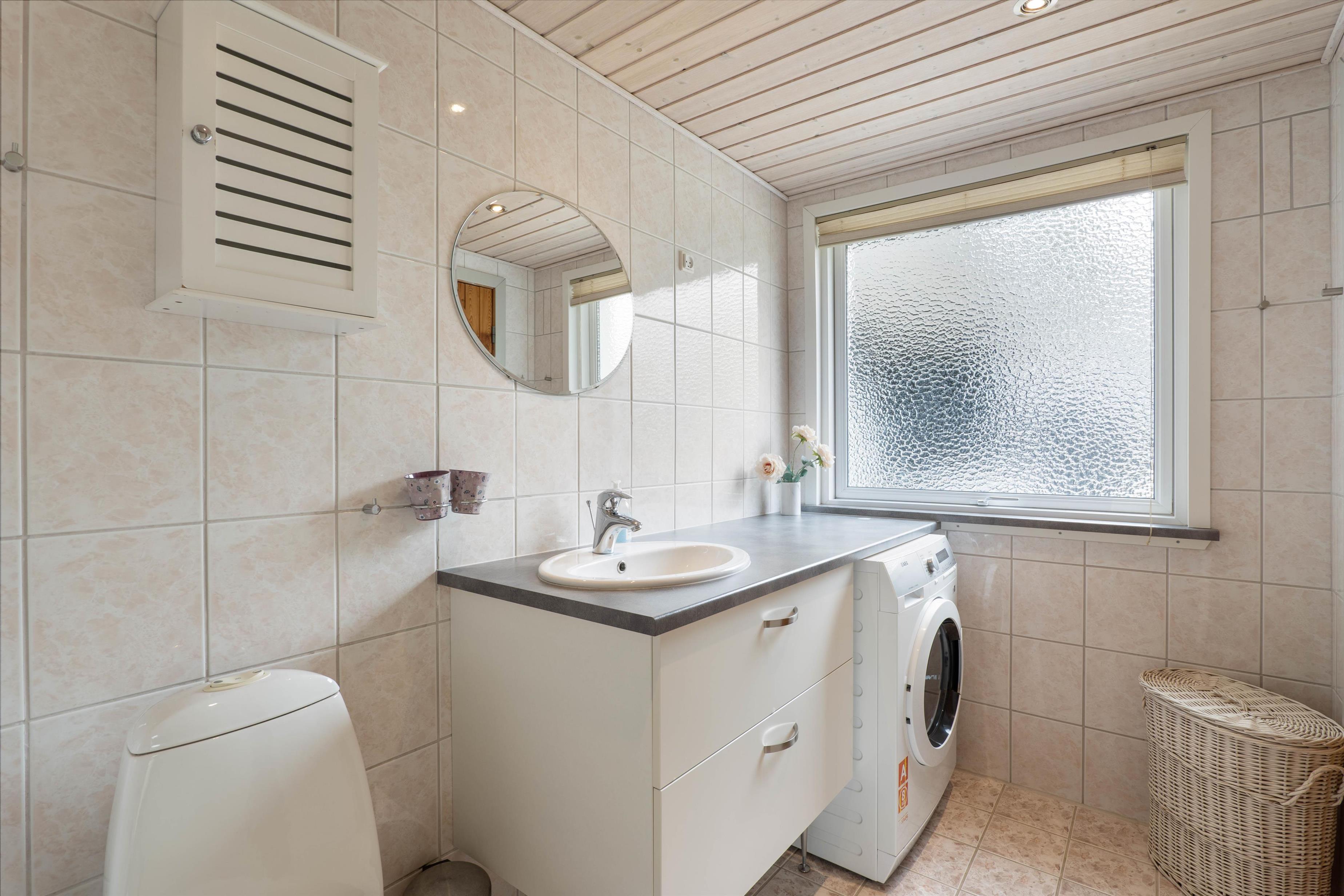 Sommerhuset har et gæstetoilet og et badeværelse med gulvvarme og en dejlig sauna. Derudover er der både vaskeamskine og tørretumbler i sommerhuset.