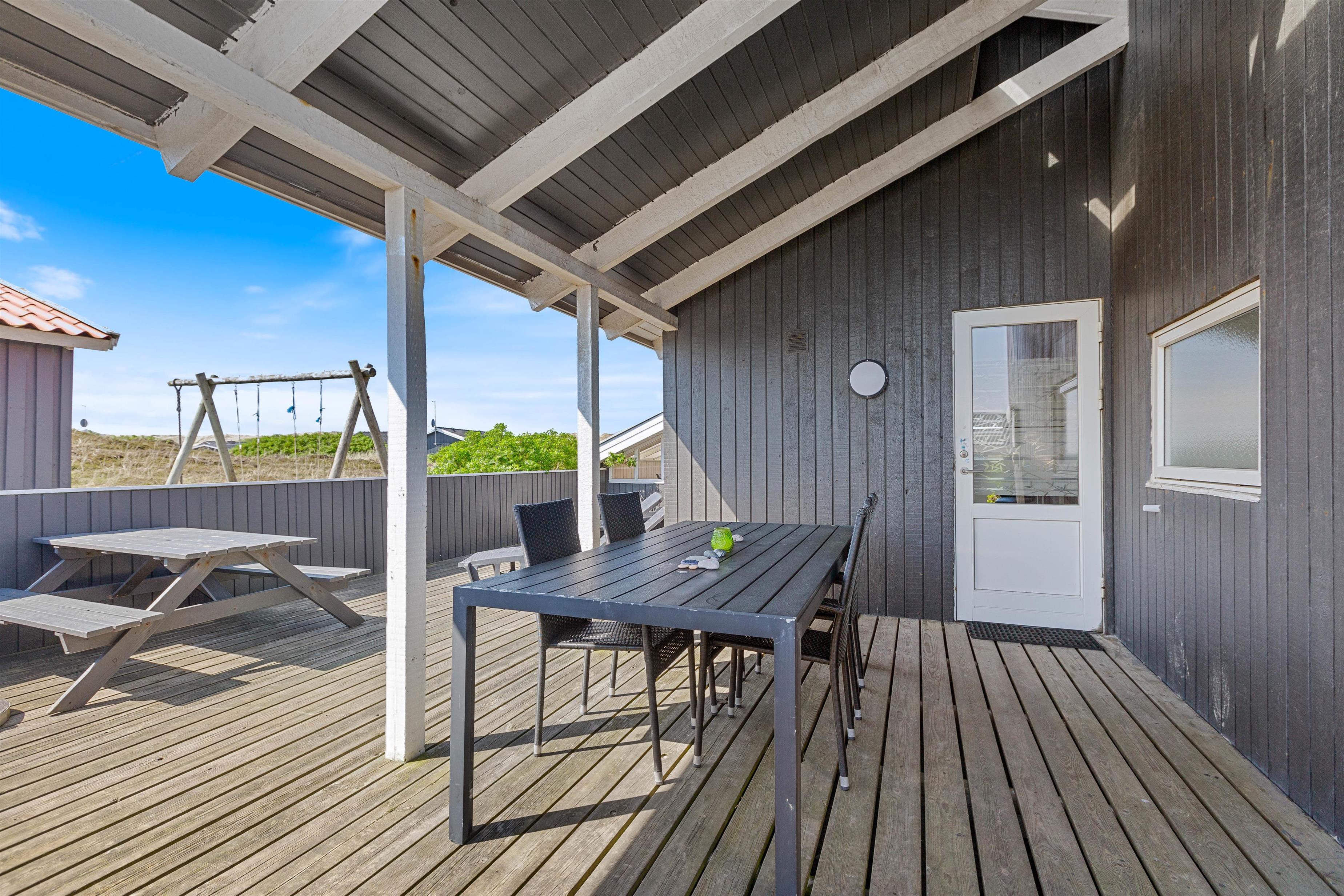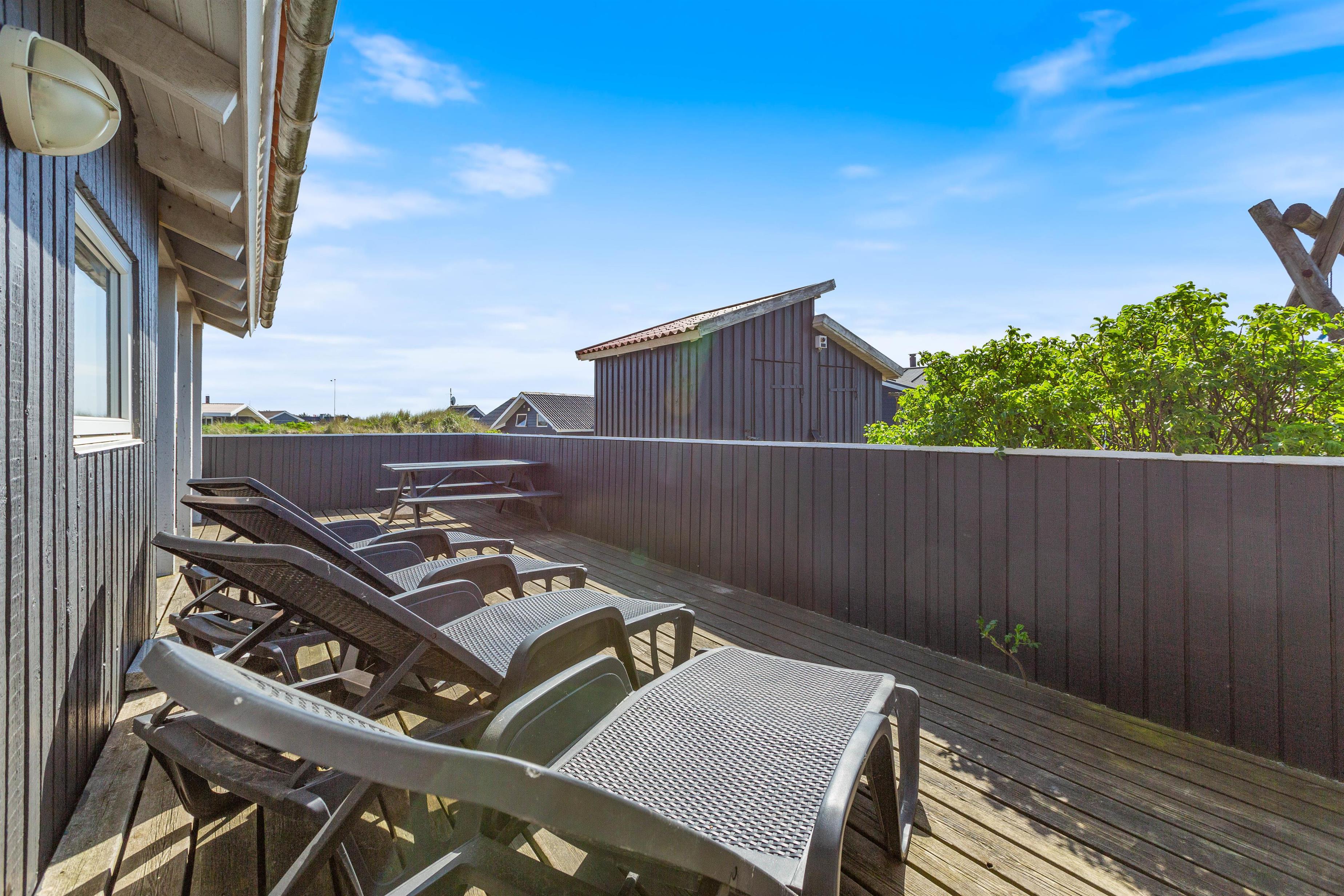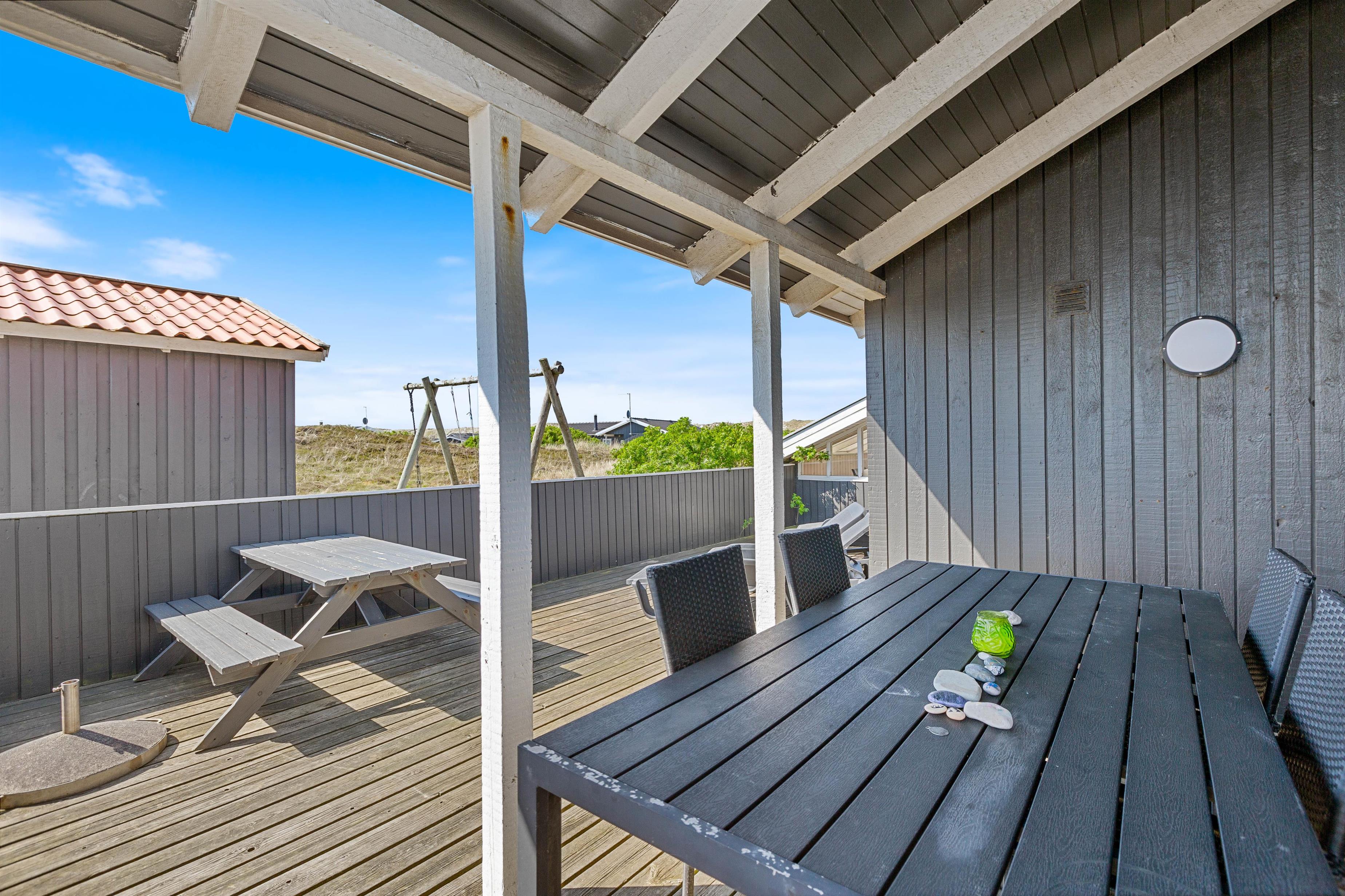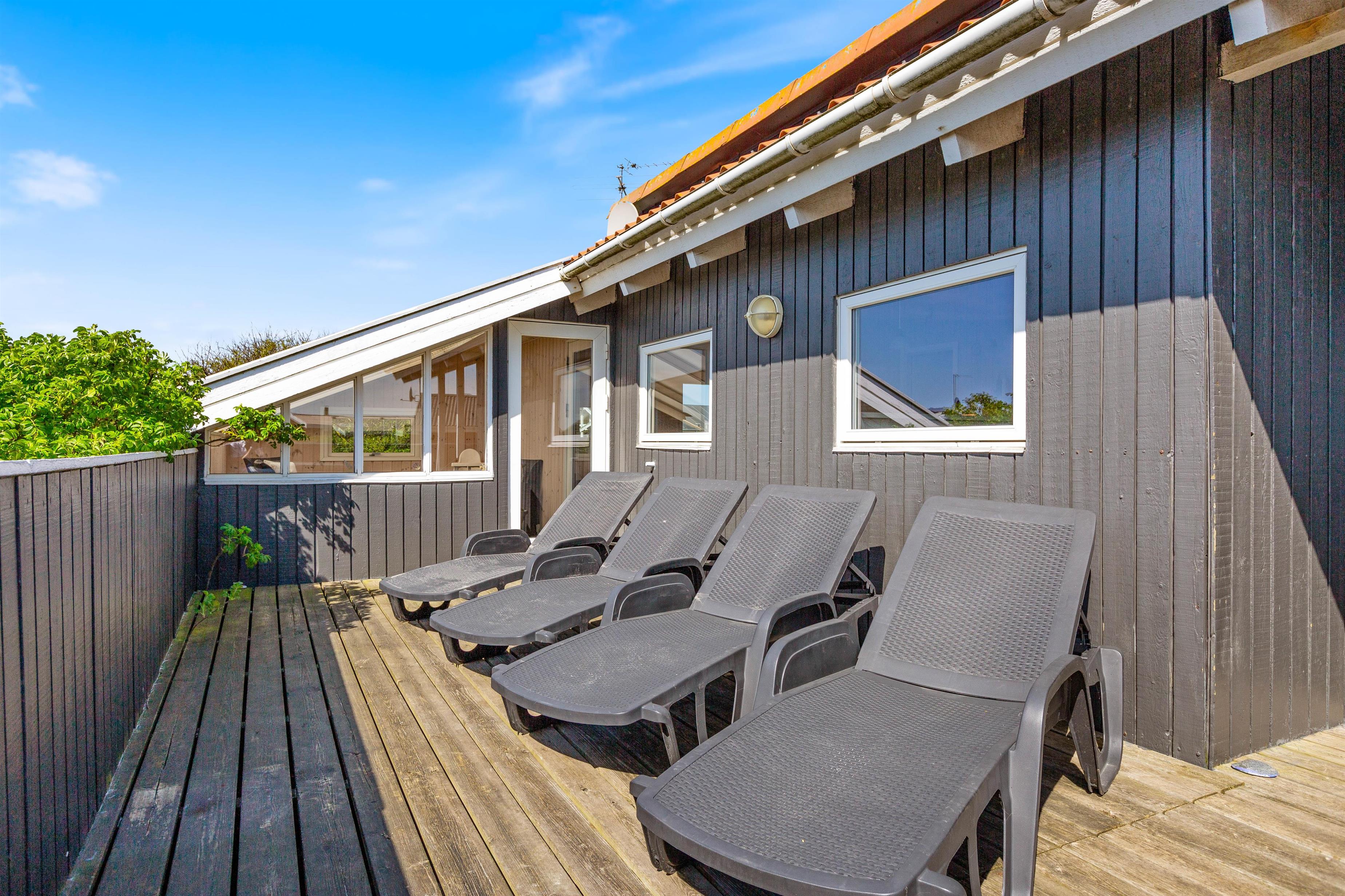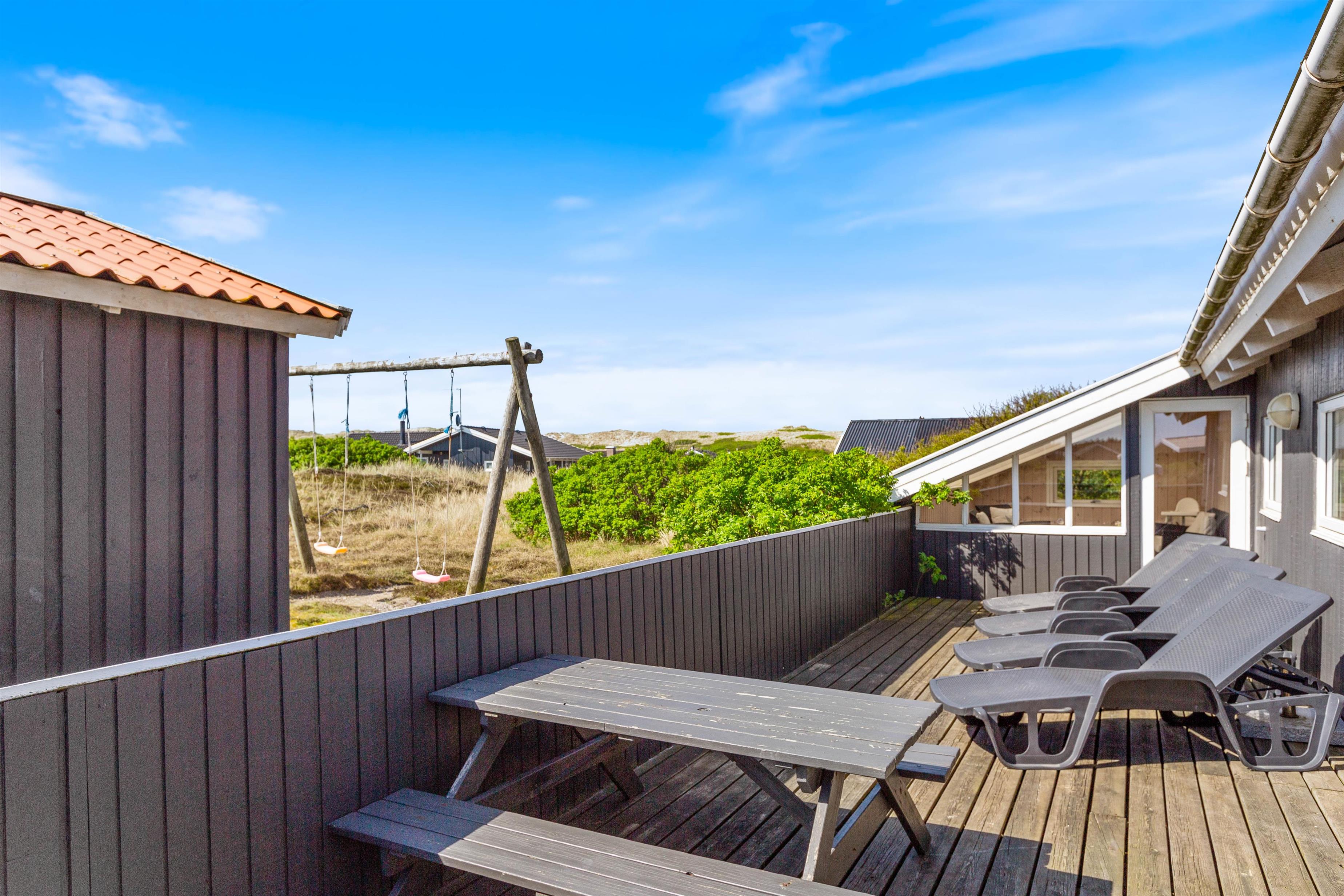 Ved feriehuset er der en sydvendt terrasse, hvor I kan nyde de gode solskinsdage og hyggelige grillaftener. Terrassen er lukket, så I roligt kan lade småbørn og hunde færdes frit.