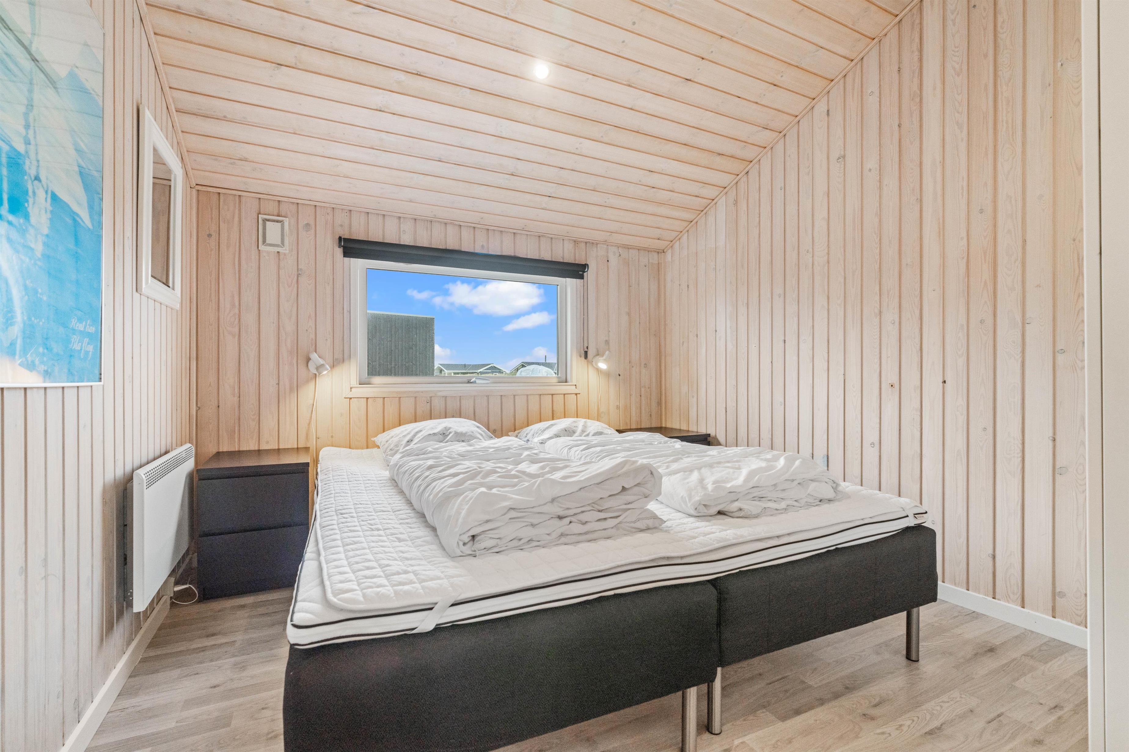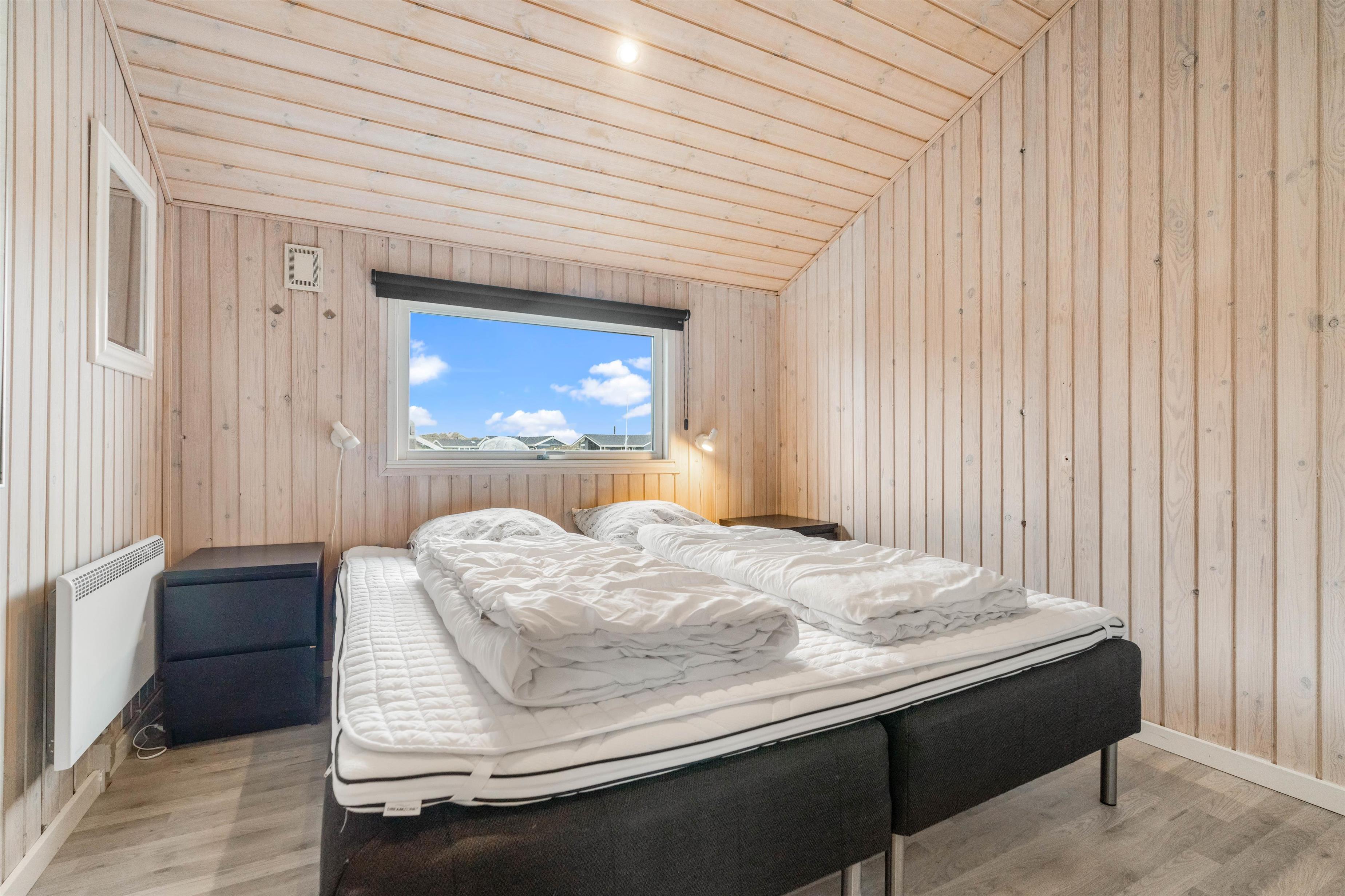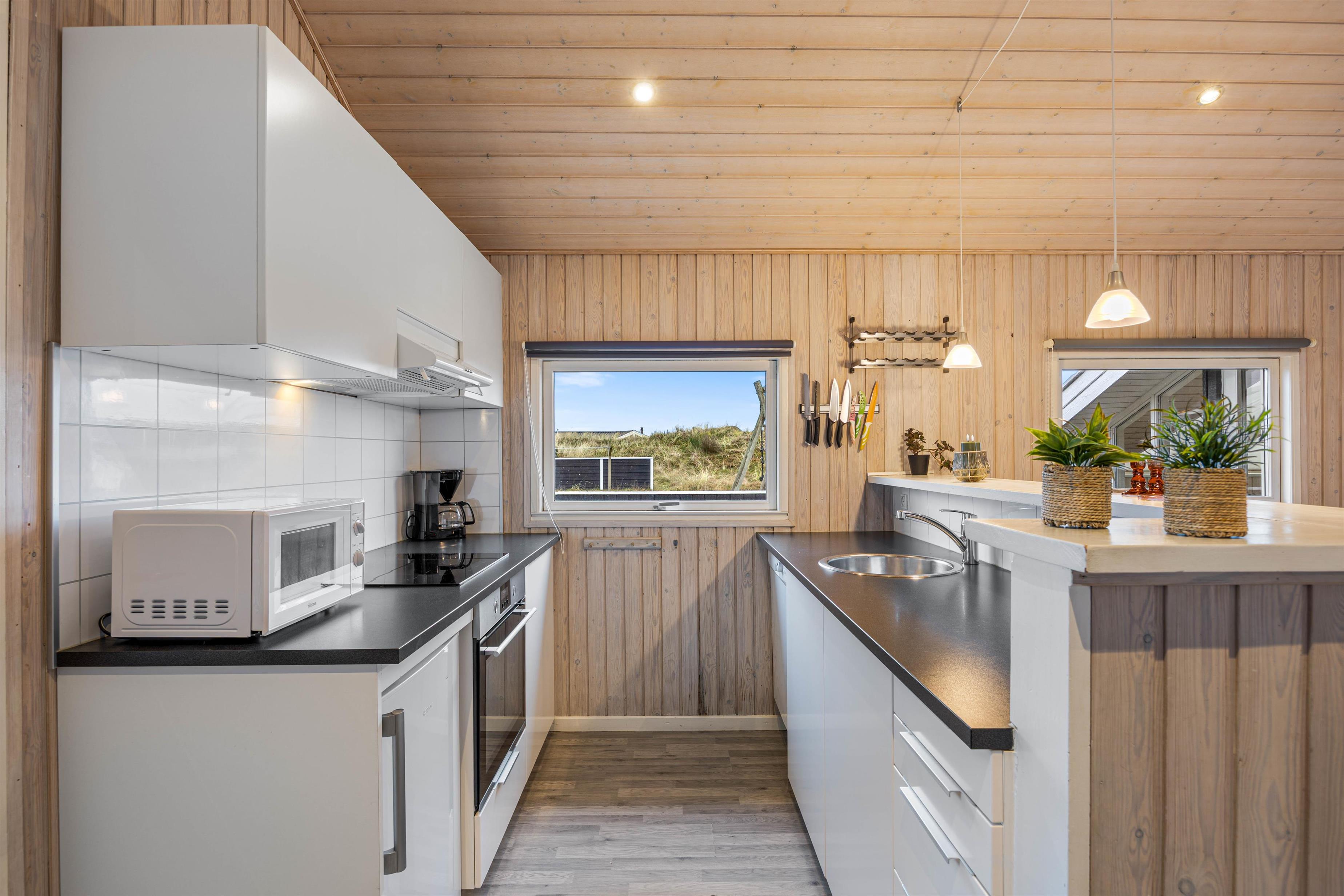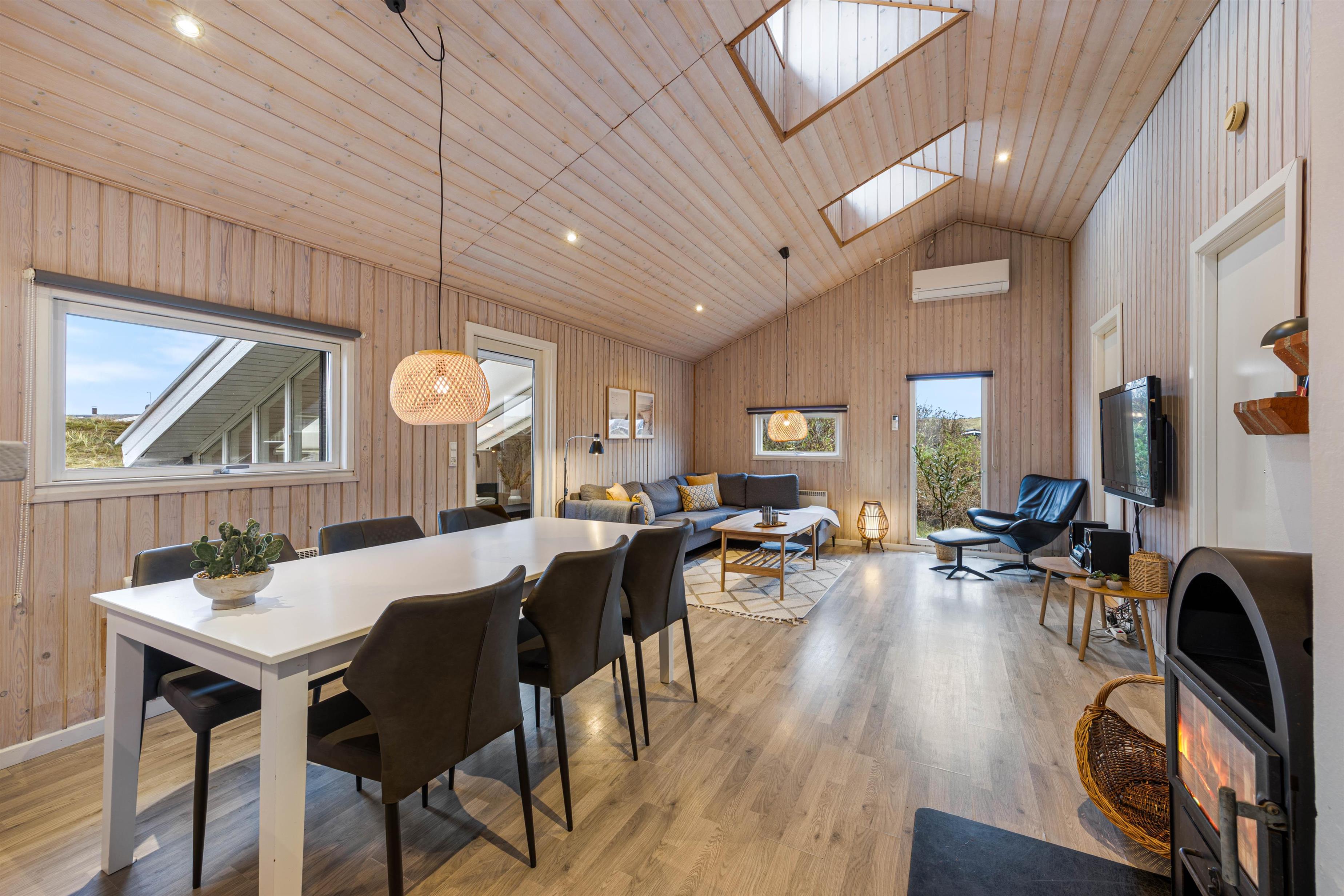 Det åbne køkken- og spisestueområde er feriehusets hjerte og indbyder til mange timers samvær og fælles madlavning. Om aftenen kan I læne jer tilbage i sofaen og hygge jer med en god film, der kan streames vha. Chromecastet. Stuens lænestol er perfekt til ferielæsningen, mens brændeovnen knitrer i baggrunden. Alrummet varmes op af en energibesparende varmepumpe.