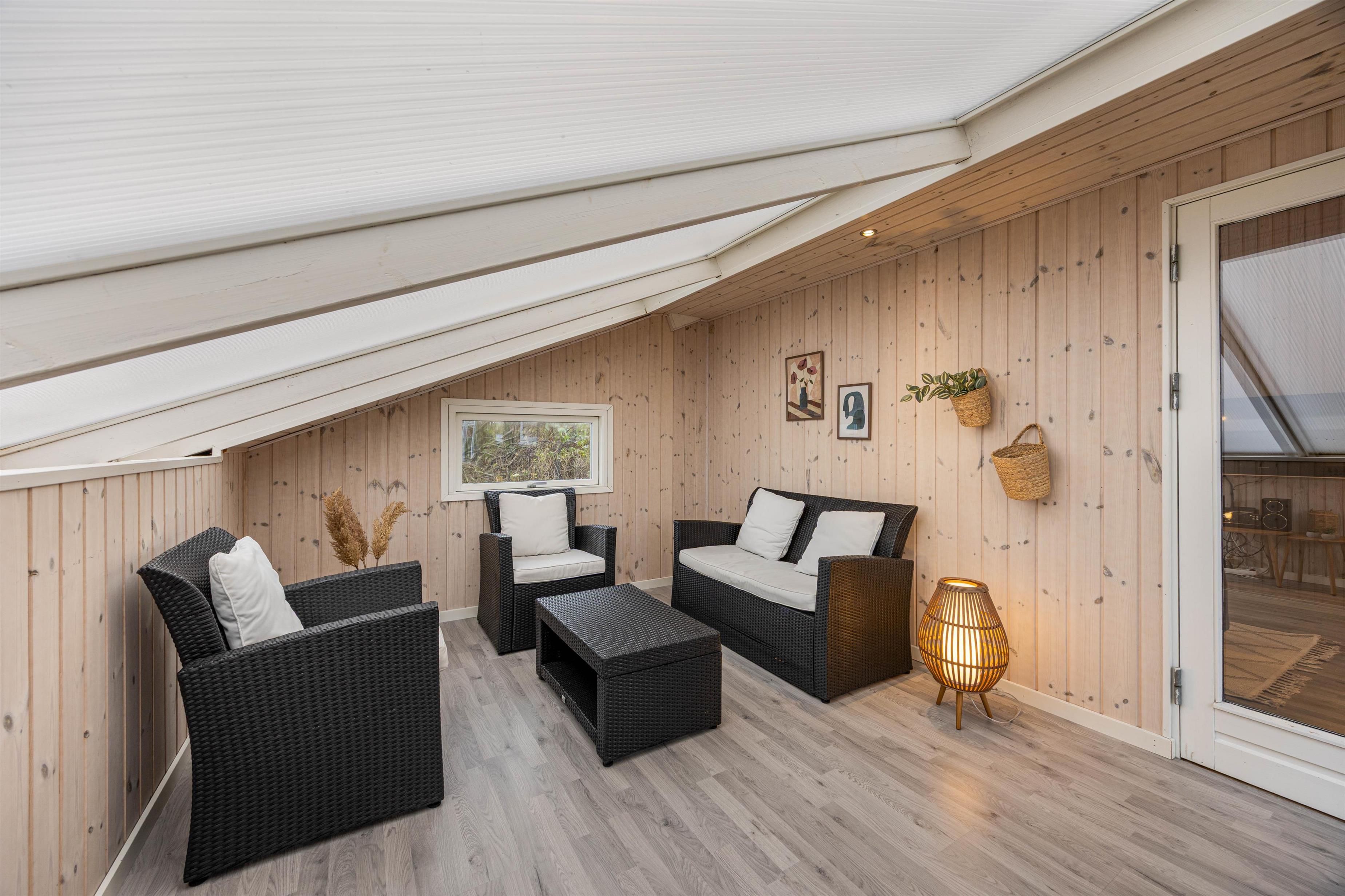 I forlængelse af terrassen er der lavet en udestue, hvis I gerne vil have lidt læ for vinden eller ly for en byge- den er også skøn til morgenkaffen i for- og efteråret.