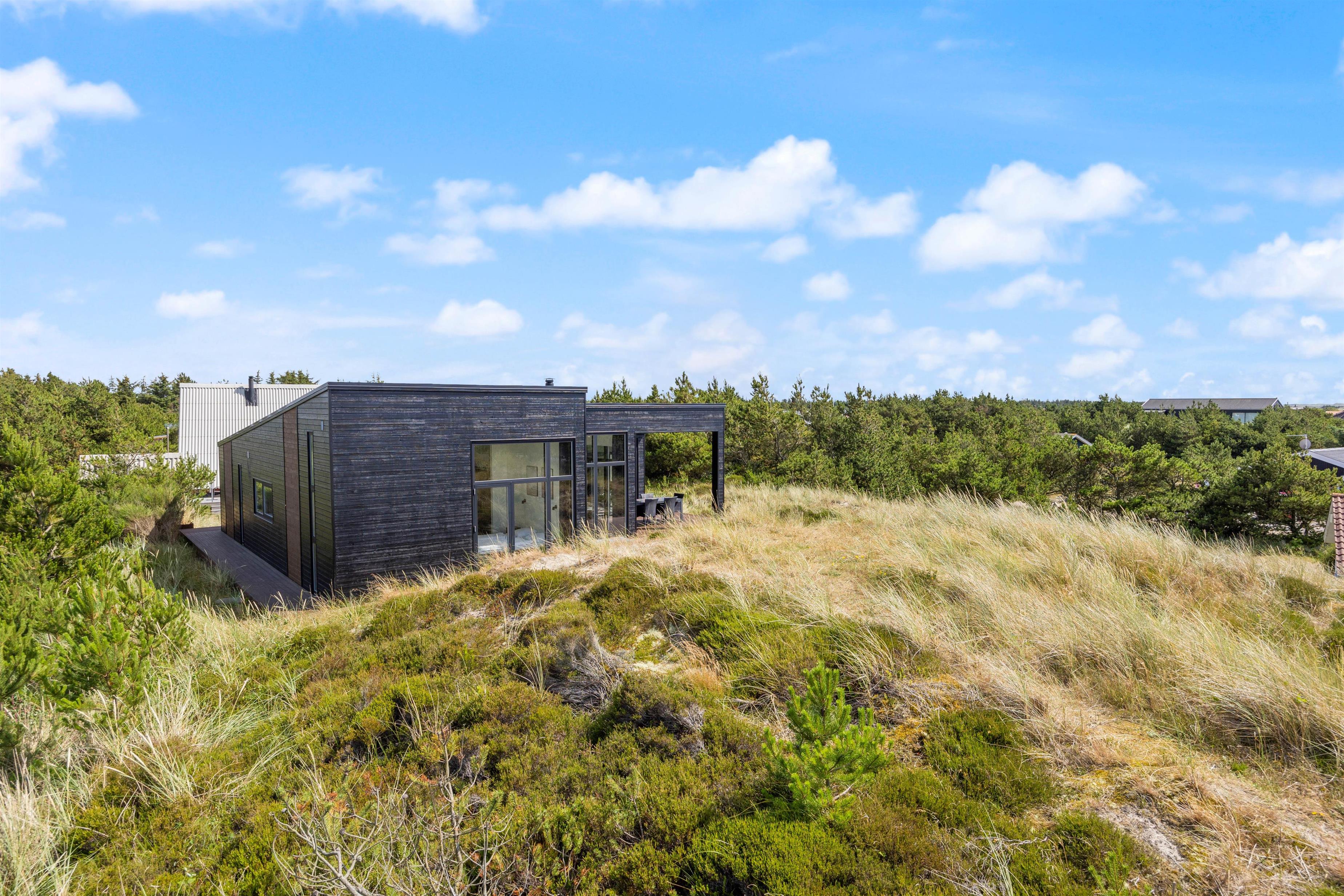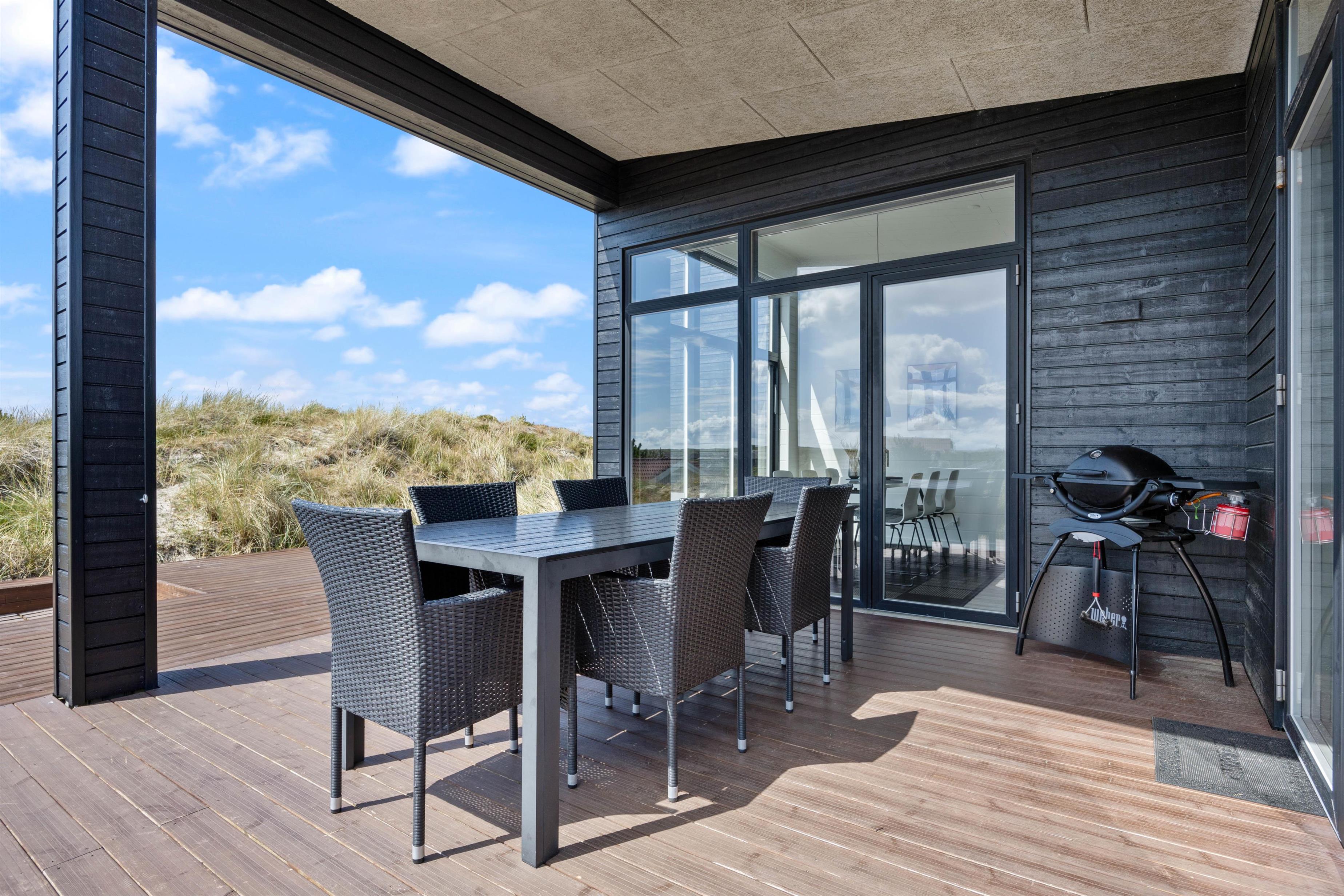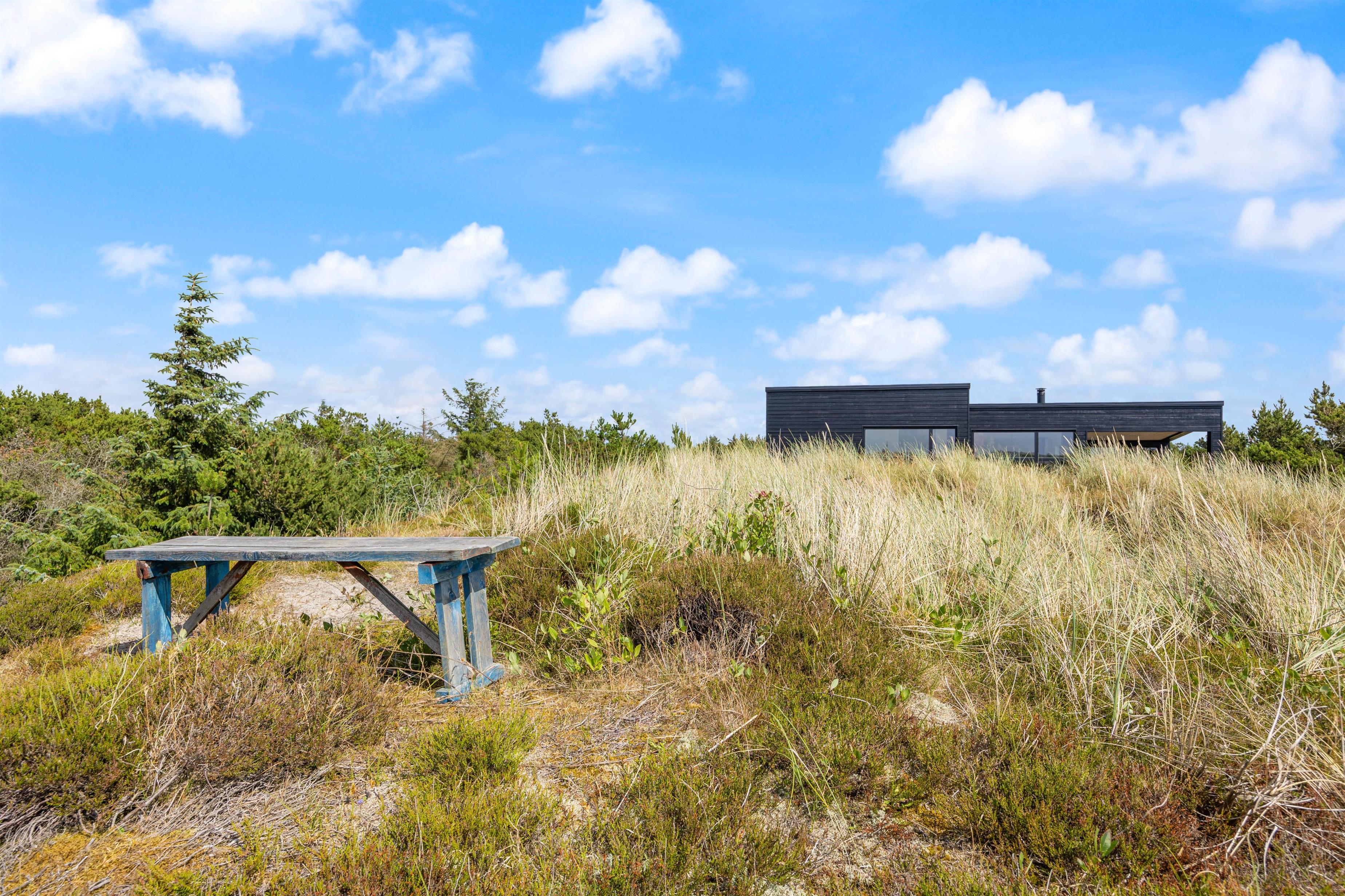 Feriehuset på Bjerregårdsvej 171 ligger forhøjet på en klitgrund, så du har en helt fantastisk panoramaudsigt over klitlandskabet og ferieområdet. Udenfor indbyder den skønne og delvist overdækkede terrasse til solbadning og lange grillaftener. Det er også her, du finder den bedste plads til at nyde de smukke solnedgange.