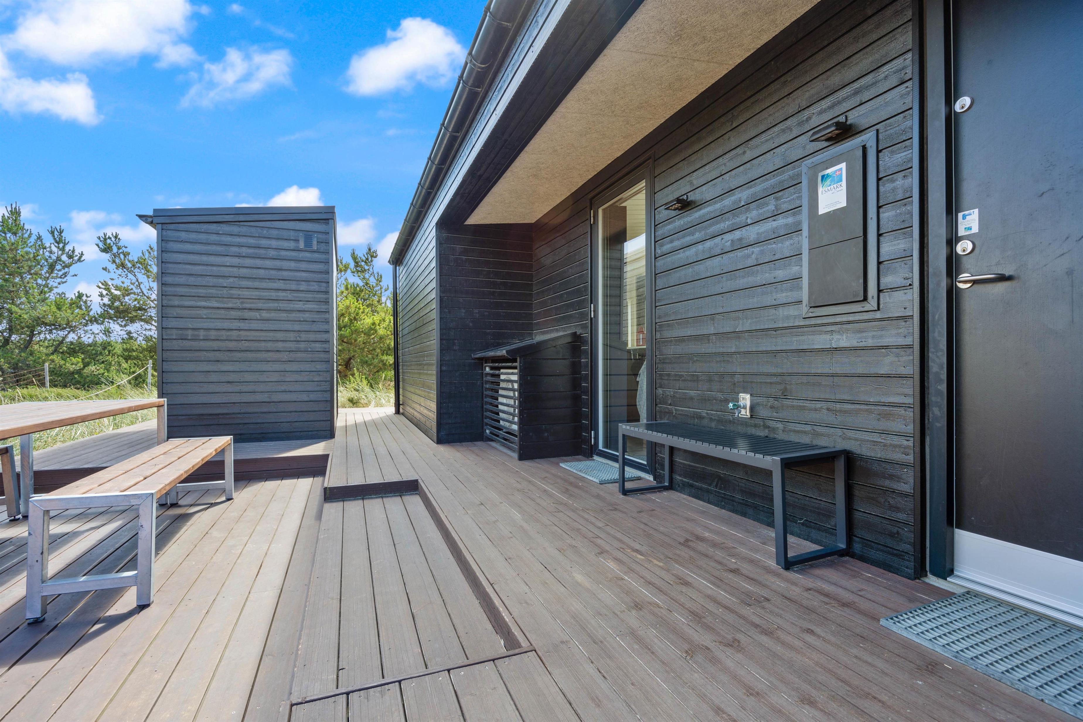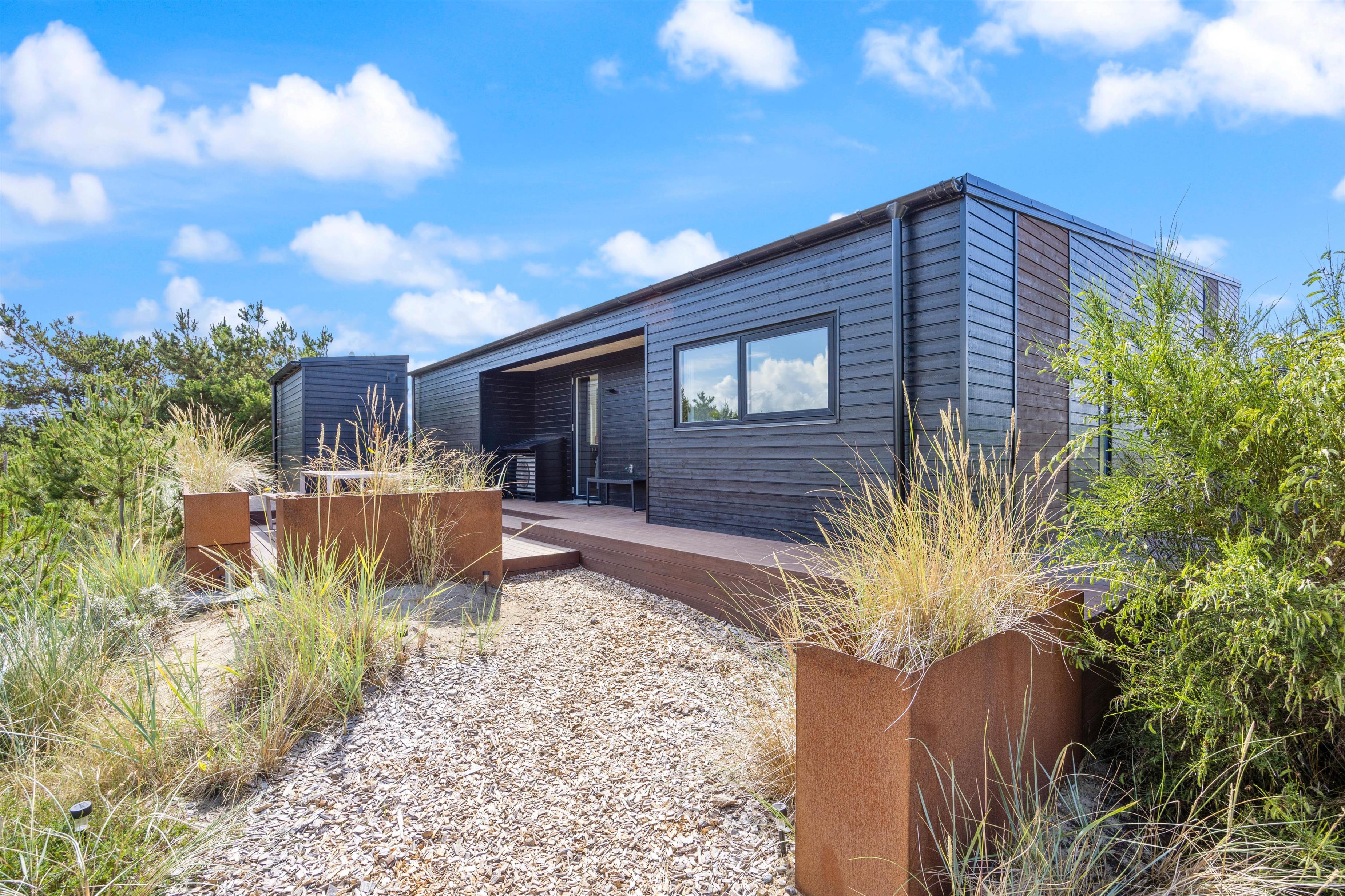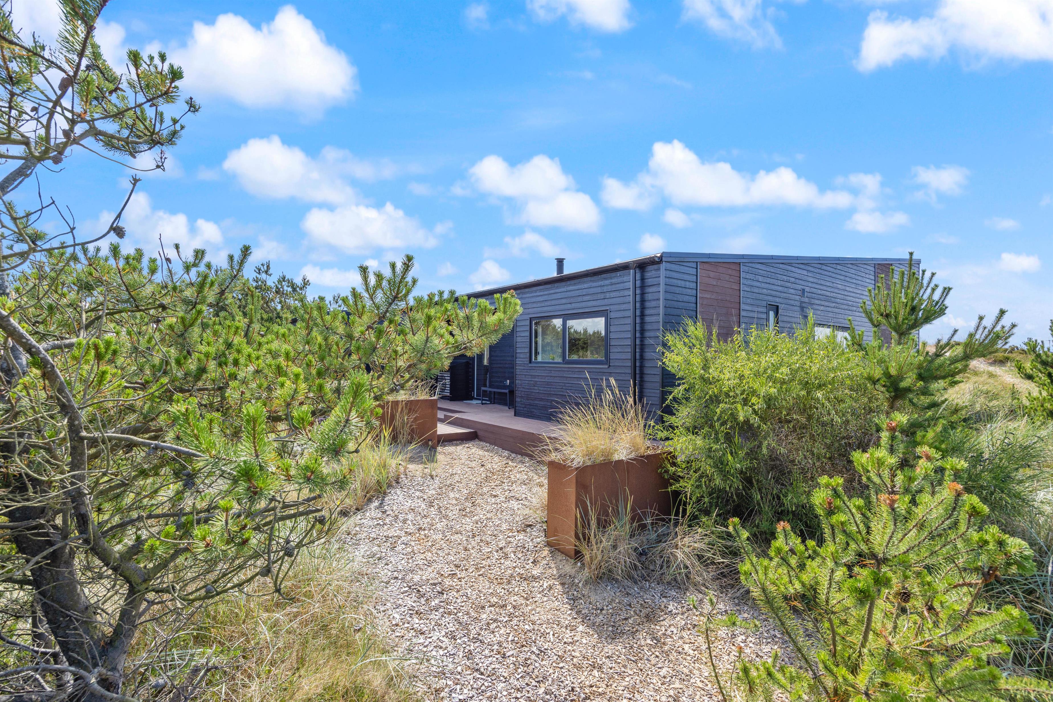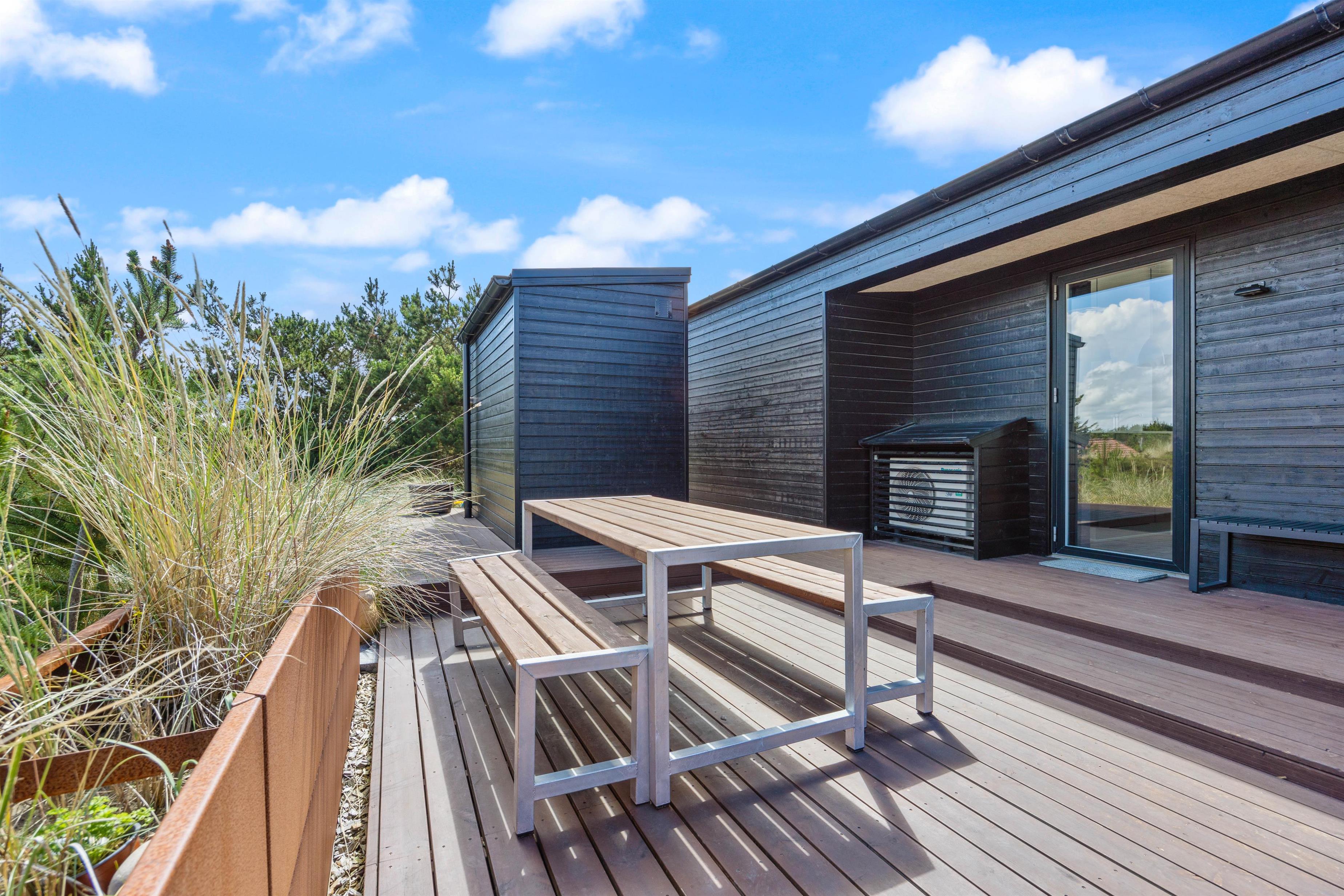 Feriehuset på Bjerregårdsvej 171 ligger forhøjet på en klitgrund, så du har en helt fantastisk panoramaudsigt over klitlandskabet og ferieområdet. Udenfor indbyder den skønne og delvist overdækkede terrasse til solbadning og lange grillaftener. Det er også her, du finder den bedste plads til at nyde de smukke solnedgange.