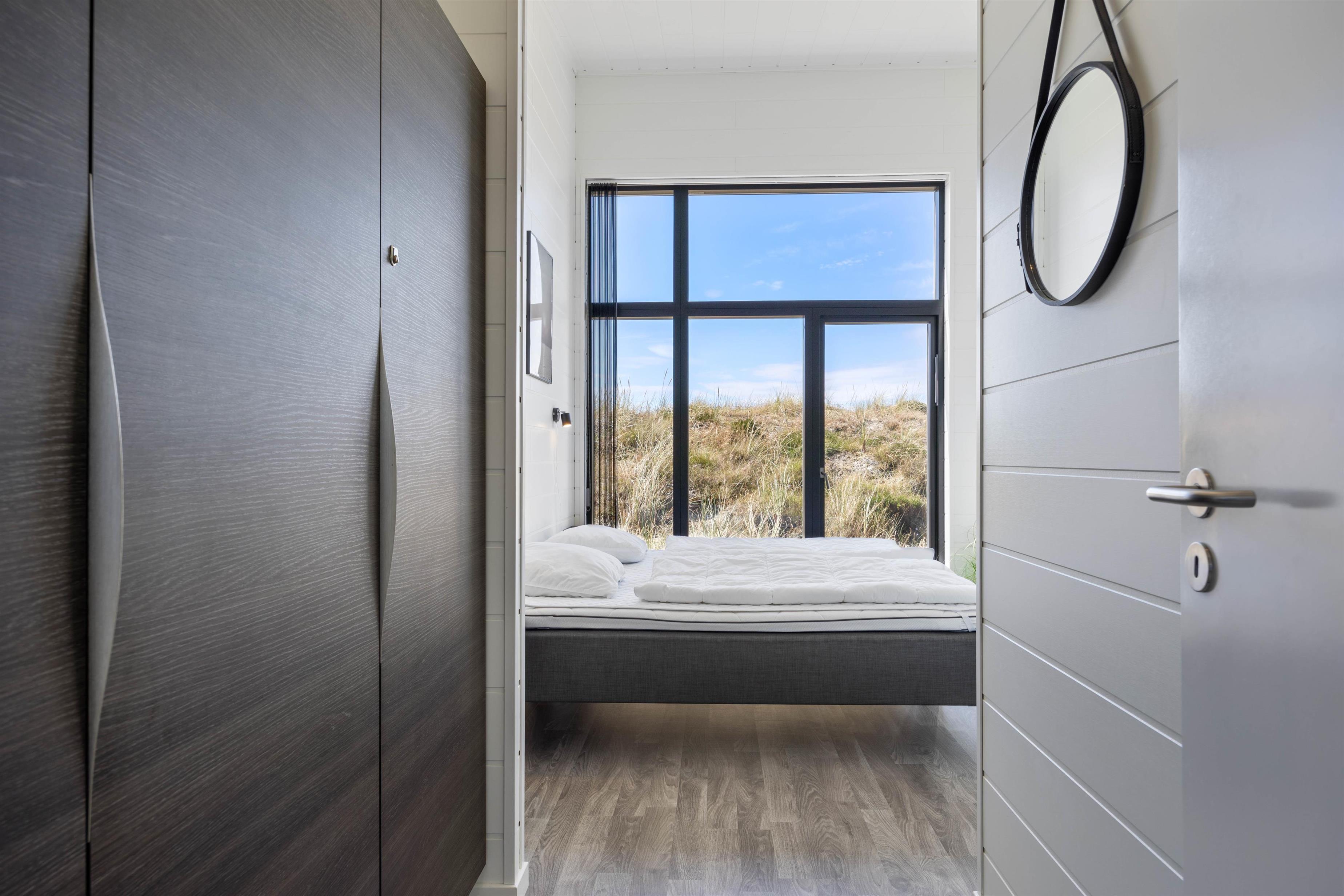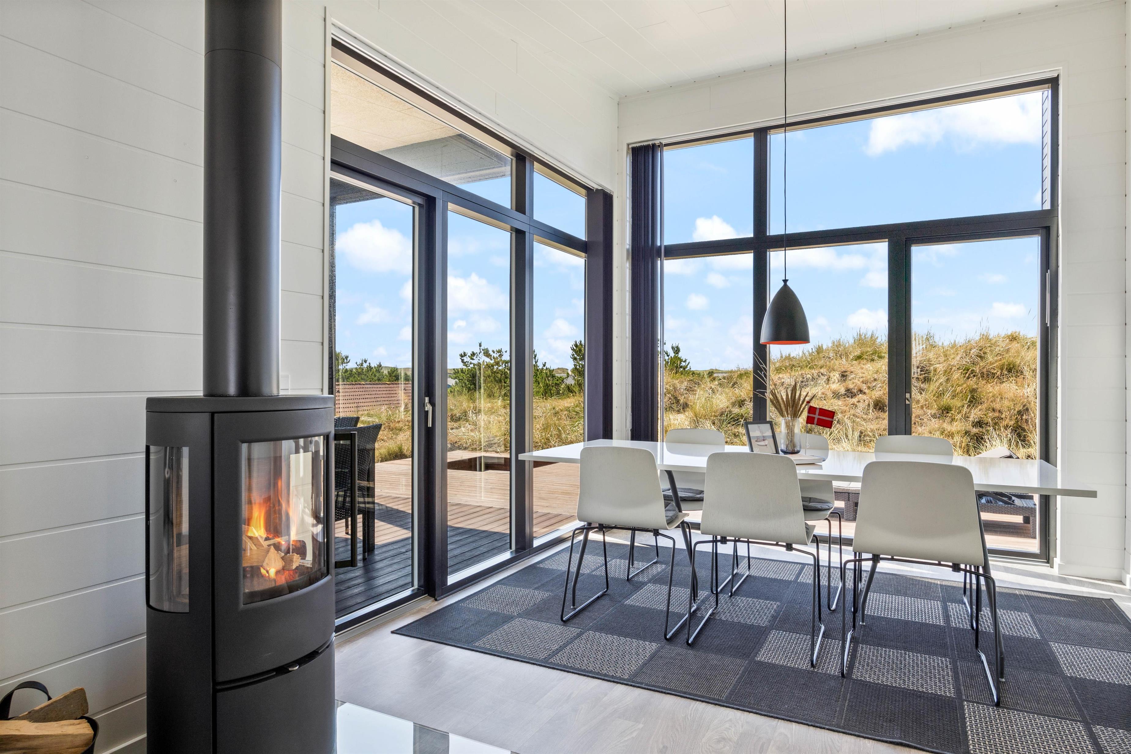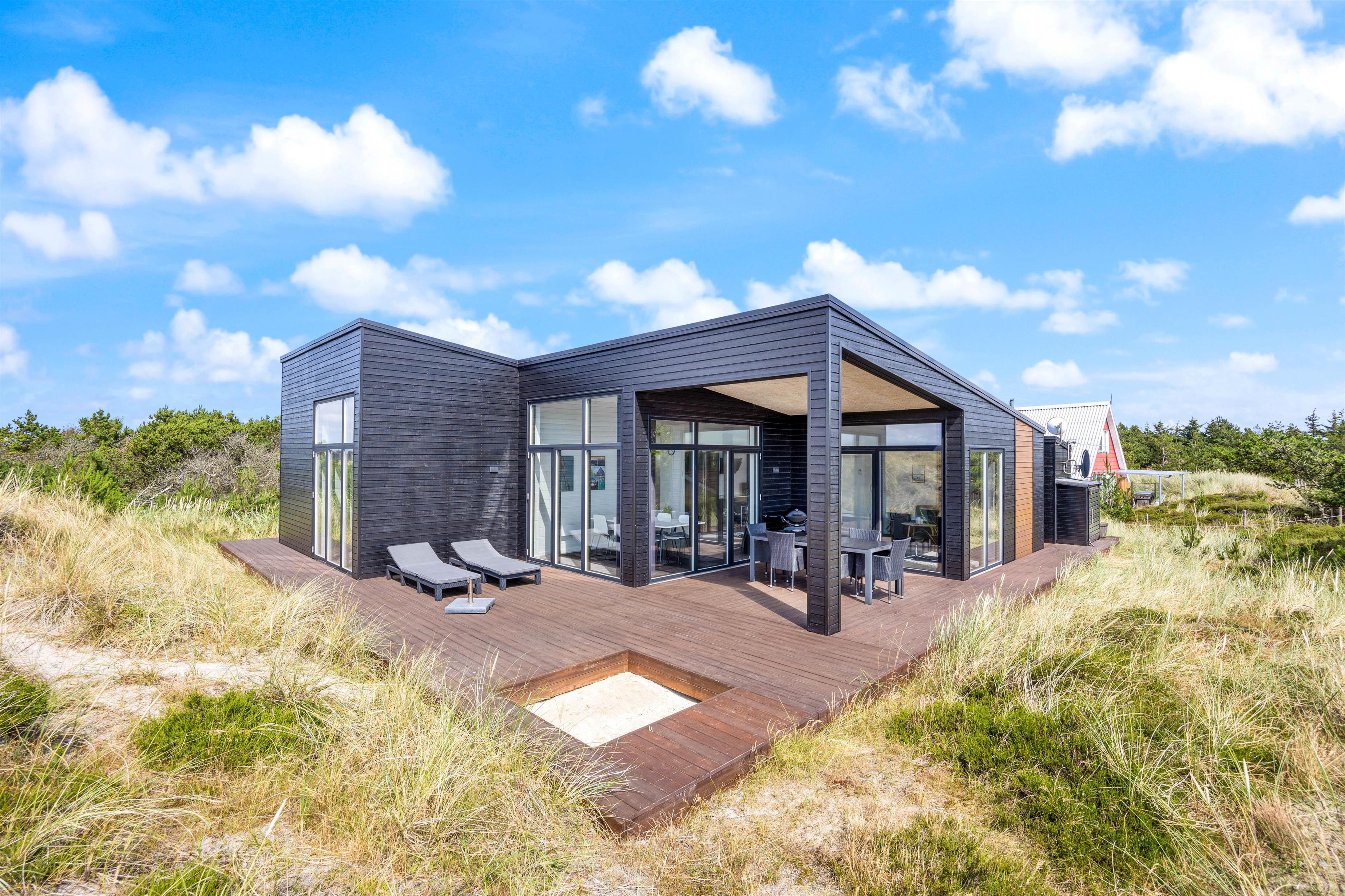 I det store lyse opholdsrum er der indsat store vinduespartier, så den flotte udsigt over ferieområdet kan nydes. Der er også en stor spiseafdeling, 3 gode, lyse soverum med dobbeltsenge, og to badeværelser, så der er fin plads til 6 personer. Og trænger du til lidt ekstra selvforkælelse, kan du nyde et par stunder i saunaen og spaen efter en lang gåtur ved det brusende Vesterhav.
