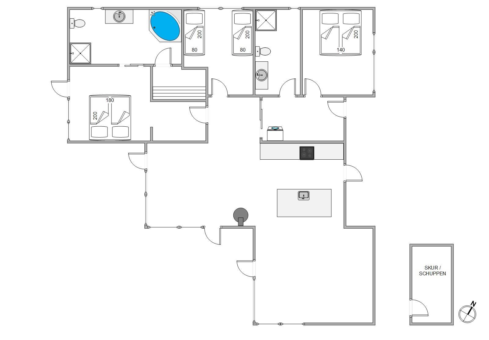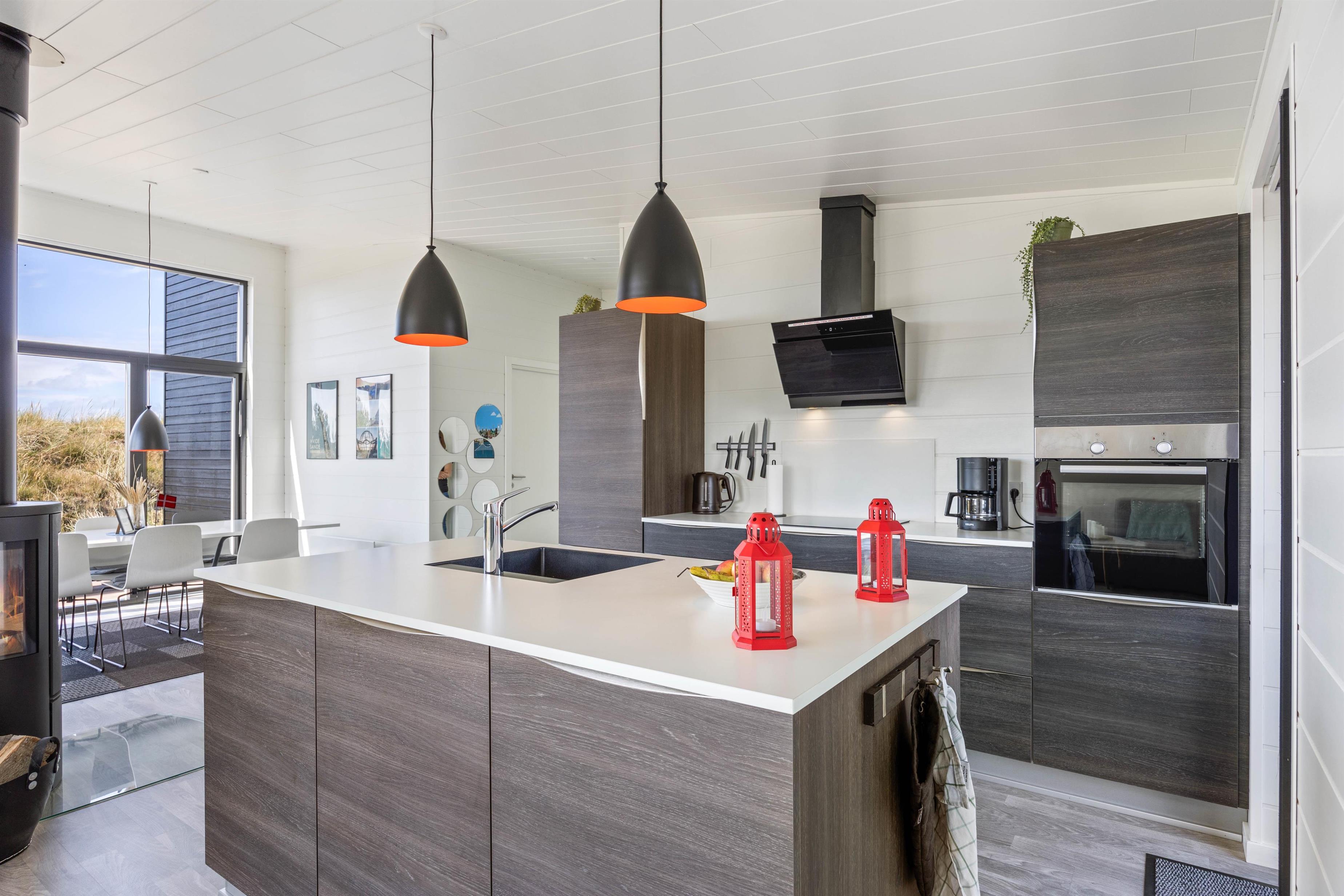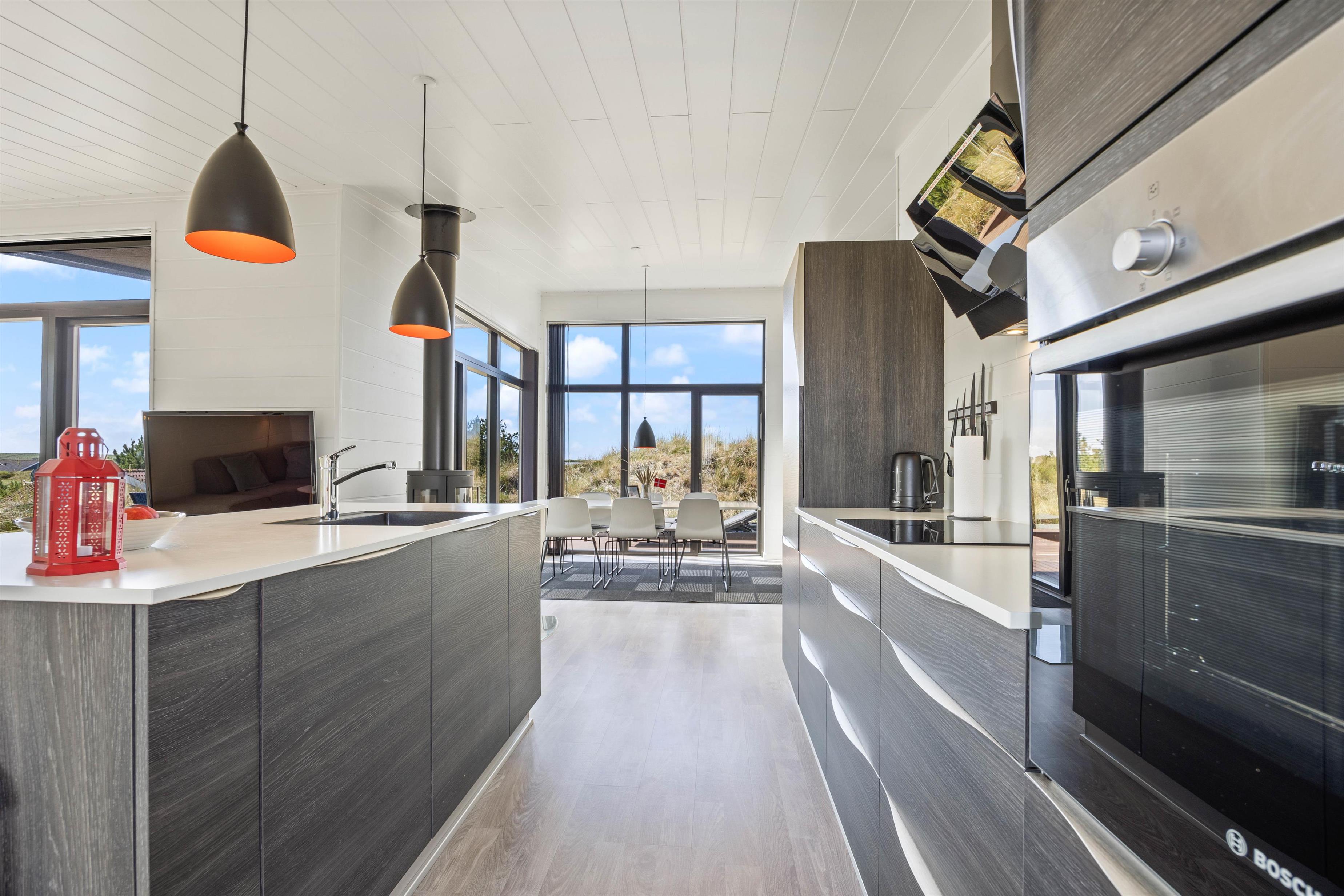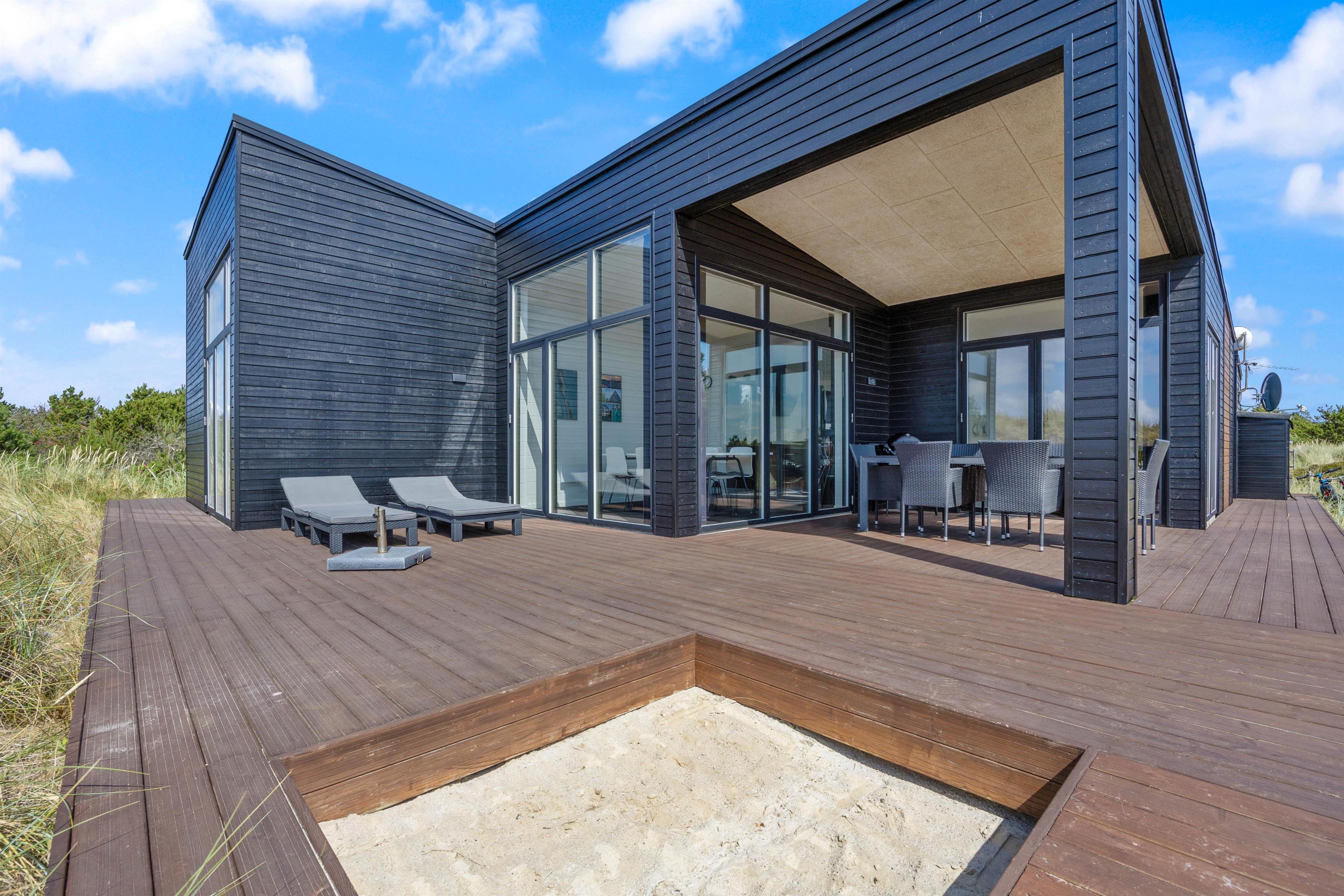 I det store lyse opholdsrum er der indsat store vinduespartier, så den flotte udsigt over ferieområdet kan nydes. Der er også en stor spiseafdeling, 3 gode, lyse soverum med dobbeltsenge, og to badeværelser, så der er fin plads til 6 personer. Og trænger du til lidt ekstra selvforkælelse, kan du nyde et par stunder i saunaen og spaen efter en lang gåtur ved det brusende Vesterhav.