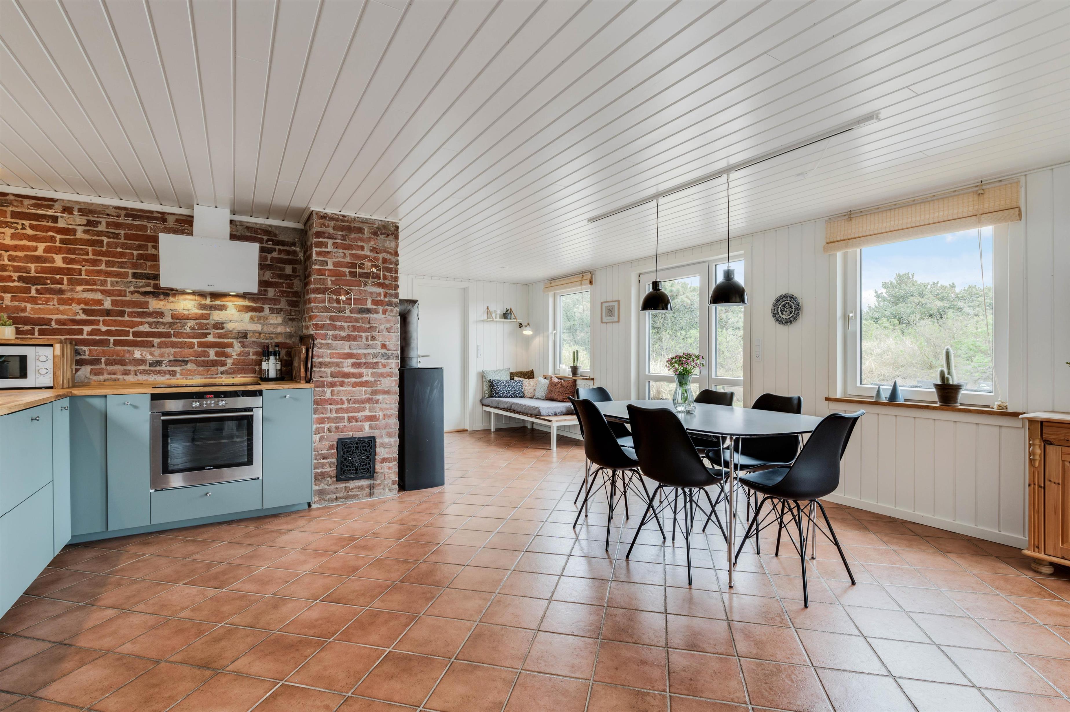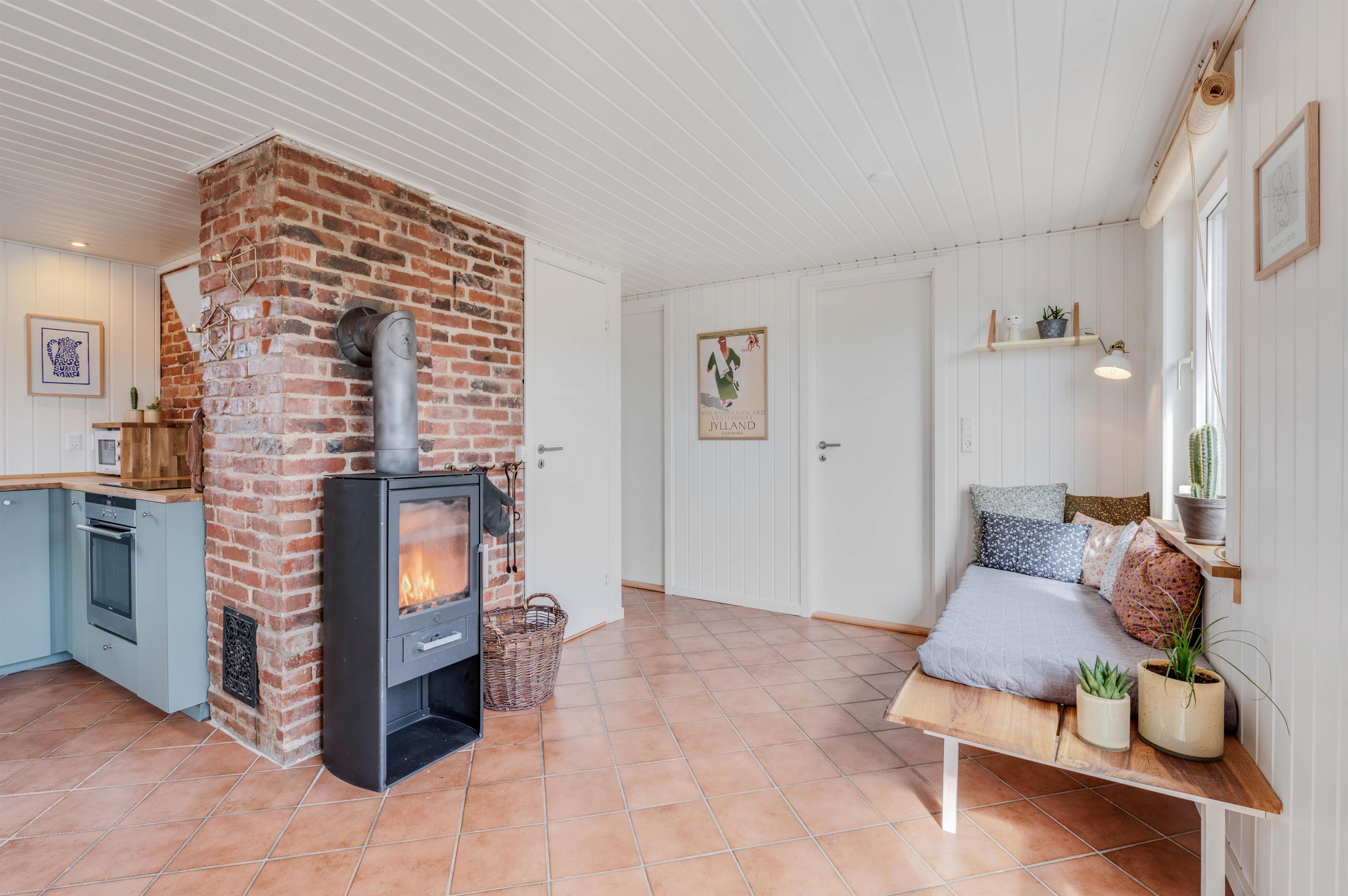 I det komfortabelt og moderne indrettede sommerhus ligger køkkenet i åben forbindelse med stuen, hvor hele familien kan samles om brændeovnen til en hyggelig aften. Her er også plads til at læse en god bog eller spille et spil med resten af familien.