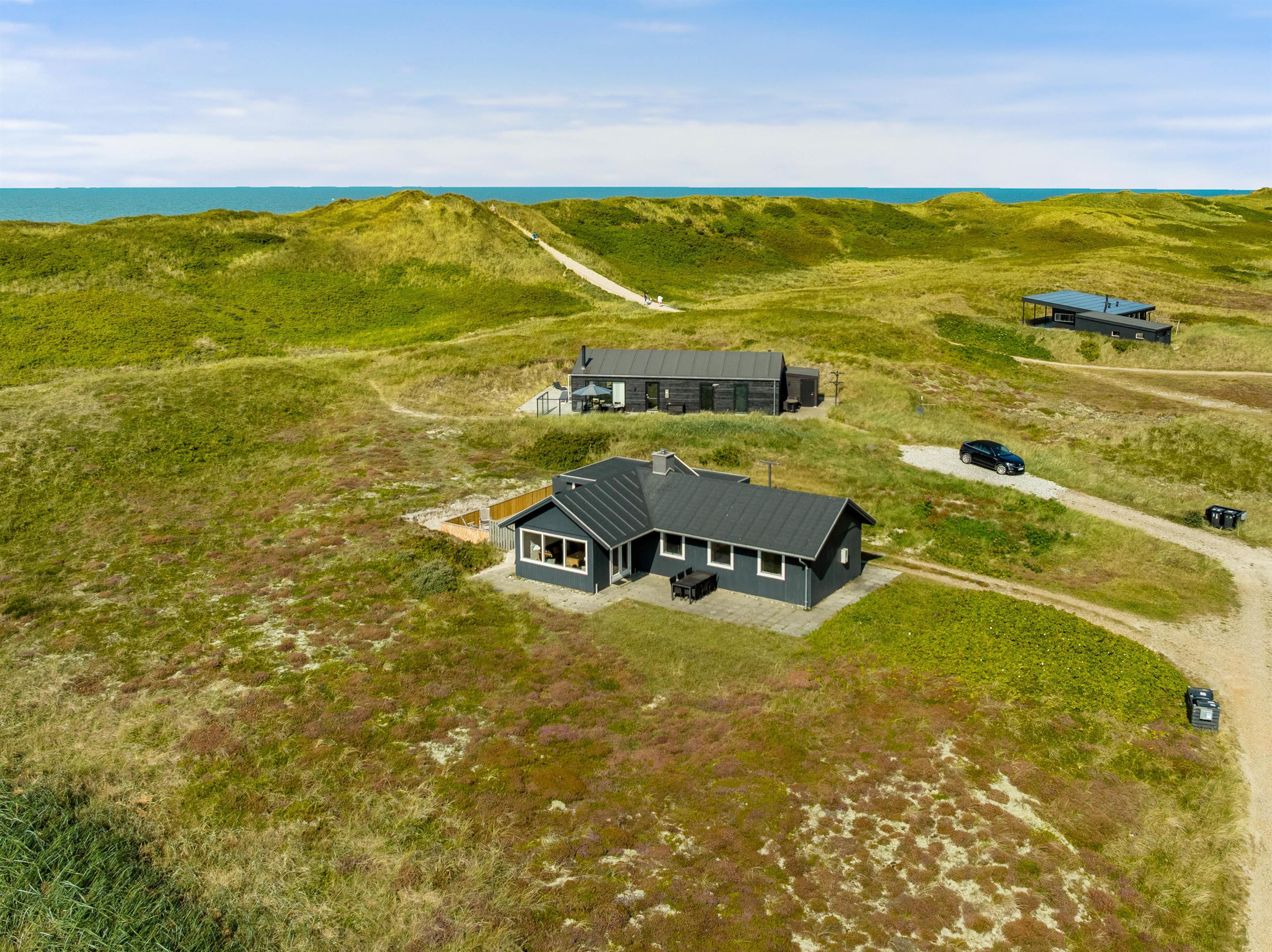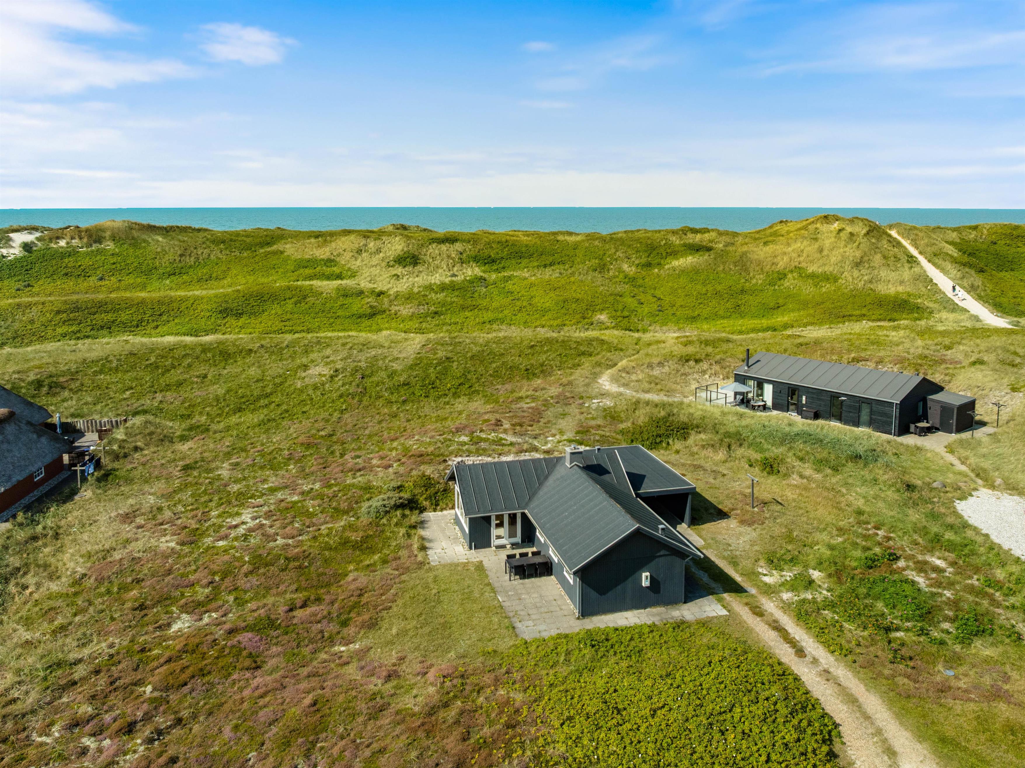 På feriehusets delvist afskærmede terrasse kan du finde en rolig plet til afslapning med en bog eller en kølig drink. Her er havemøbler, solvogne og parasol, så skulle I få lyst til en grillaften i den nedgående sol, er det også en oplagt mulighed. På den 1.750 kvadratmeter store naturgrund kan I udforske Vestkystens særegne plante- og dyreliv, og slappe helt af.