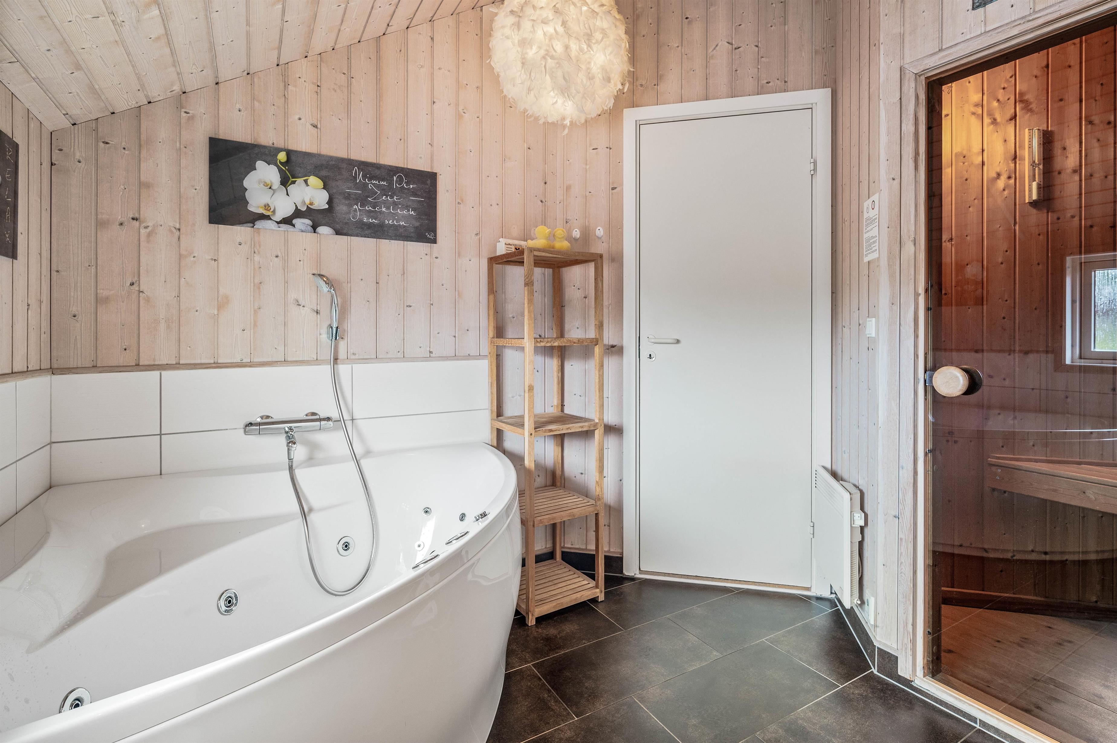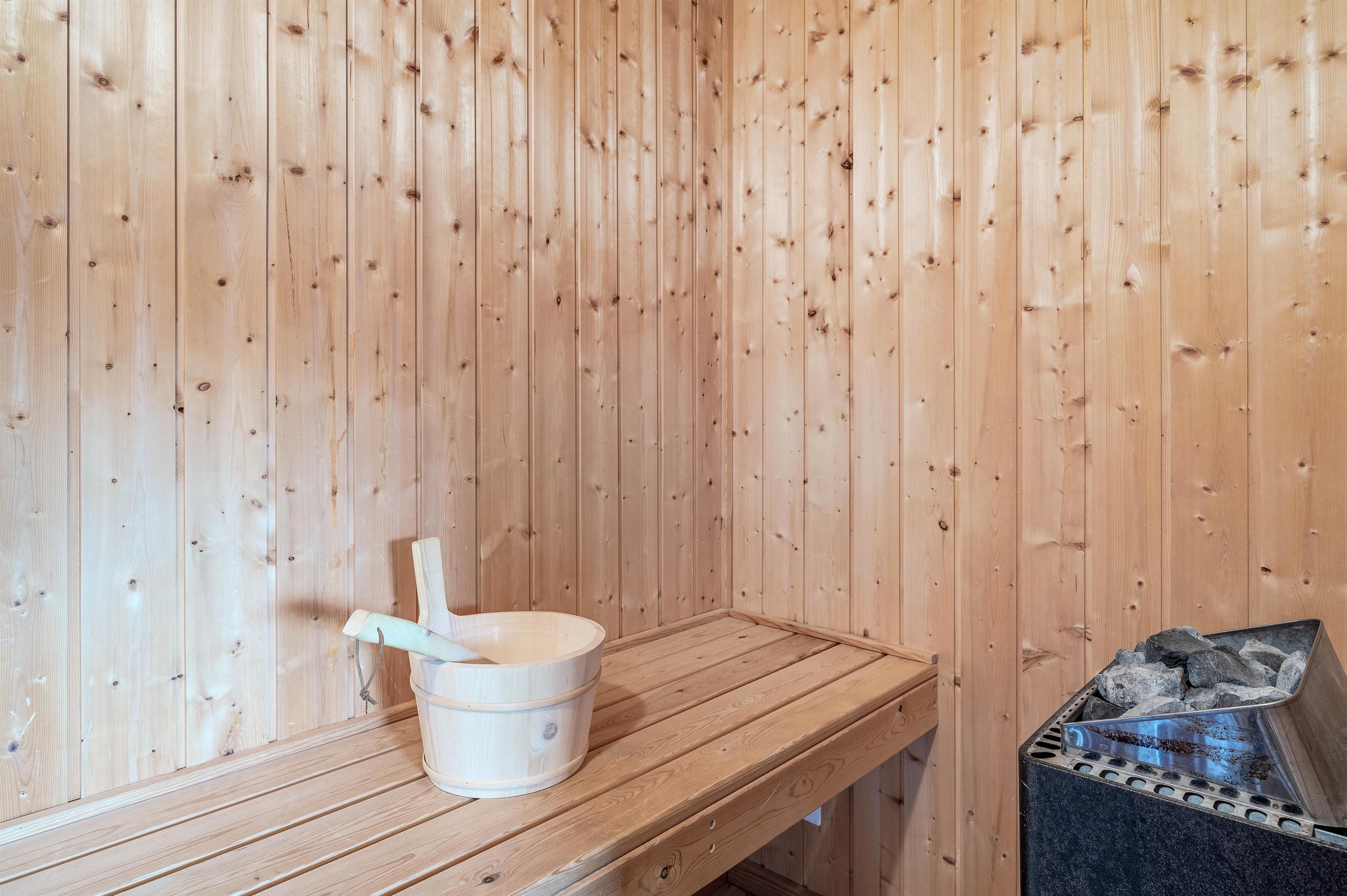 På det ene af de to badeværelser er der både spabad og sauna, som indbyder til et par afslappende stunder – måske efter en frisk tur ved stranden.