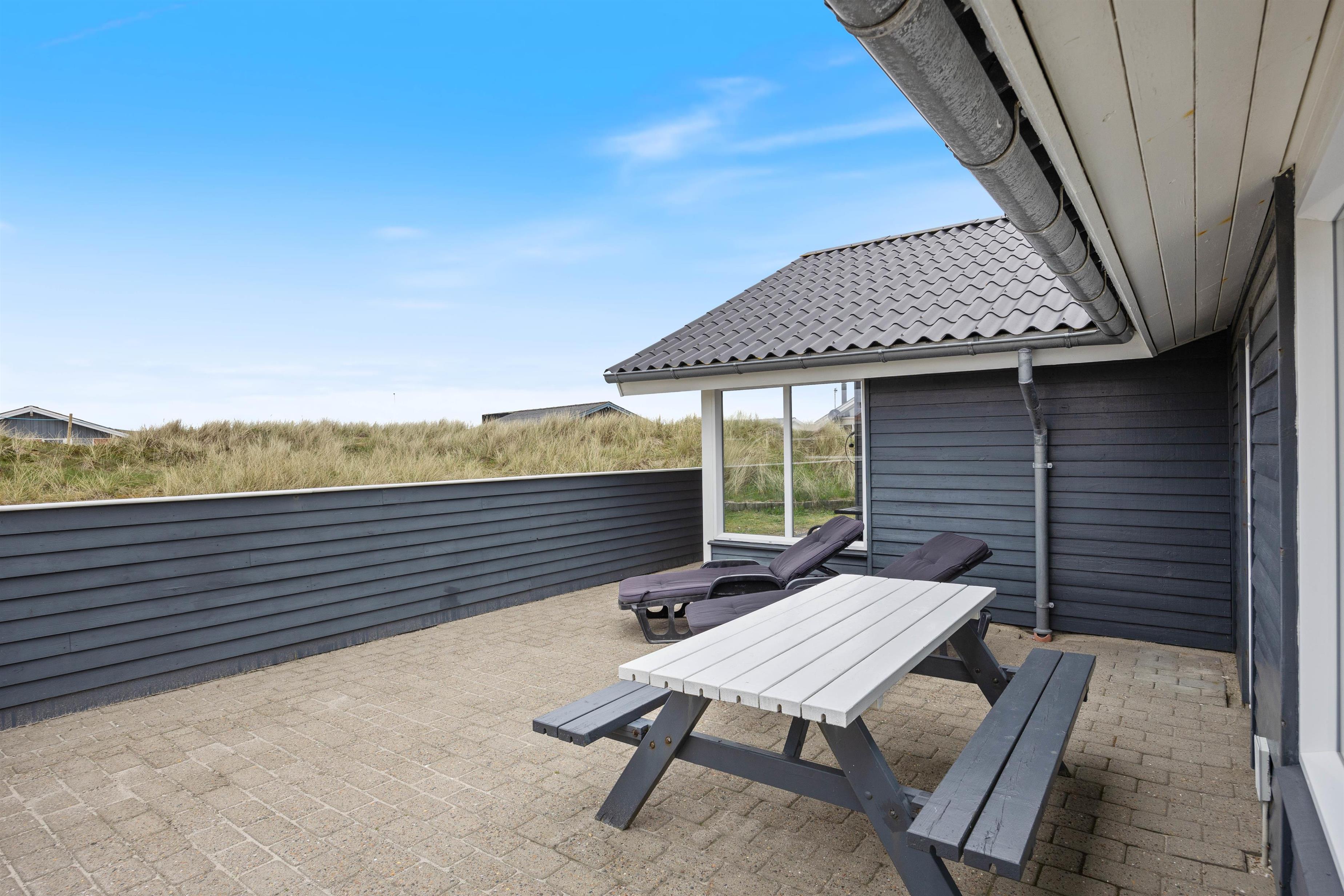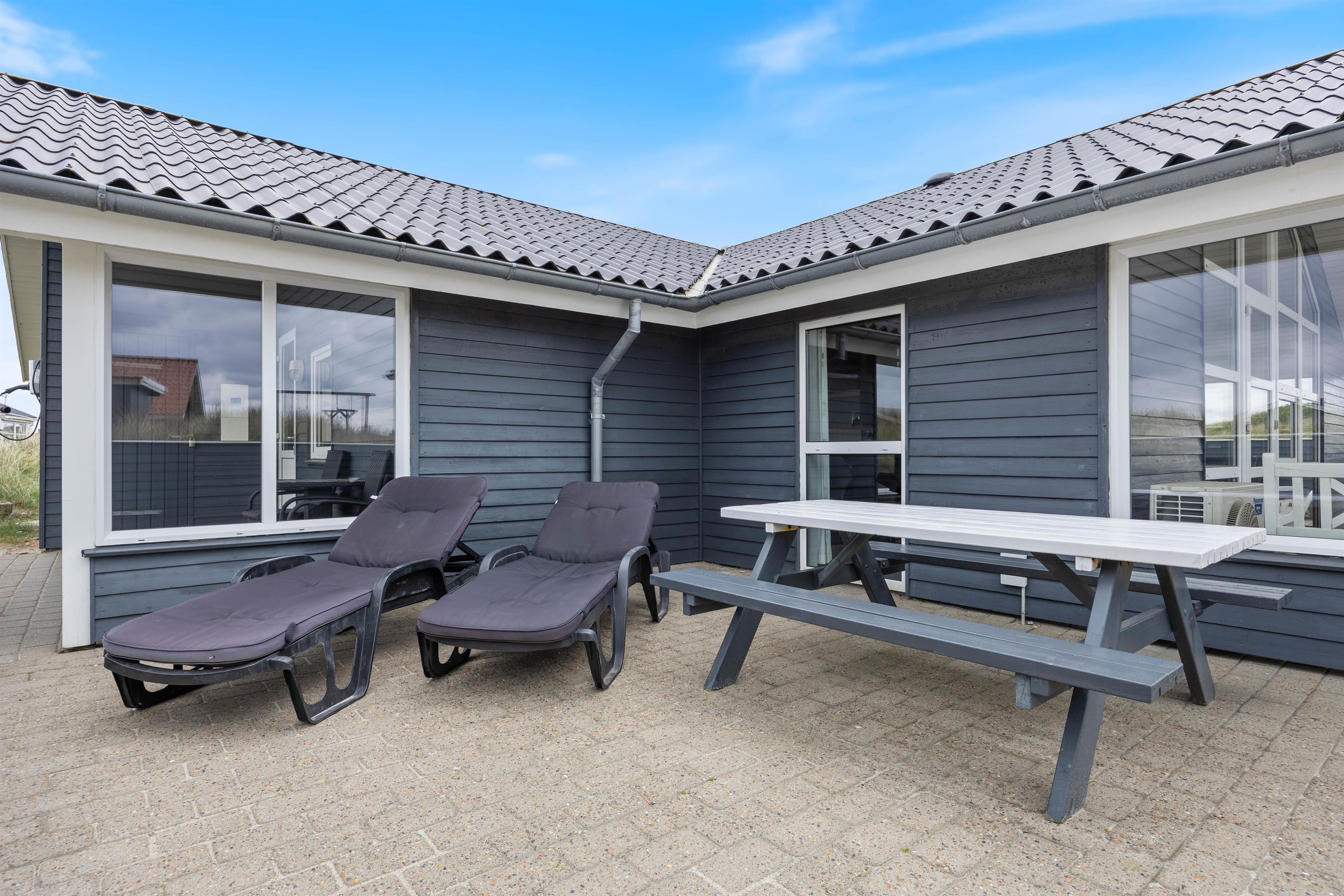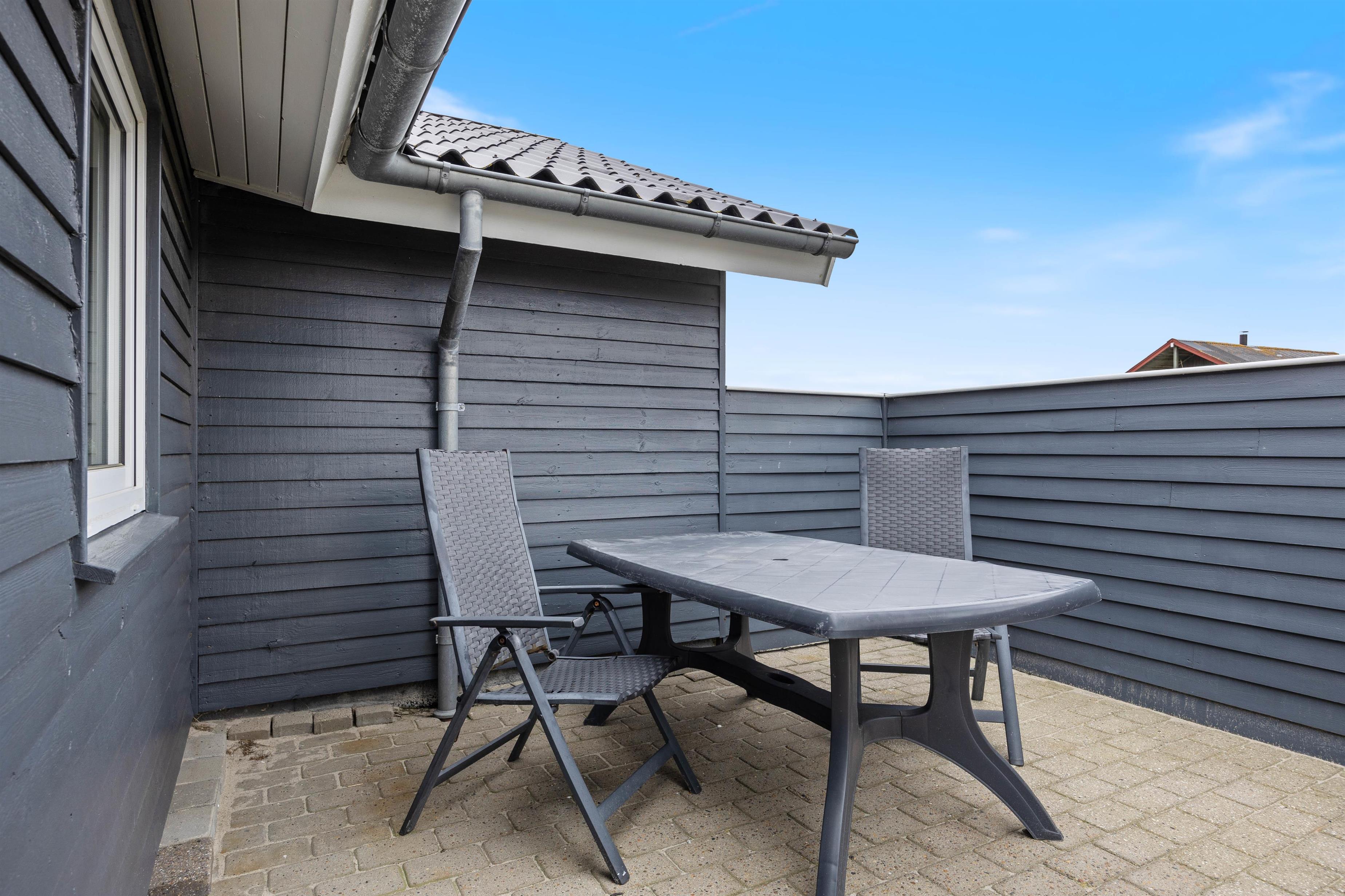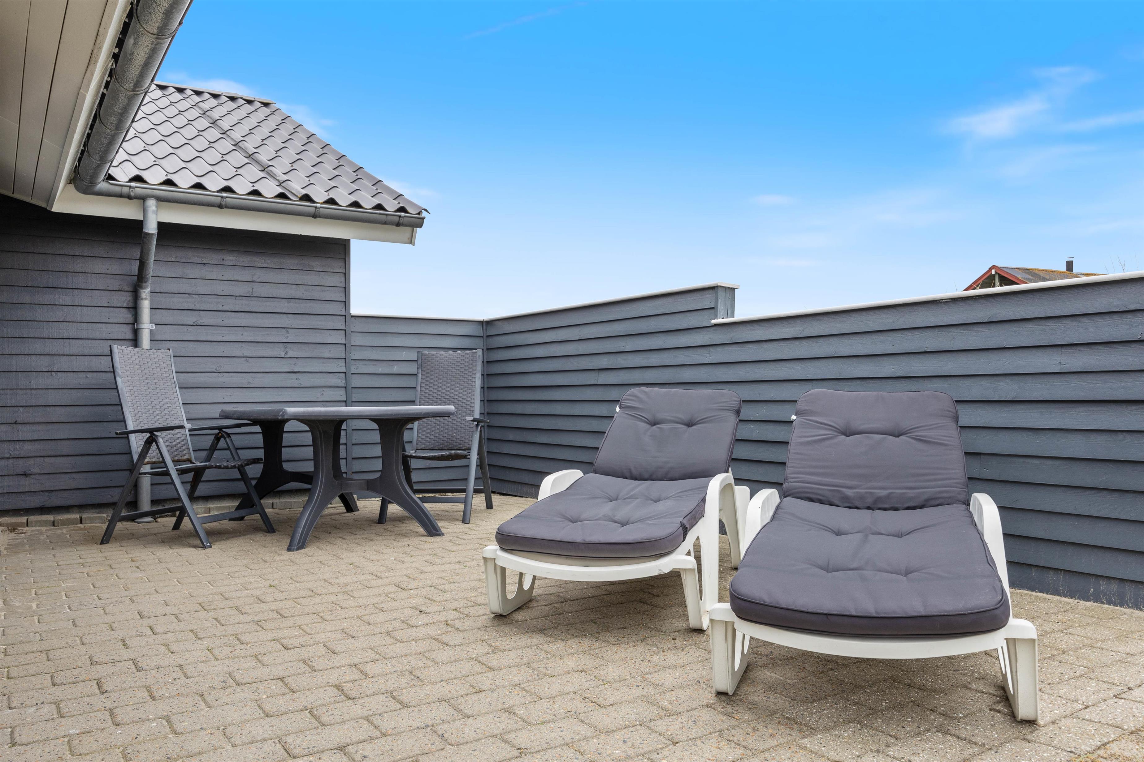 Ved feriehuset er der afskærmede og delvist overdækkede terrasser, som er udstyret med gode havemøbler og liggestole, så du også her kan slappe af i solen. Og naturligvis er der også en grill til de kulinariske tryllerier på hyggelige grillaftener.
